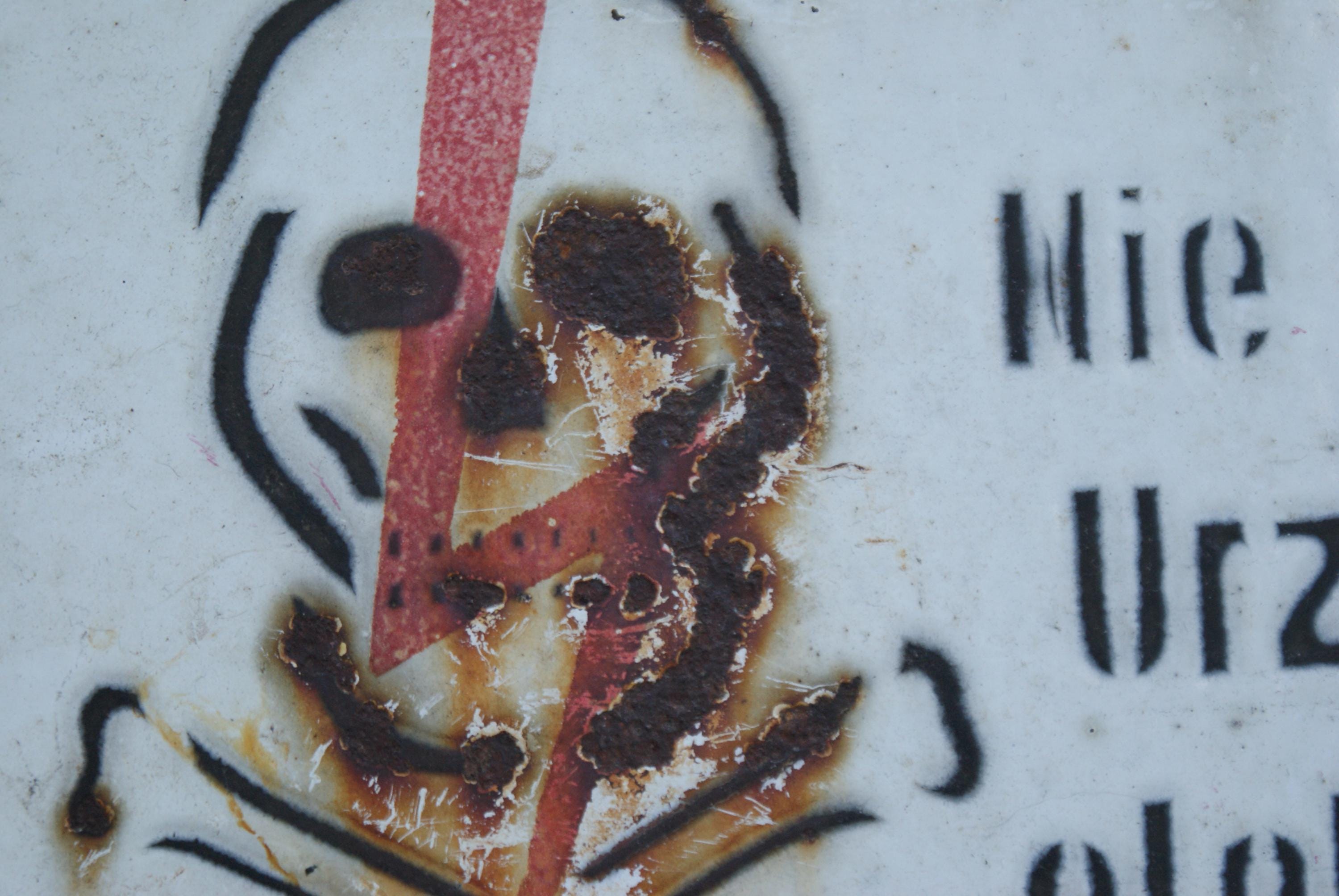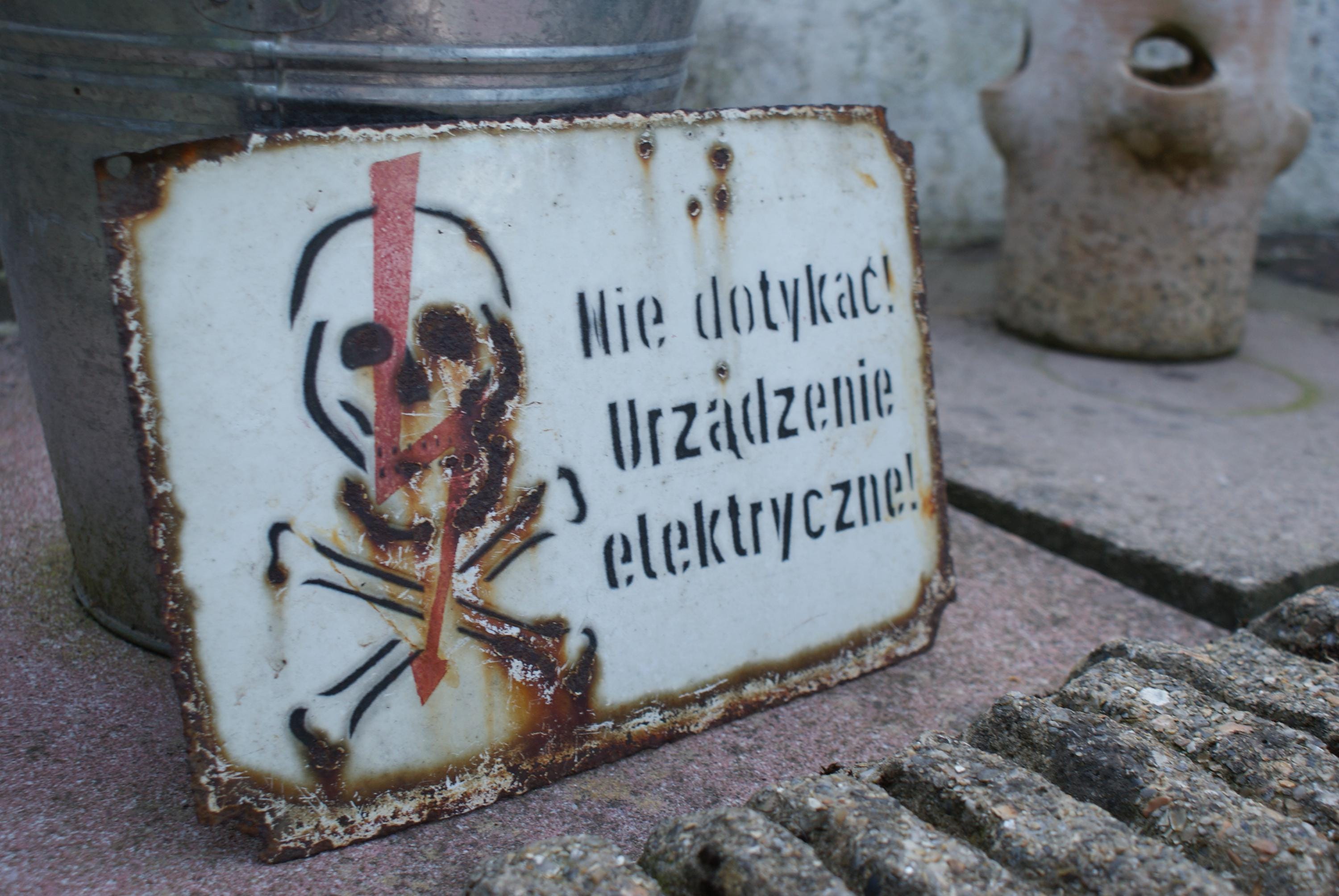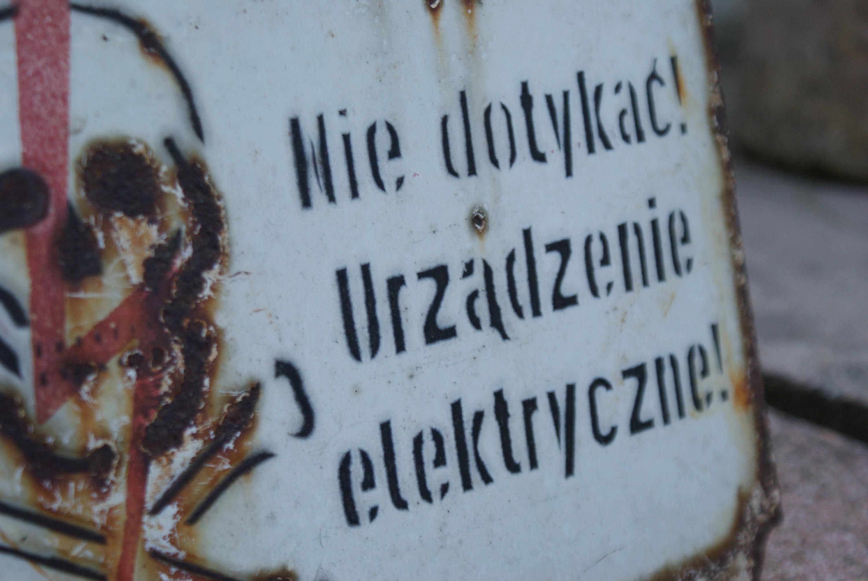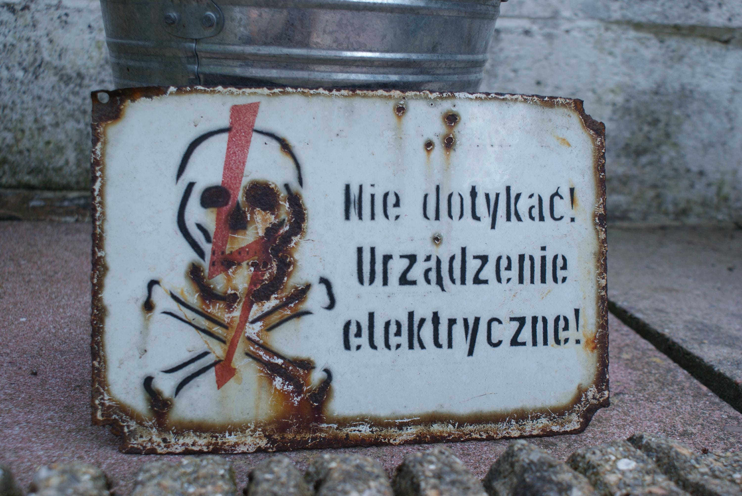 Fantastic vintage sign Originating from Poland Probably mid to late 20th centrury. A great patina all over perfect for industrial design. 'Nie dotykac! Urzadzenie elektryczne!' translation 'Do not touch! Electric device!'