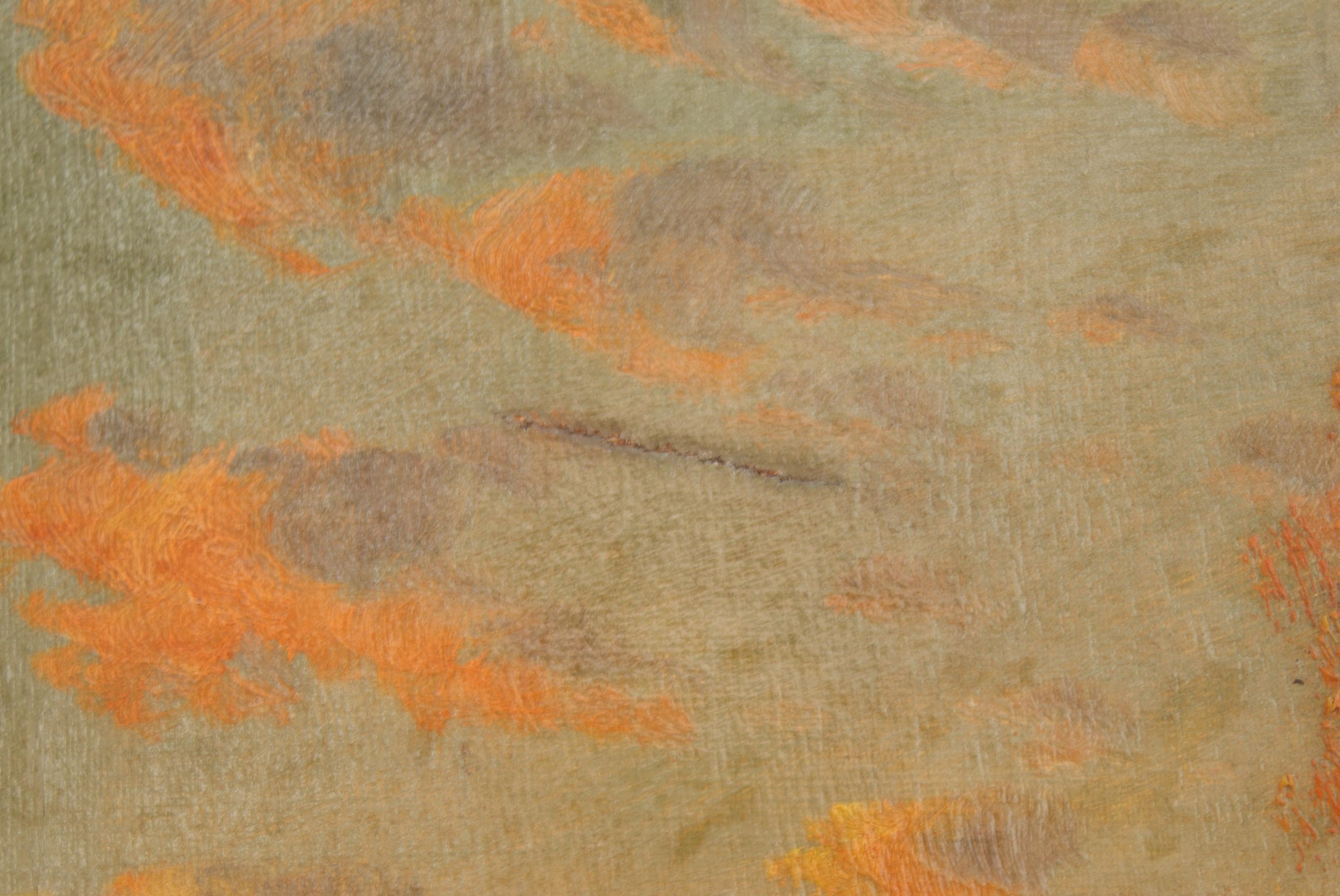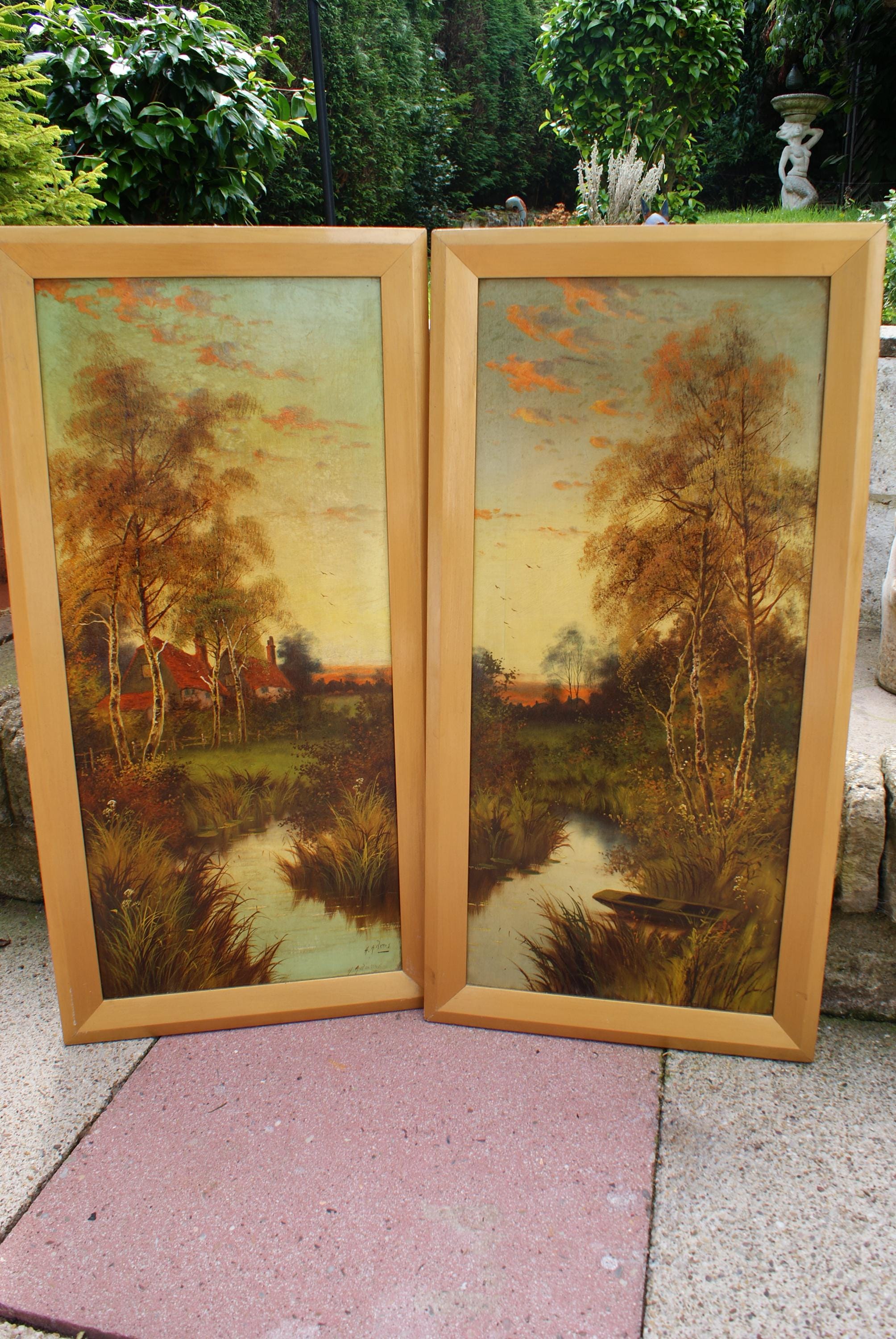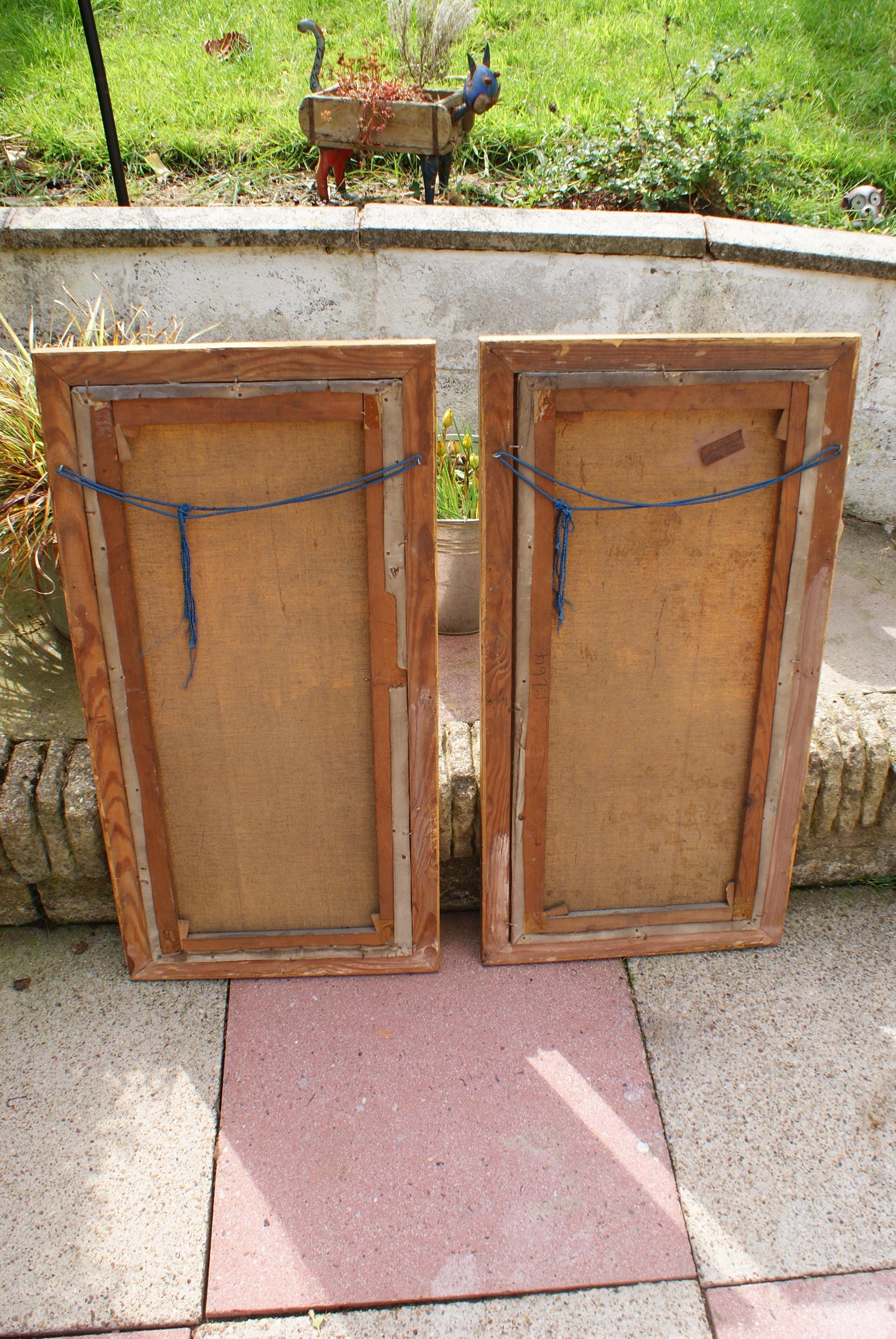 Stunning pair of large oil paintings, designed to look like one scene. Paintings I believe are early to mid 20th century. only one painting is signed but they were bought as a pair by the previous owner at auction as being from the same artist, and side by side I'm confident they are. Historical repair to one canvas (see photos) but over all in fantastic condition. Frames are later but well made and fitting for the art work.
