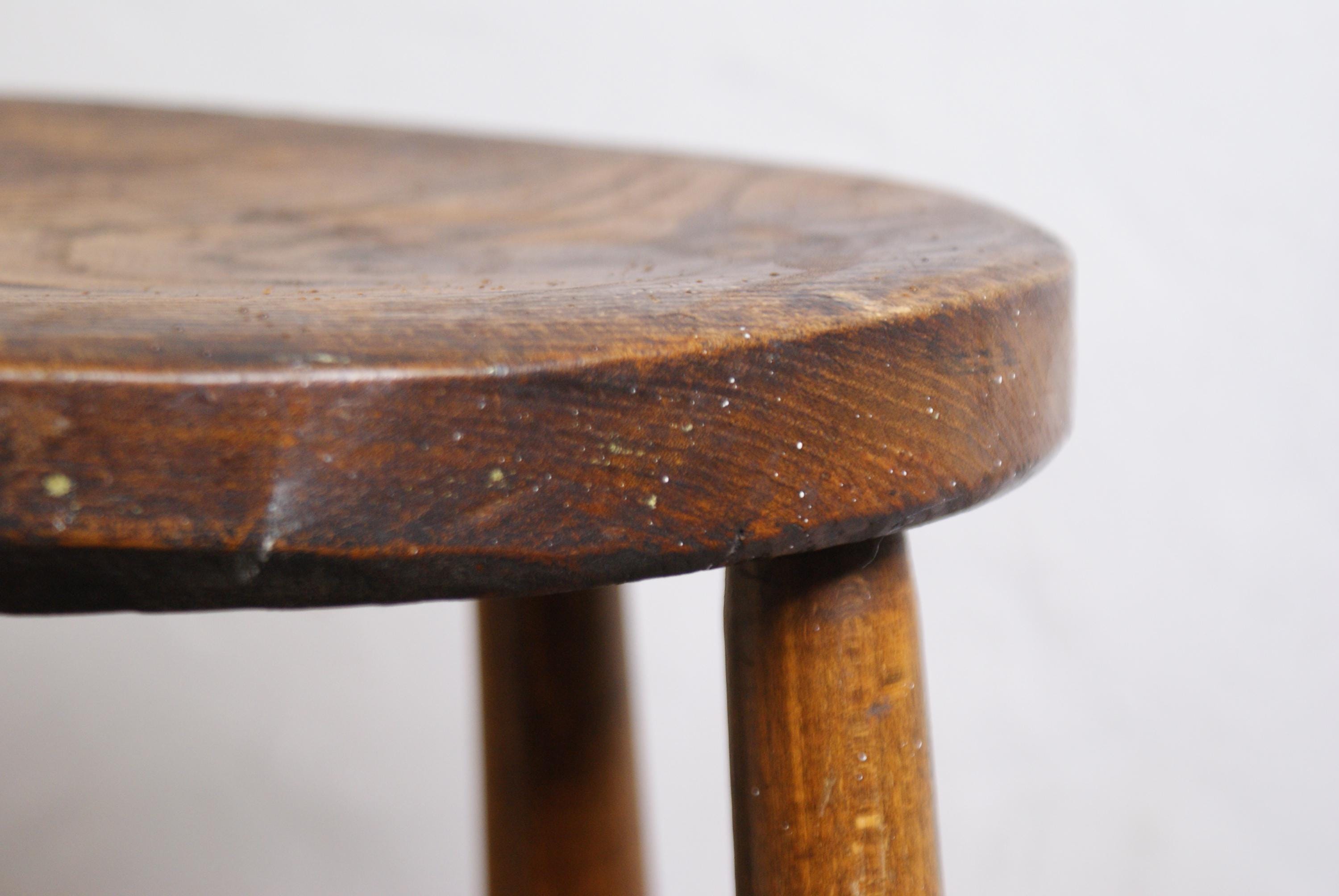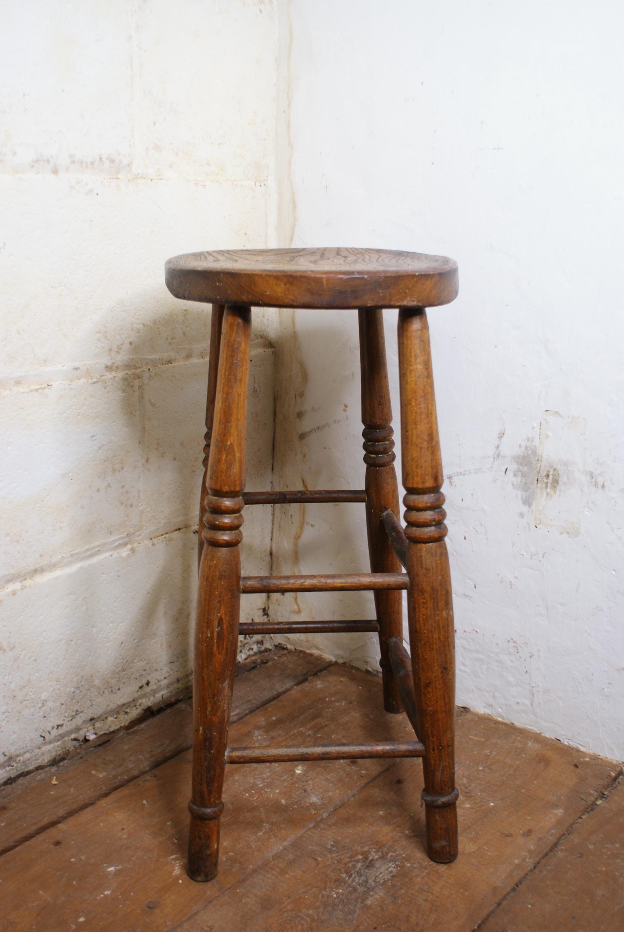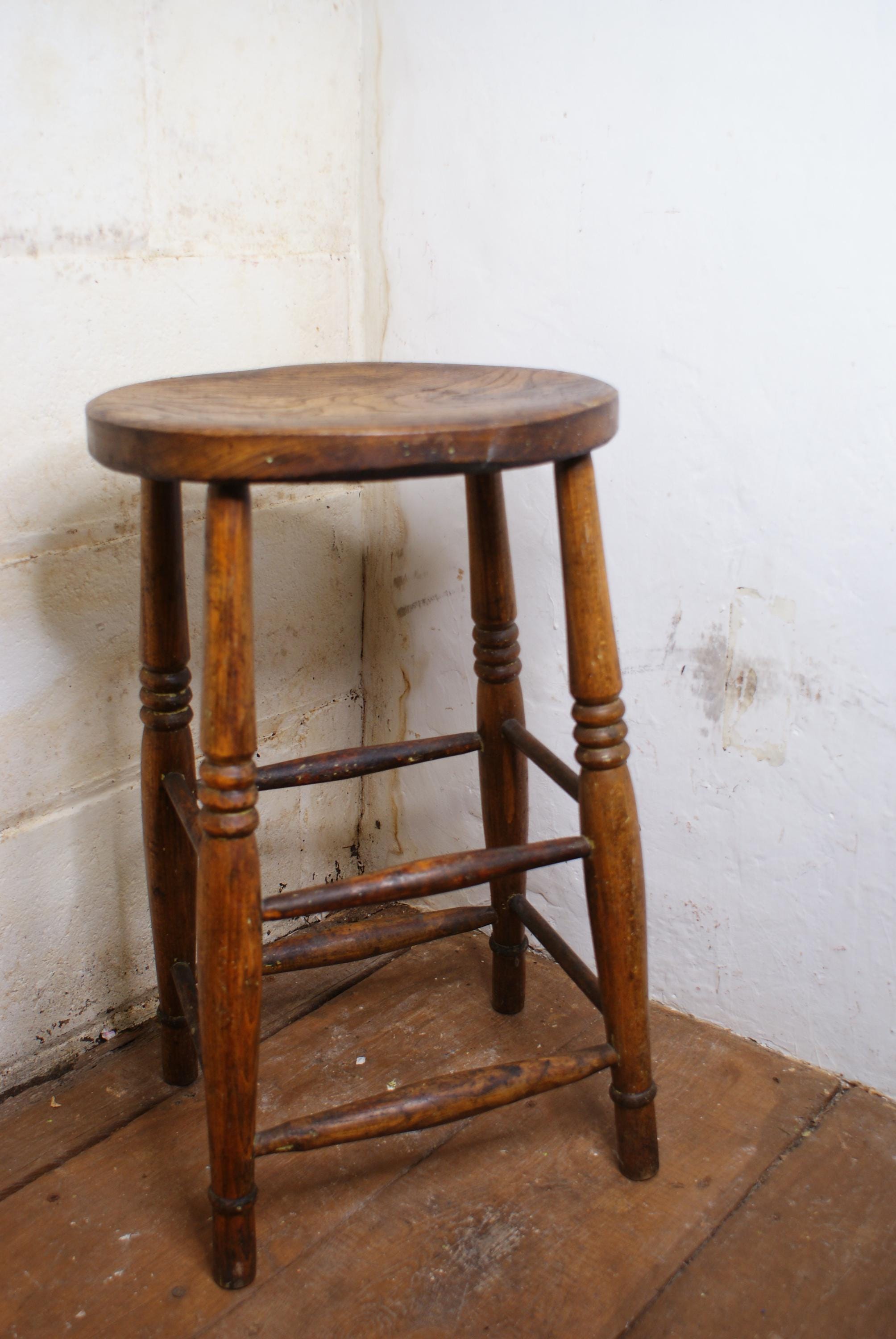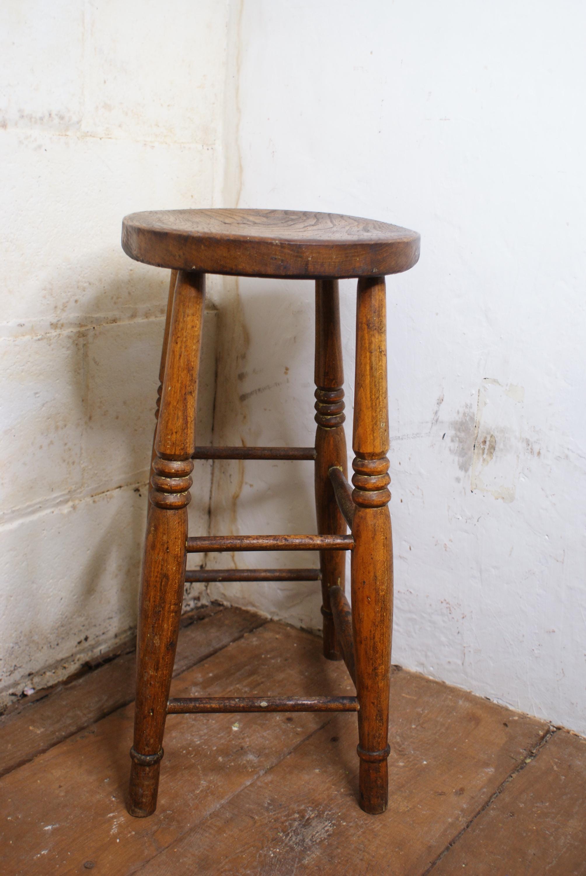 Lovely oval top bar stool. This has a lovely patina all over to the legs and stretchers, some paint splatters as is common with these types of stools.