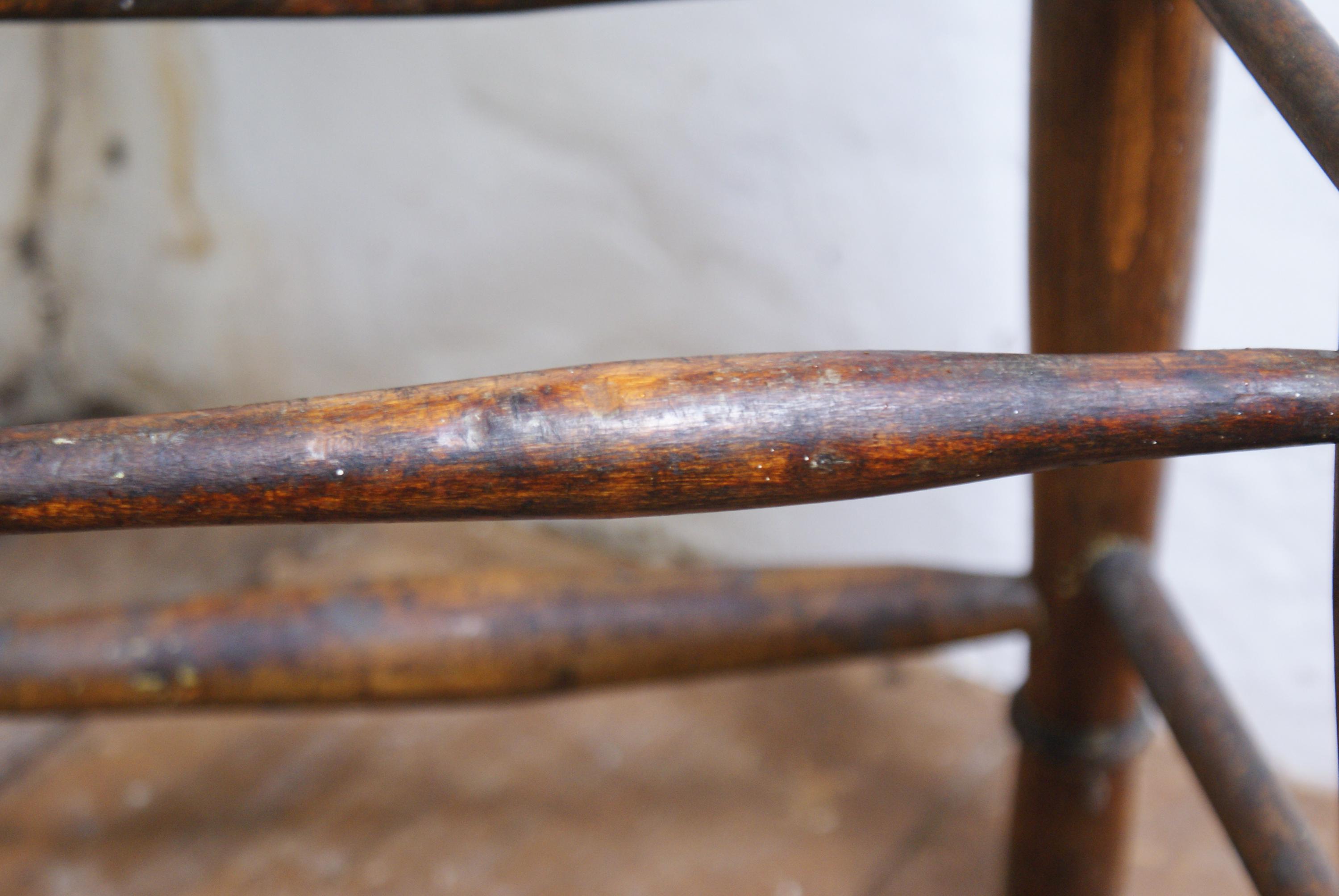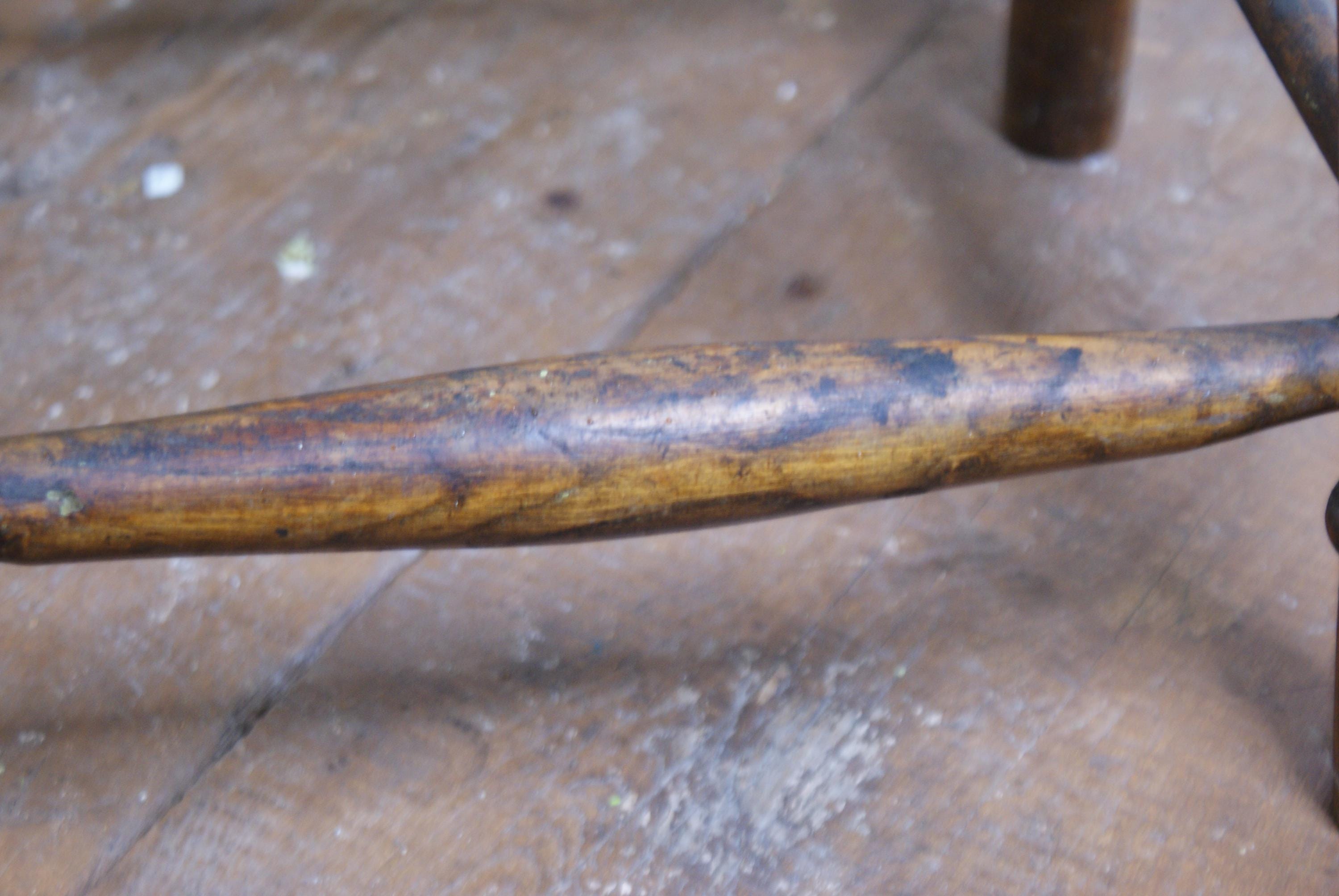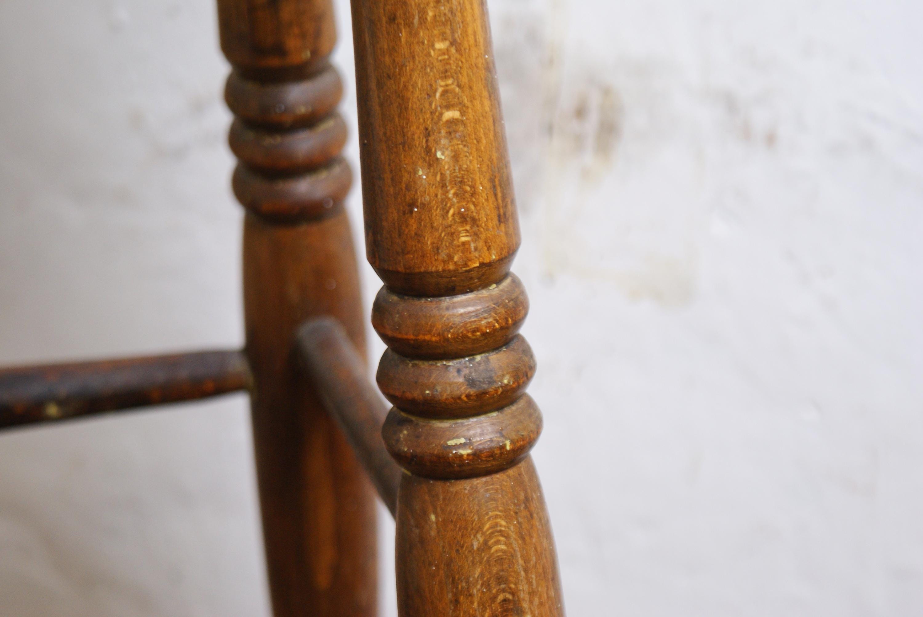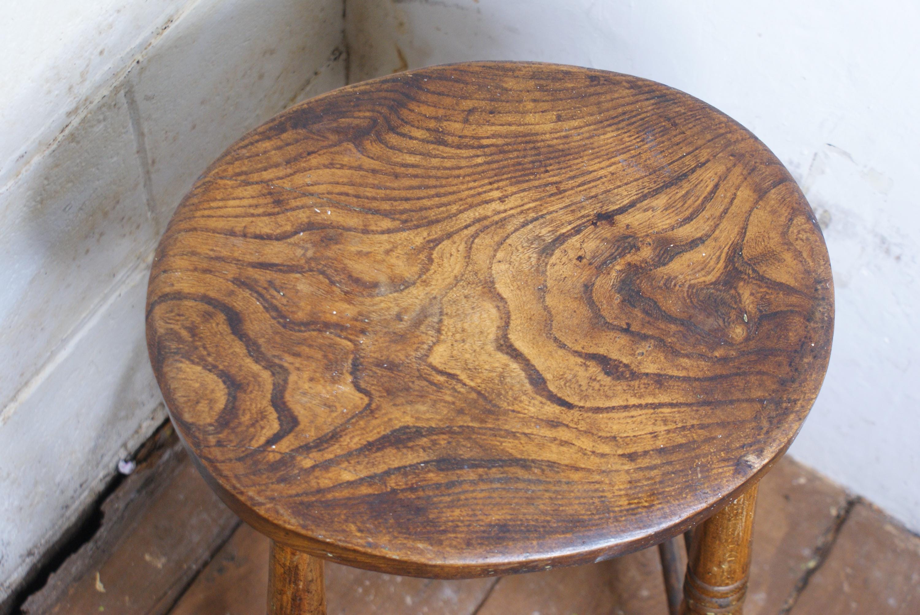 Lovely oval top bar stool. This has a lovely patina all over to the legs and stretchers, some paint splatters as is common with these types of stools.