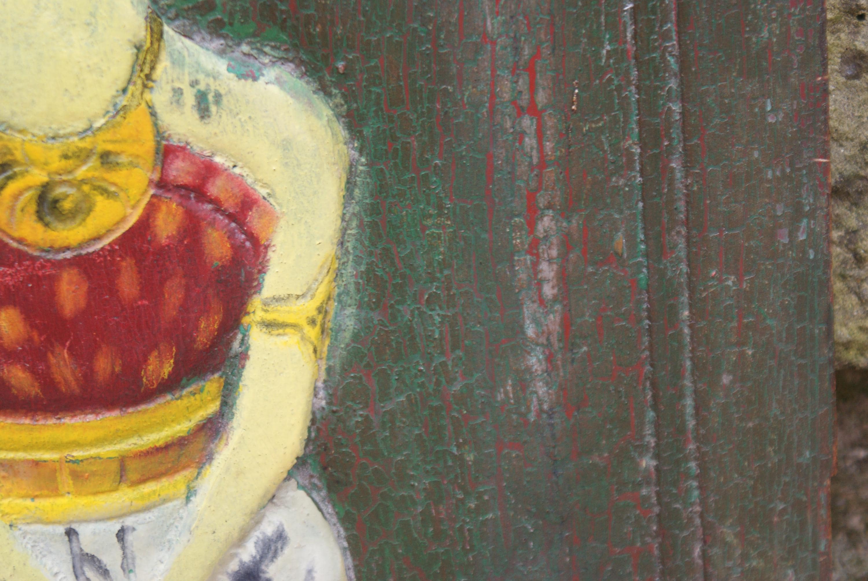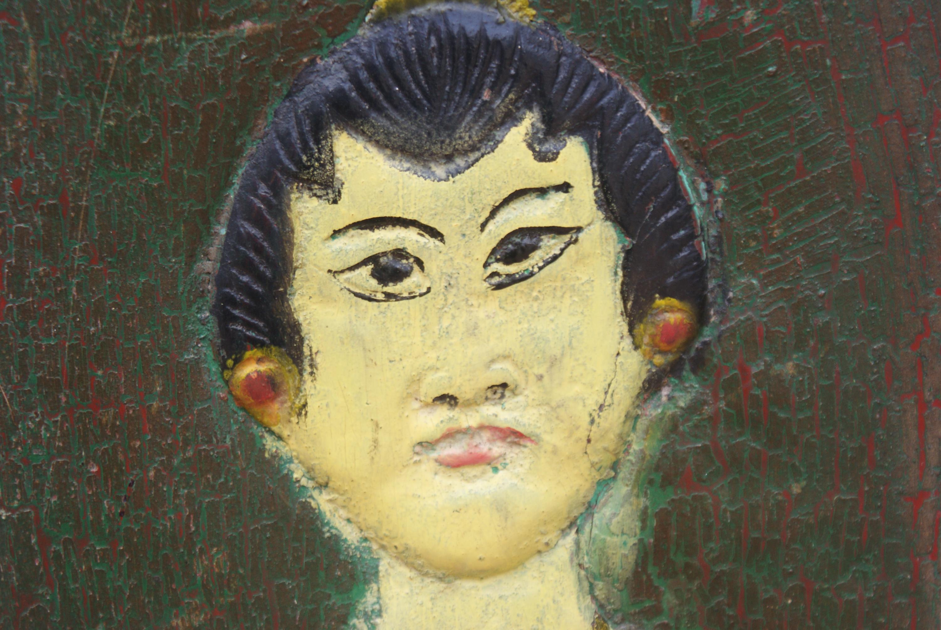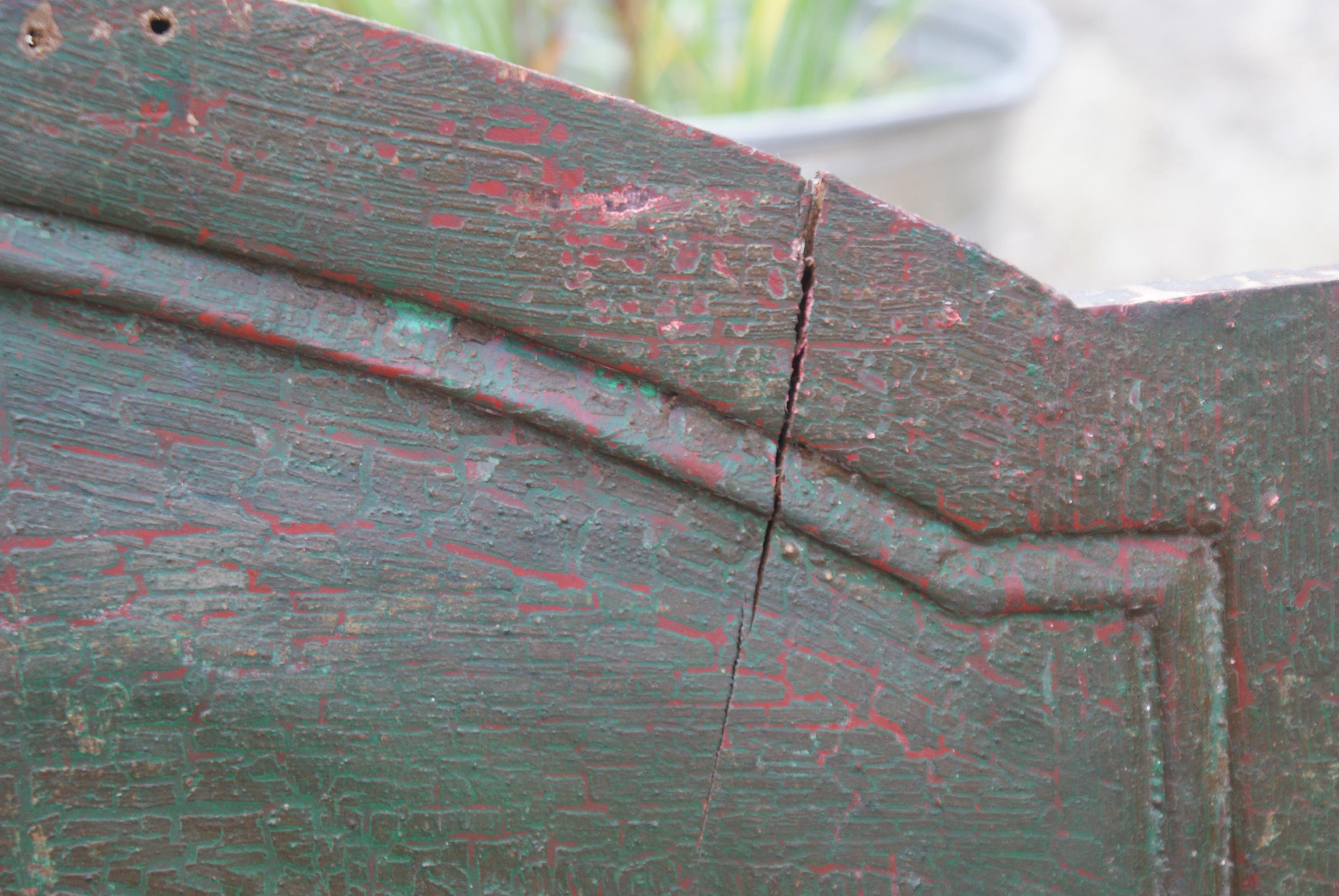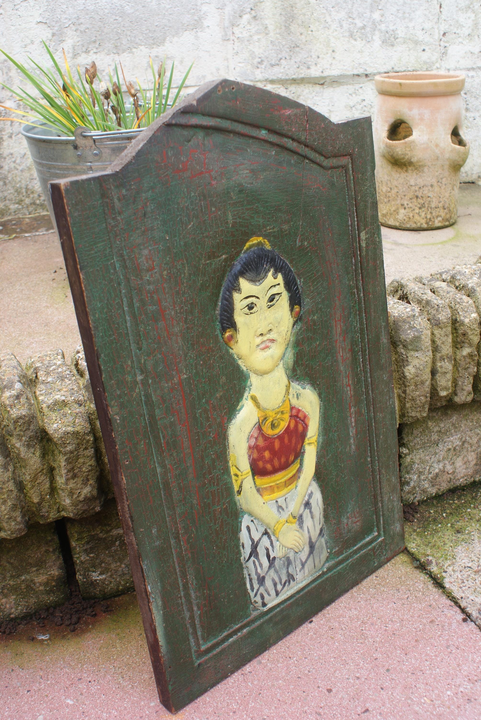 Stunning hand painted wooden door. I'm unsure of an exact age on this or its original use but is clearly of Asian origin and wood make a fantastic unusual art piece in any home. Stunning crackling to the green paint revealing an original red paint underneath.