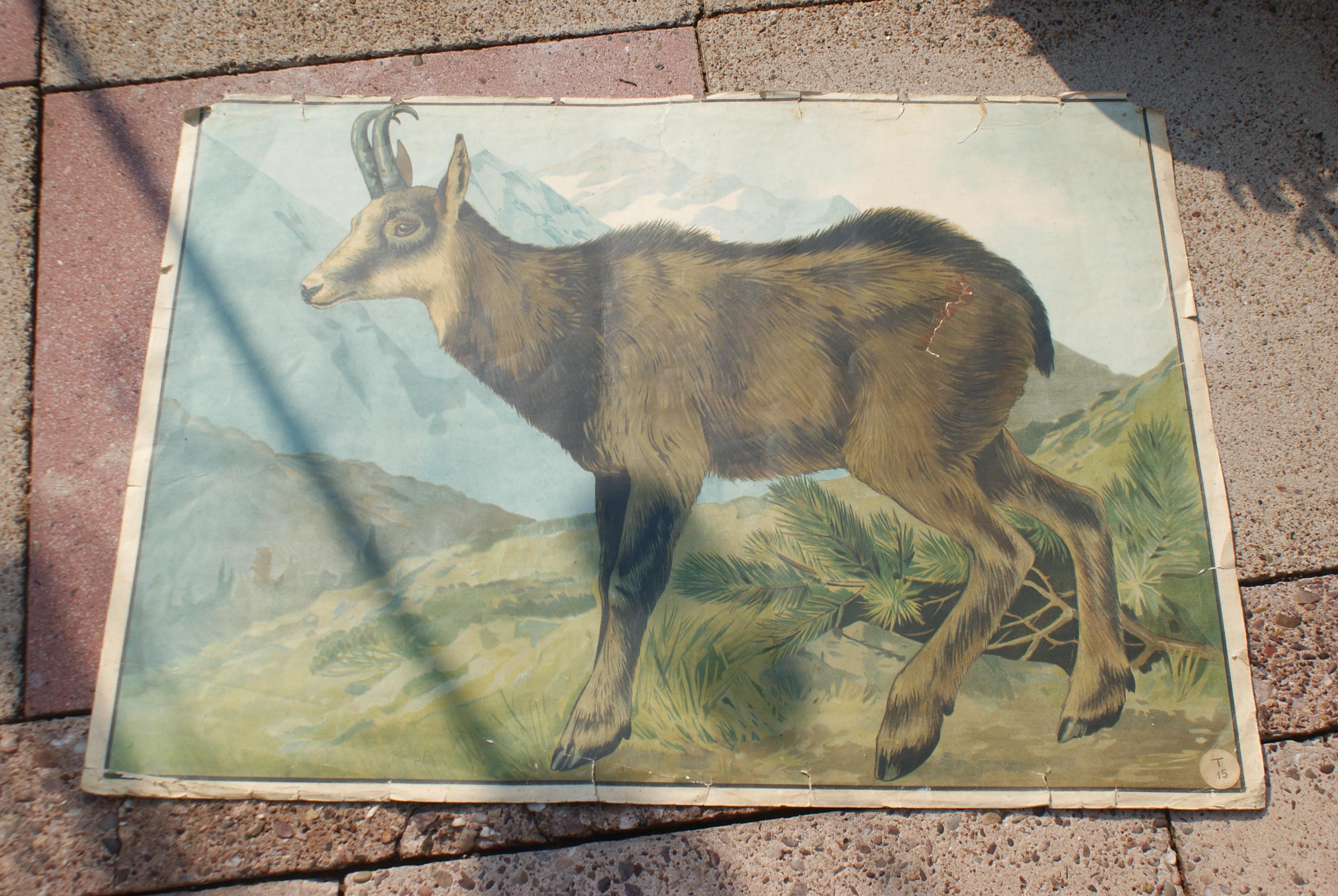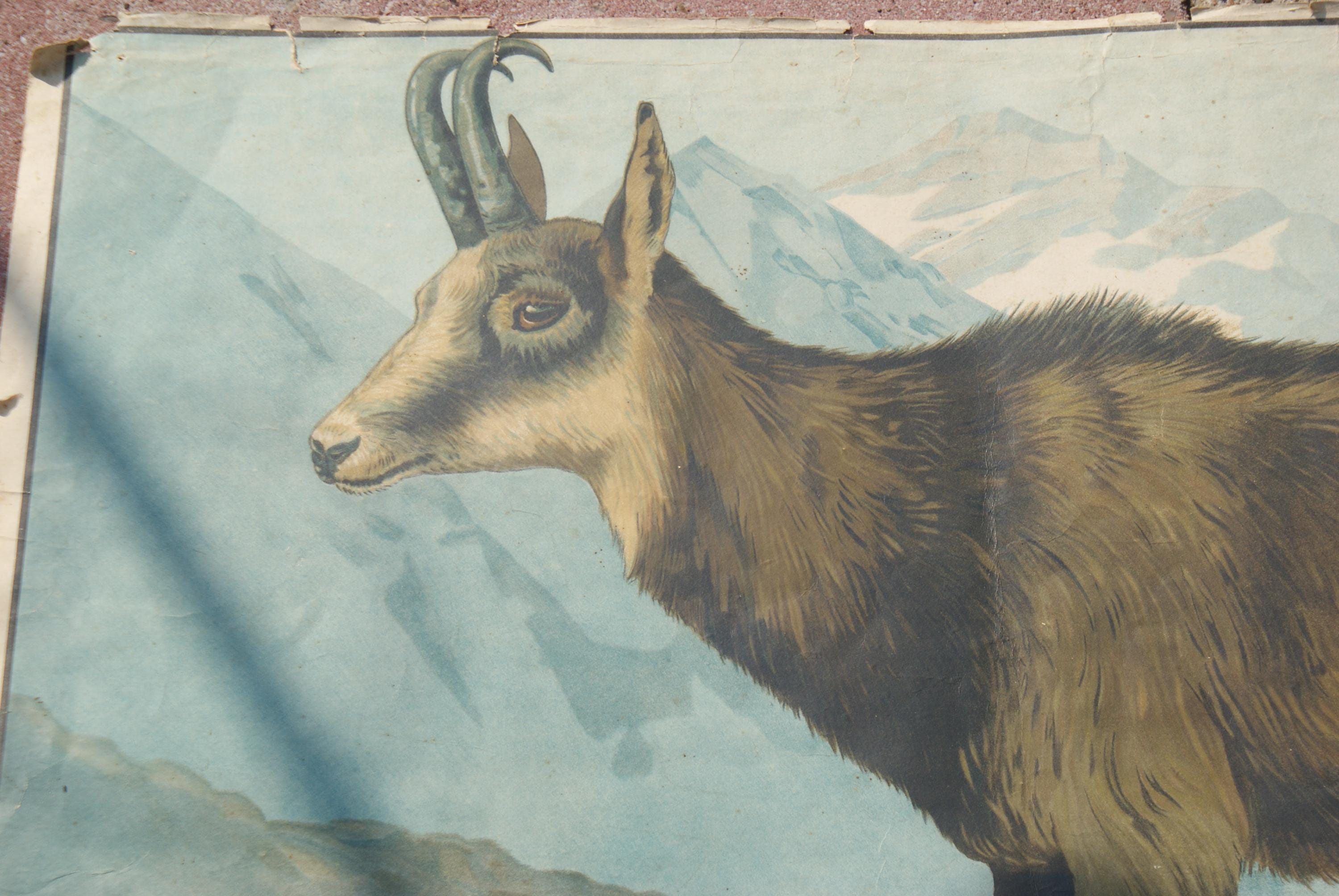 Lovely German educational poster, depicting a chamois a native mountain goat in southern Europe. The poster given its age is not in a bad condition and is still very much displayable with only a few tears.