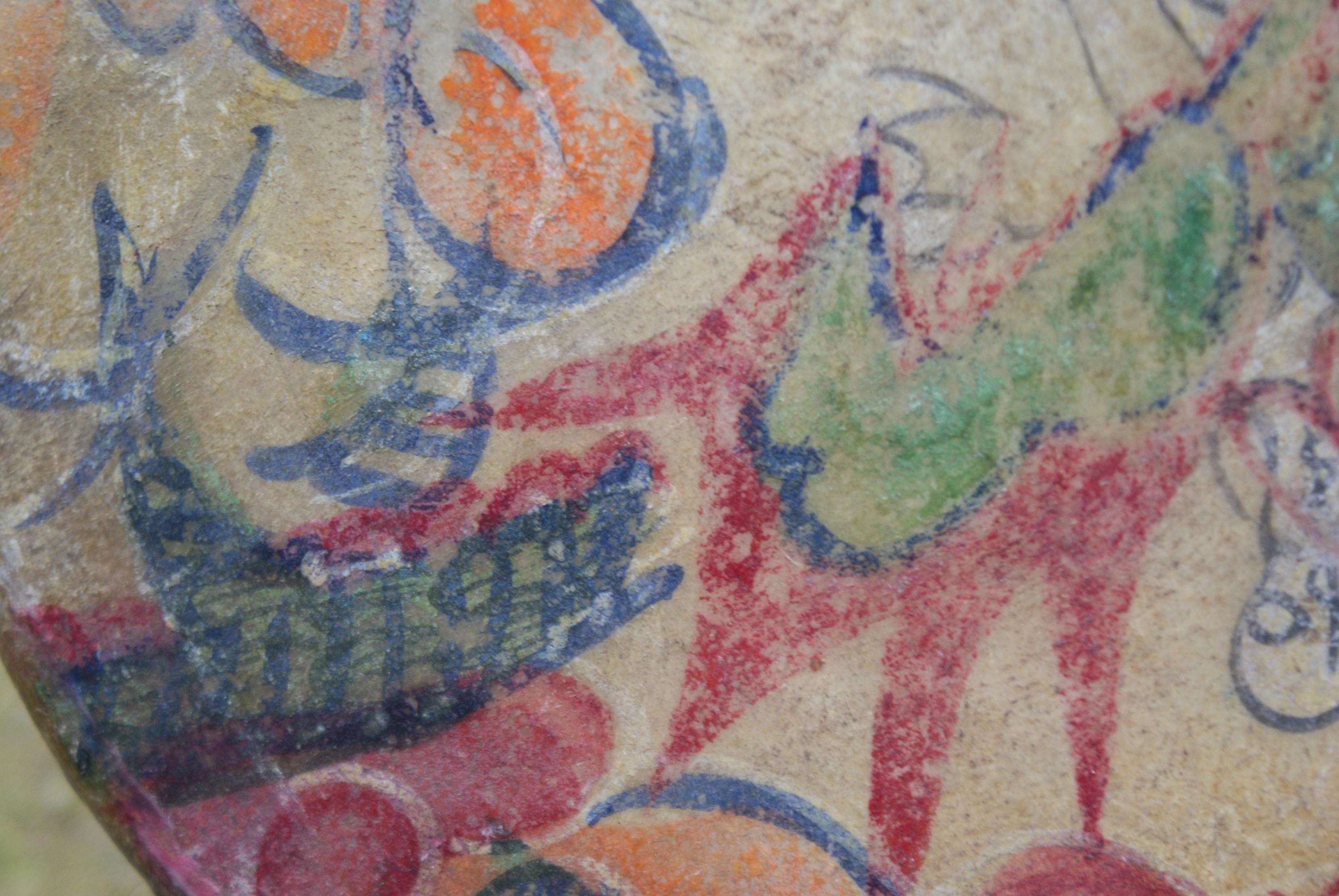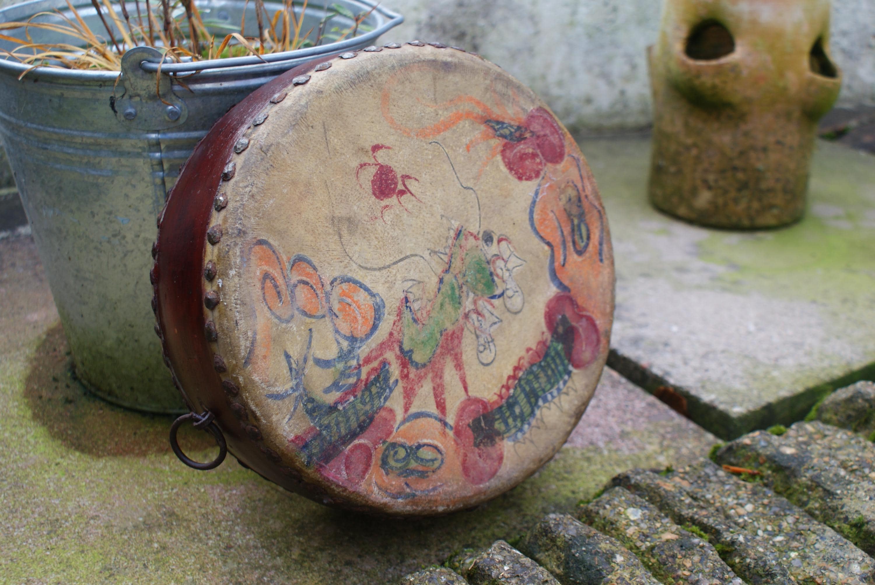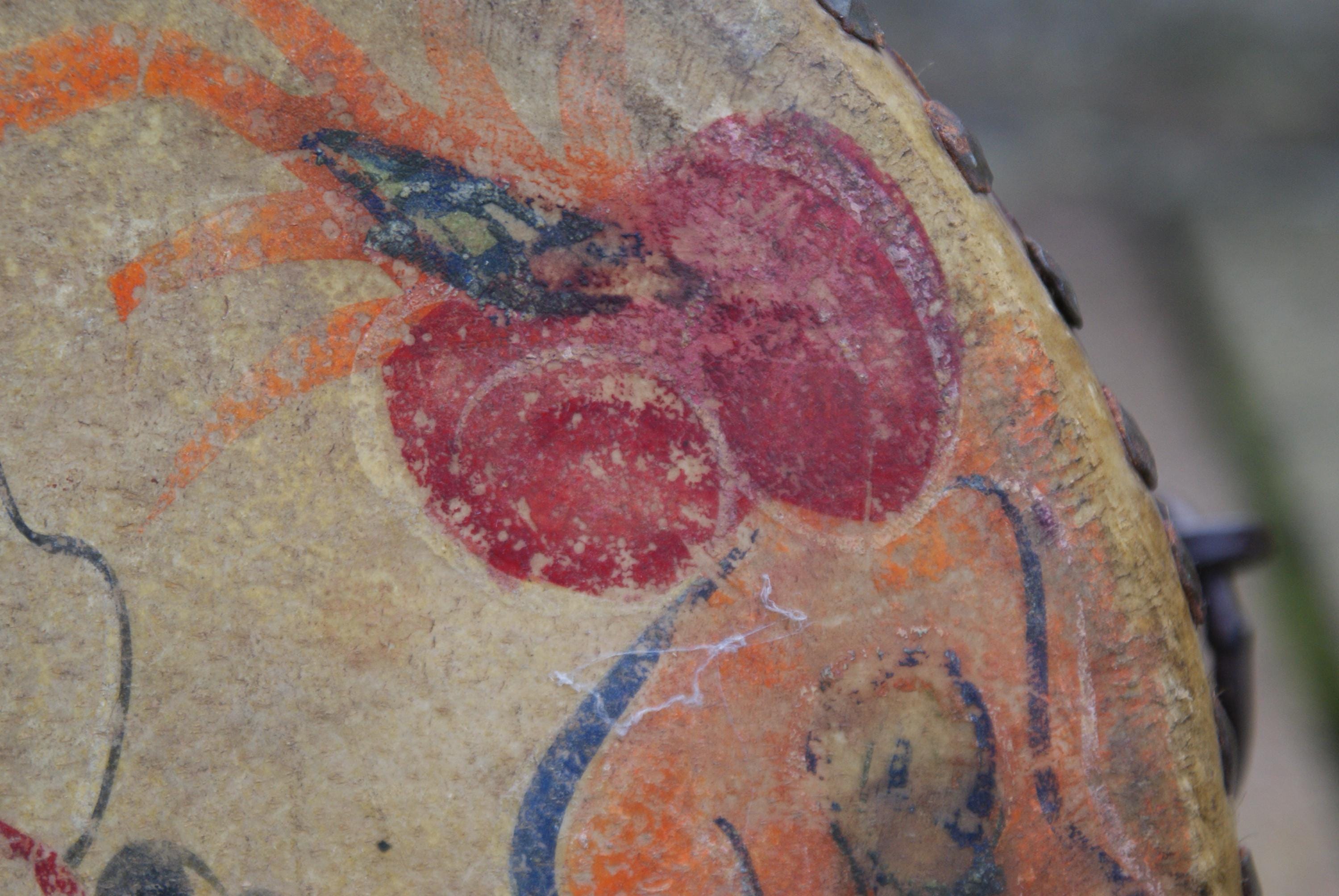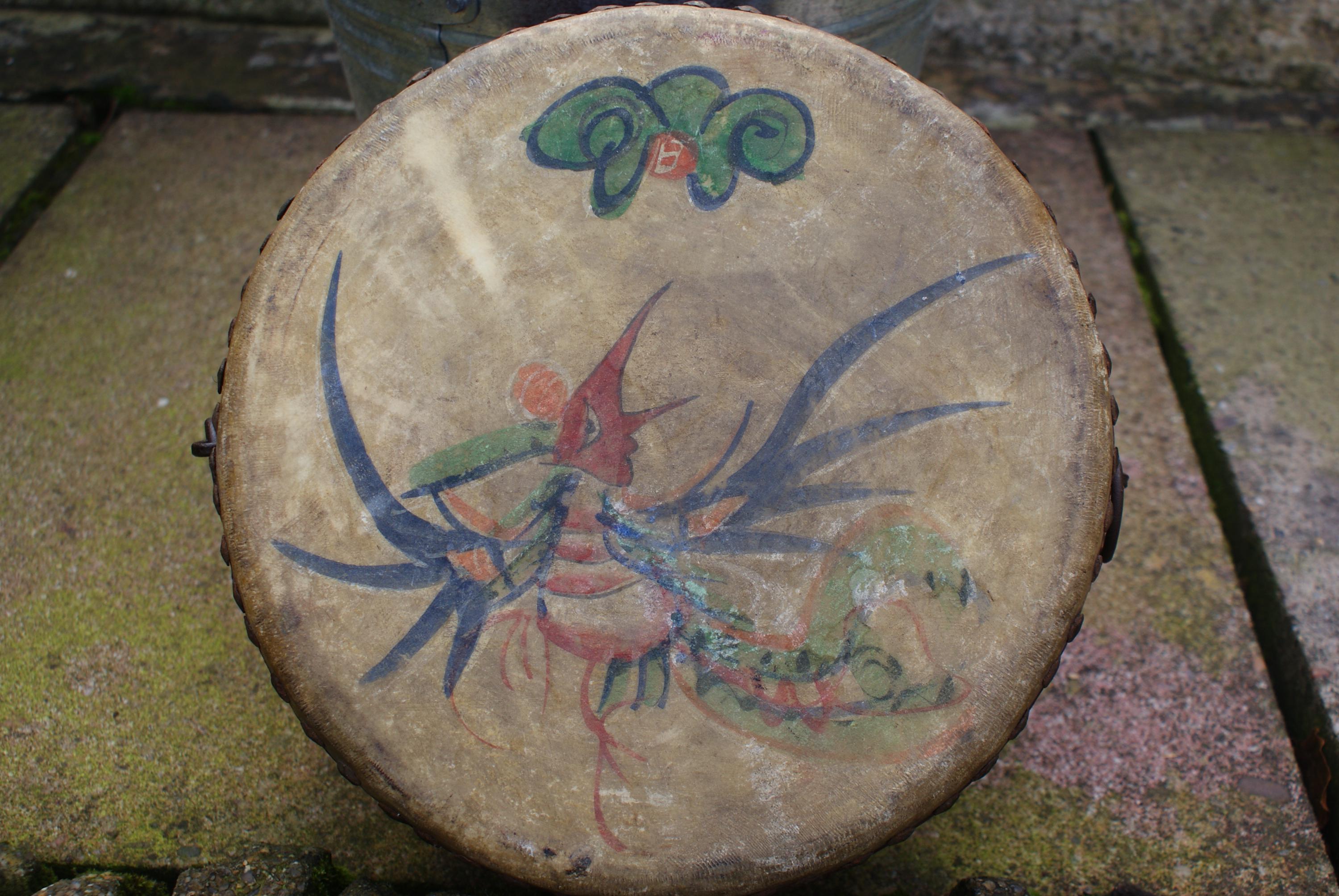 Stunning hand painted drum from the early 1900's, a charming piece with primitive and naive design and character and a lovely decorative piece