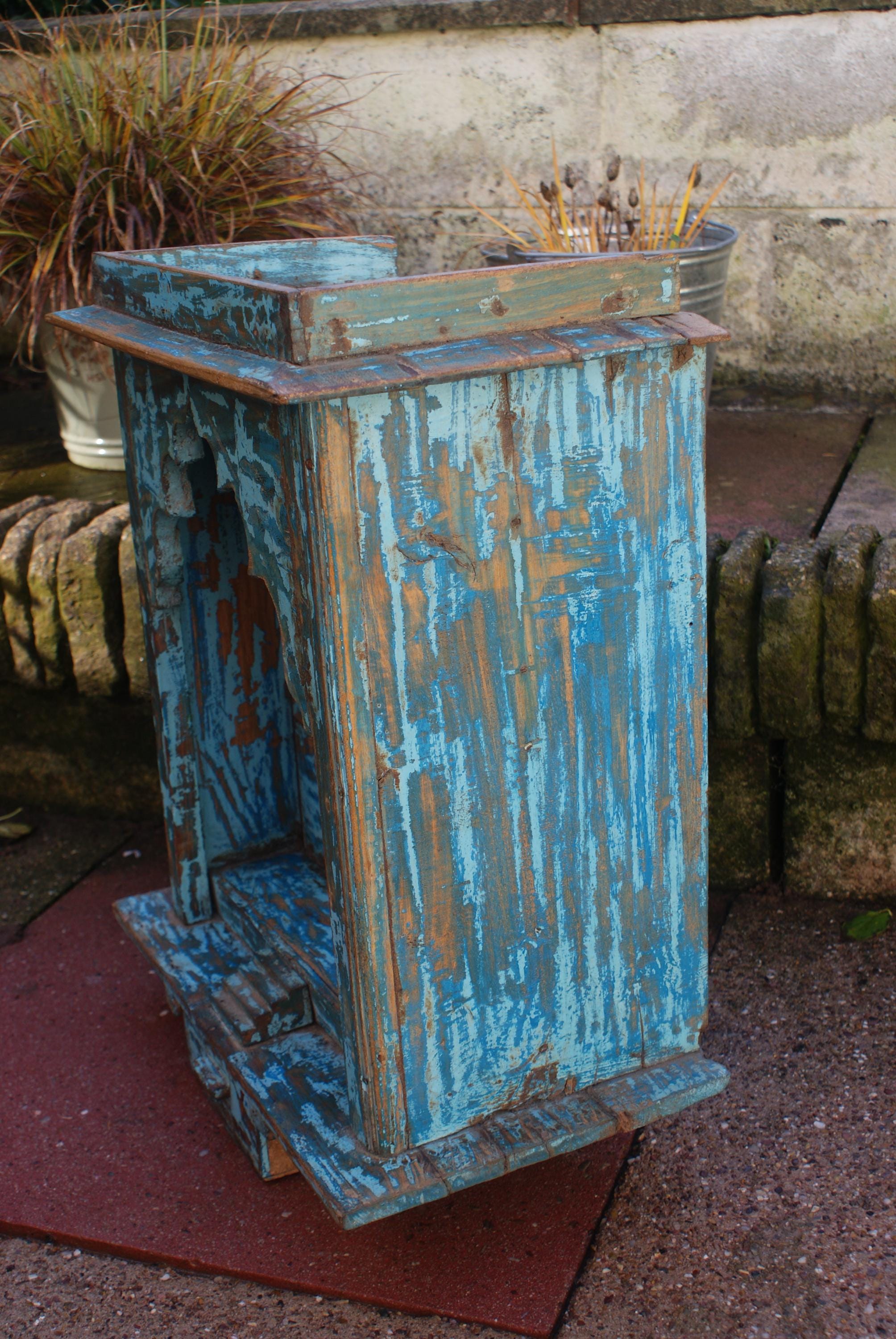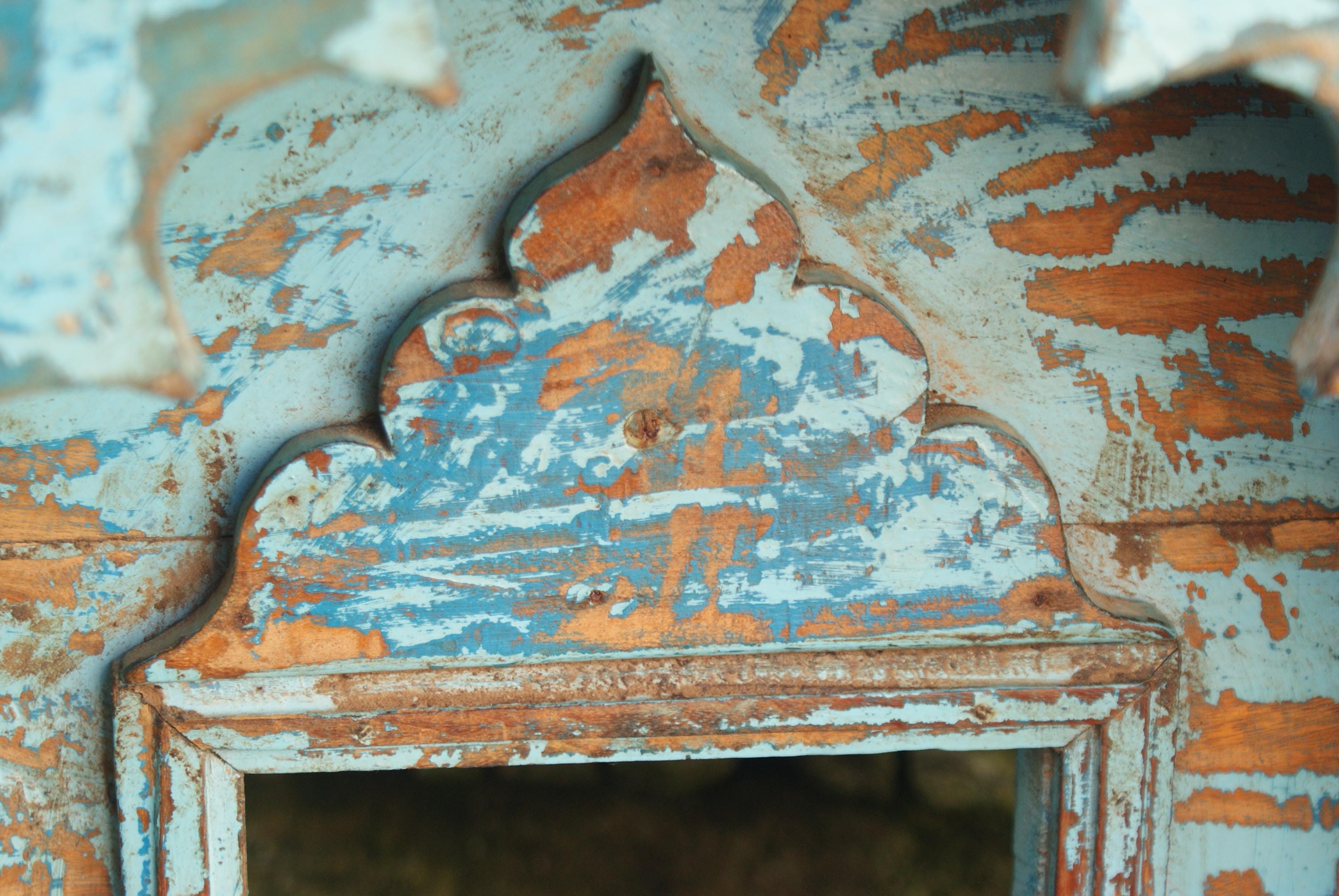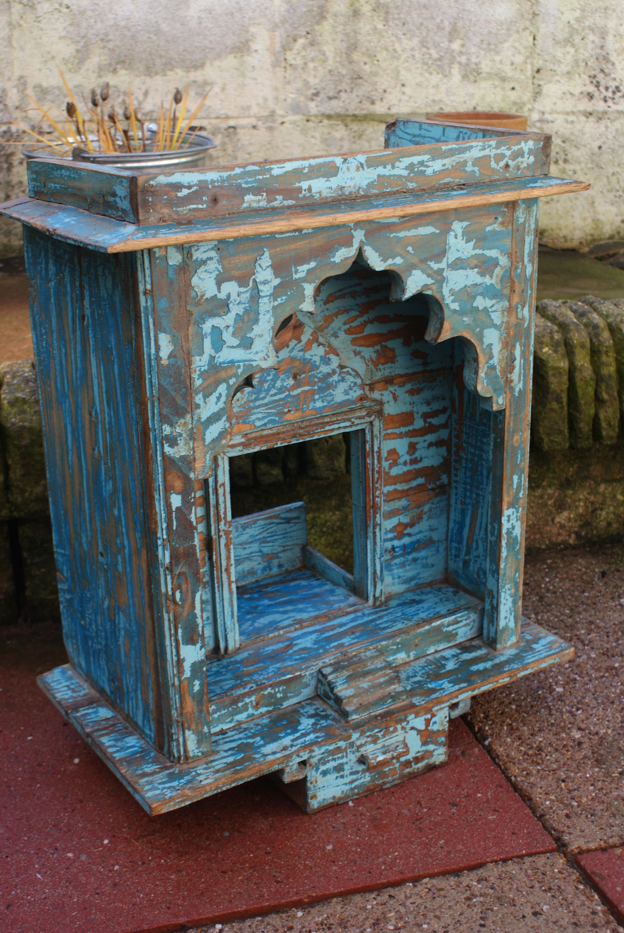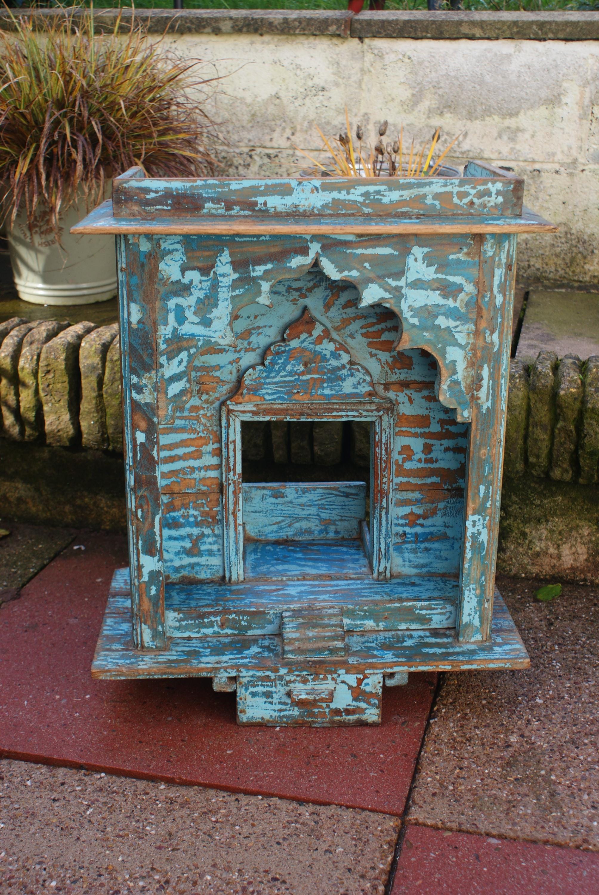 Stunning original Indian jharokha, used as a home temple to create a shrine. this particular one has a fantastic patina to the original blue paint. The jharoka design originates from a traditional building design in India where royalty would stand on the balcony and greet the public hence the window style design of the piece. This would have originally been hung on a wall it could be again but would require some shelving brackets as it weighs 9kg, but can also be free standing on the draw as pictured.