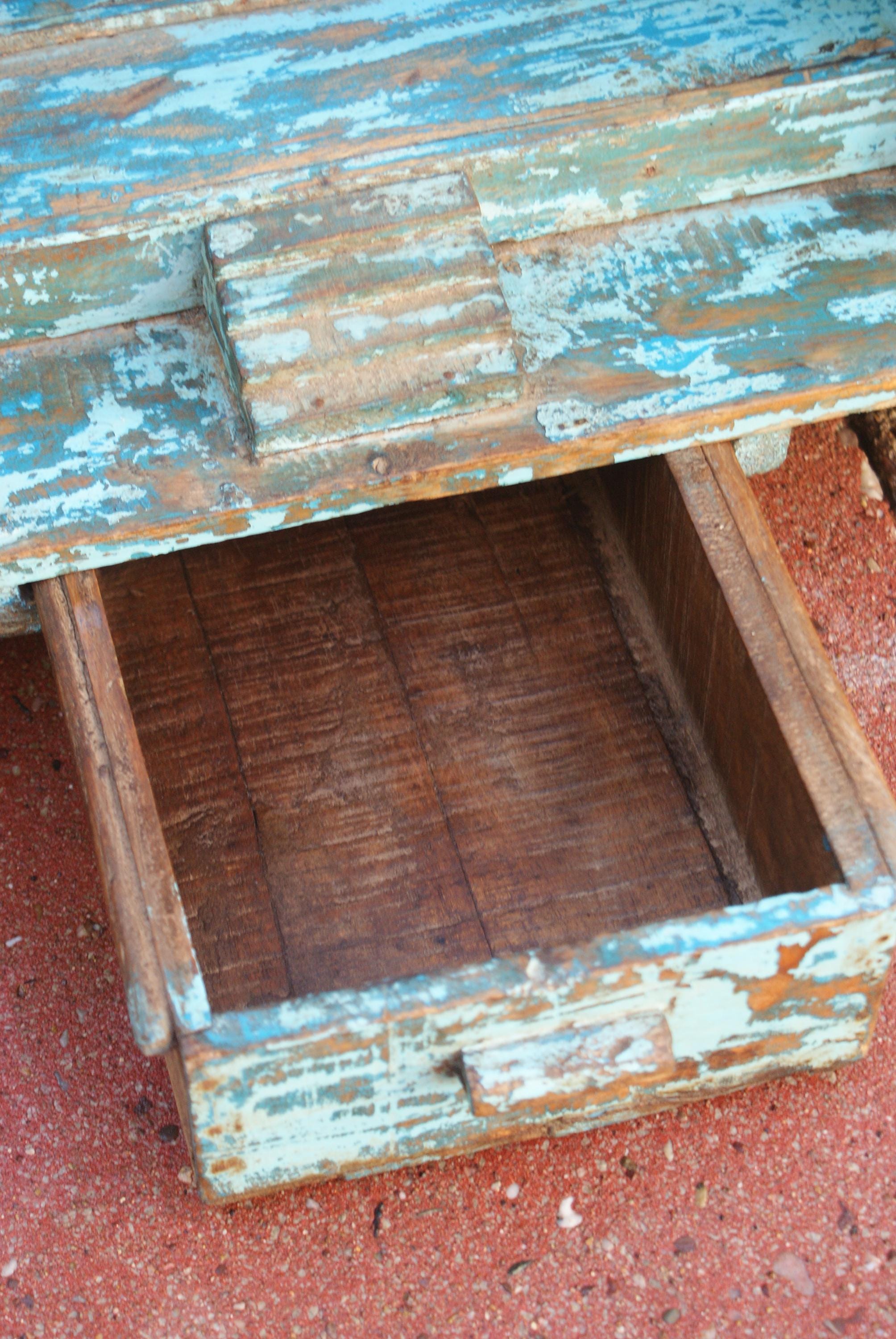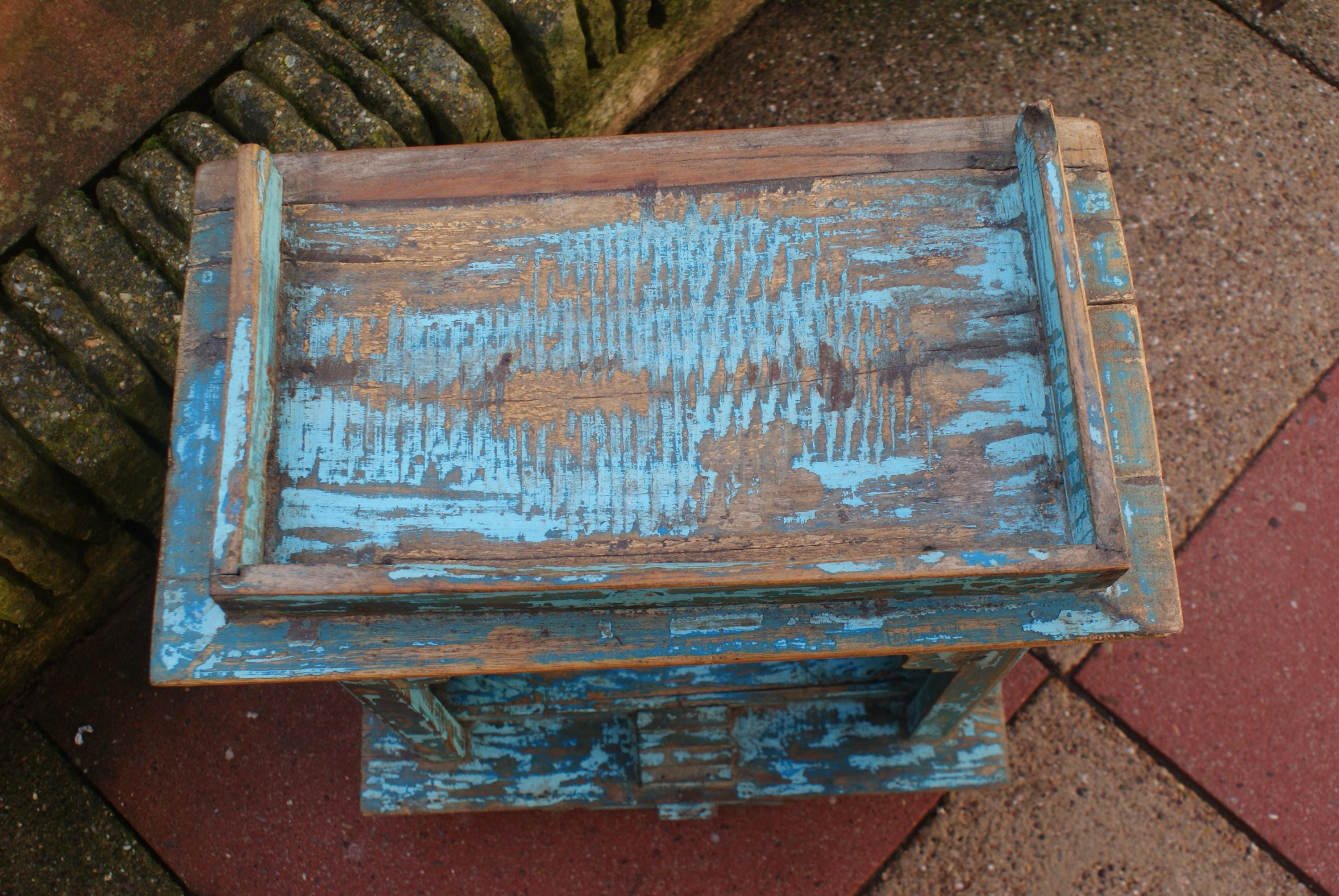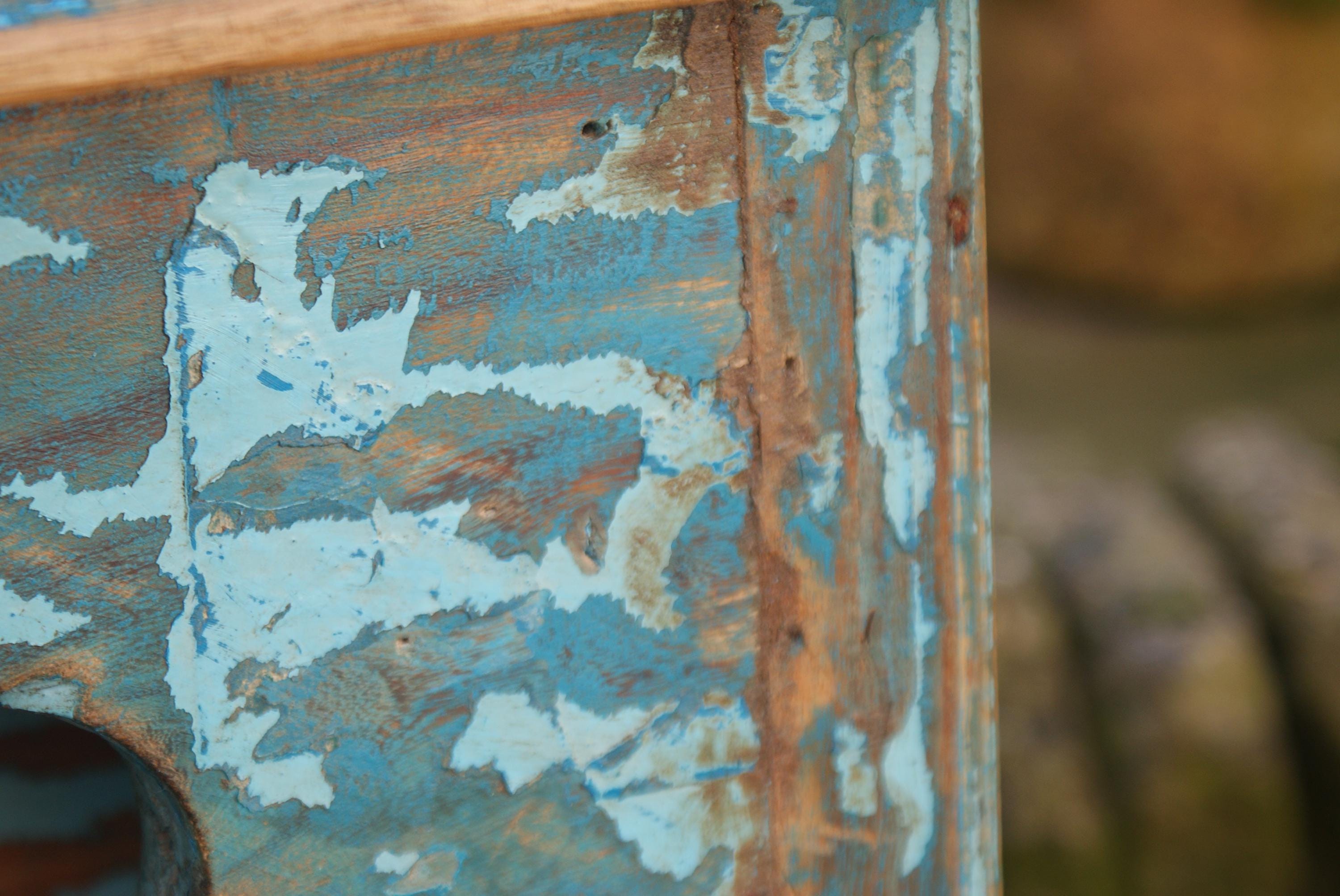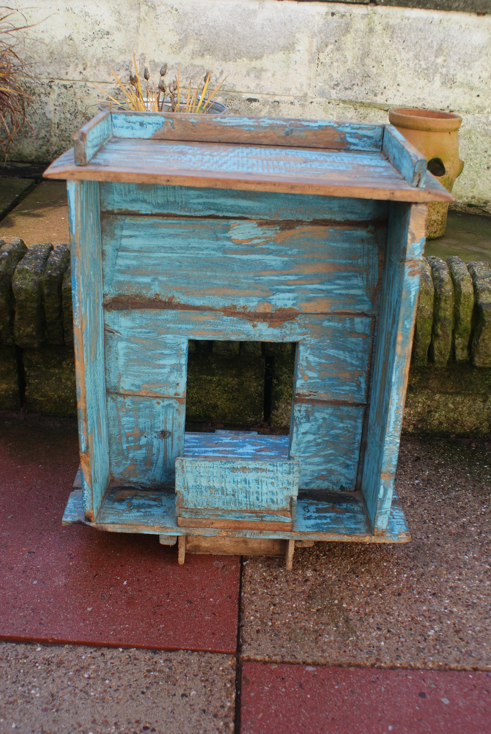 Stunning original Indian jharokha, used as a home temple to create a shrine. this particular one has a fantastic patina to the original blue paint. The jharoka design originates from a traditional building design in India where royalty would stand on the balcony and greet the public hence the window style design of the piece. This would have originally been hung on a wall it could be again but would require some shelving brackets as it weighs 9kg, but can also be free standing on the draw as pictured.