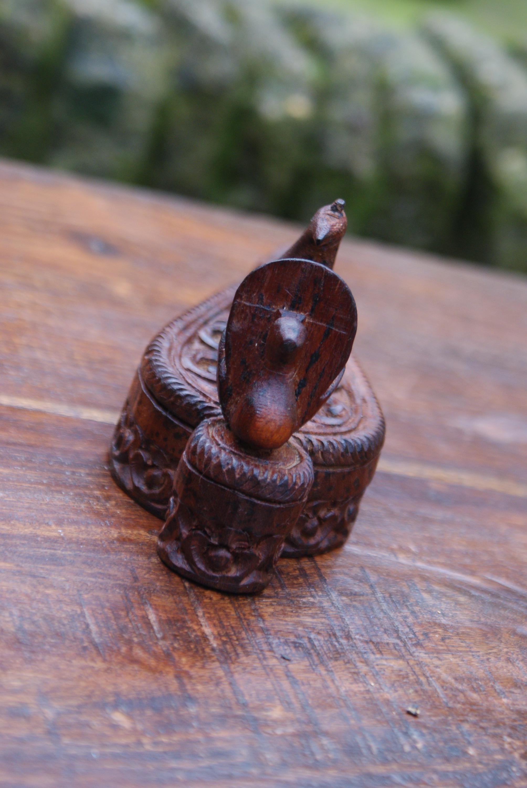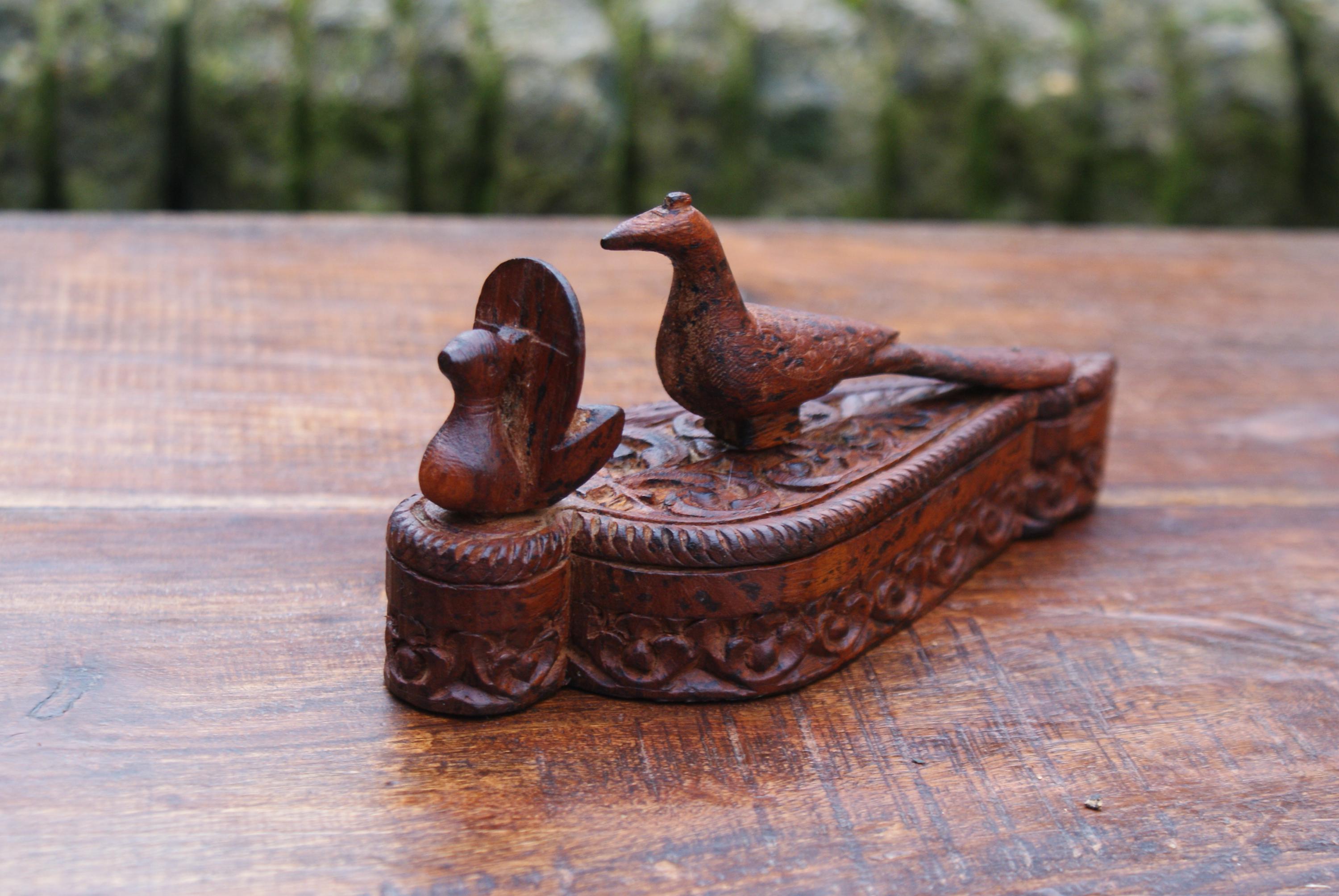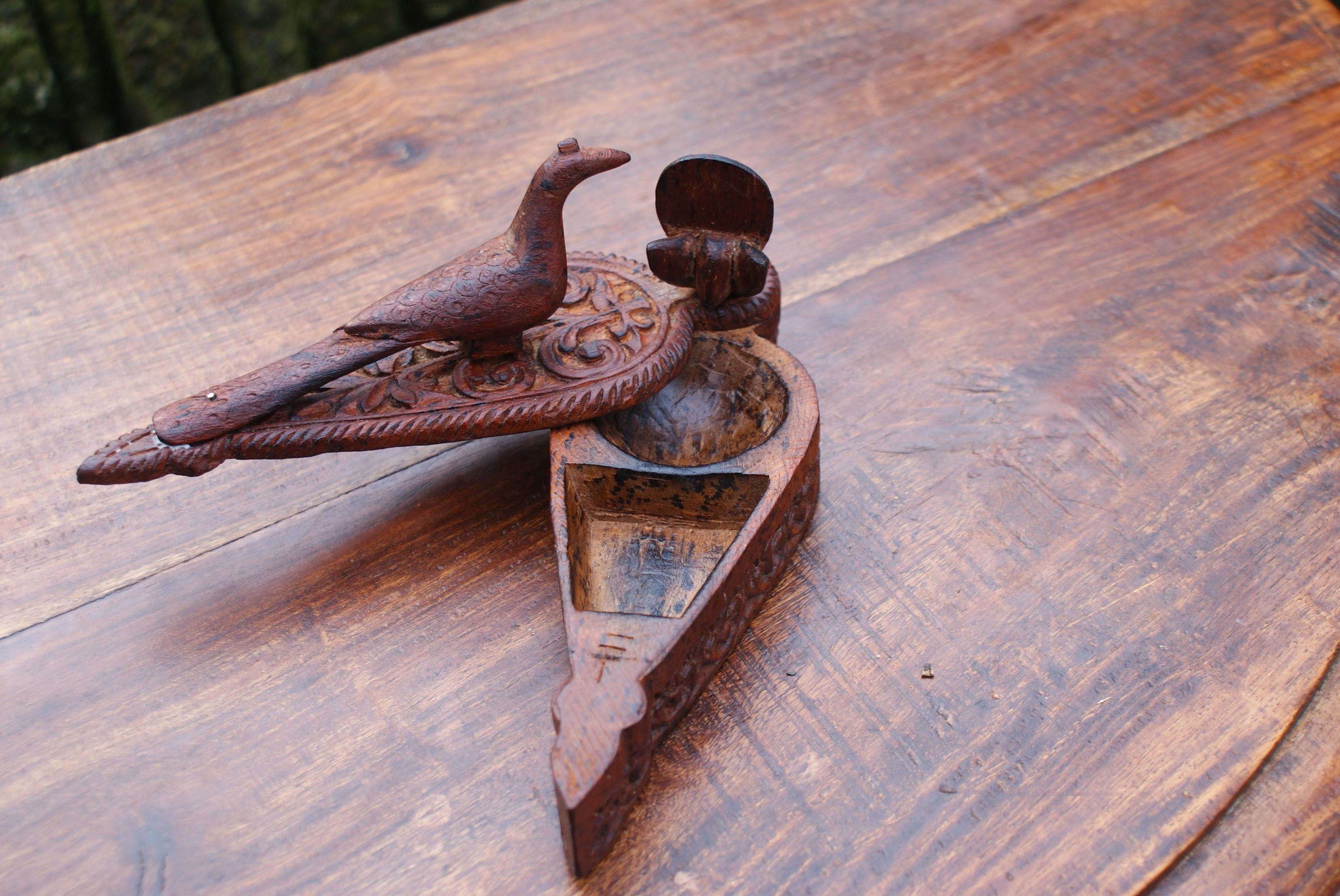 Stunning kumkuma powder boxed used to hold powder for use in a tika ceremony. This has a lovely patina with stunning carvings and a peacock on top a sacred bird in Hinduism with links to many deities. The tika ceremony is a Hindu tradition that involves applying a paste called tilak to the forehead of the groom-to-be. This would make a lovely trinket box to hold a few rings or charms.