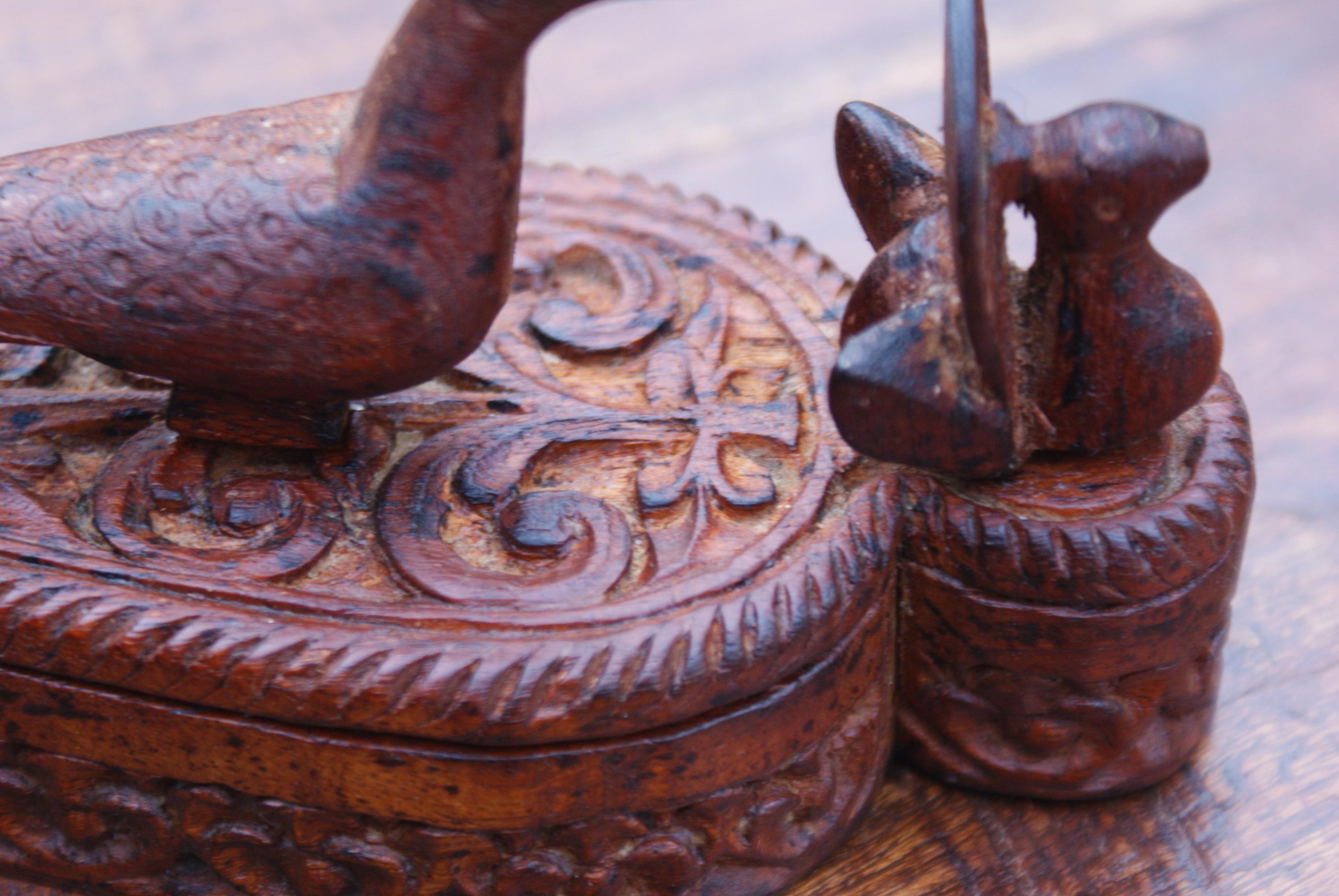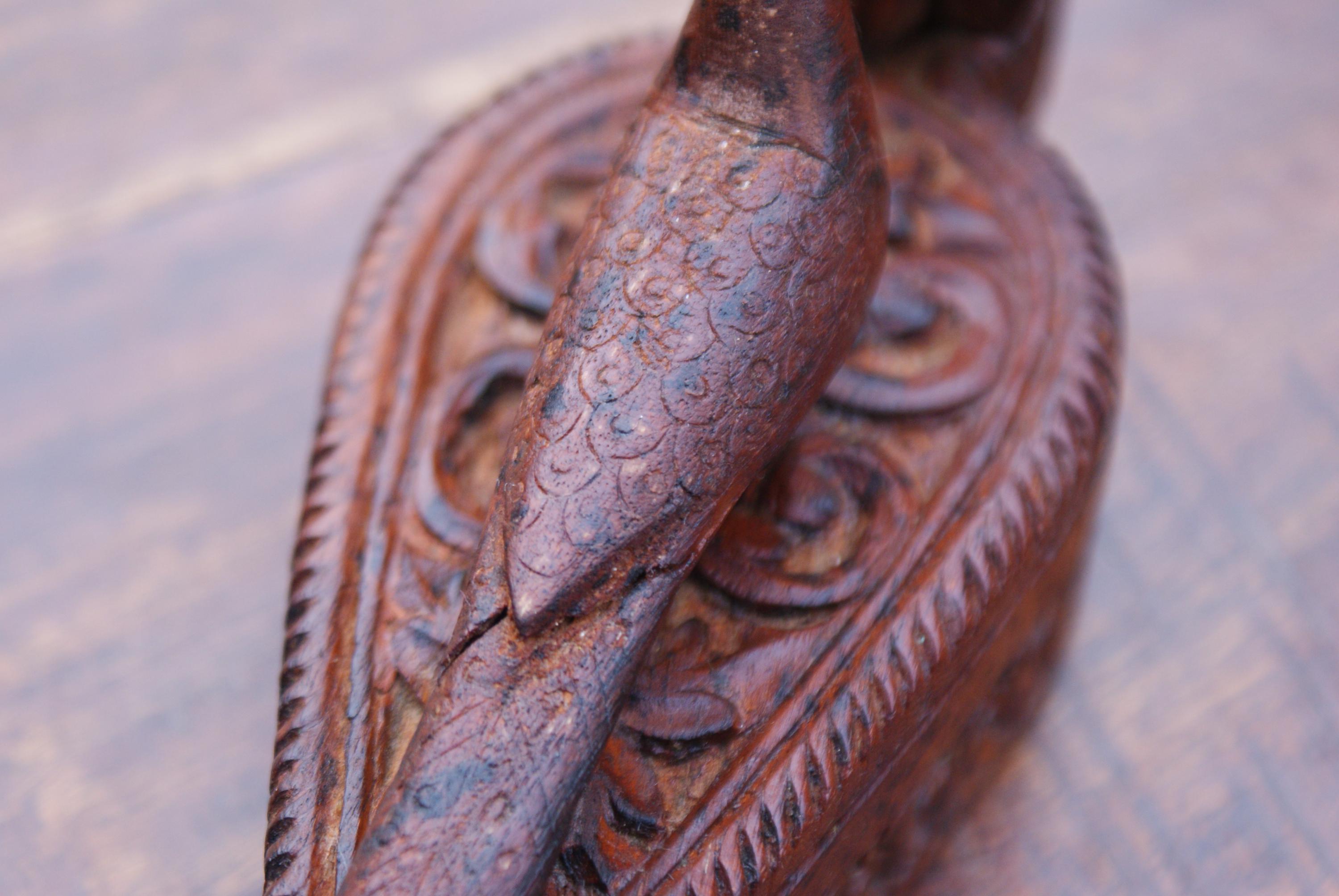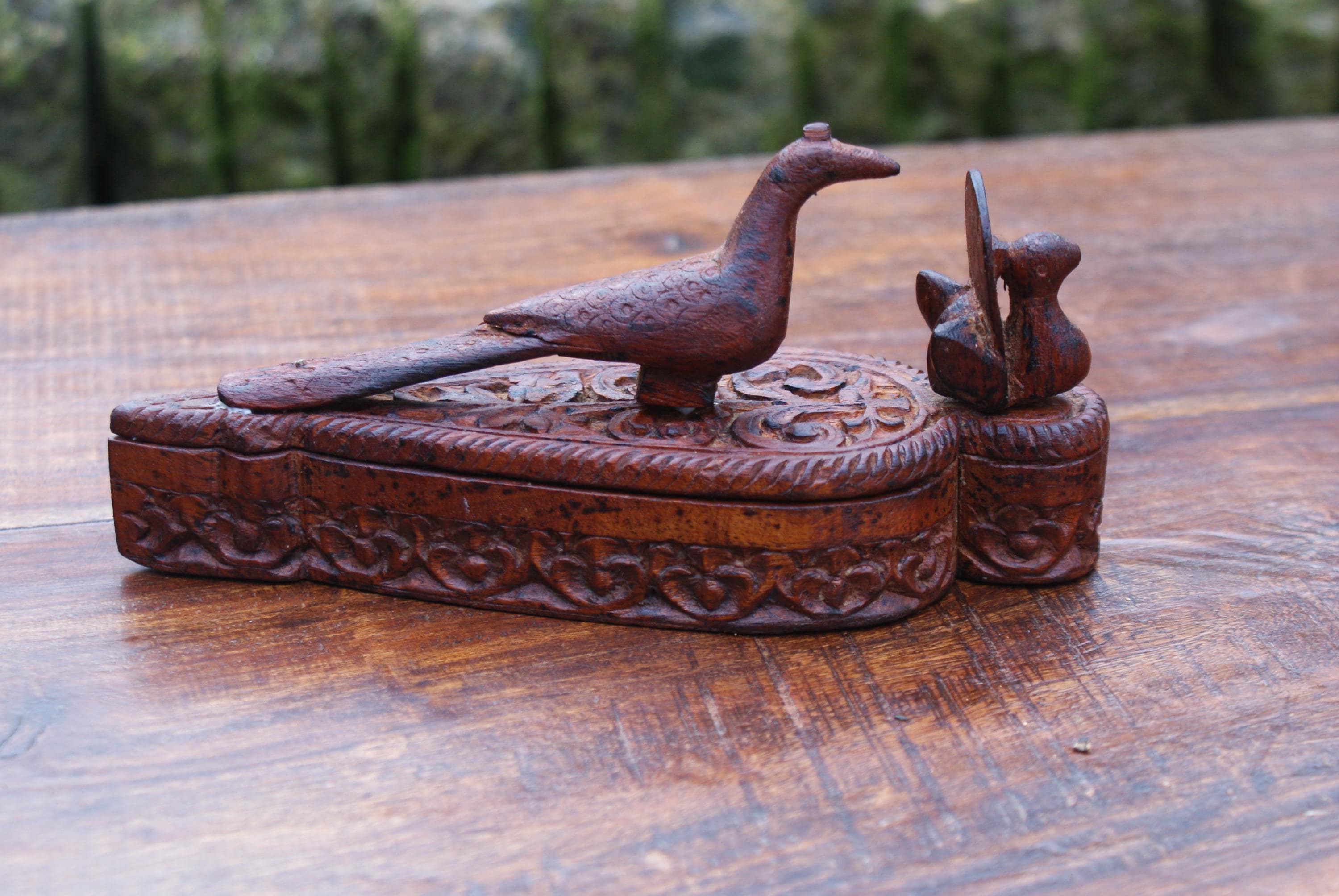 Stunning kumkuma powder boxed used to hold powder for use in a tika ceremony. This has a lovely patina with stunning carvings and a peacock on top a sacred bird in Hinduism with links to many deities. The tika ceremony is a Hindu tradition that involves applying a paste called tilak to the forehead of the groom-to-be. This would make a lovely trinket box to hold a few rings or charms.