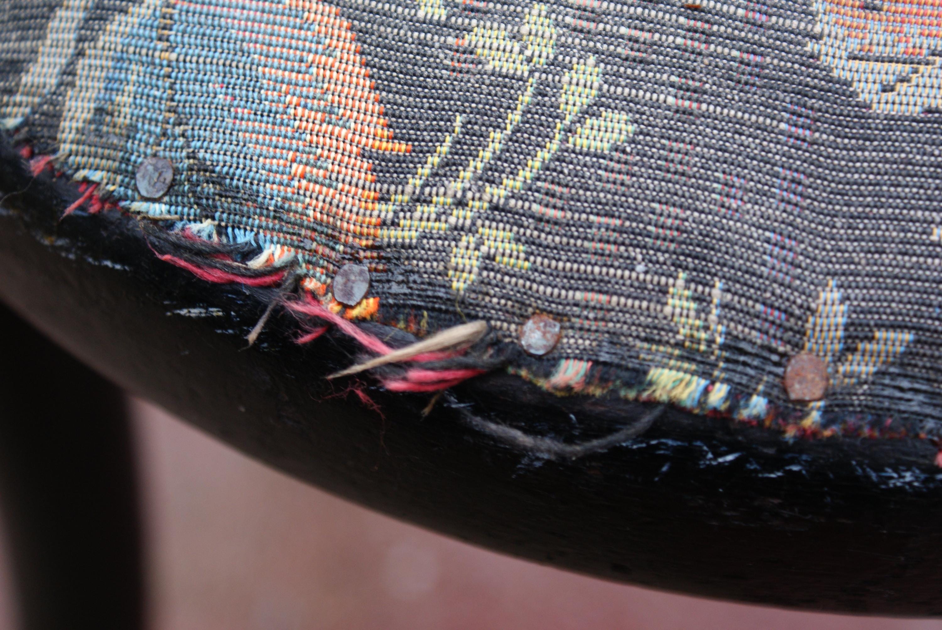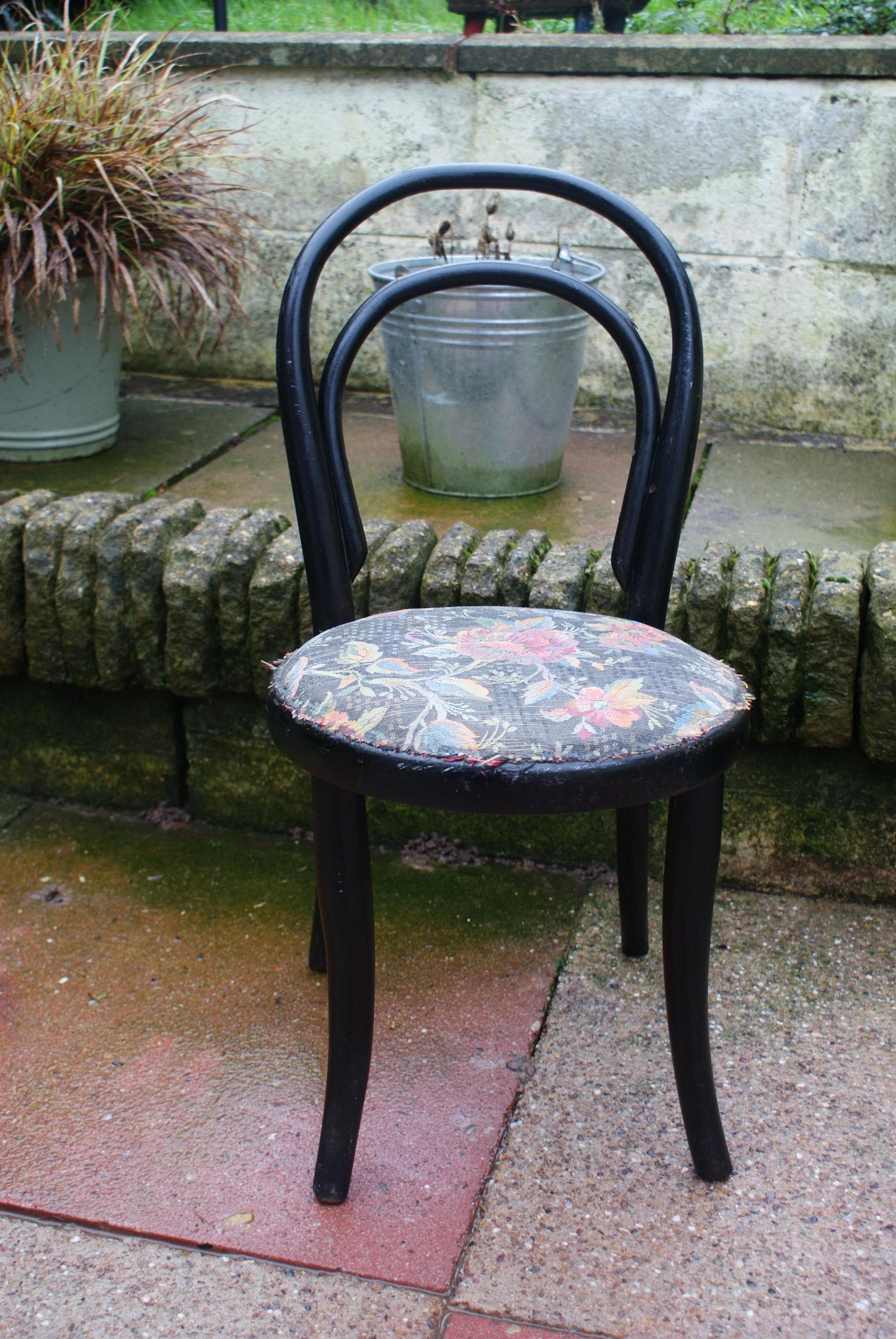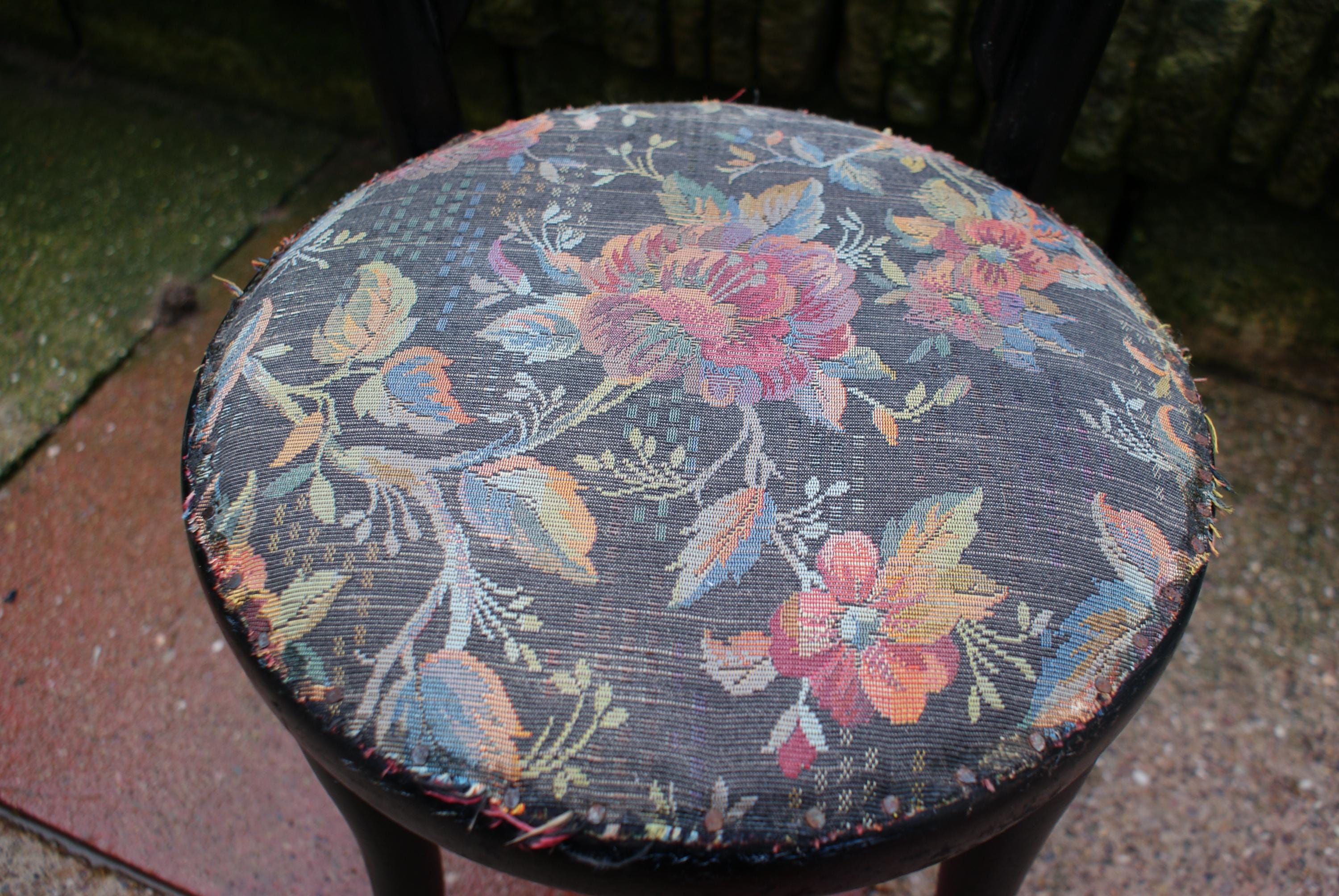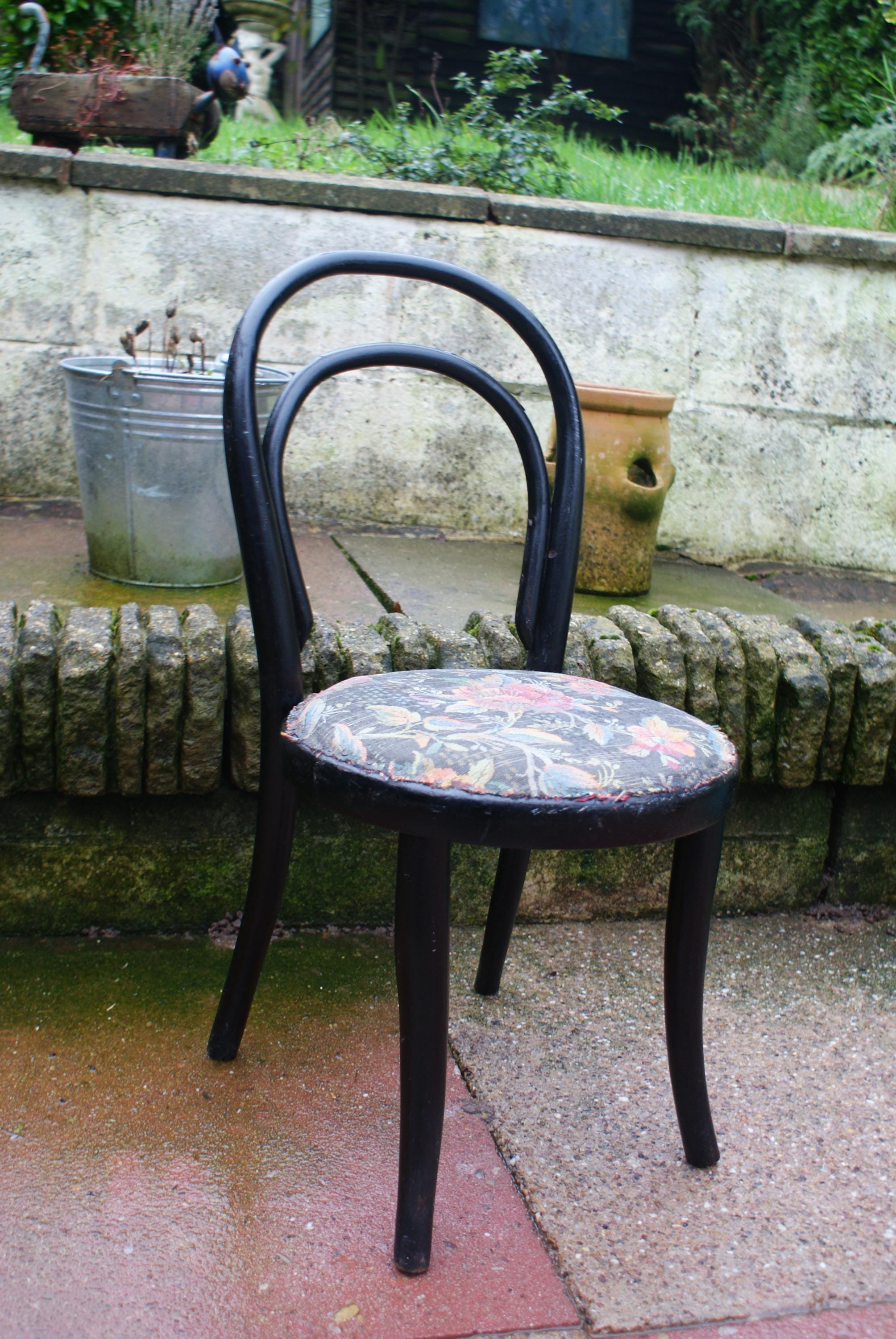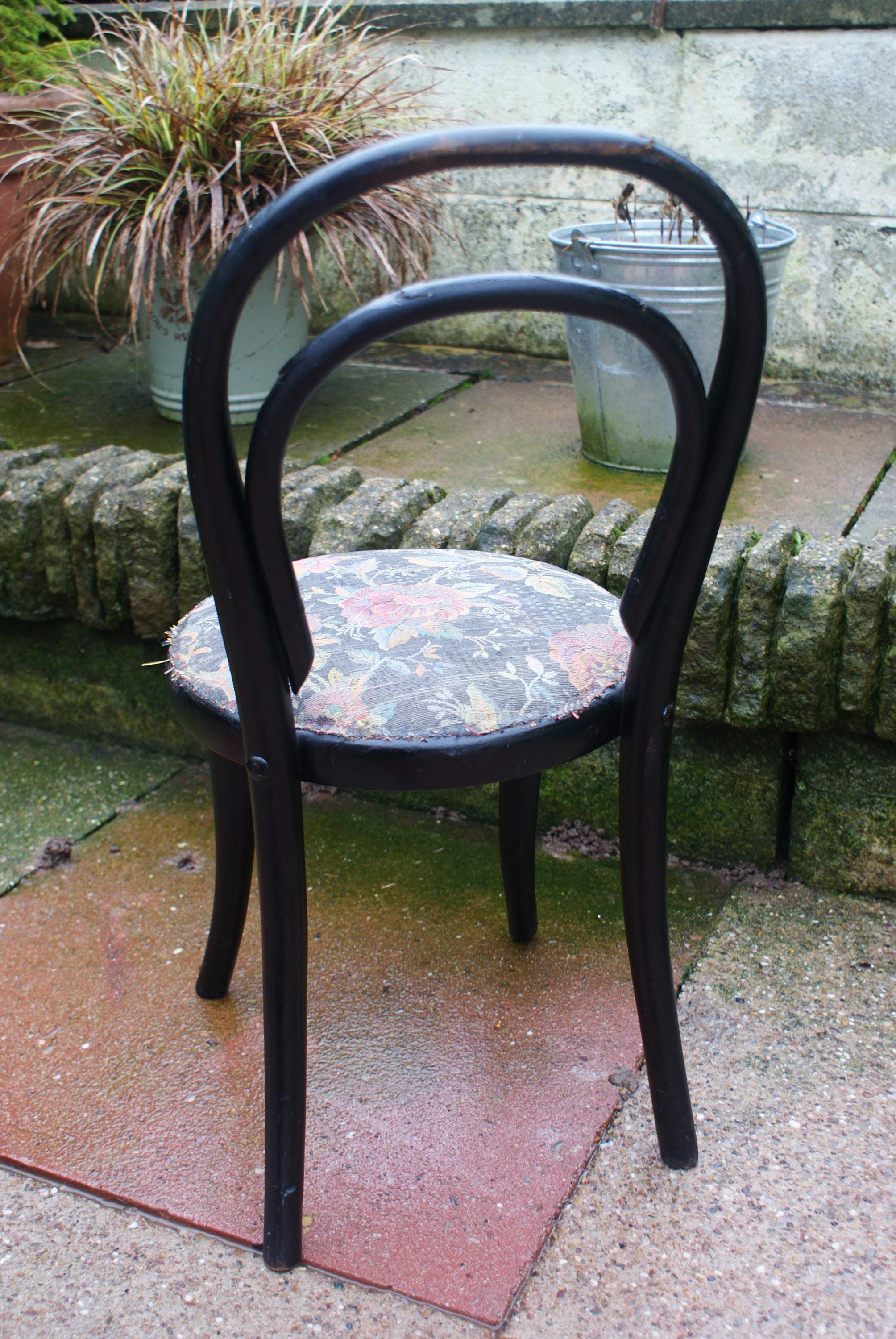 Stunning bentwood child's chair, a fantastic patina to the wood and a lovely pattern on the vintage upholstery. a lovely display piece or dolls chair. Some damage to the bentwood as pictured but has been glued and feels strong and light fraying to the upholstery but in keeping with the look and age of this piece. a few historical woodworm holes underneath but this has been treated again as a precaution. The seat is newer but the upholstery is original.