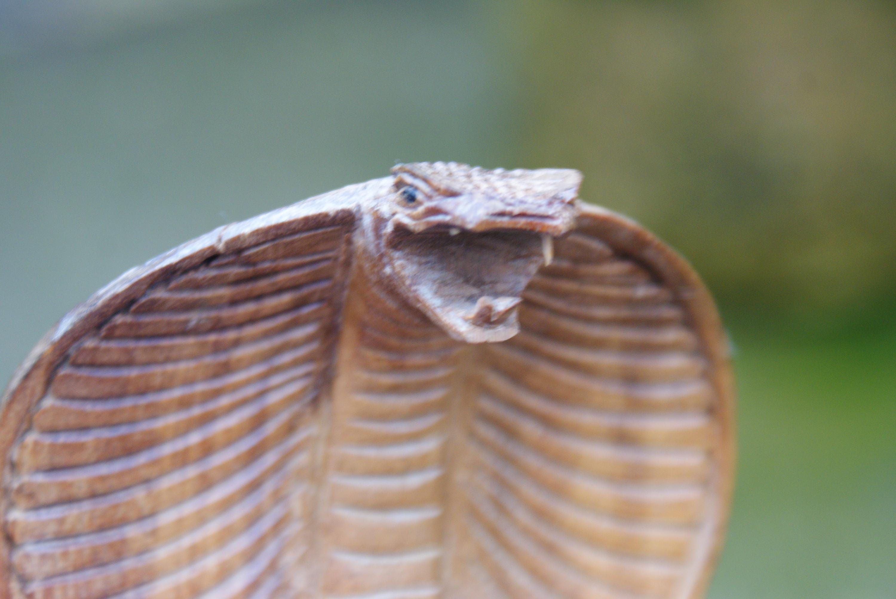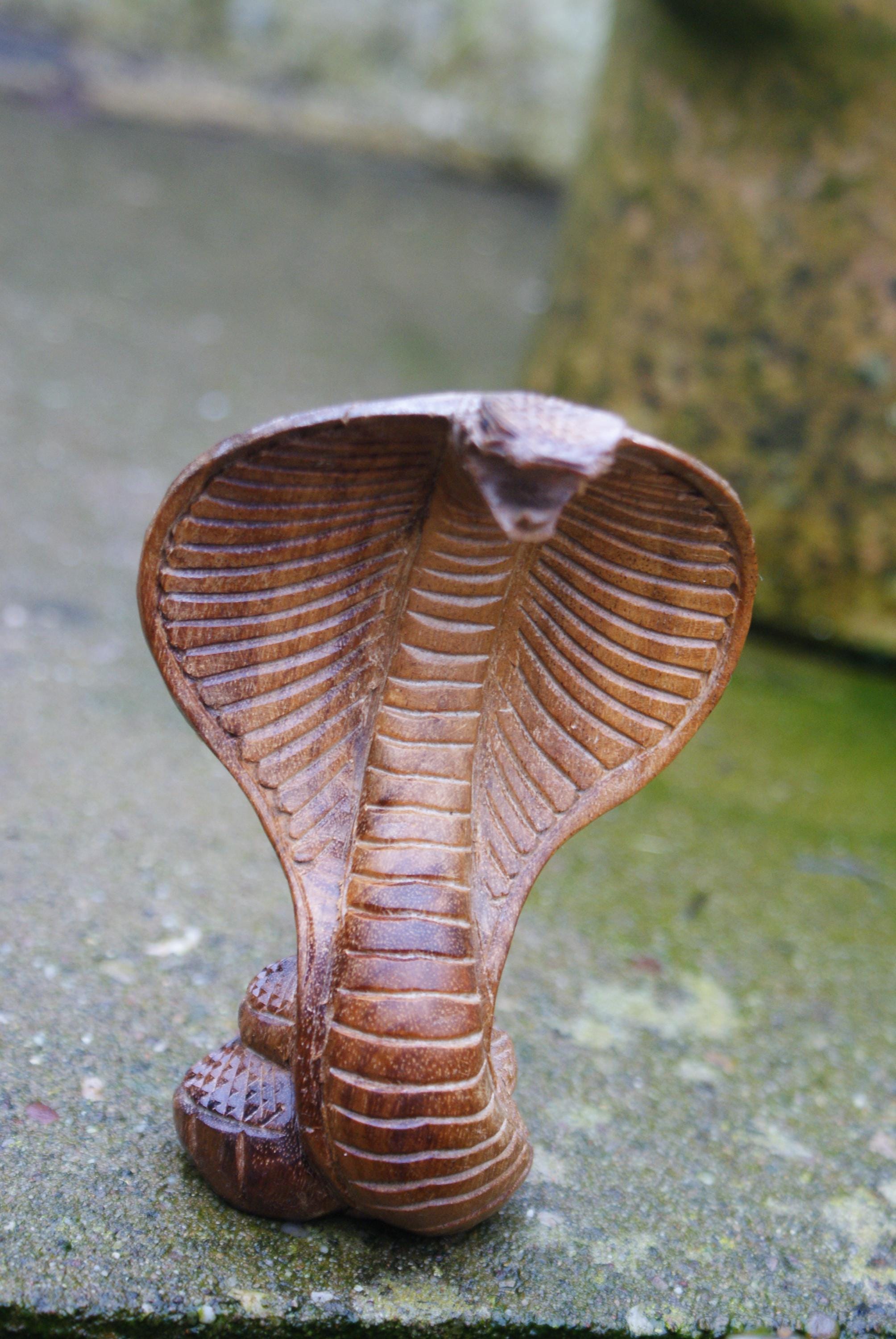 Lovely carved wooden cobra, hand carved with nice detail. One fang is missing as pictured but they are quite delicate and with some age to them. This stands at approximately 12cm in height.