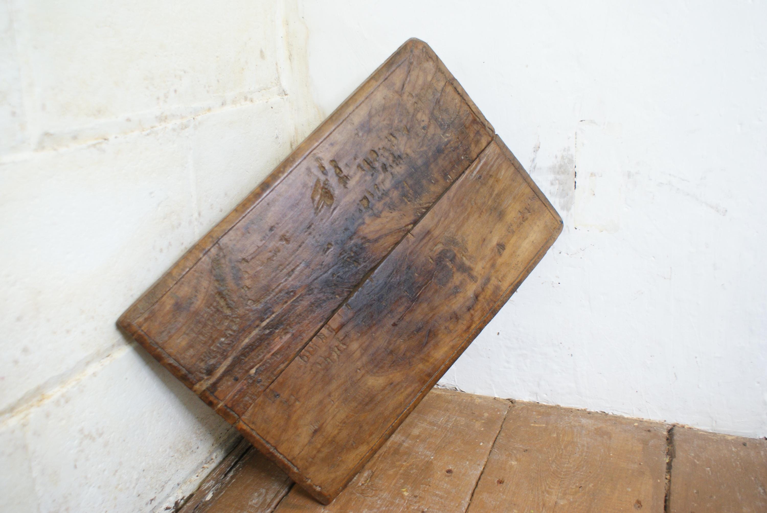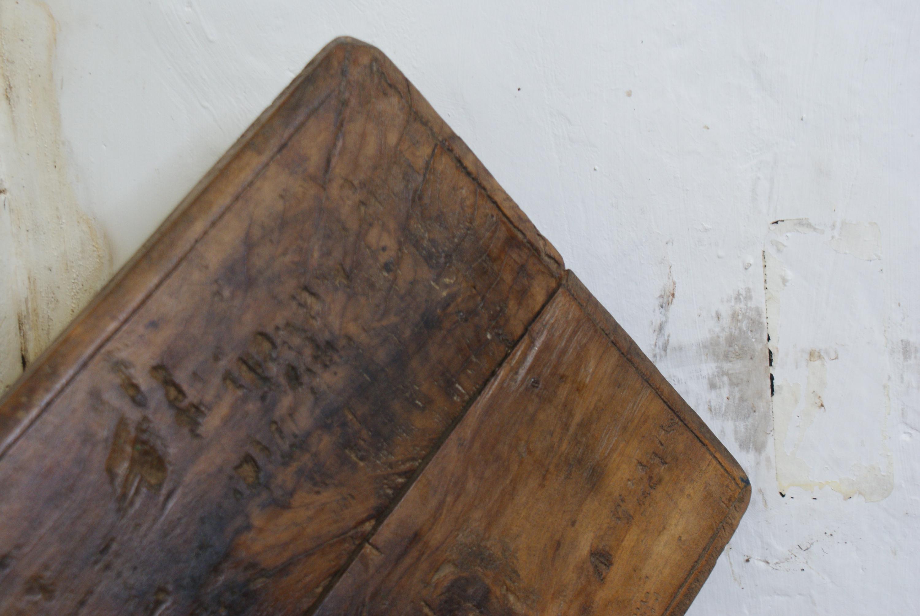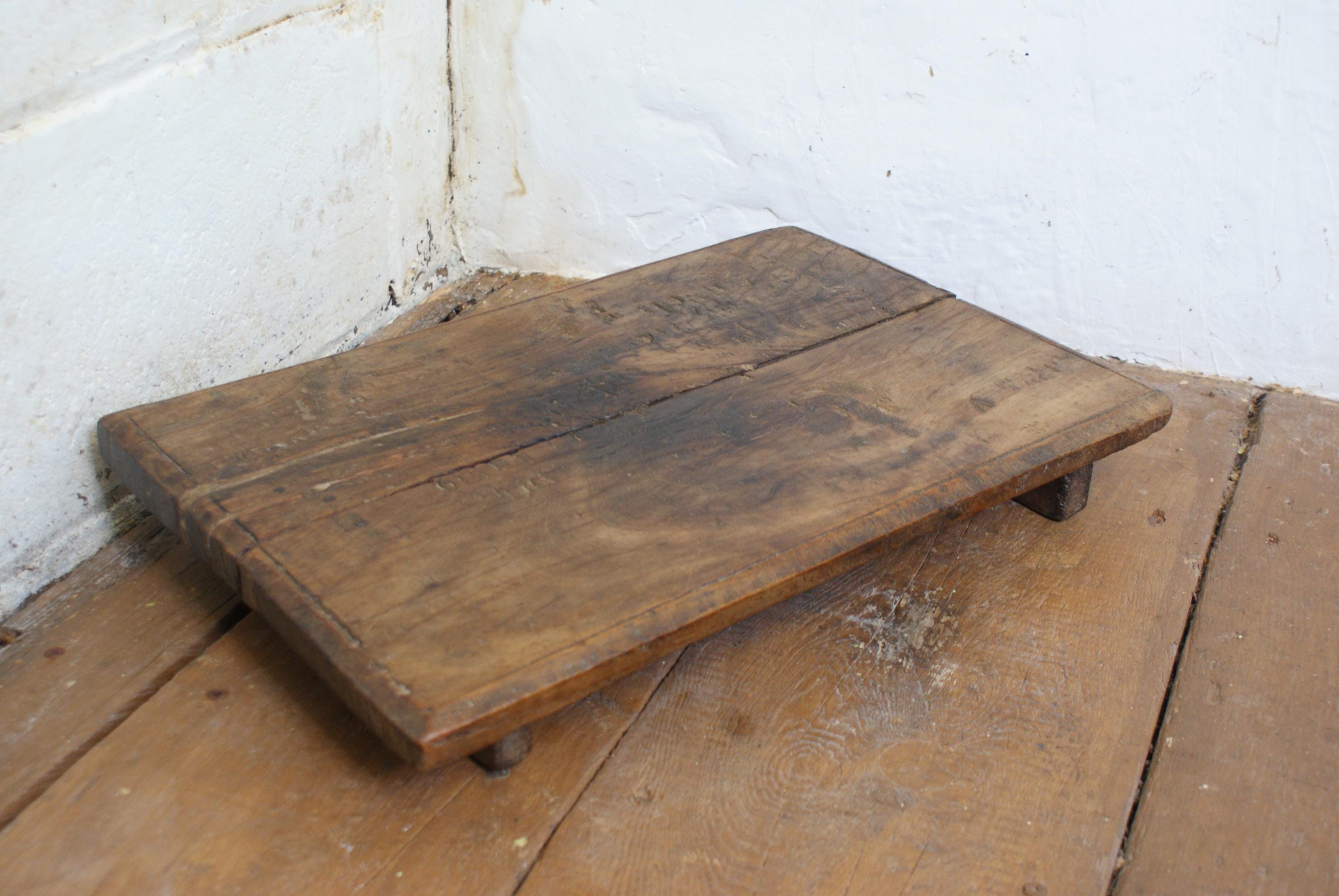 Stunning antique Indian low table or cutting board. Bajot, also referred to as a Bajot Choki or a rustic footed chapati board. These are traditionally used as low stools or small tables. This has a fantastic patina all over from decades of use and a real unique look. a perfect piece for creating eye catching displays.
