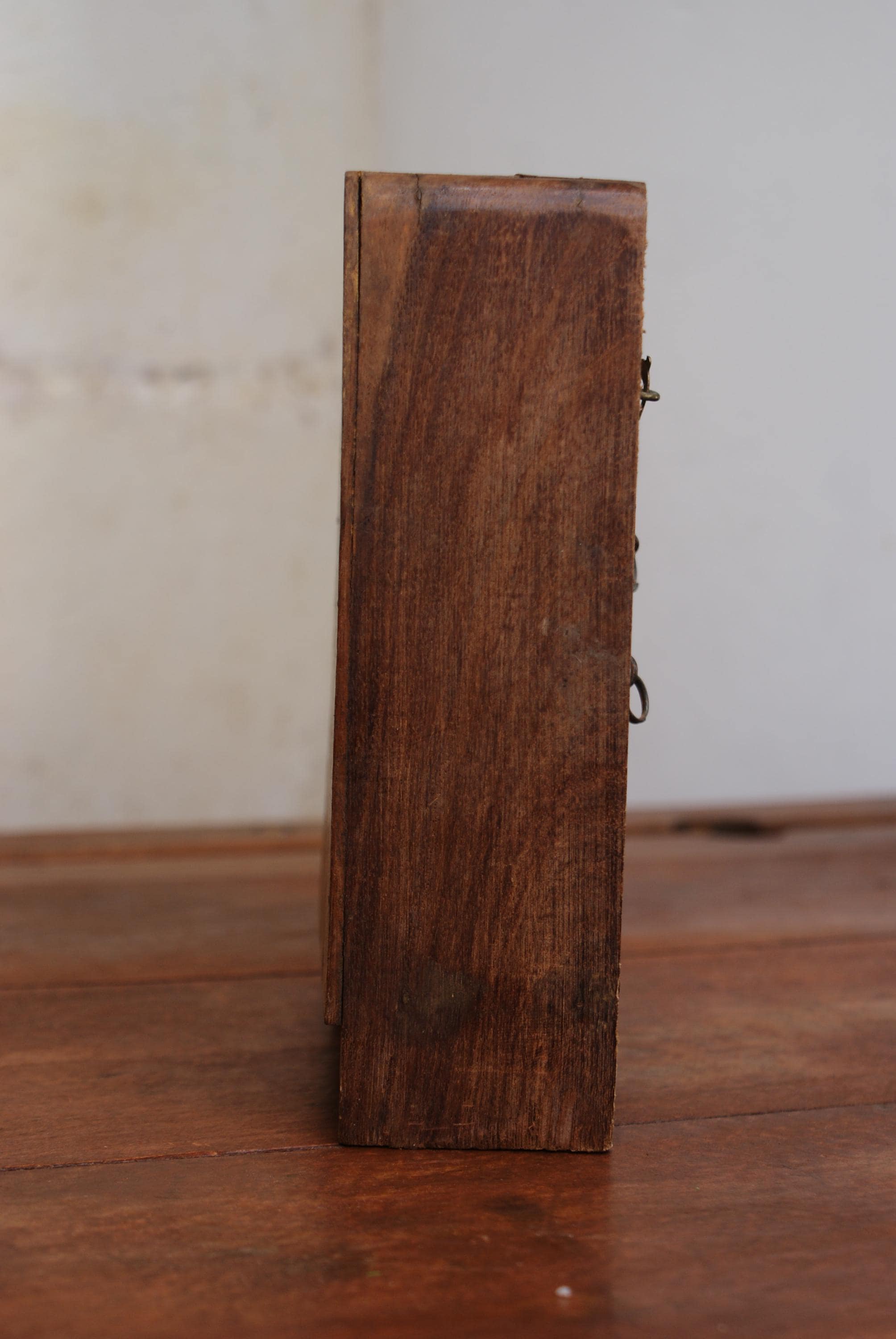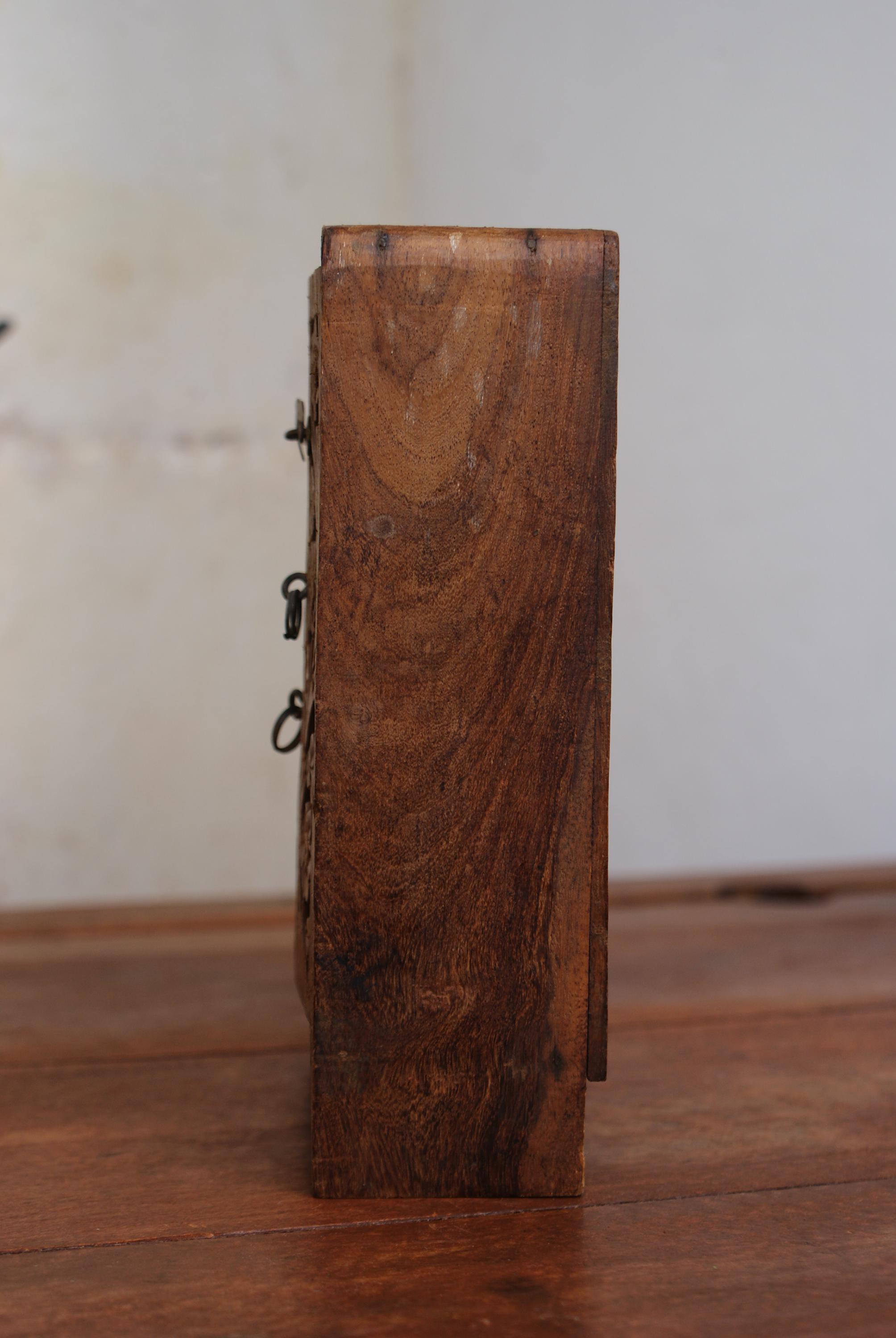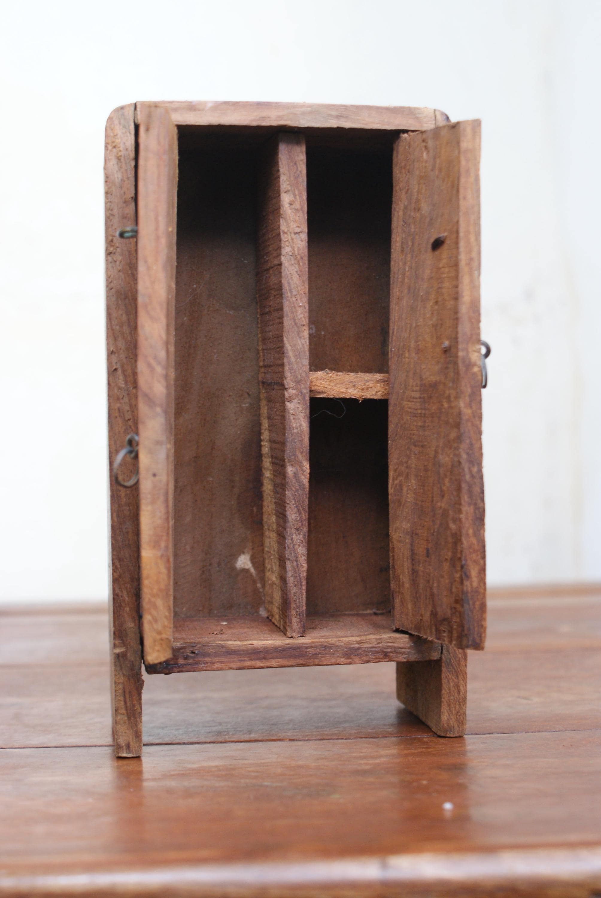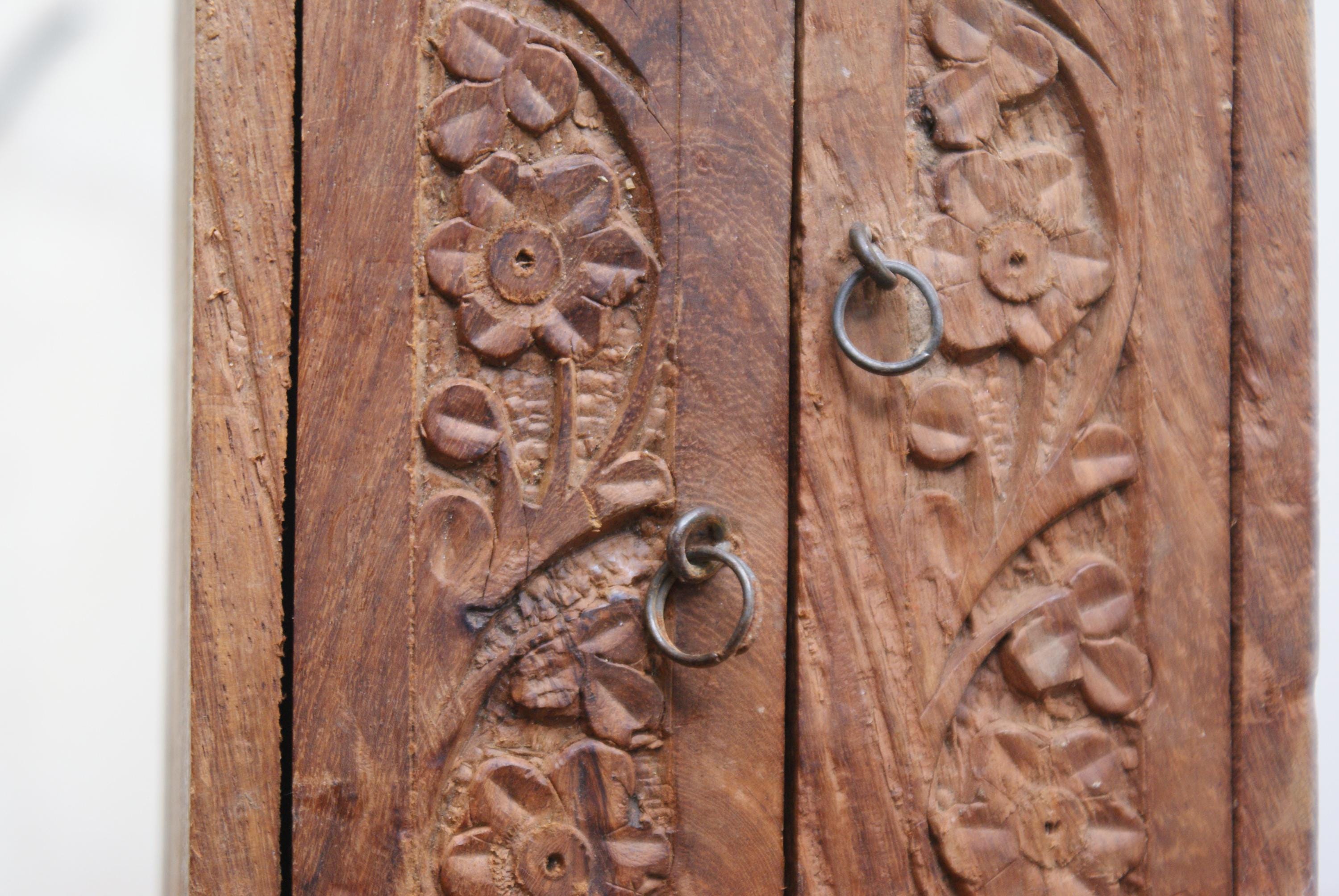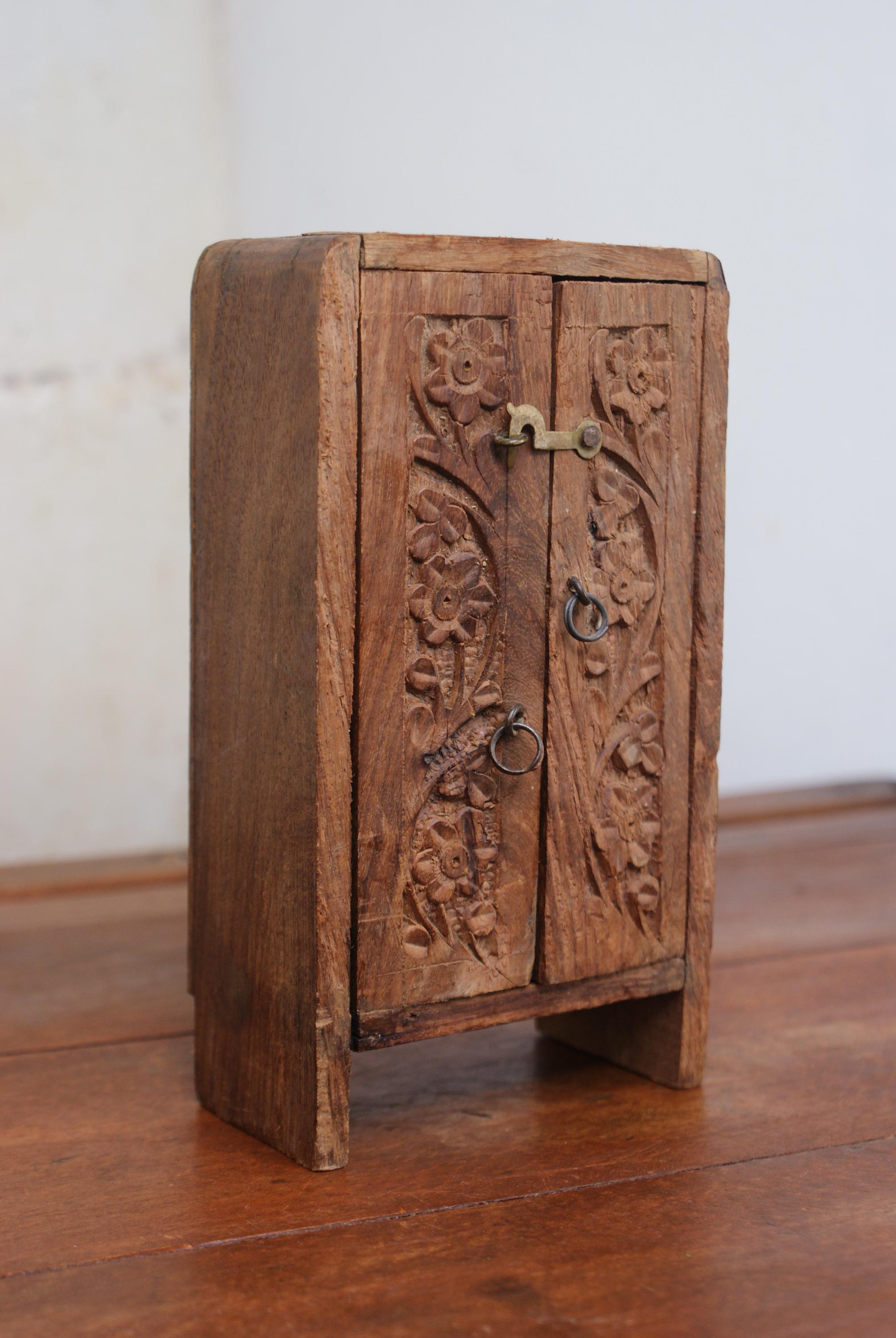 Lovely miniature folk art wardrobe with lovely carvings to the front with a very Indian inspired feel. A nice unusual looking piece.
