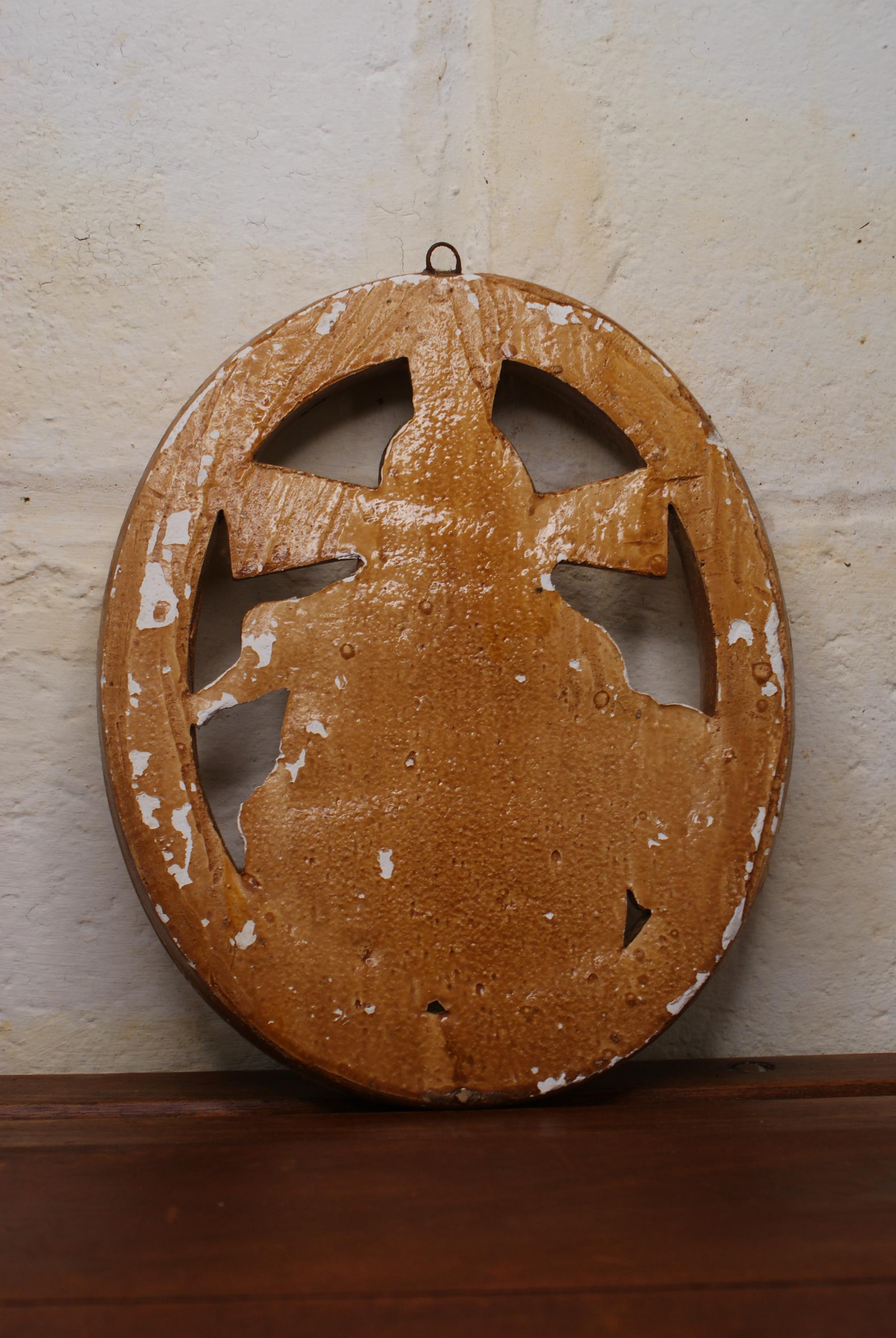 Lovely plaster mould of the sacred heart of Jesus, a prominent symbol in Catholicism the sacred heart is symbol of love, mercy and Gods boundless love for humanity. Nice wear and patina to the yellow paint revealing some plaster underneath.