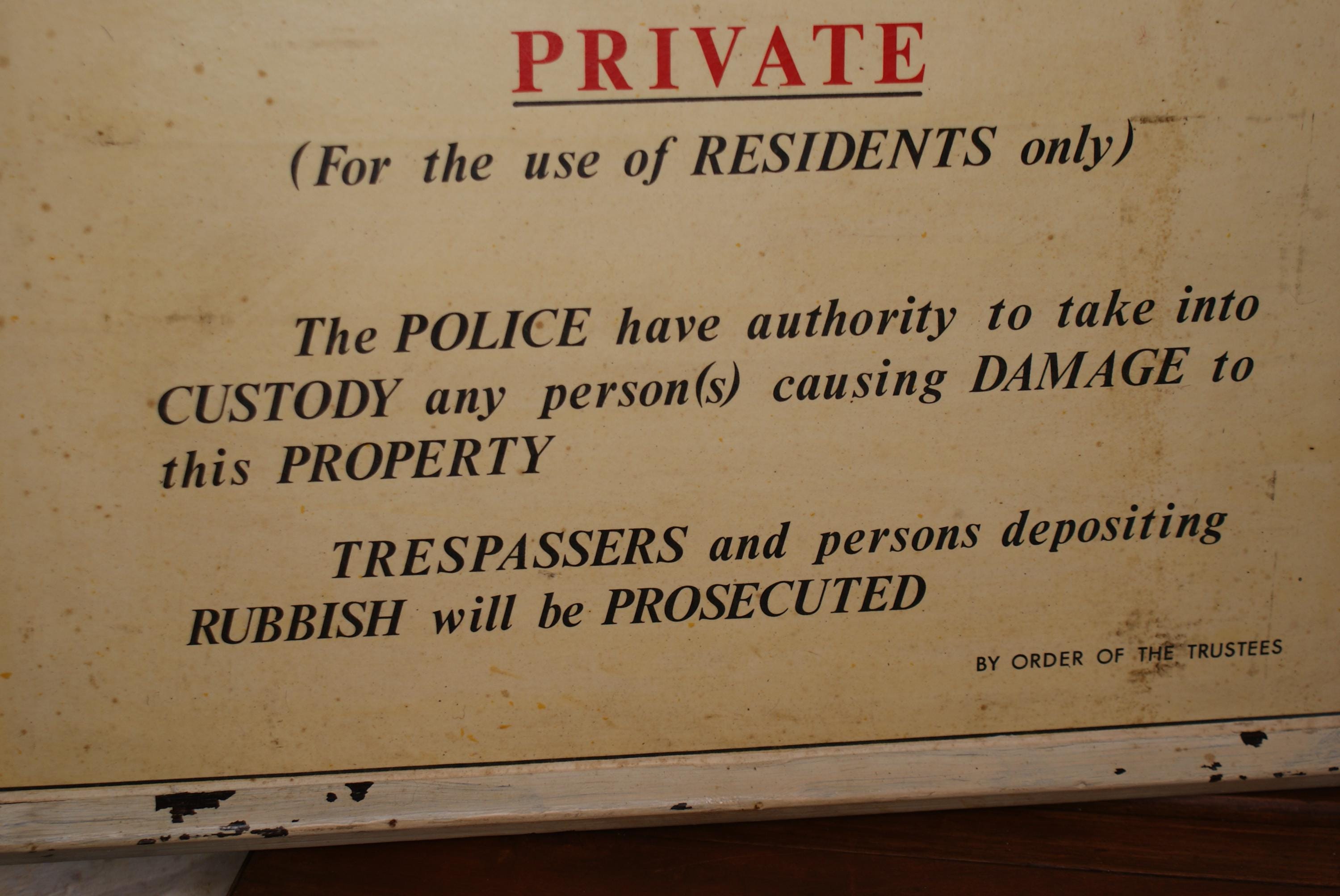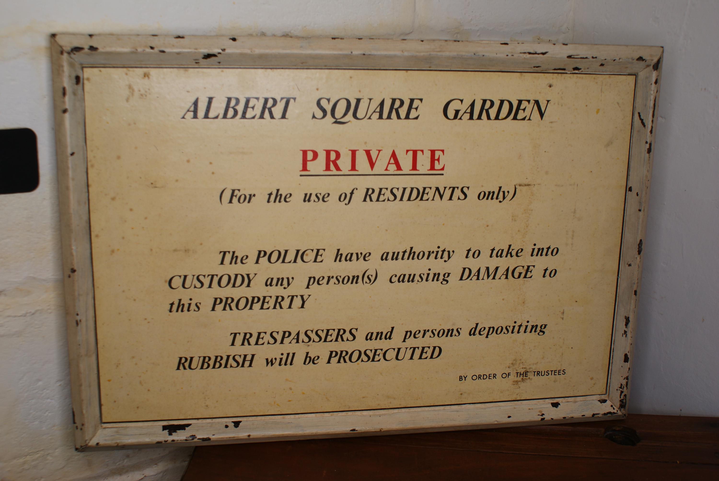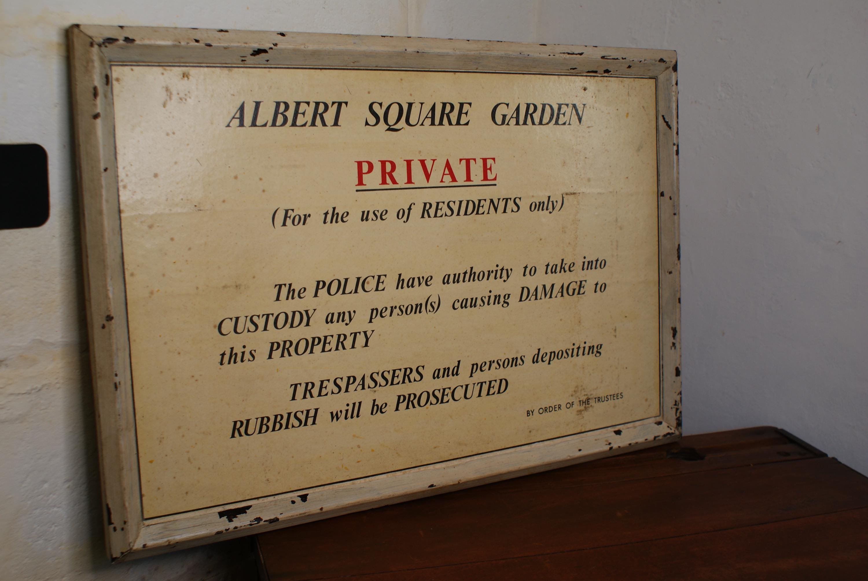 A stunning sign from Albert square garden located in Stepney, south-east London. Albert square gardens are a grade II listed site and was opened to the public in 1906 when when London County Council bought the gardens, this sign stating that the gardens are for use of the residents possibly pre dates this decision to publicly open the gardens. its a really fun one of a kind piece of history with a fantastic quality and patina and a real conversation starter.