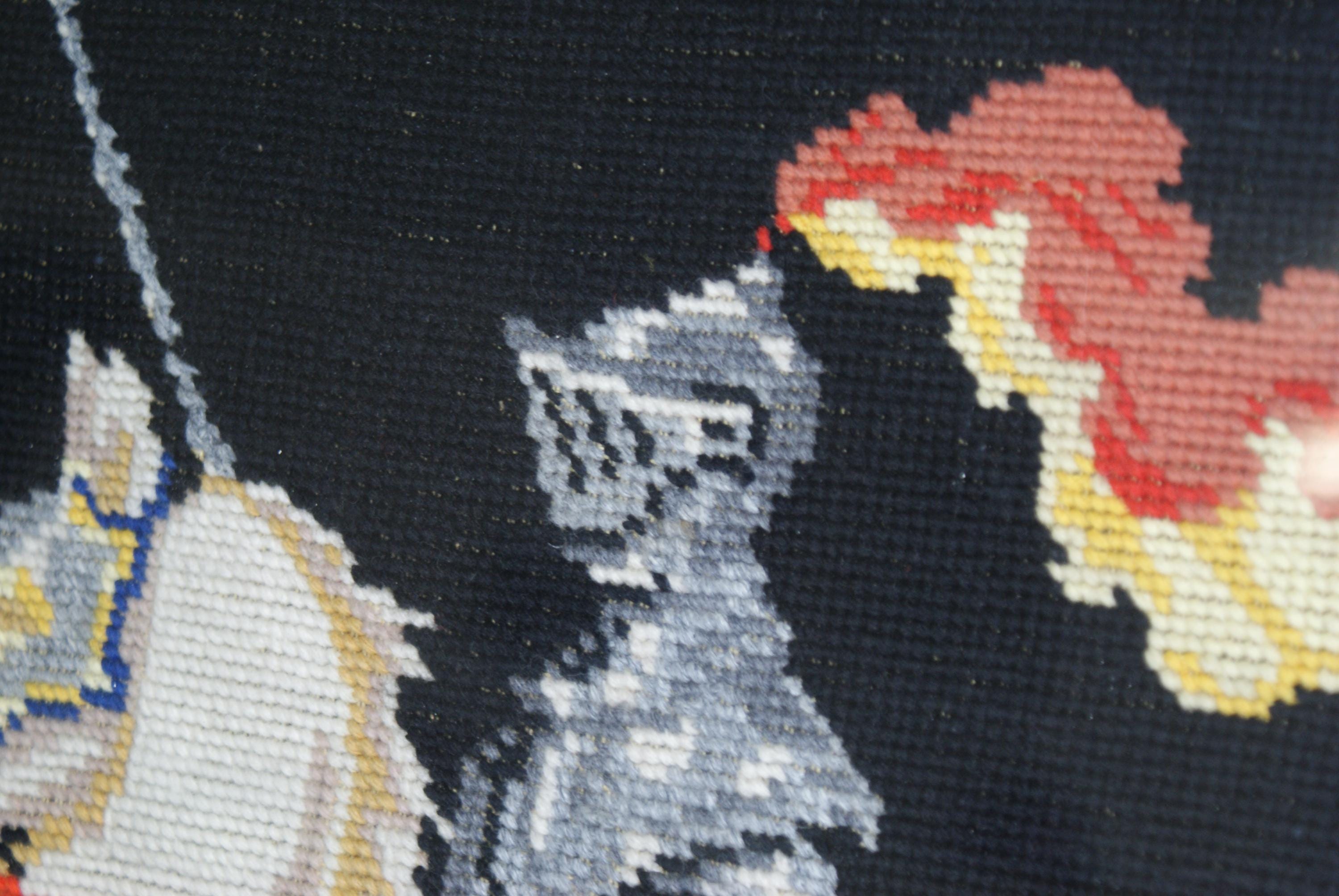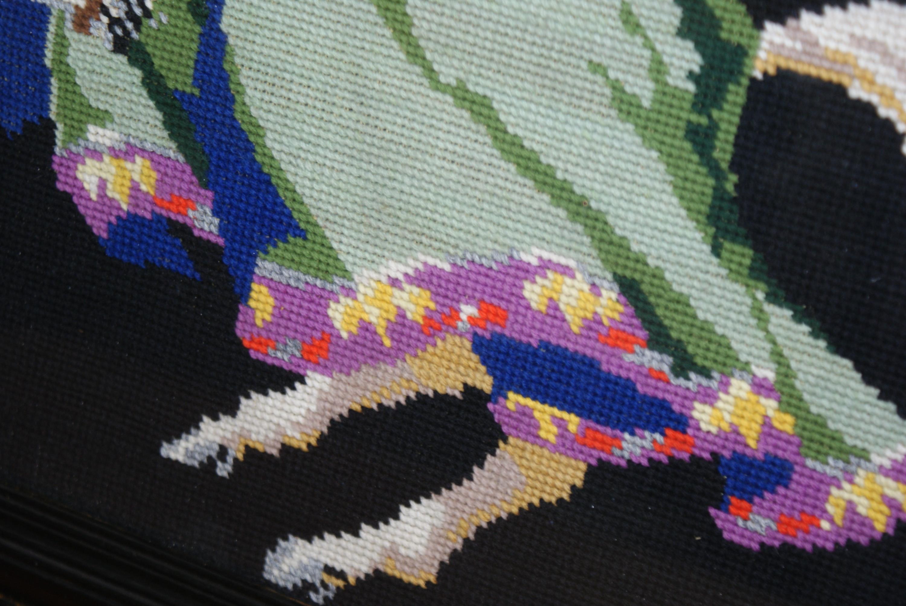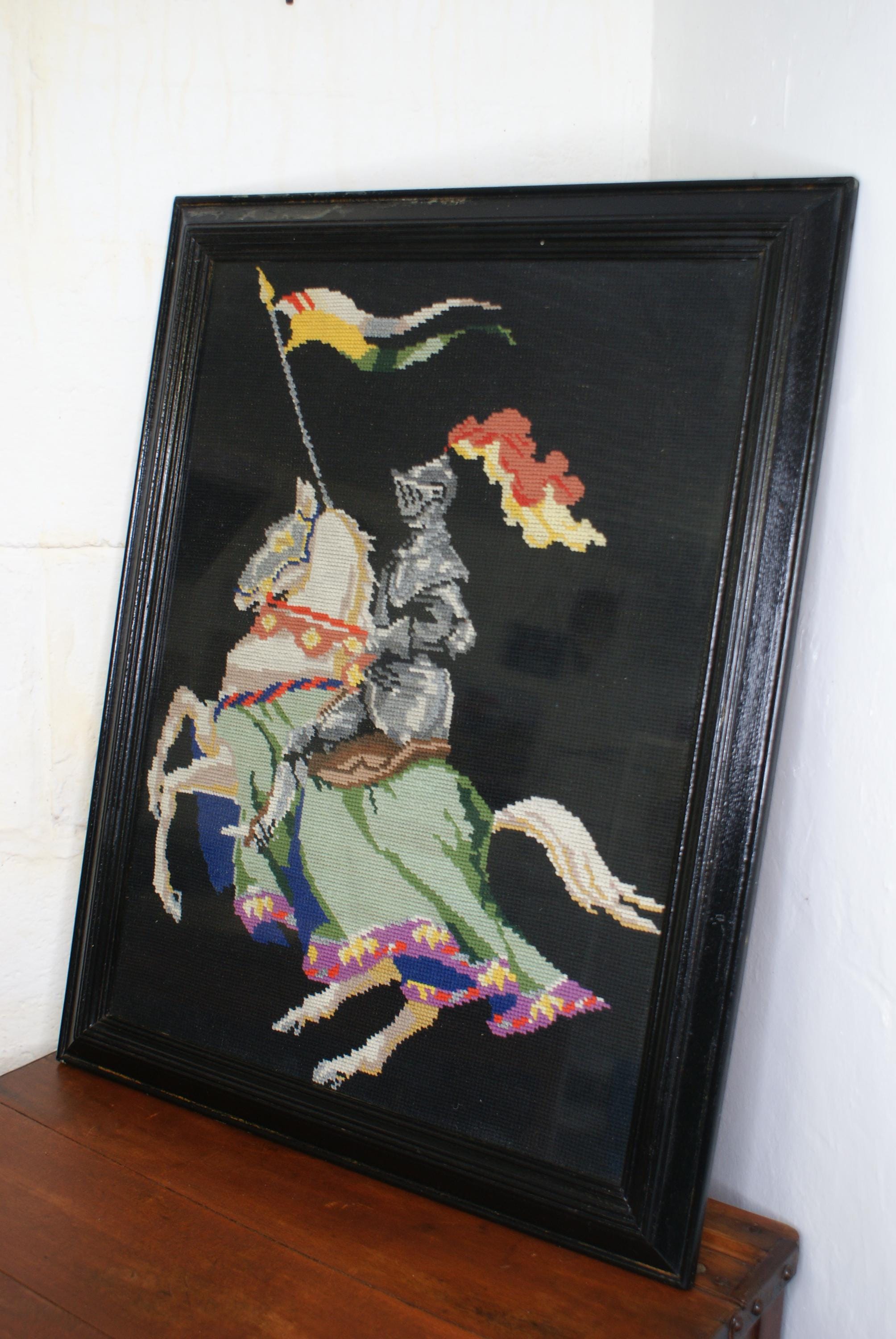 Stunning framed needlework tapestry of a knight. Originally a fire screen this has been framed behind glass as a fantastic piece of wall décor. some nice patina to the frame and in an overall fantastic condition.