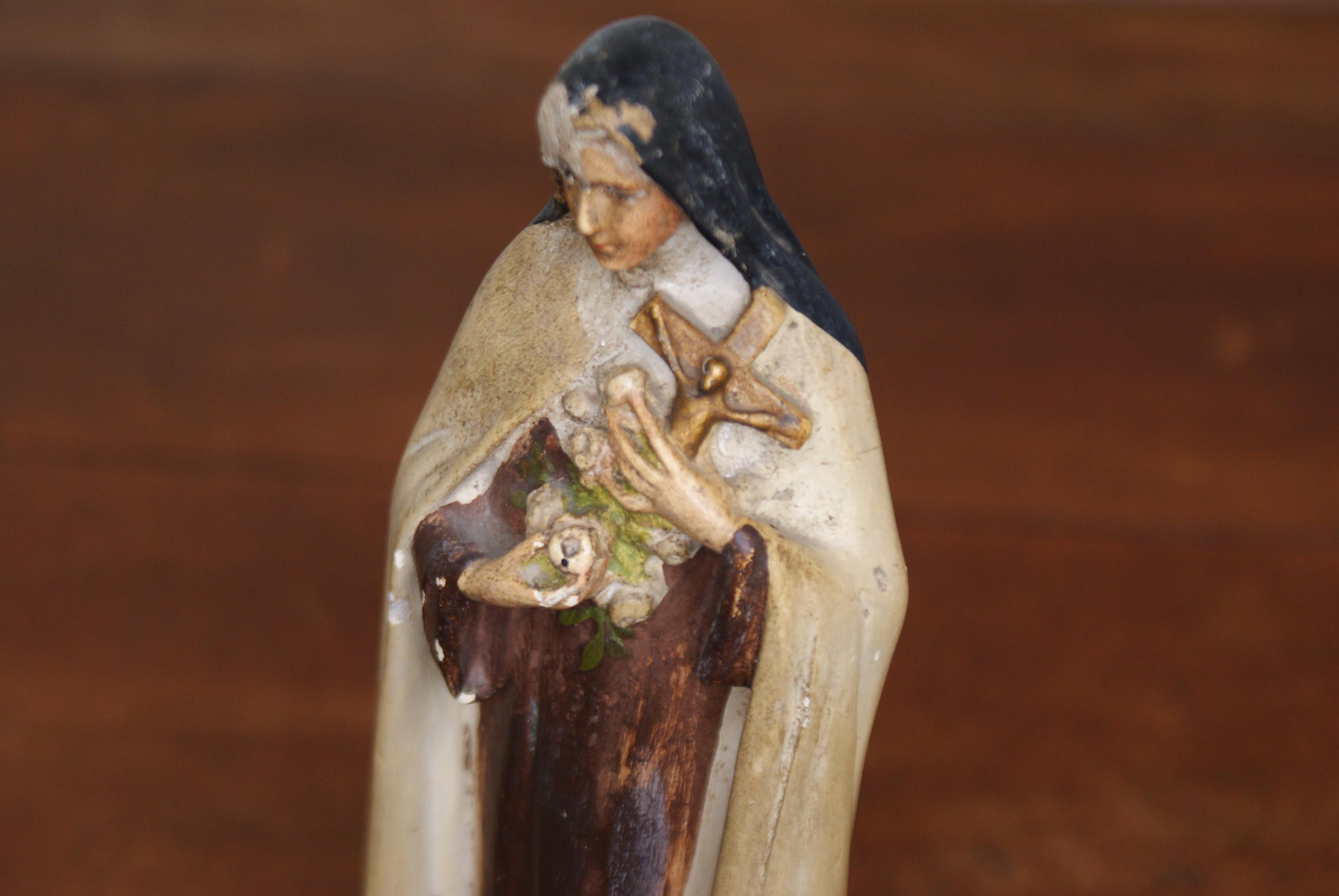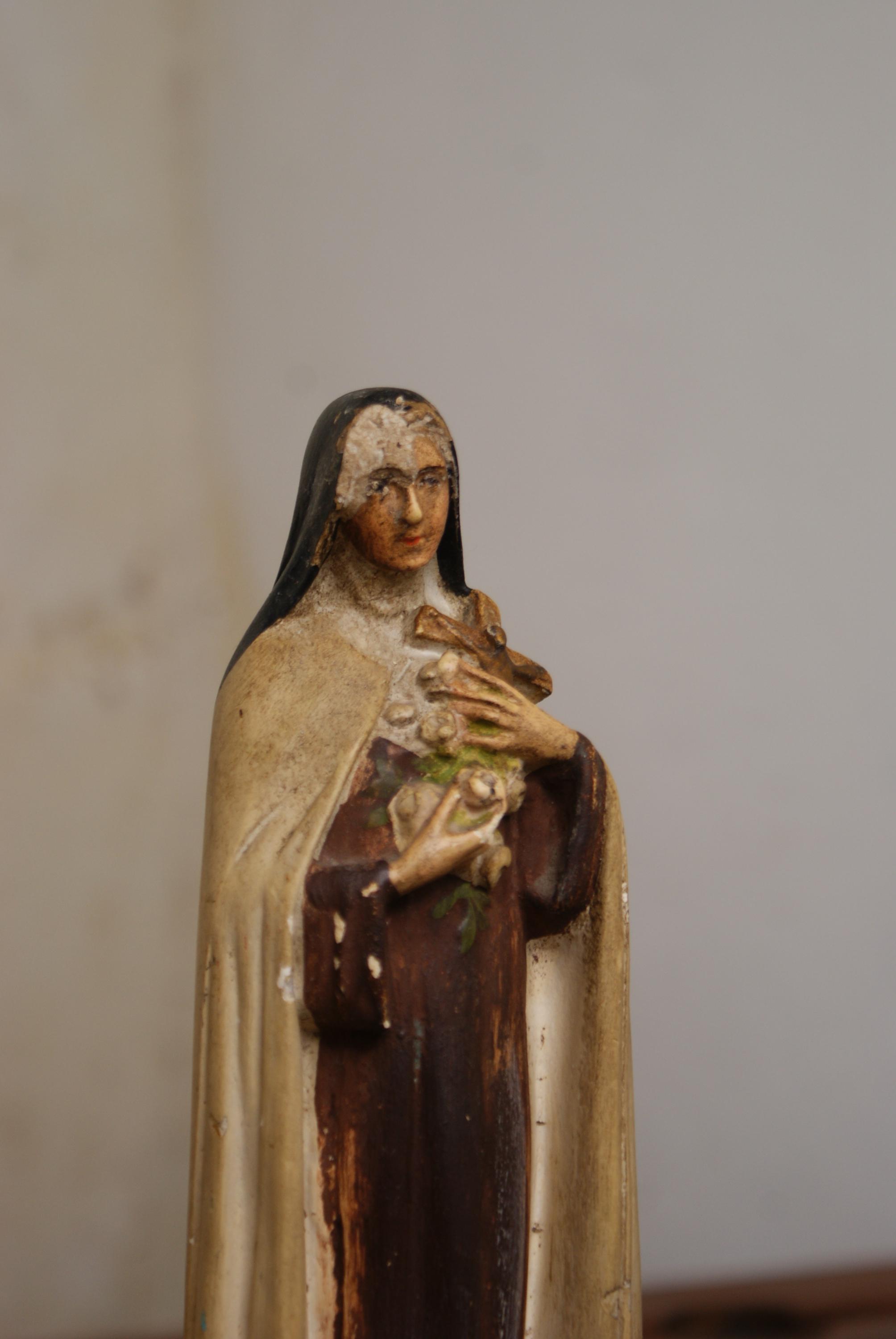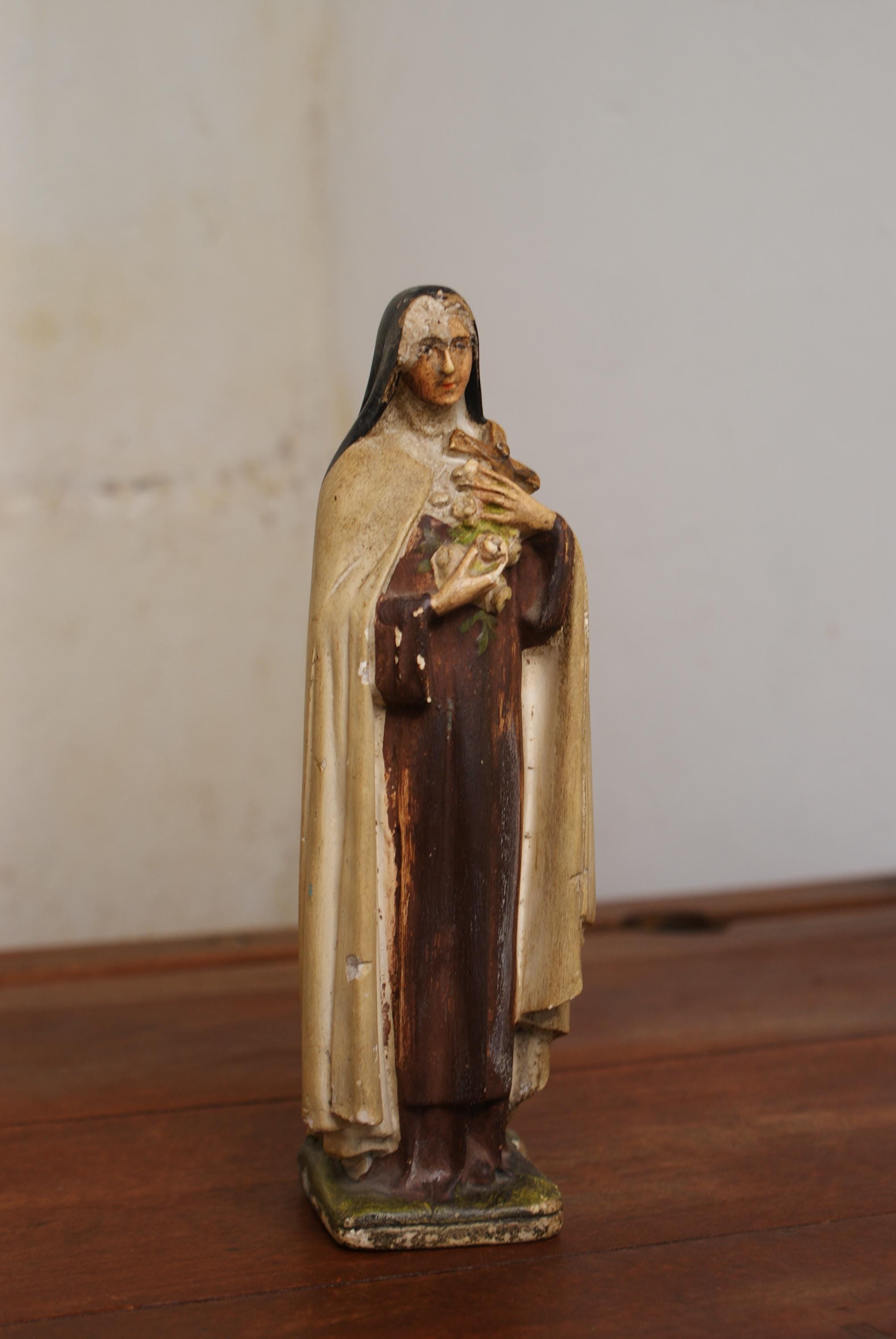 Stunning French plaster statue or Saint Thérèse of Lisieux. Saint Thérèse of Lisieux lived in the late 19th century 2nd January 1873 - 30th September 1897 is the patron saint of aviators, florists and missionaries. She is popularly known in English as the Little Flower of Jesus, or simply the Little Flower, and in French as la petite Thérèse. a lovely looking piece for a curio shelf and although damaged I think this has a unique look. The statue stands around 20cm tall.