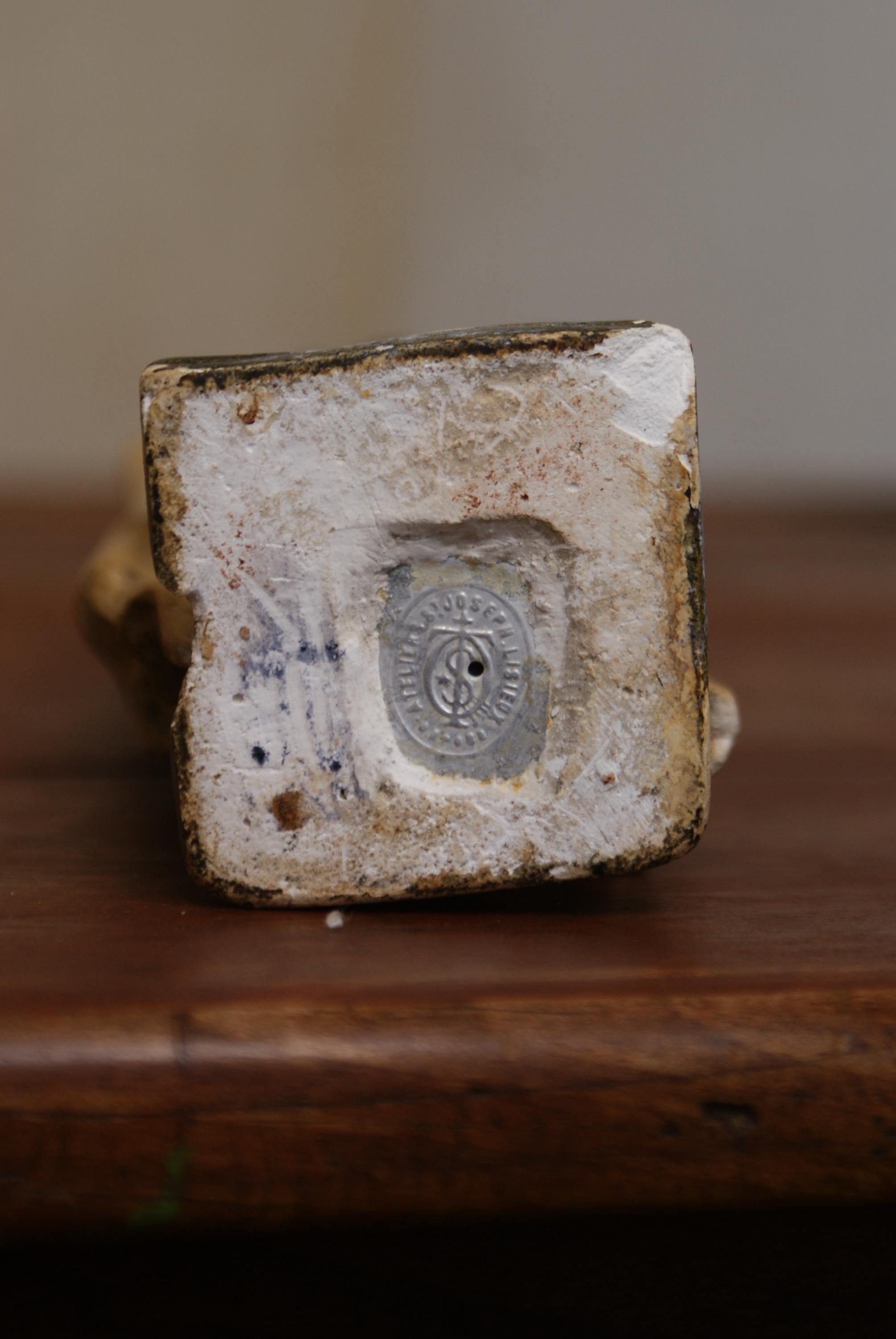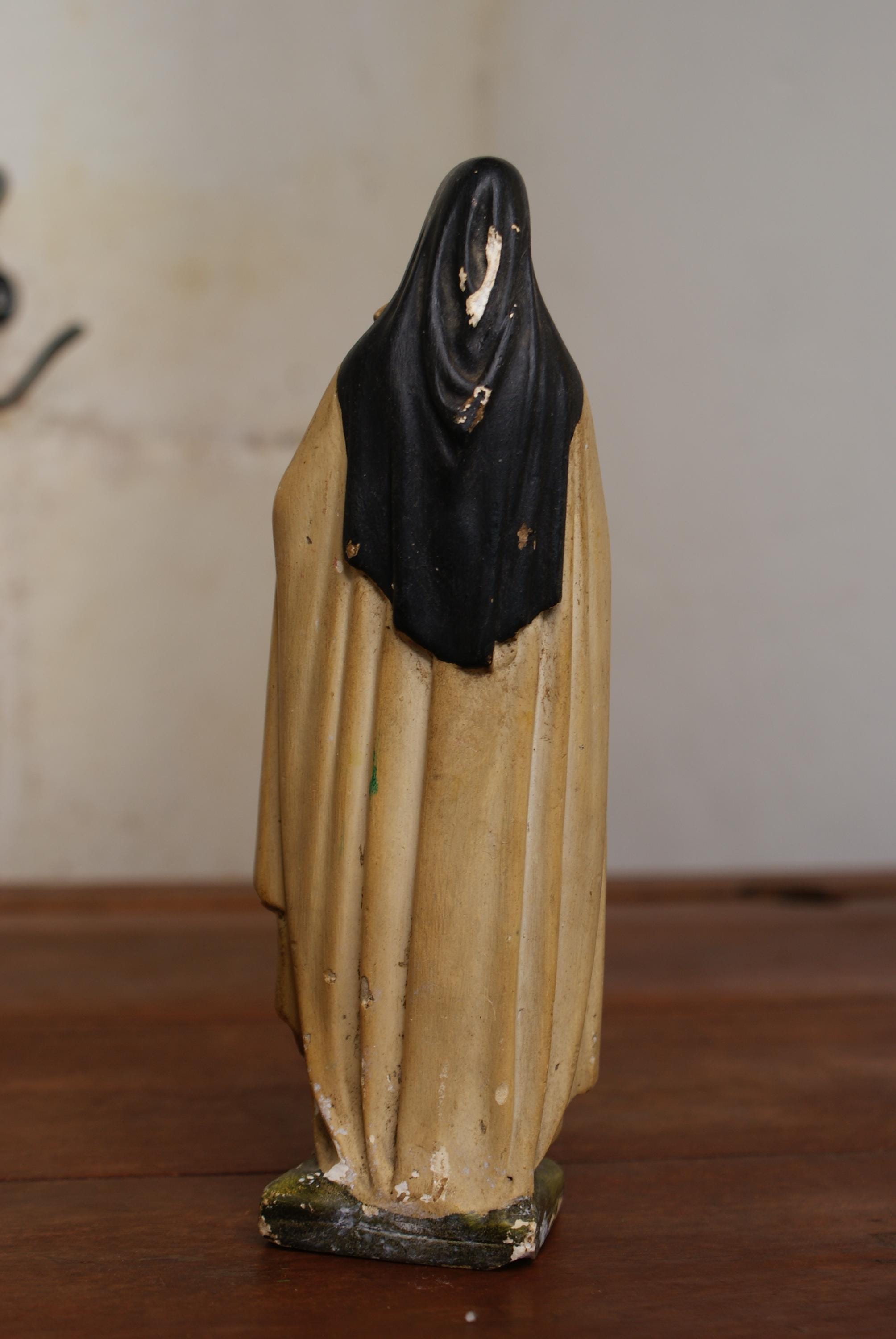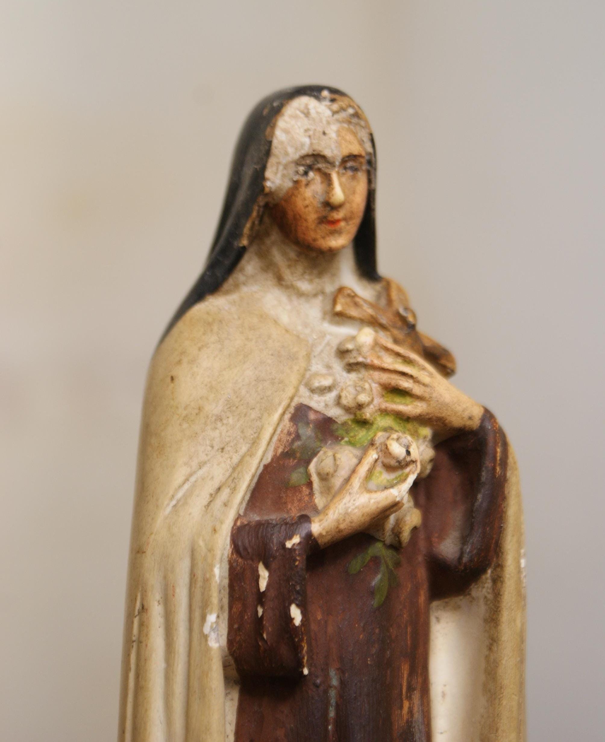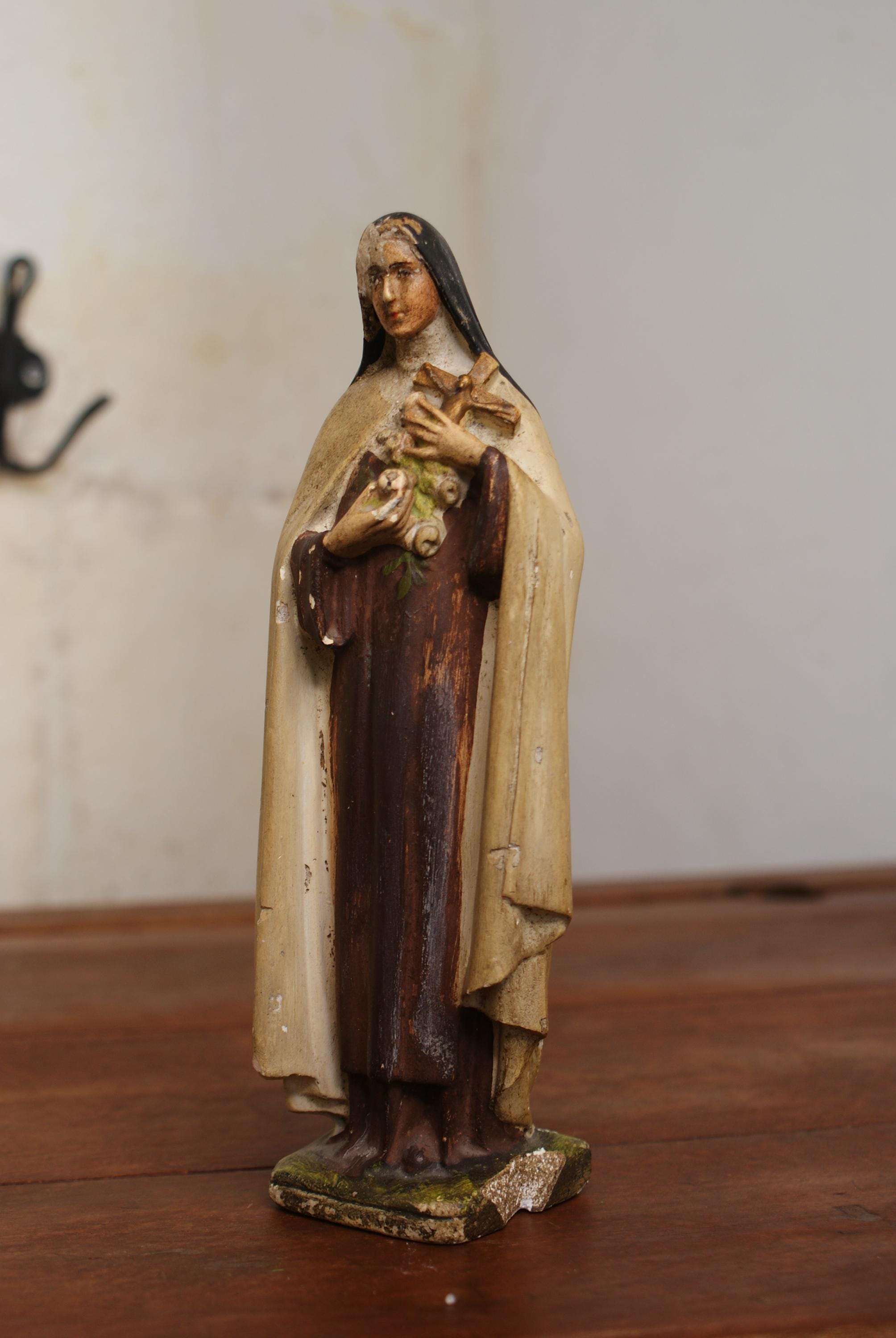 Stunning French plaster statue or Saint Thérèse of Lisieux. Saint Thérèse of Lisieux lived in the late 19th century 2nd January 1873 - 30th September 1897 is the patron saint of aviators, florists and missionaries. She is popularly known in English as the Little Flower of Jesus, or simply the Little Flower, and in French as la petite Thérèse. a lovely looking piece for a curio shelf and although damaged I think this has a unique look. The statue stands around 20cm tall.