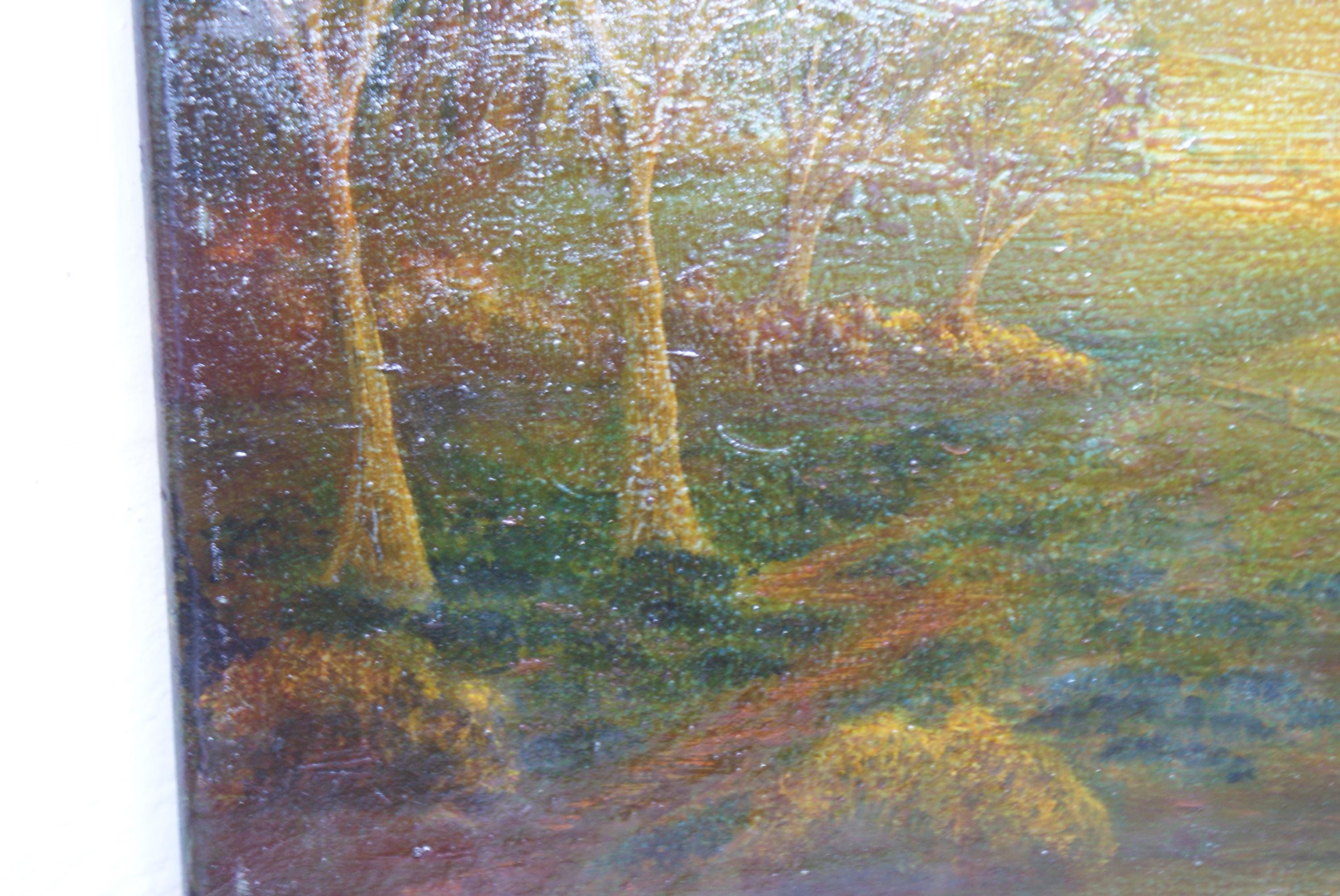 Stunning Scenic painting with fantastic colours and a moody feel, the artist has used a varnish that gives this piece a really unique look znd has created a fantastic effect. Quite naïve in style but a lovely piece of art. At the time of listing (5/4/2025) I have seven paintings by this particular artist. some slight paint loss but still a lovely piece.