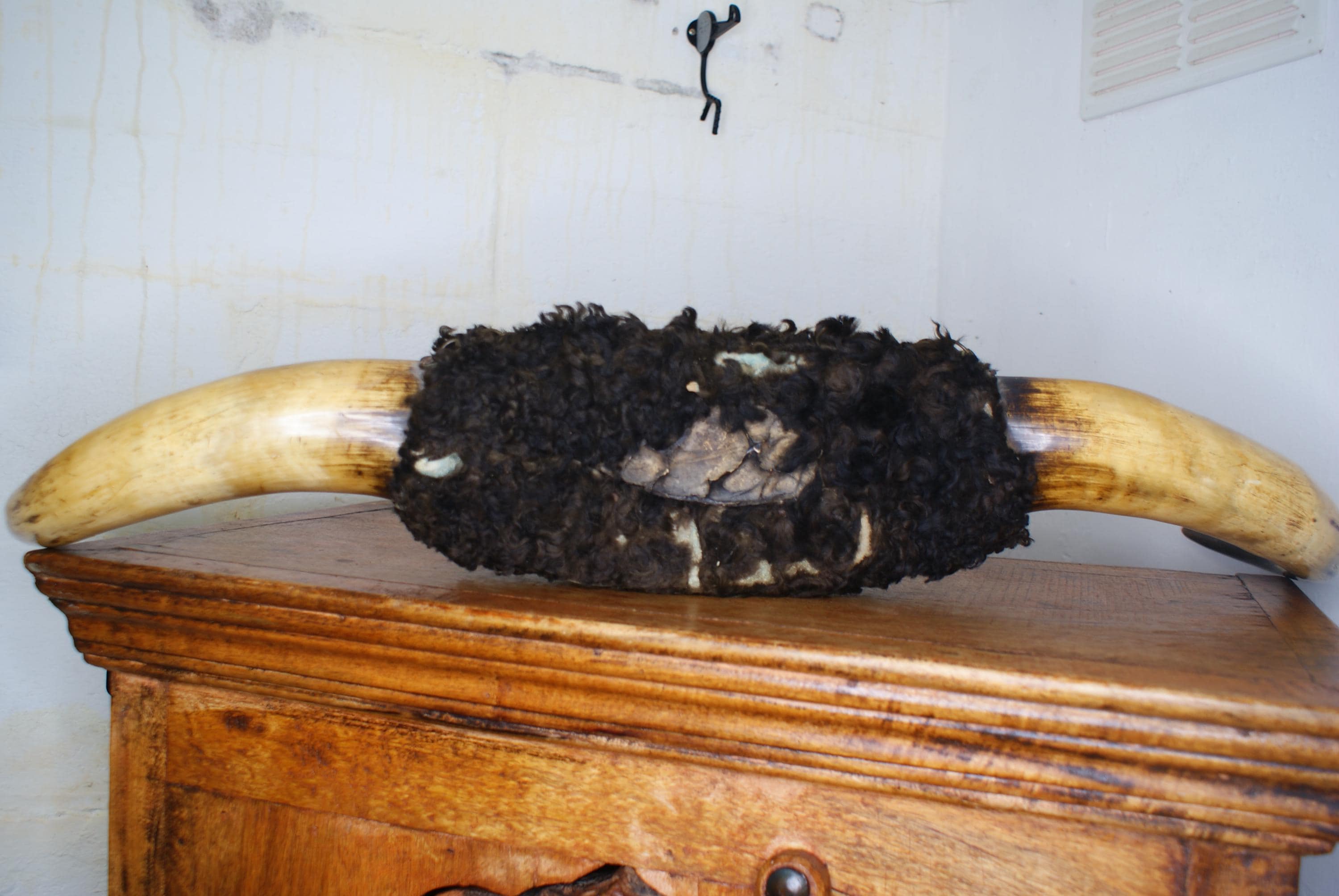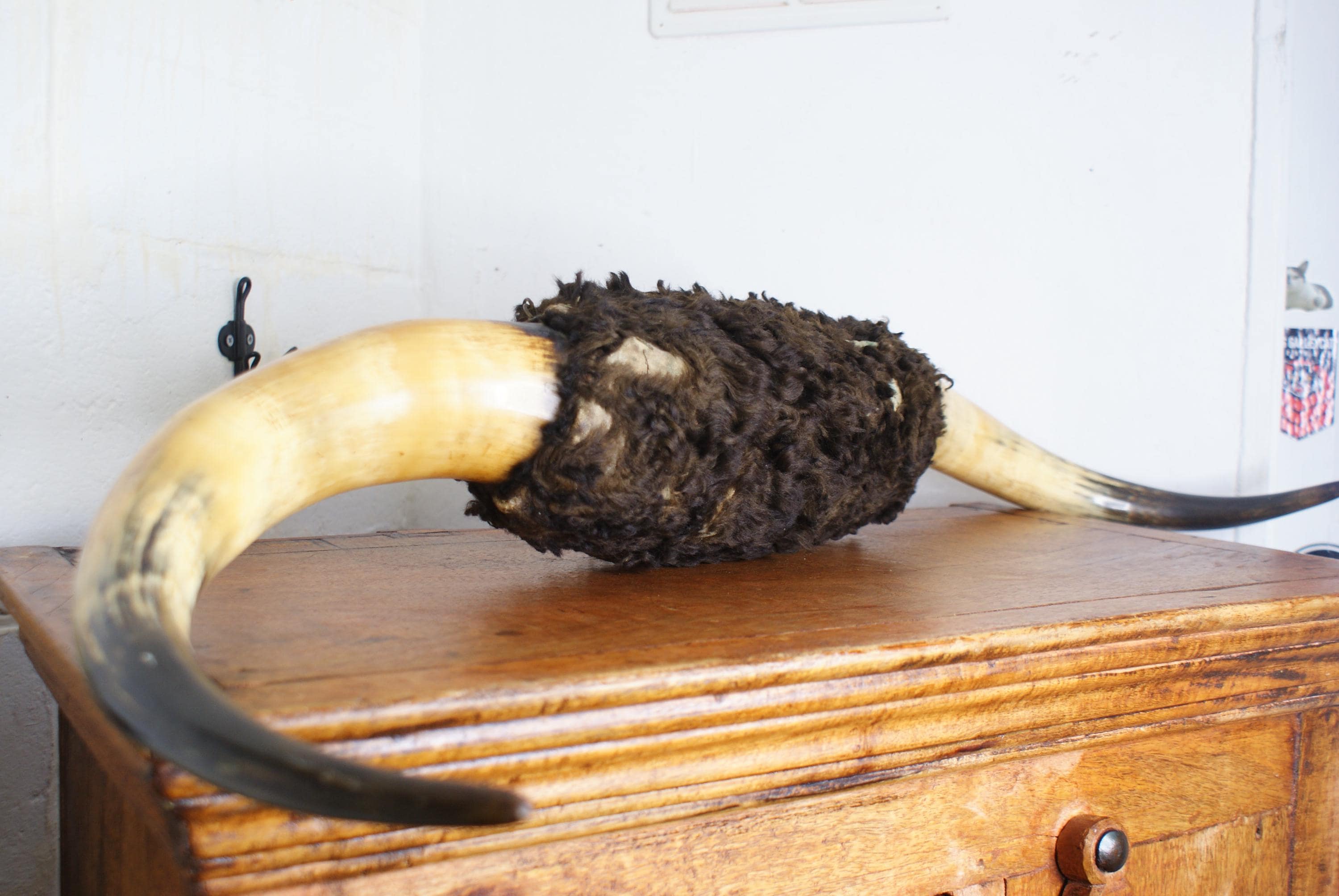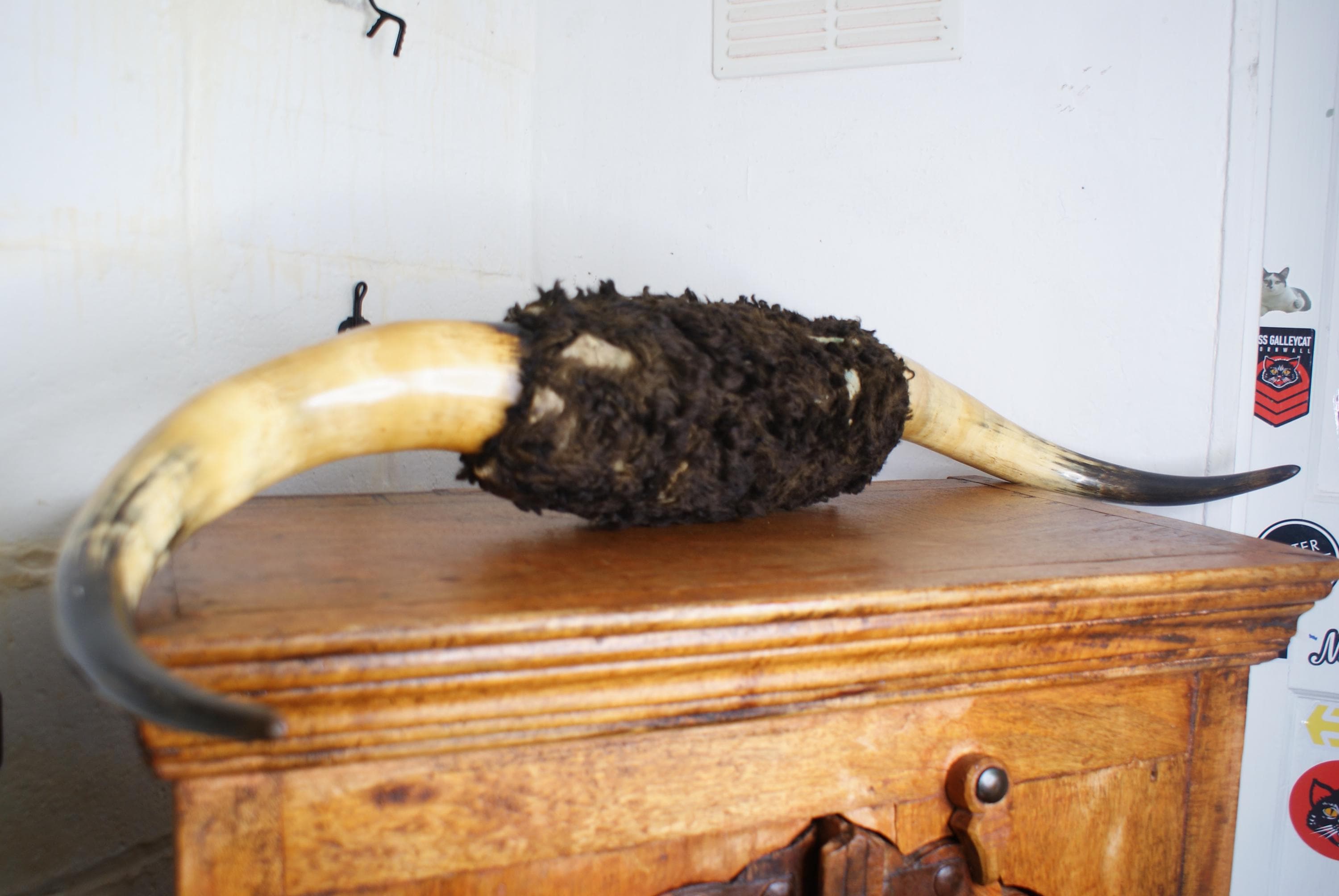 Fantastic set of highland cow horns, early 20th century in age. These are an impressive set of horns and a striking statement piece and a conversation starter. There is some fur loss but overall a good condition for the age. A chain is already attached so can be hung straight away.