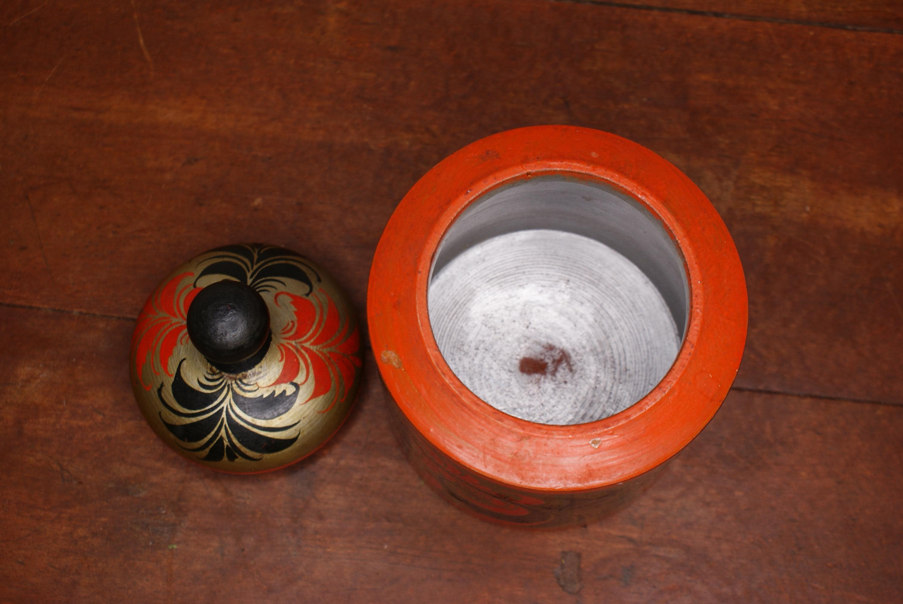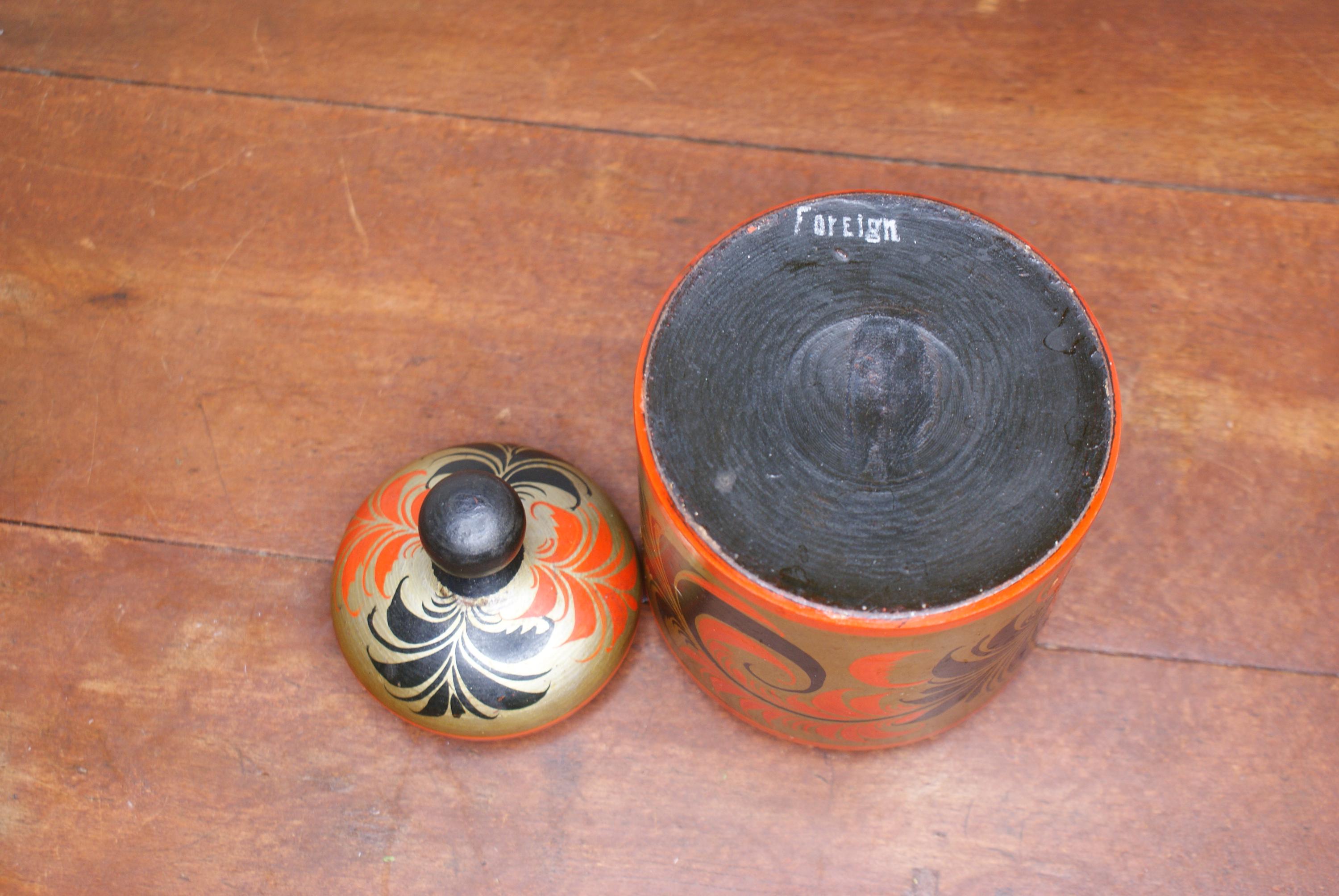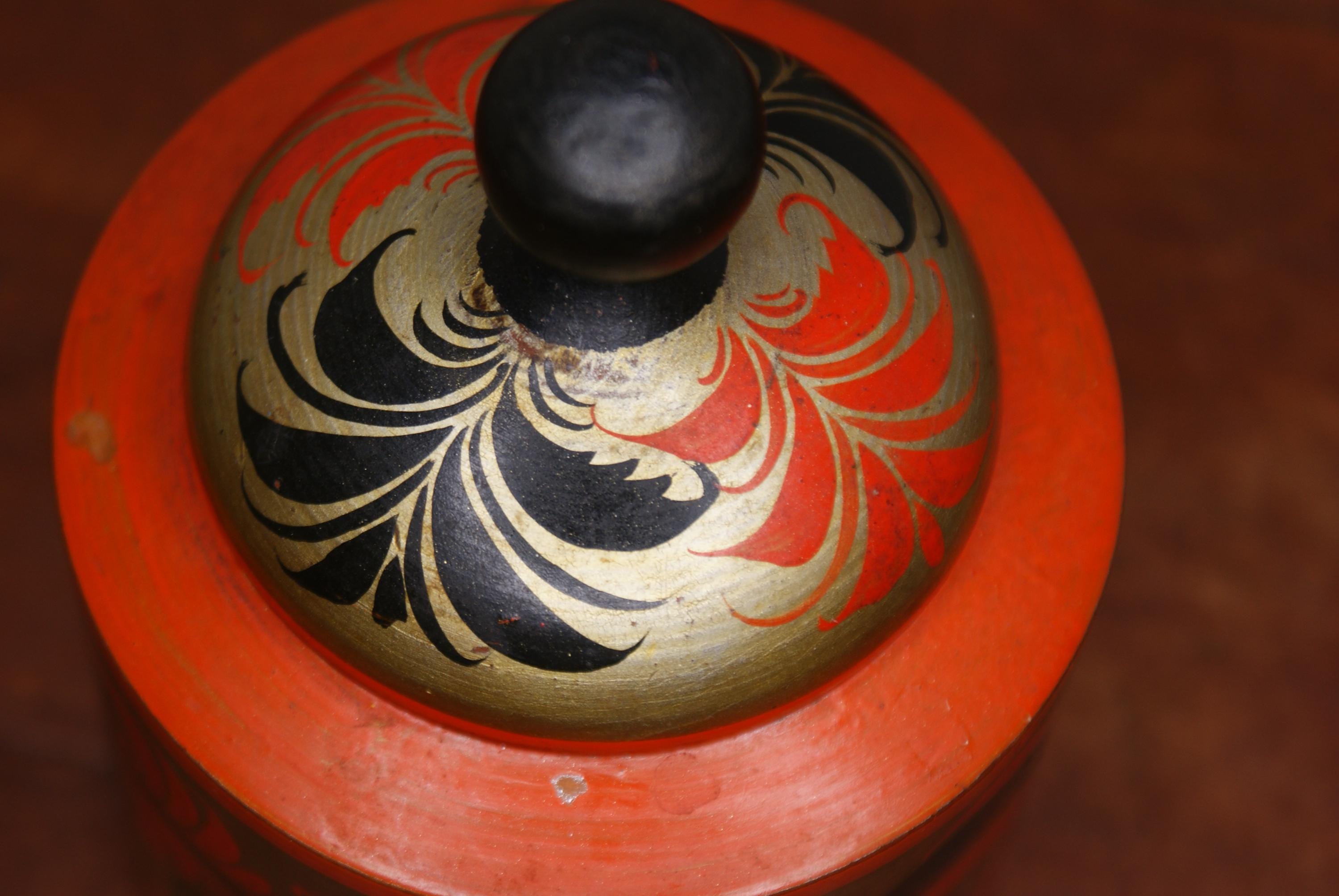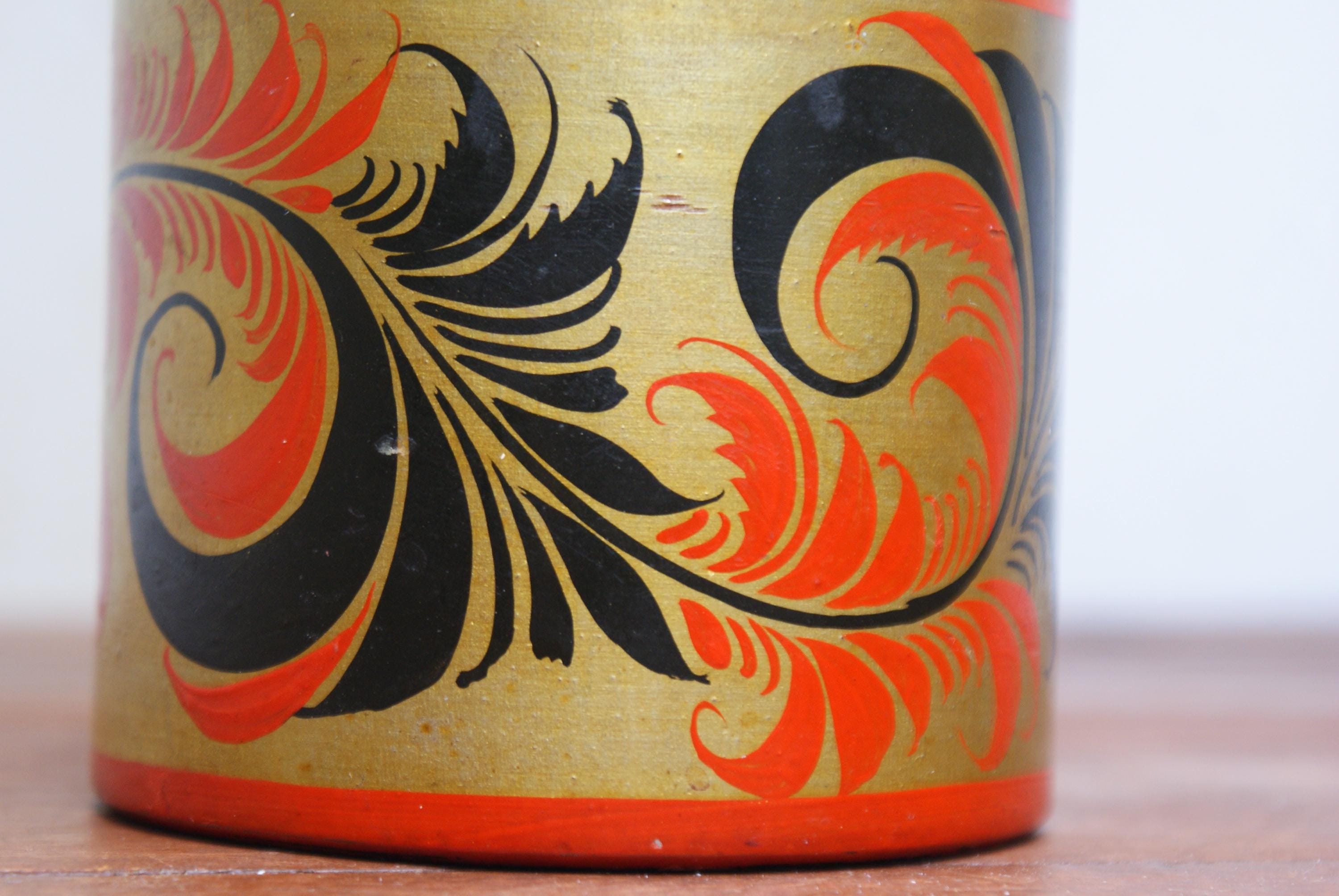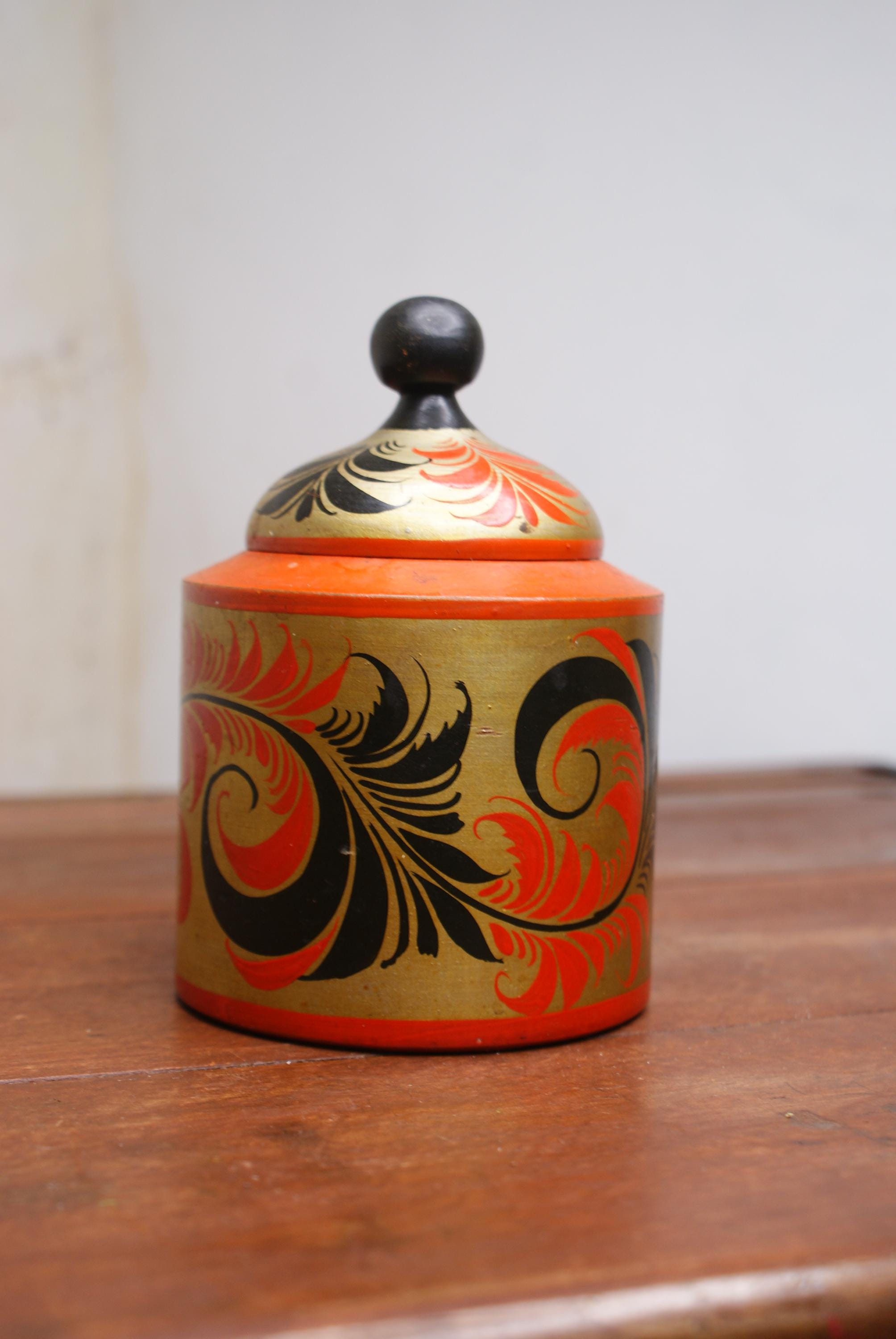 A lovely small Russian folk art canister. This style of folk art dates back to the 17th century with the colours having symbolic meanings, red for beauty, black for the earth and gold to represent wealth. This is mid 20th century piece likely used to store tea, tabaco or herbs.