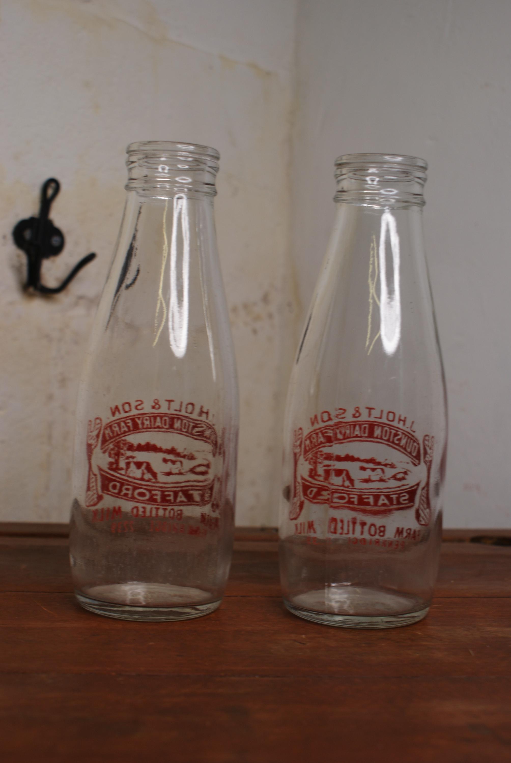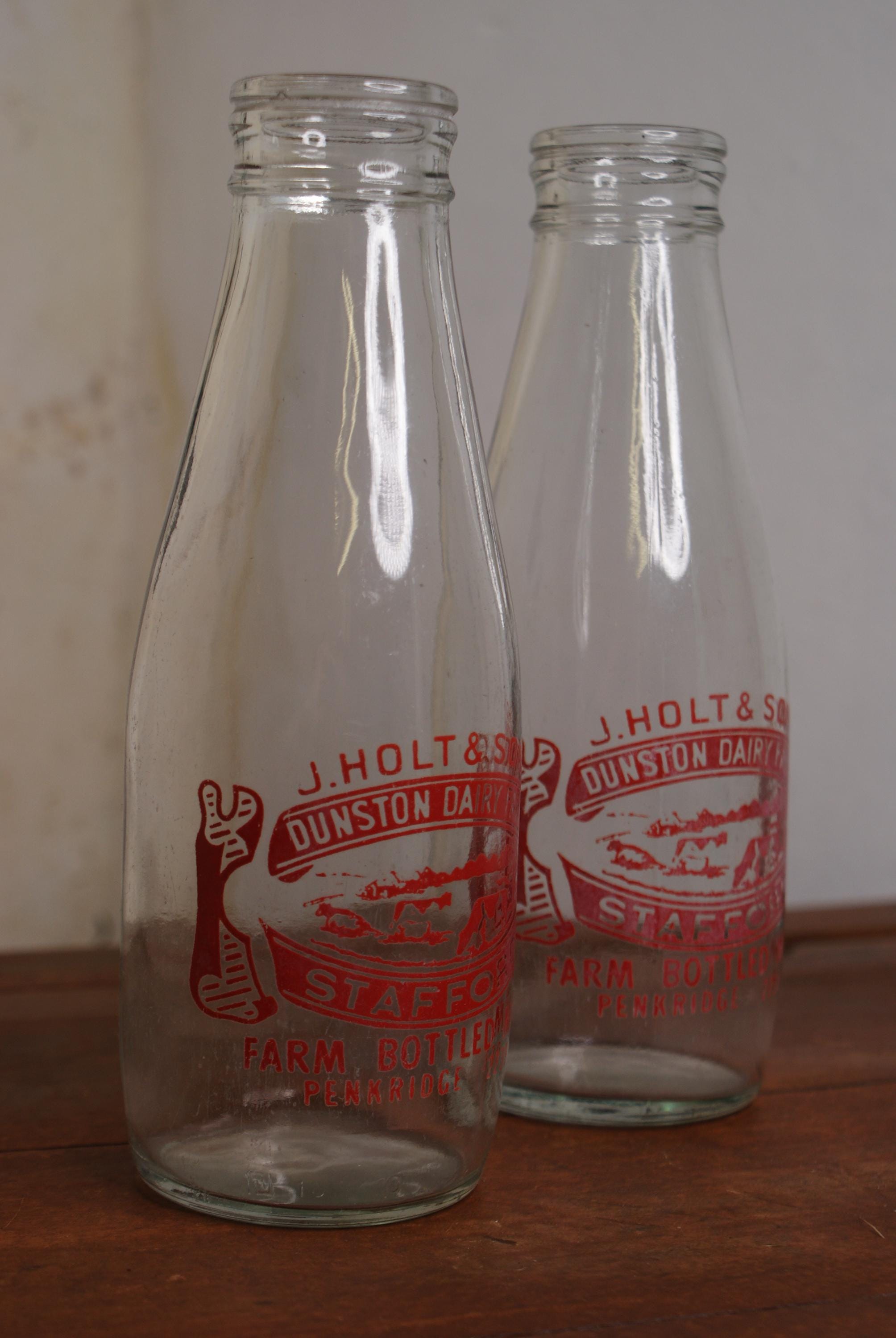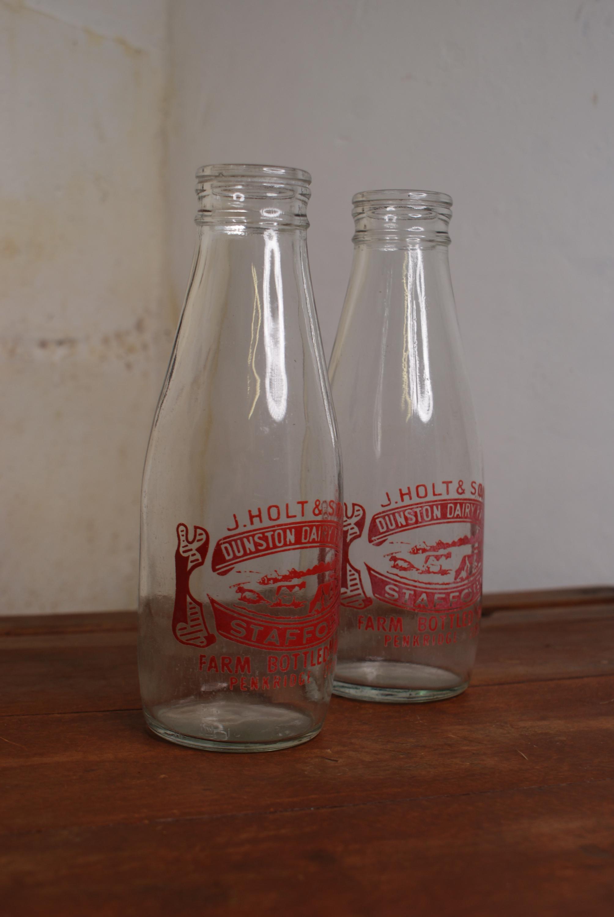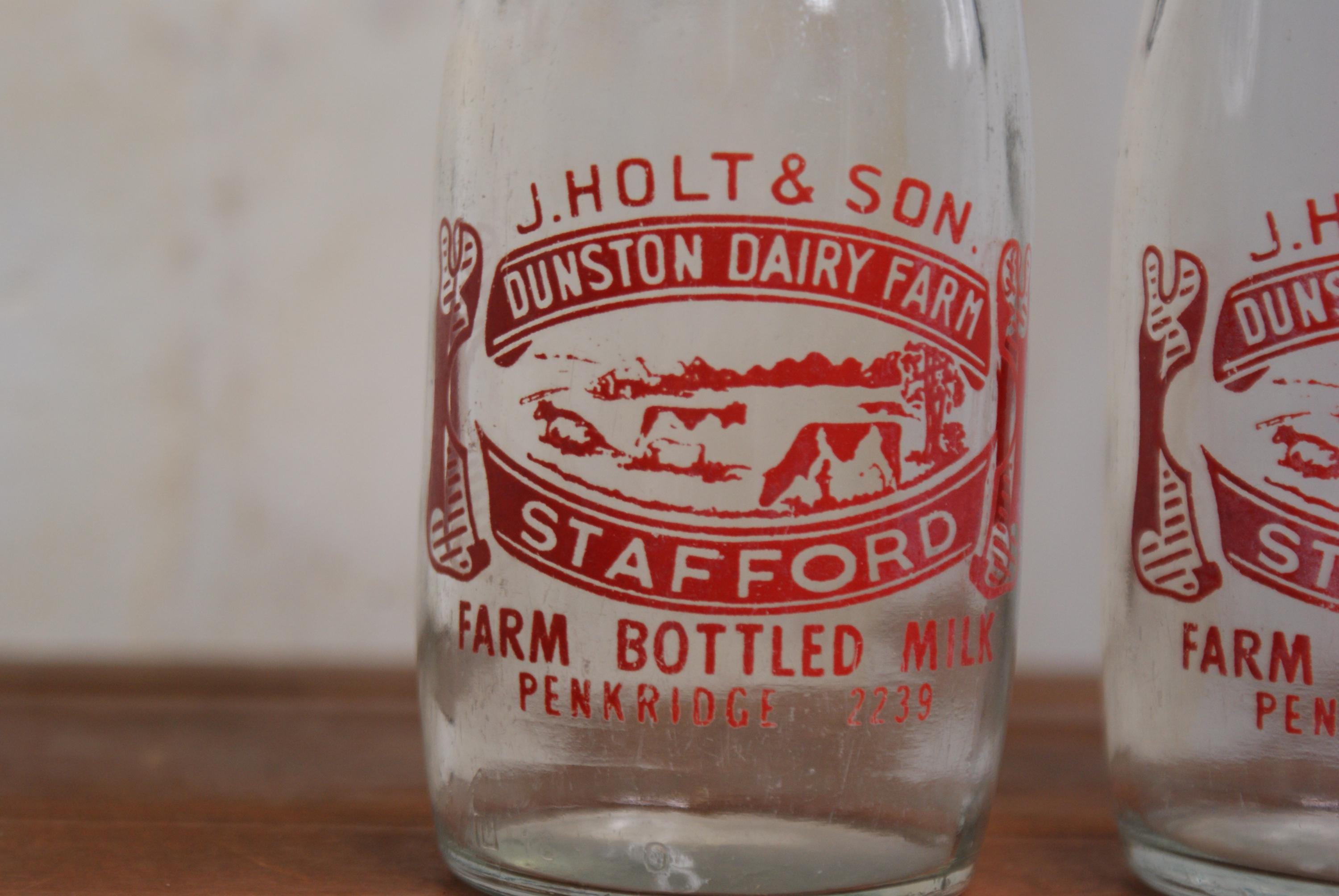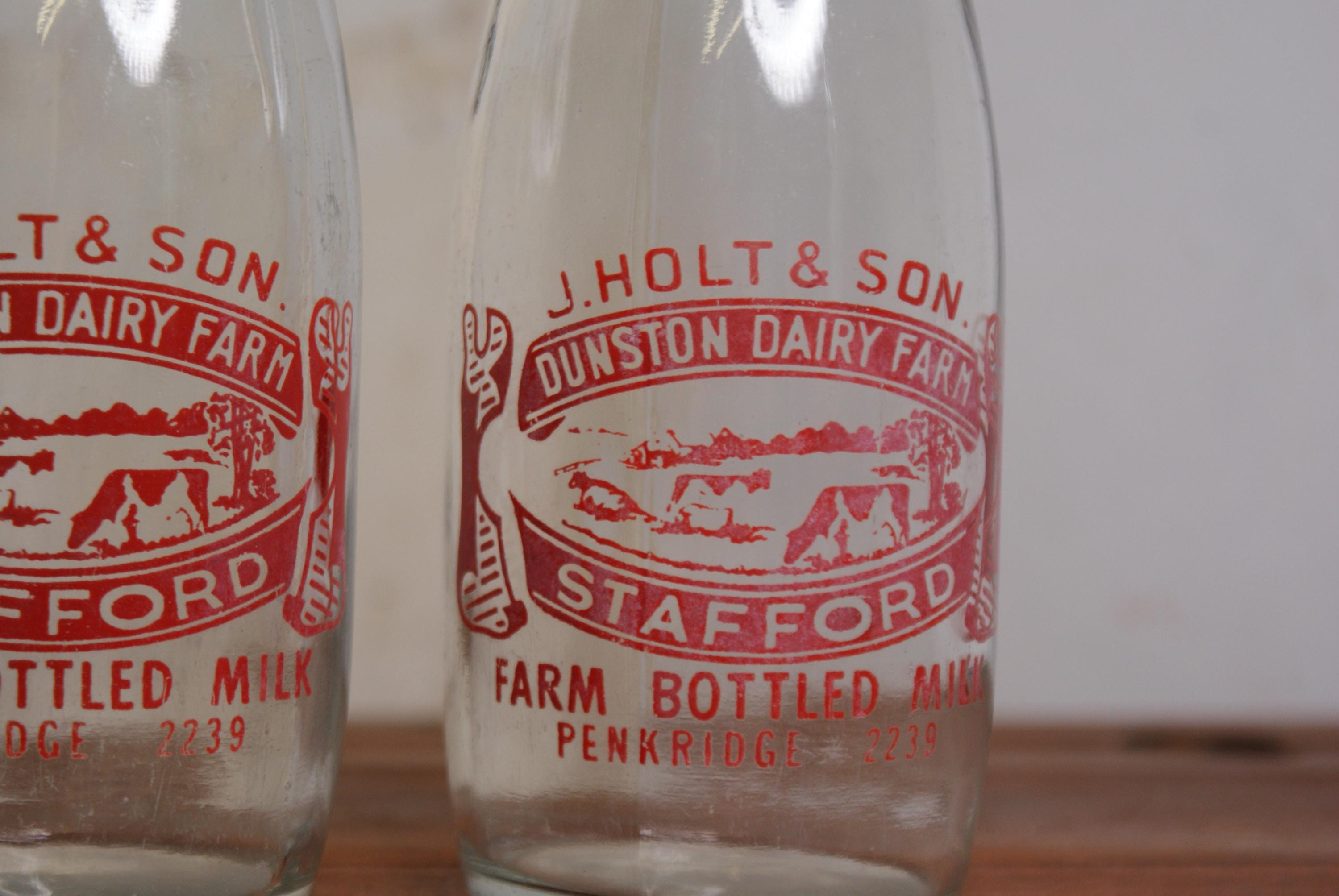 Lovely set of matching vintage milk bottles from Dunston dairy farm in Penkridge, Staffordshire. in excellent condition, slight fading on one but no chips or cracks. price is for both bottles.
