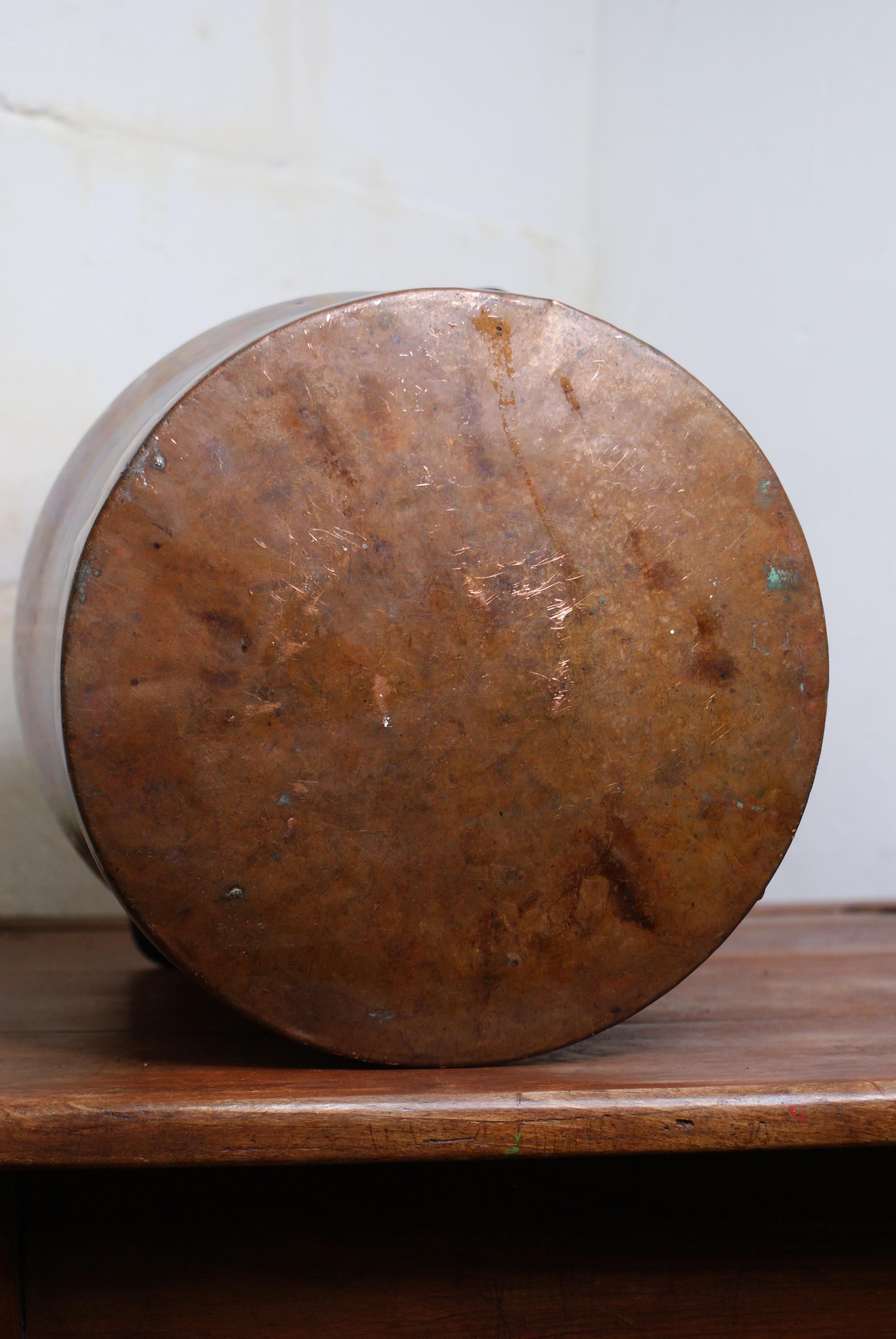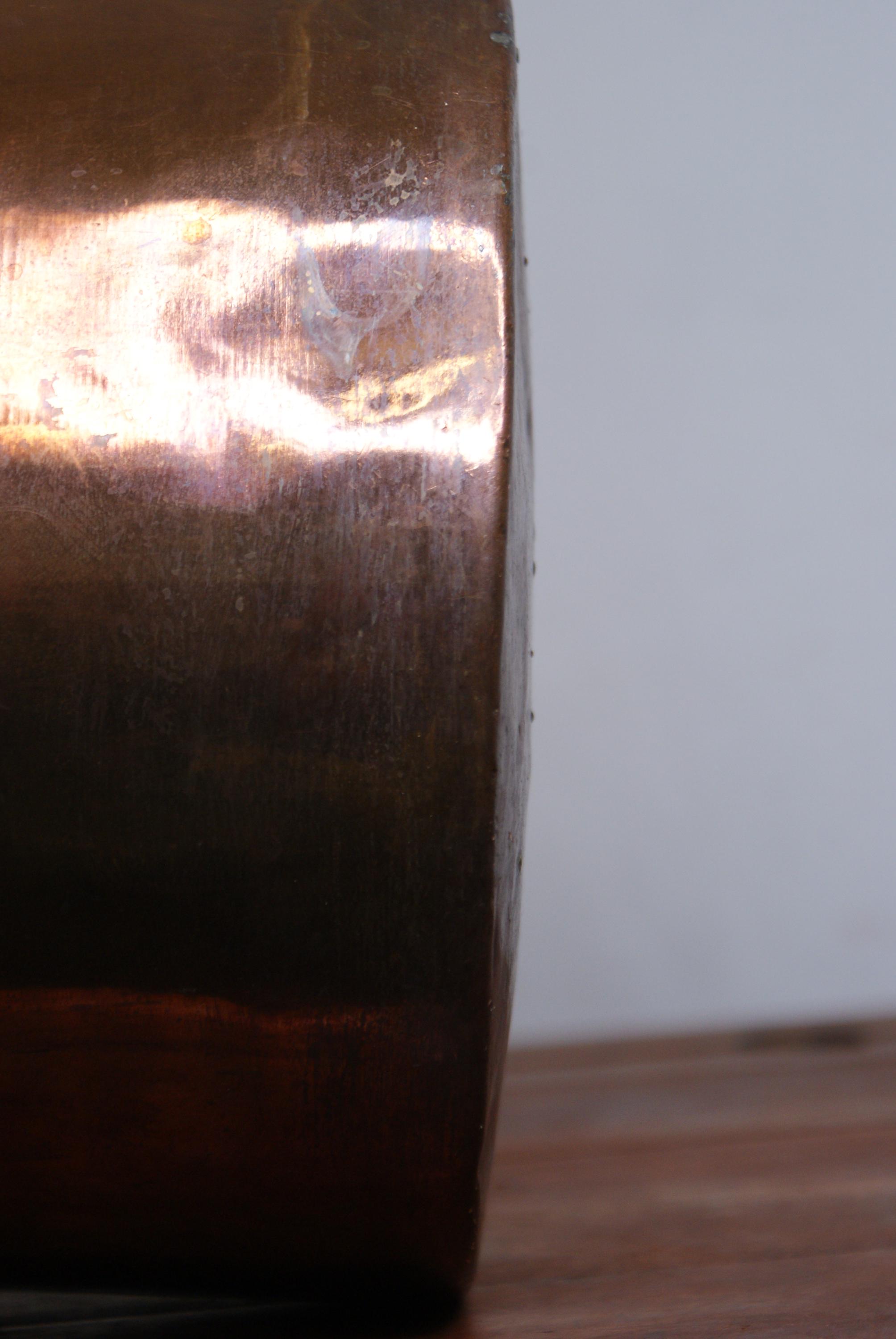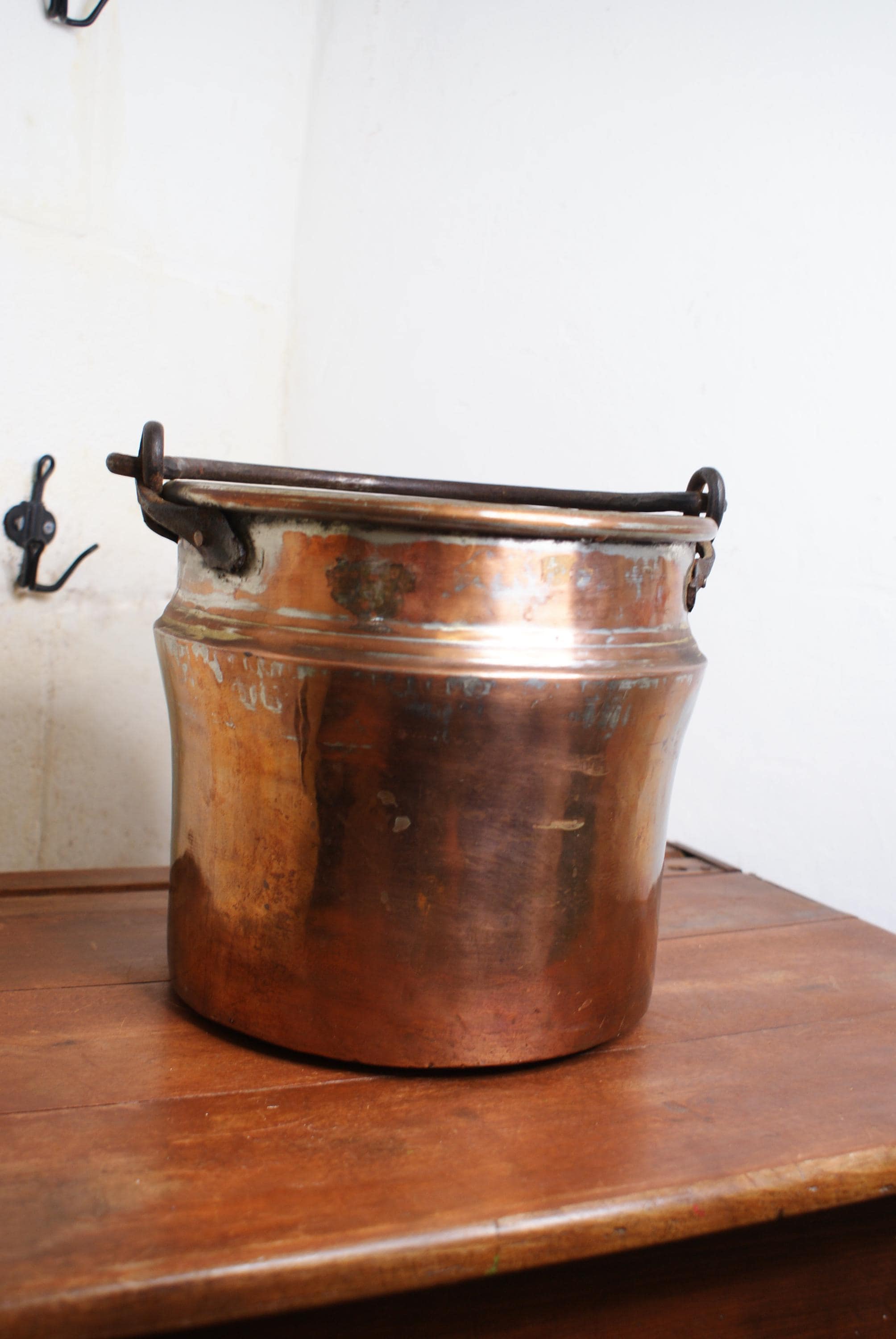 Fantastic Turkish copper cooking pot, this pot oozes character and has developed a fantastic patina from decades of use. The wrought iron handle is a lovely addition and this would make a great piece of stand alone décor or a small kindling or log basket. The base is round slightly but it does sit upright, but bobs around slightly on a hard surface.