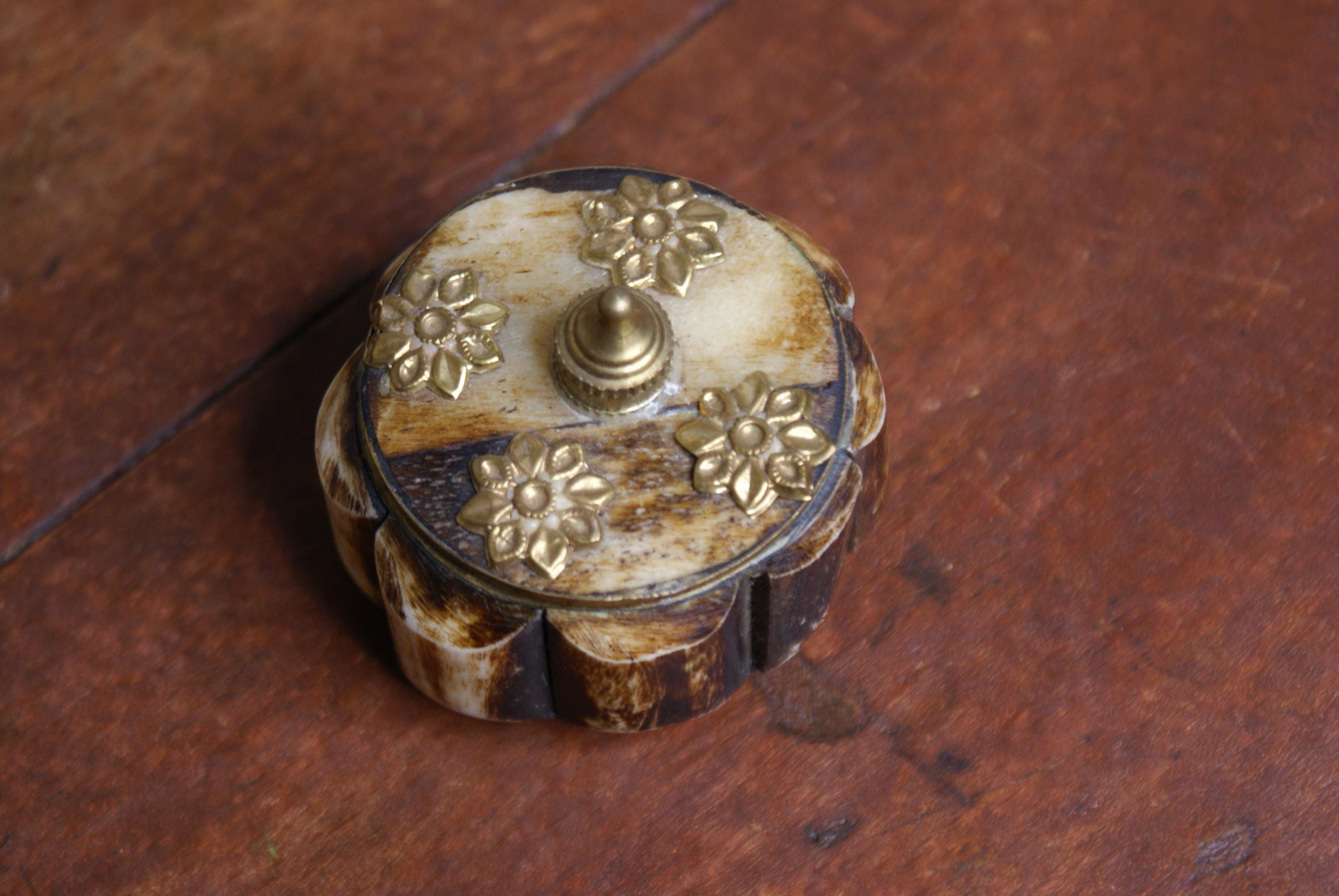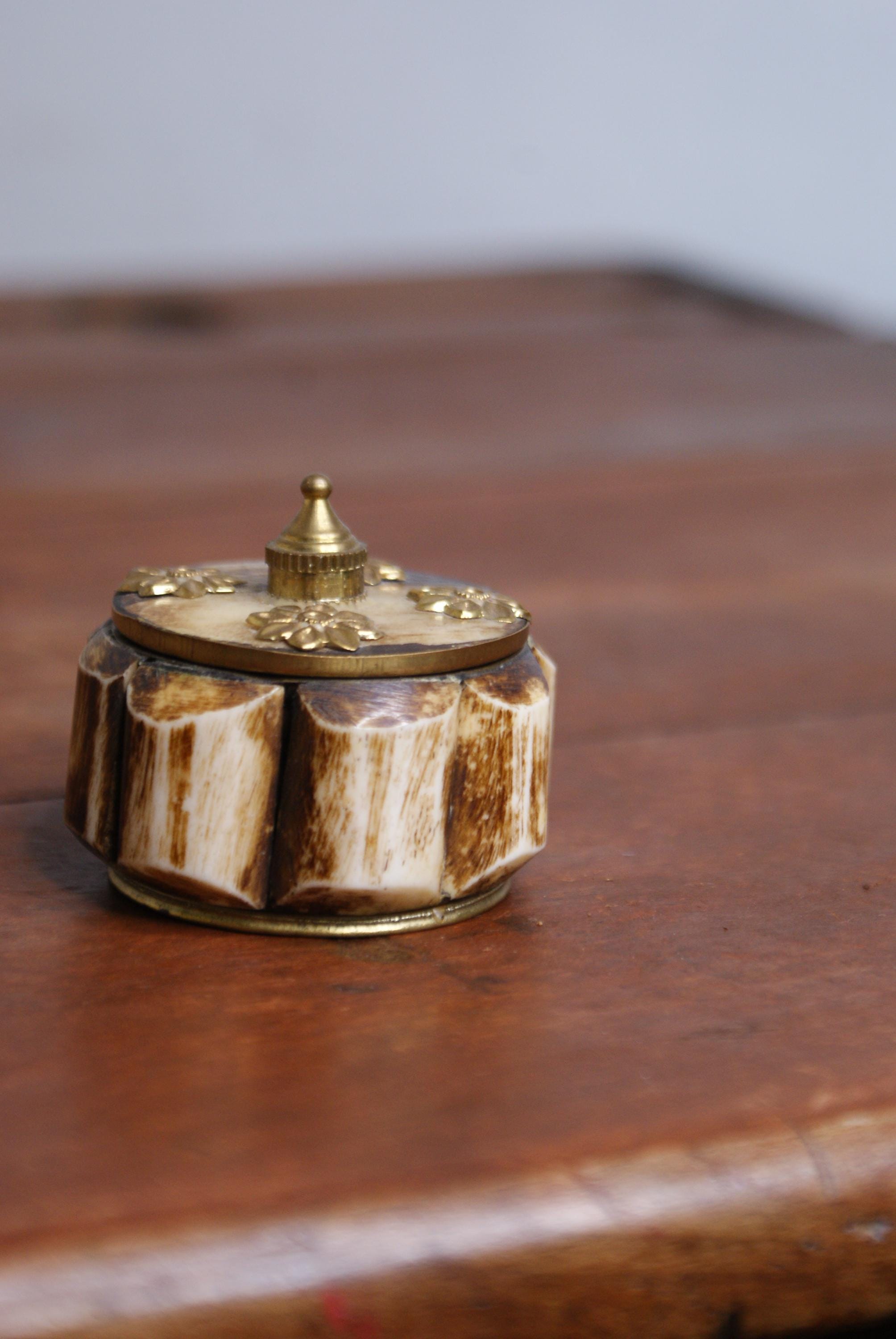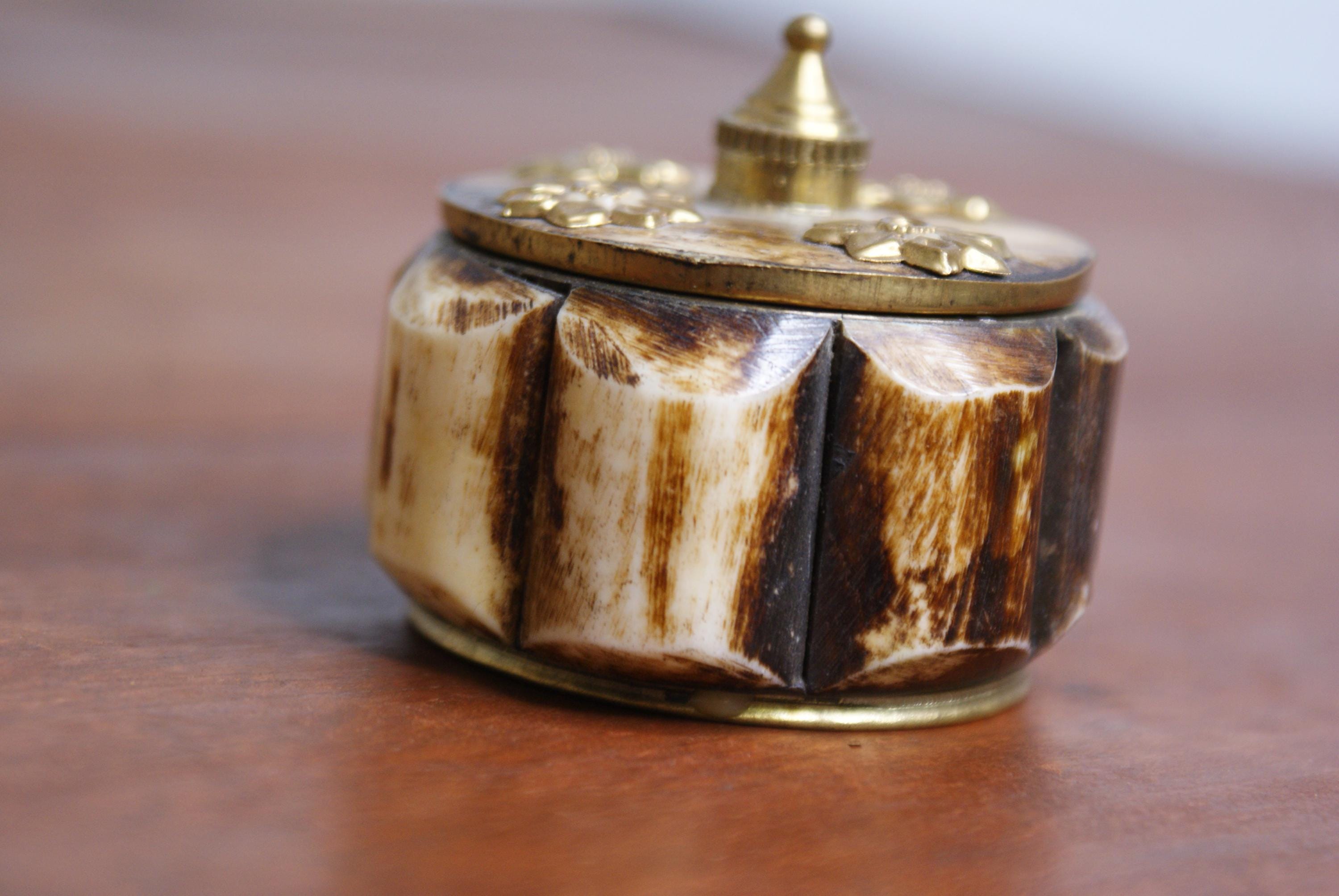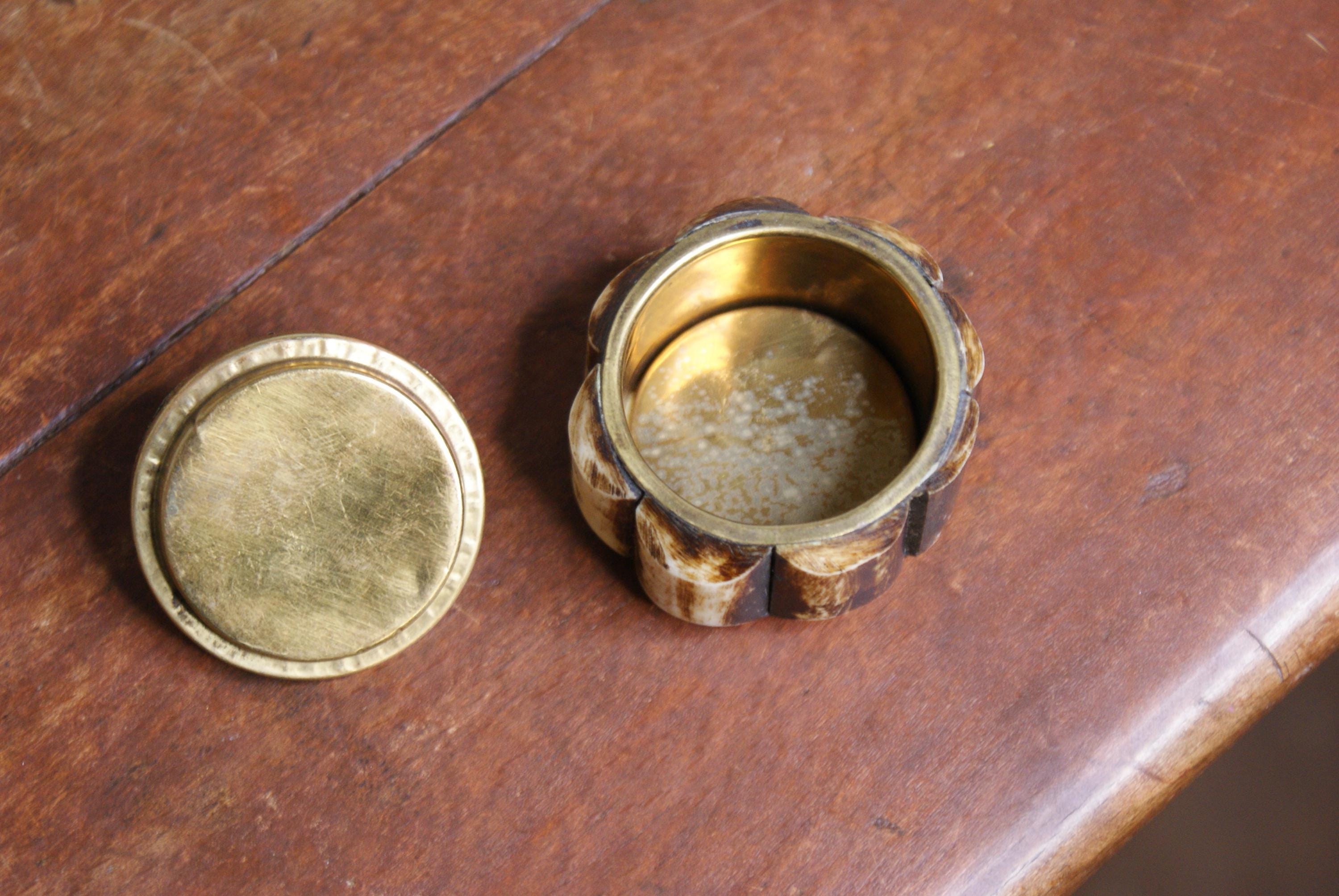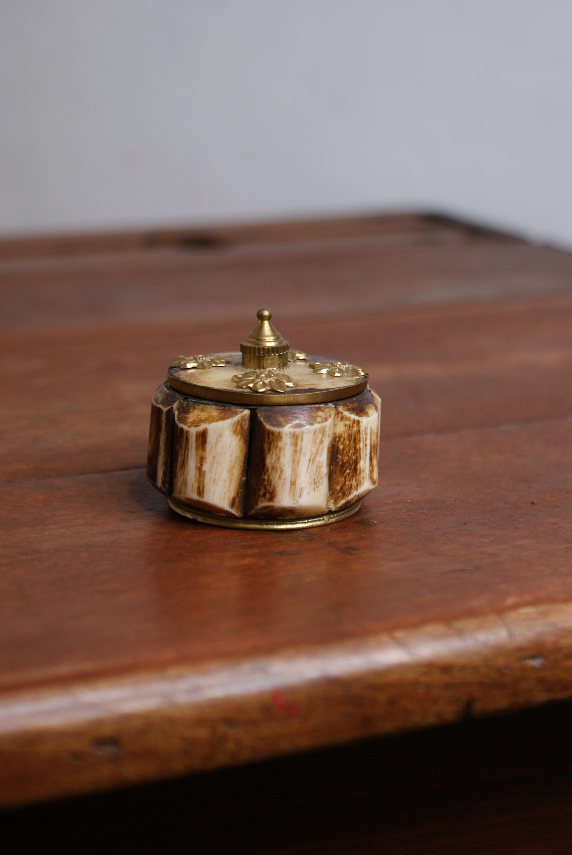 Lovely small camel bone and brass trinket or pill box. This is a lovely looking piece and an ideal size for rings, earrings or small items of jewellery.