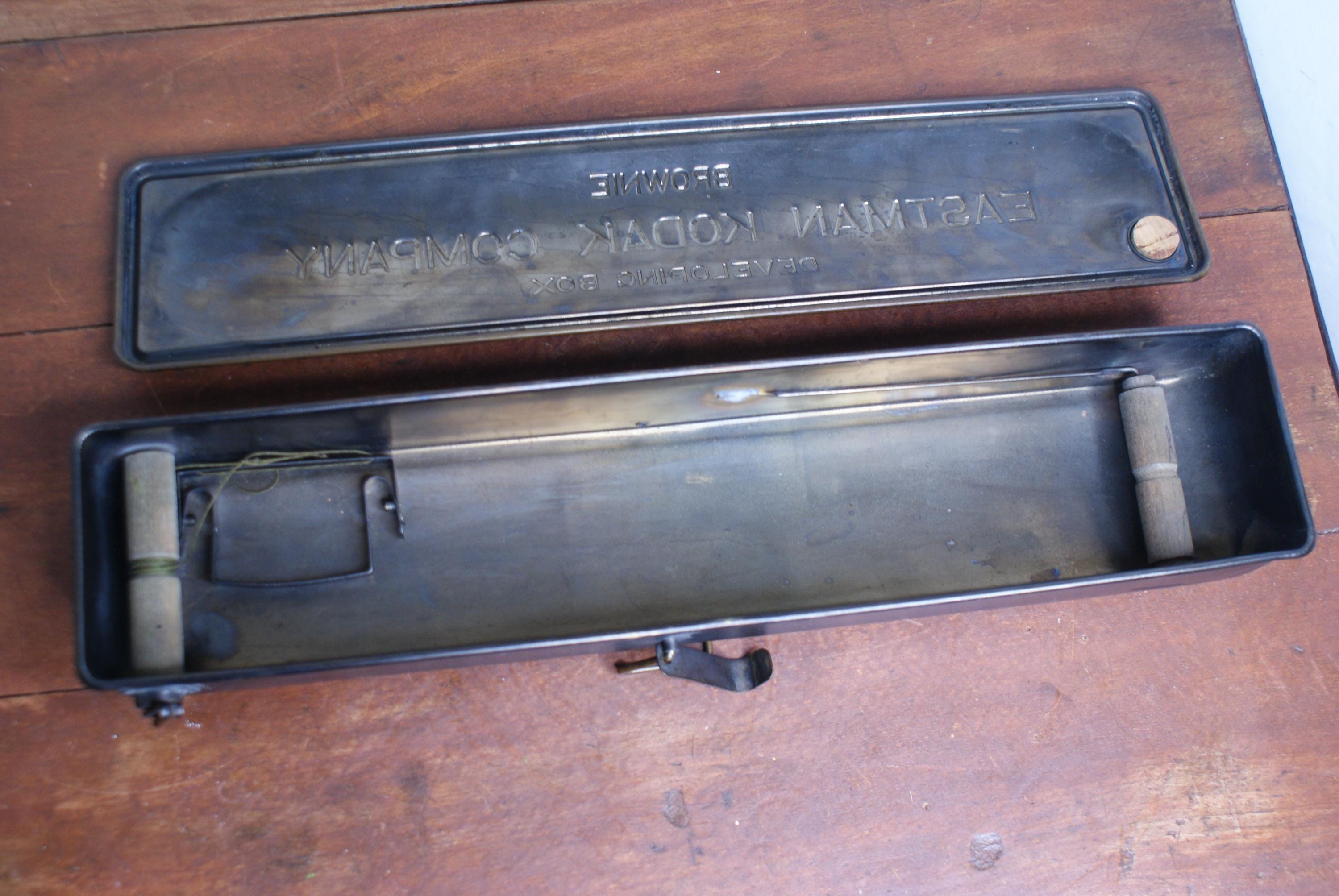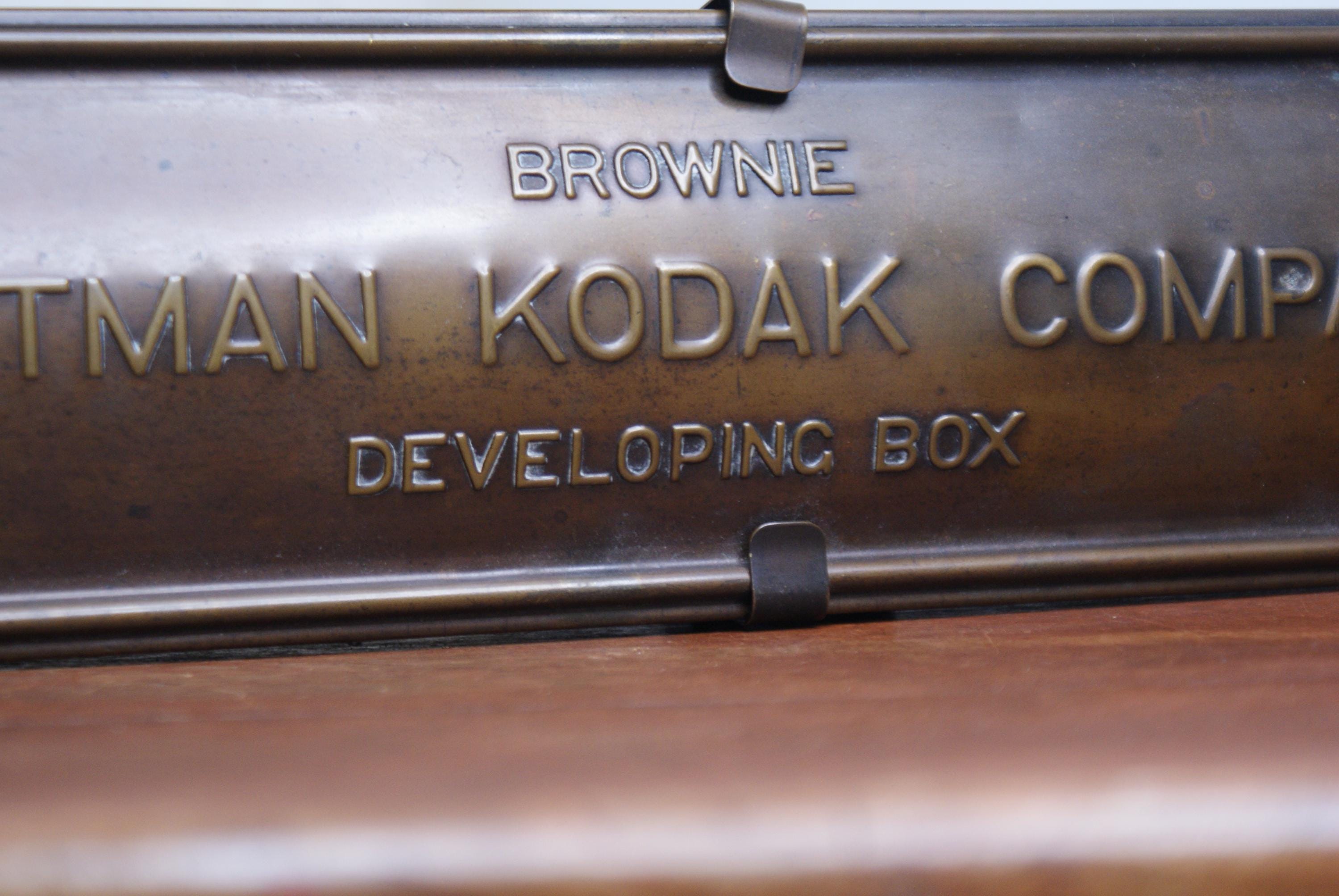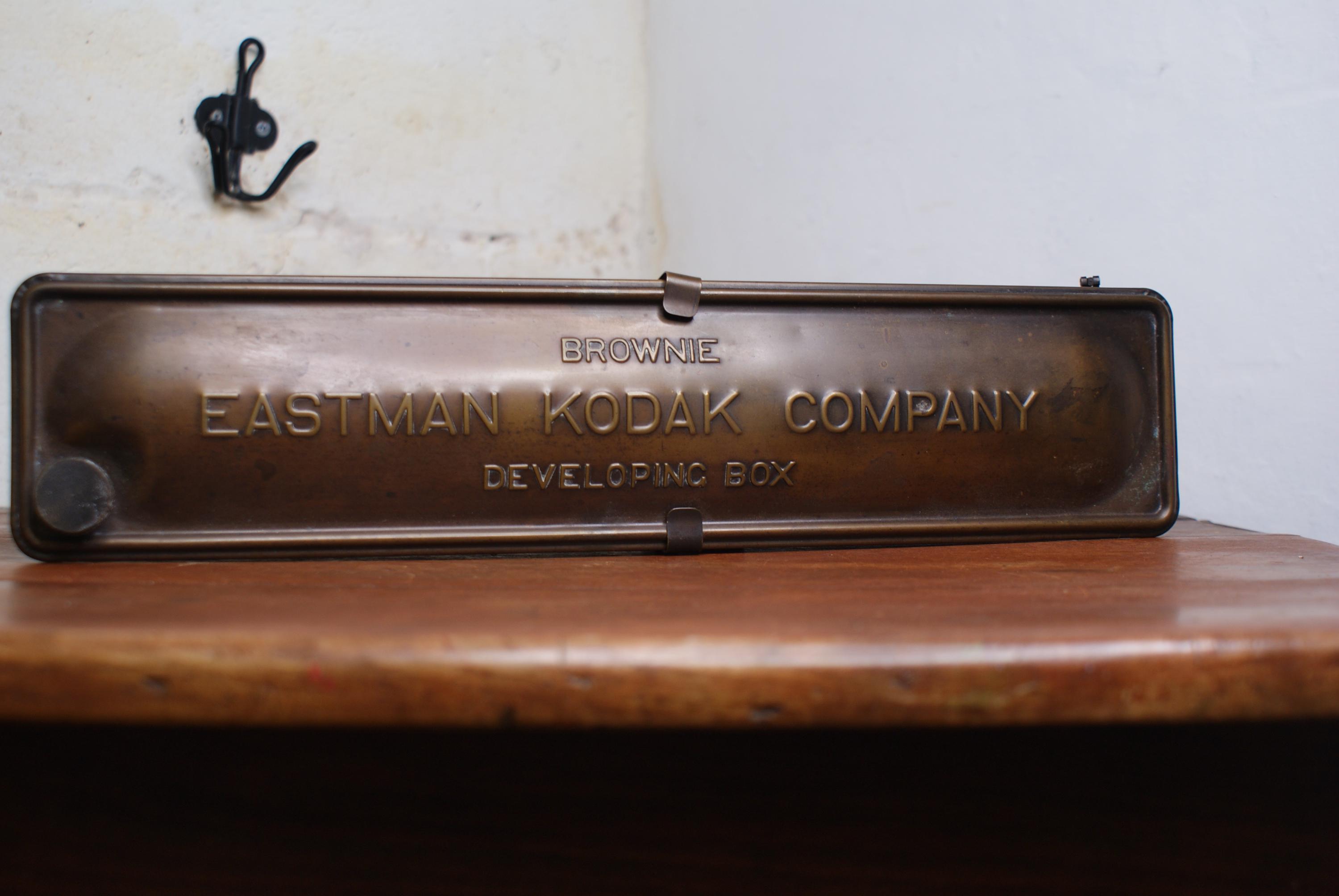 A Brownie Eastman Kodak Developing Box In Superb condition. This is a fantastic piece of photography history and a real collectors piece and has a fantastic decorative quality on its own. The Brownie camera was introduced in the 1900's as an affordable way to introduce photography to the masses and Eastman Kodak Developing Box was designed so users could develop there own films. The box is designed for use 117 roll film. The box as said above is in excellent condition I don't think its ever been used one small scuff as pictured, the previous owner has also left instructions on its use which are inside the box but not original. The developing box is USA made.
