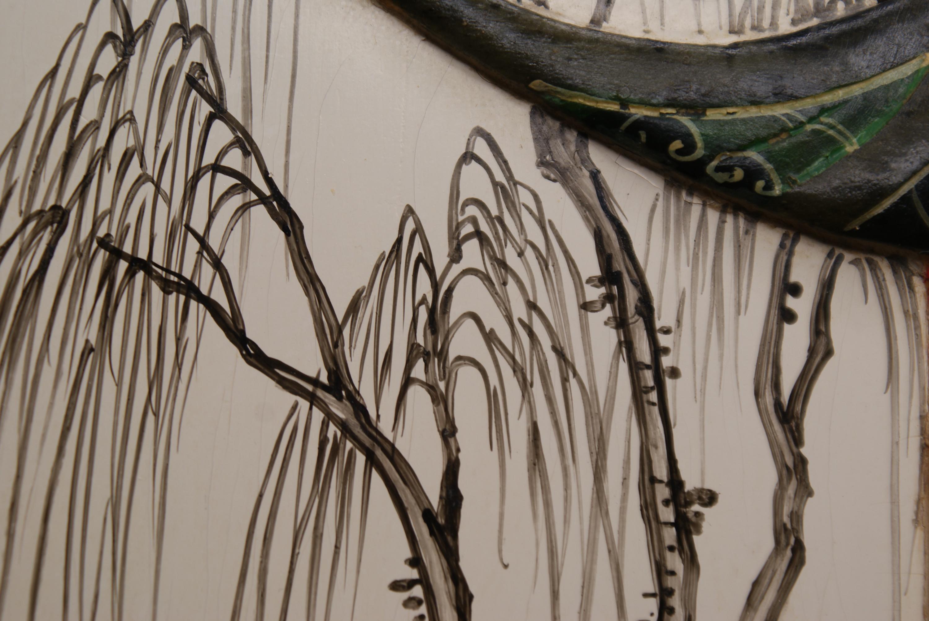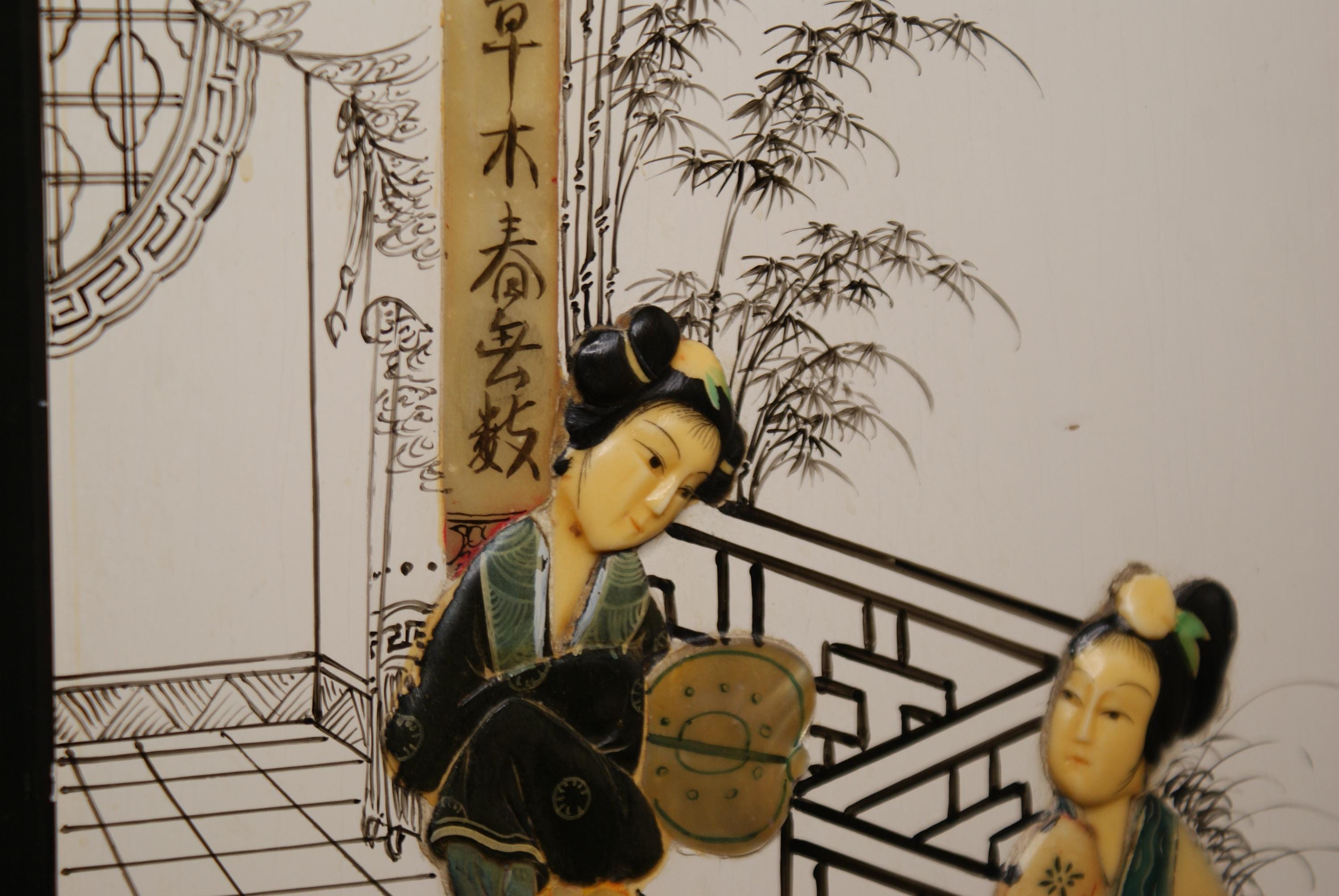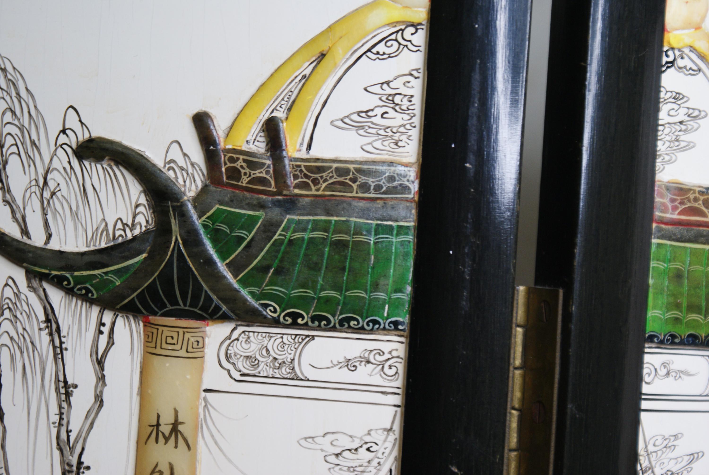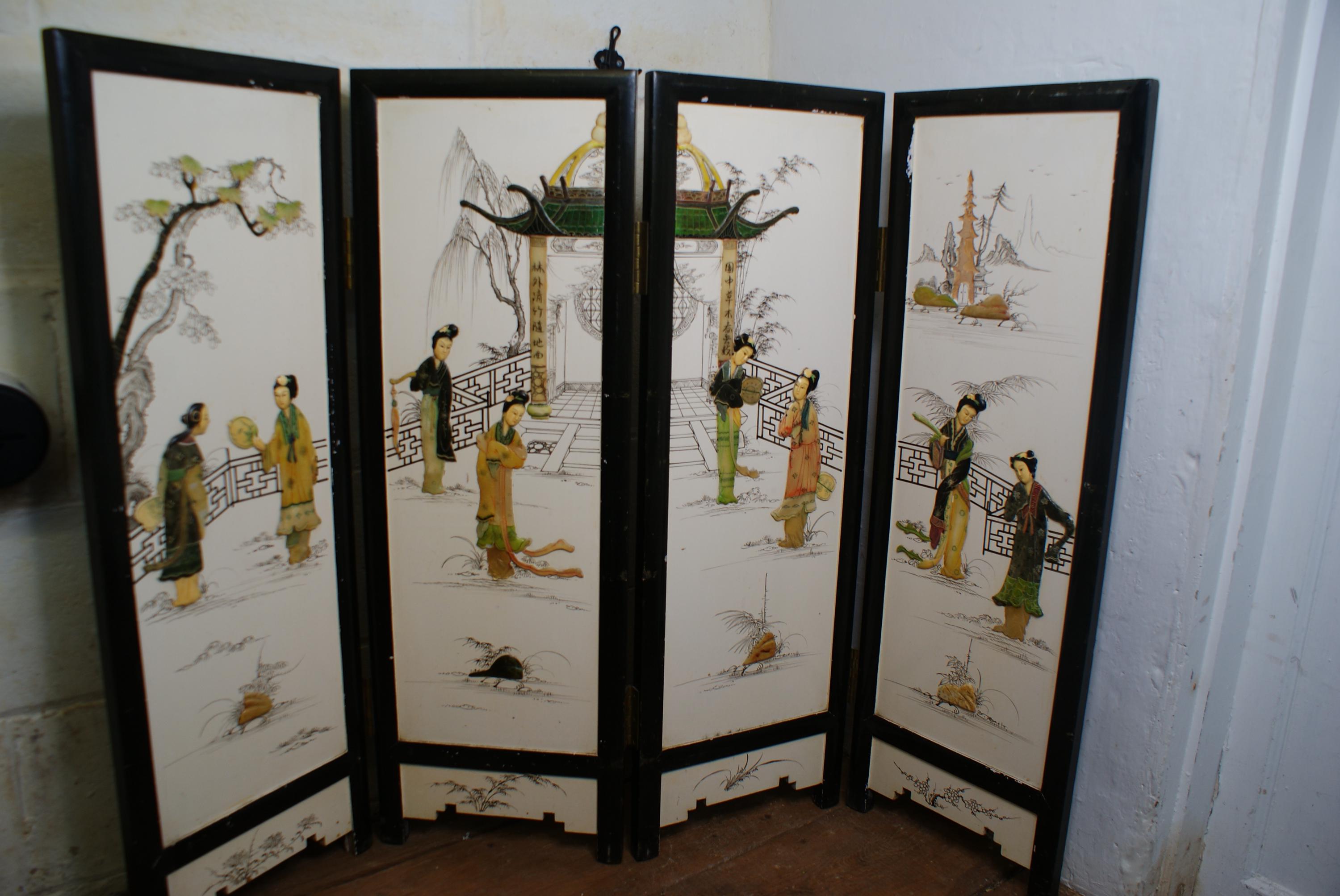 Lovely Chinese 4 panel privacy screen, this has a fantastic look and the figures on each screen are raised with the back ground being hand painted. in good condition at the front with visible signs of wear and chips/scratched to the black lacquer, there is one decorative element missing on the left hand panel as pictured. At the time of listing I have two others of these available in smaller table top sizes.