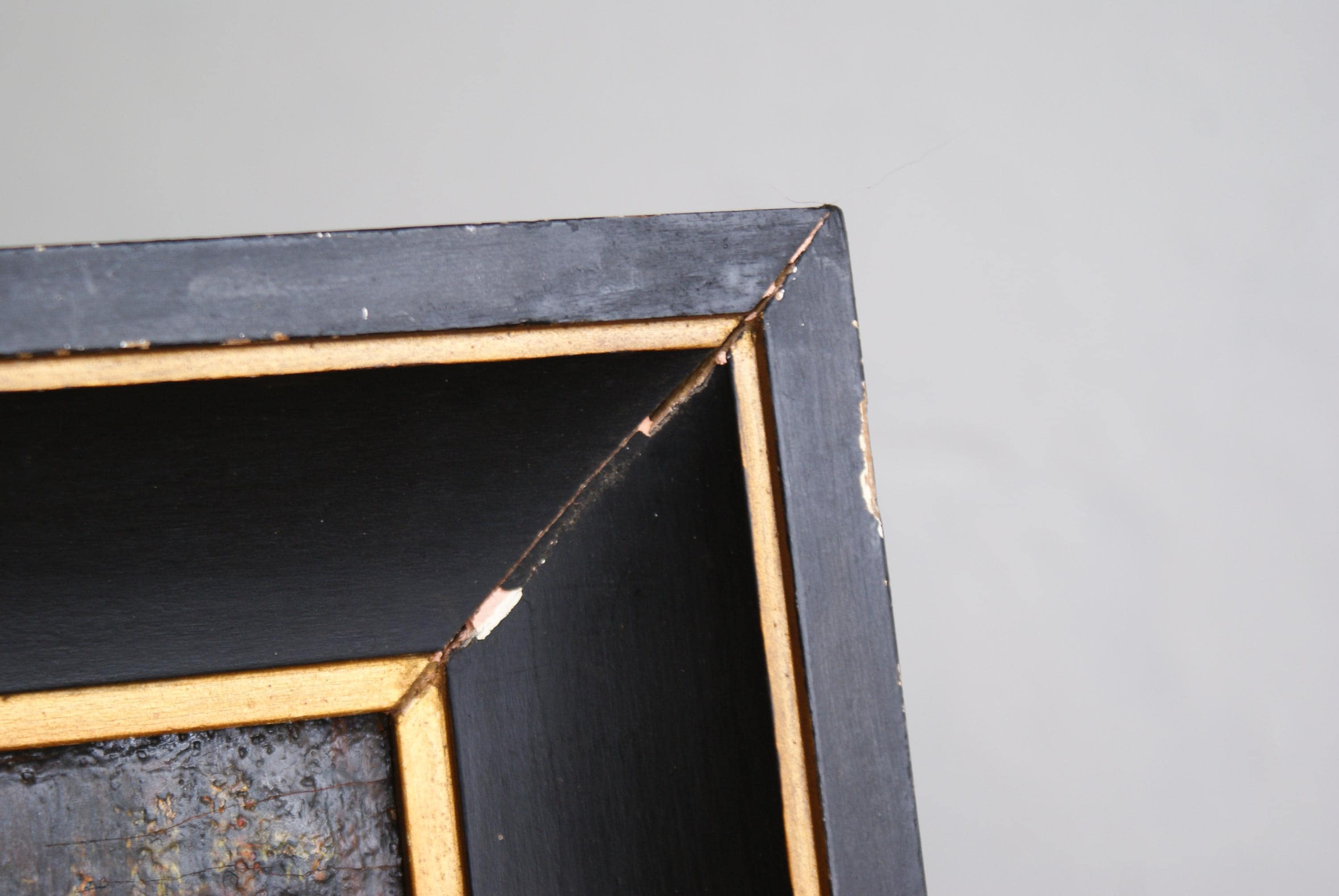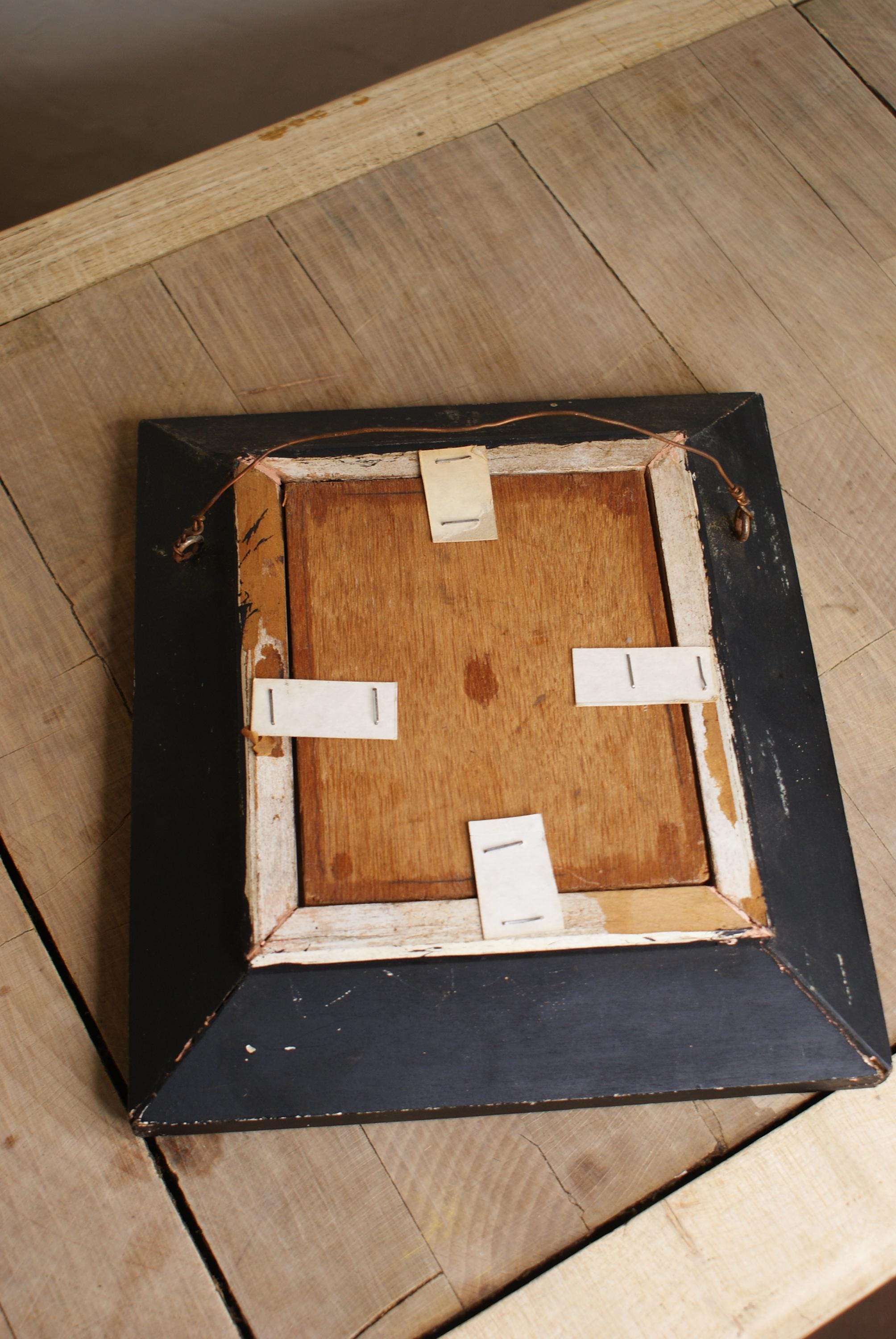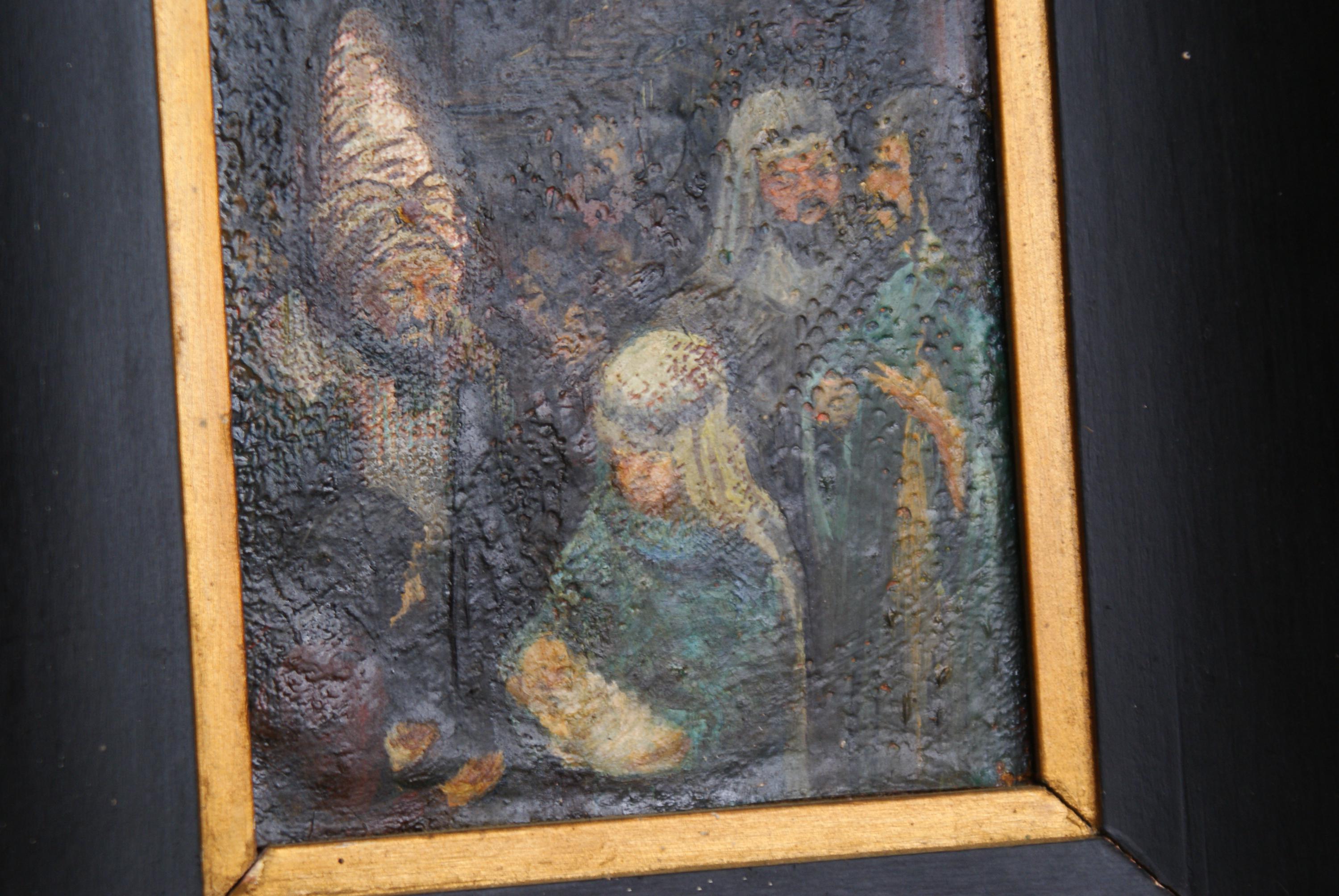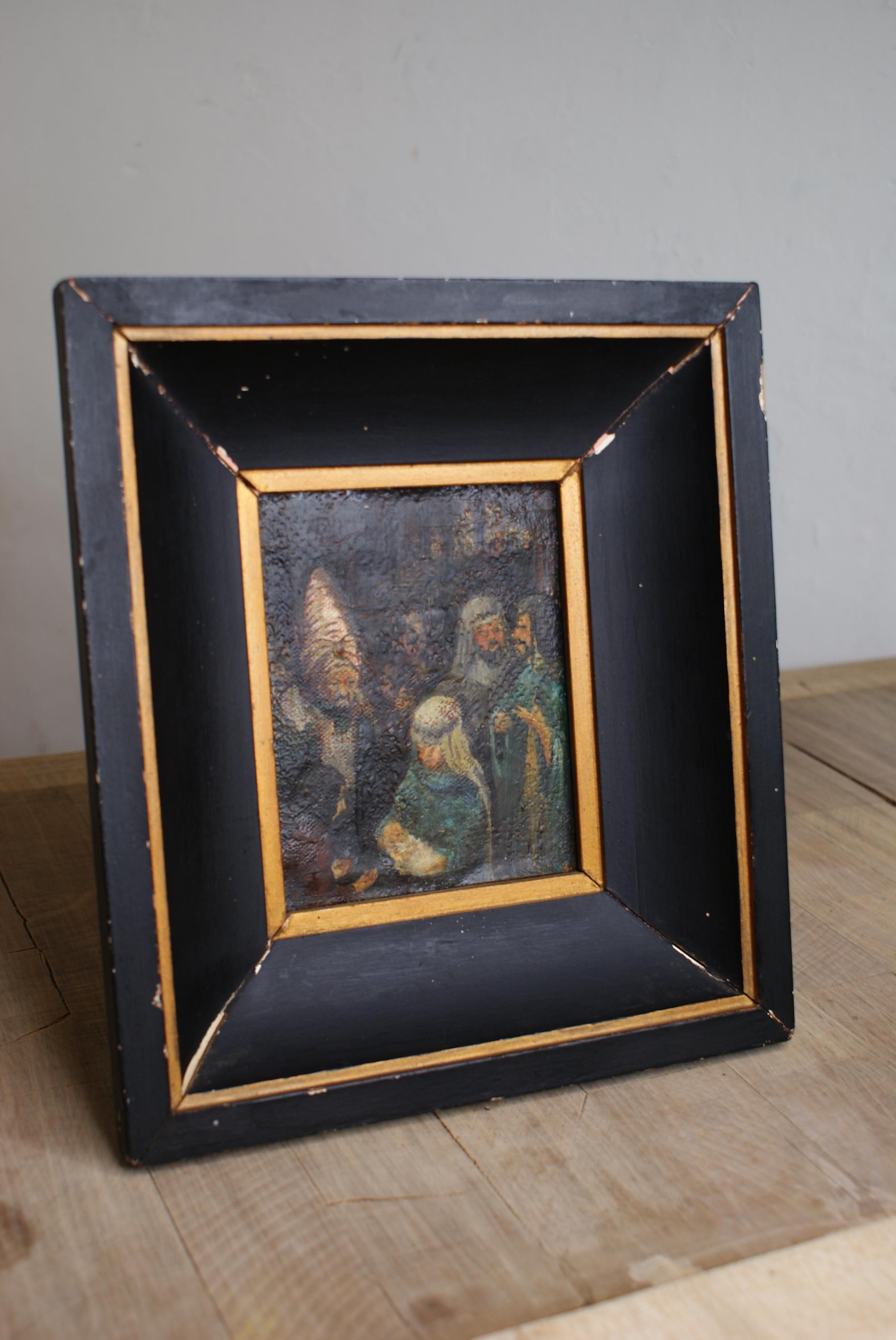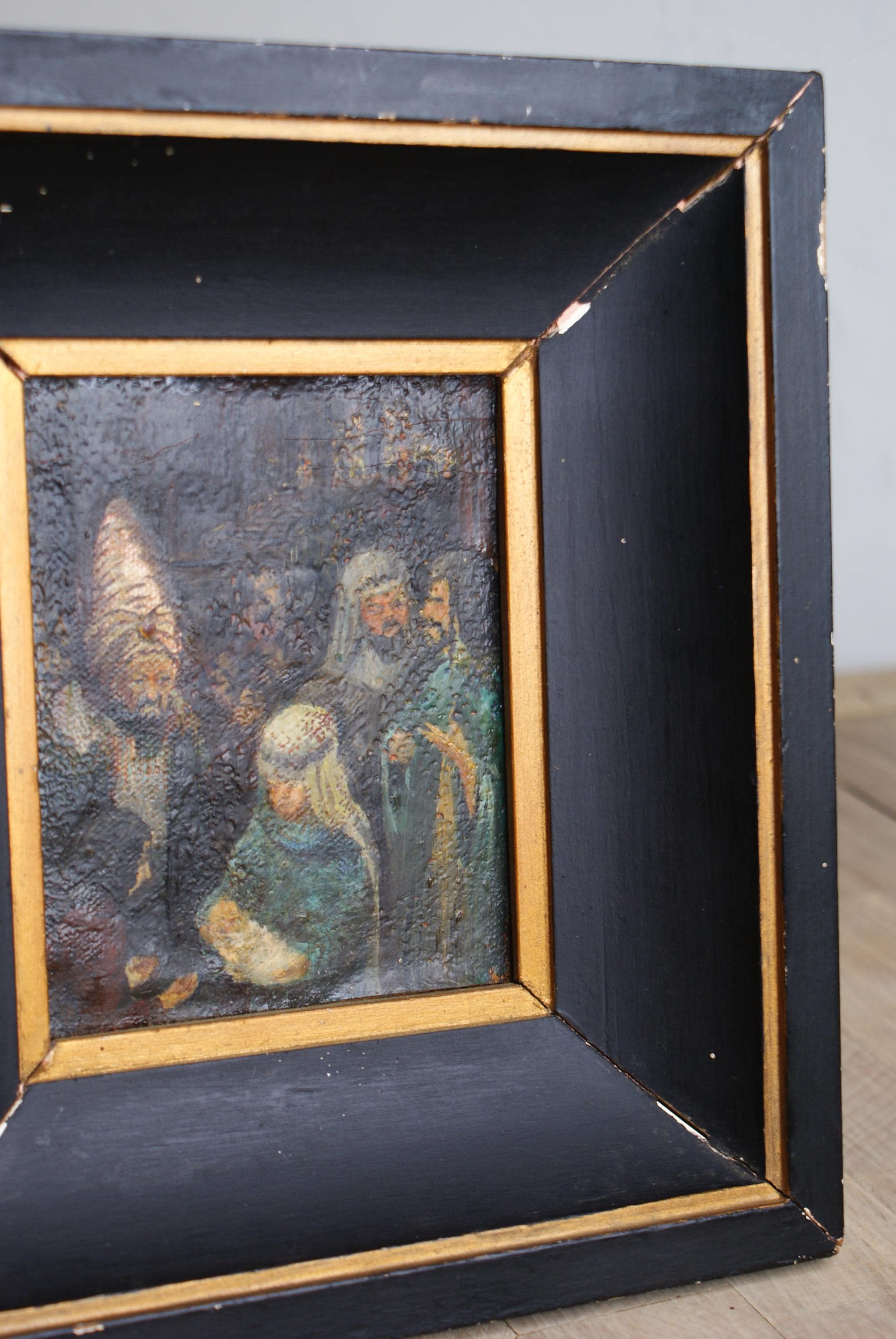 Lovely small framed oil painting, a lovely dark piece of art this appears to be a religious scene. The painting appears to be on paper and backed onto board, the frame is a newer addition but frames this perfectly.