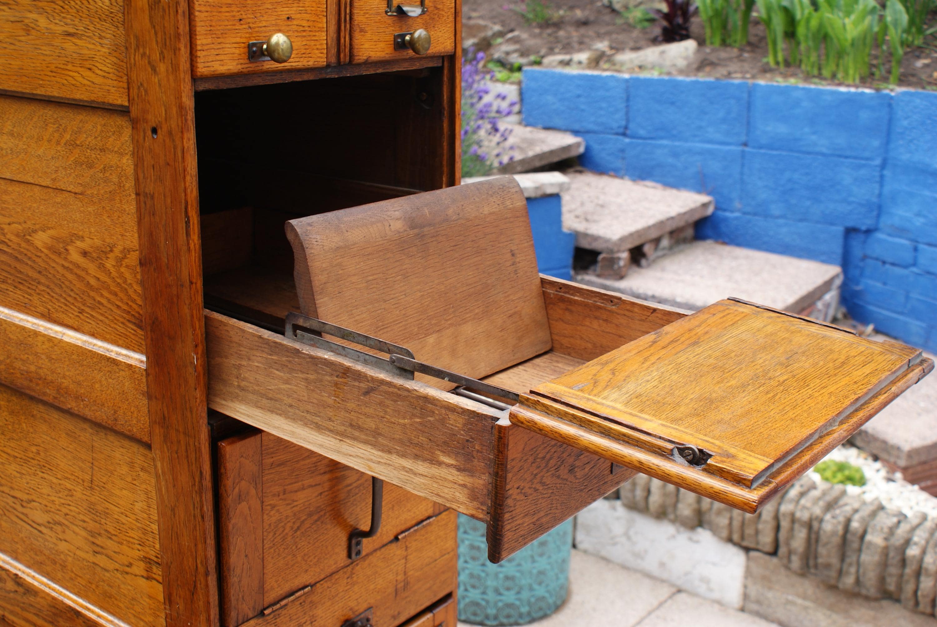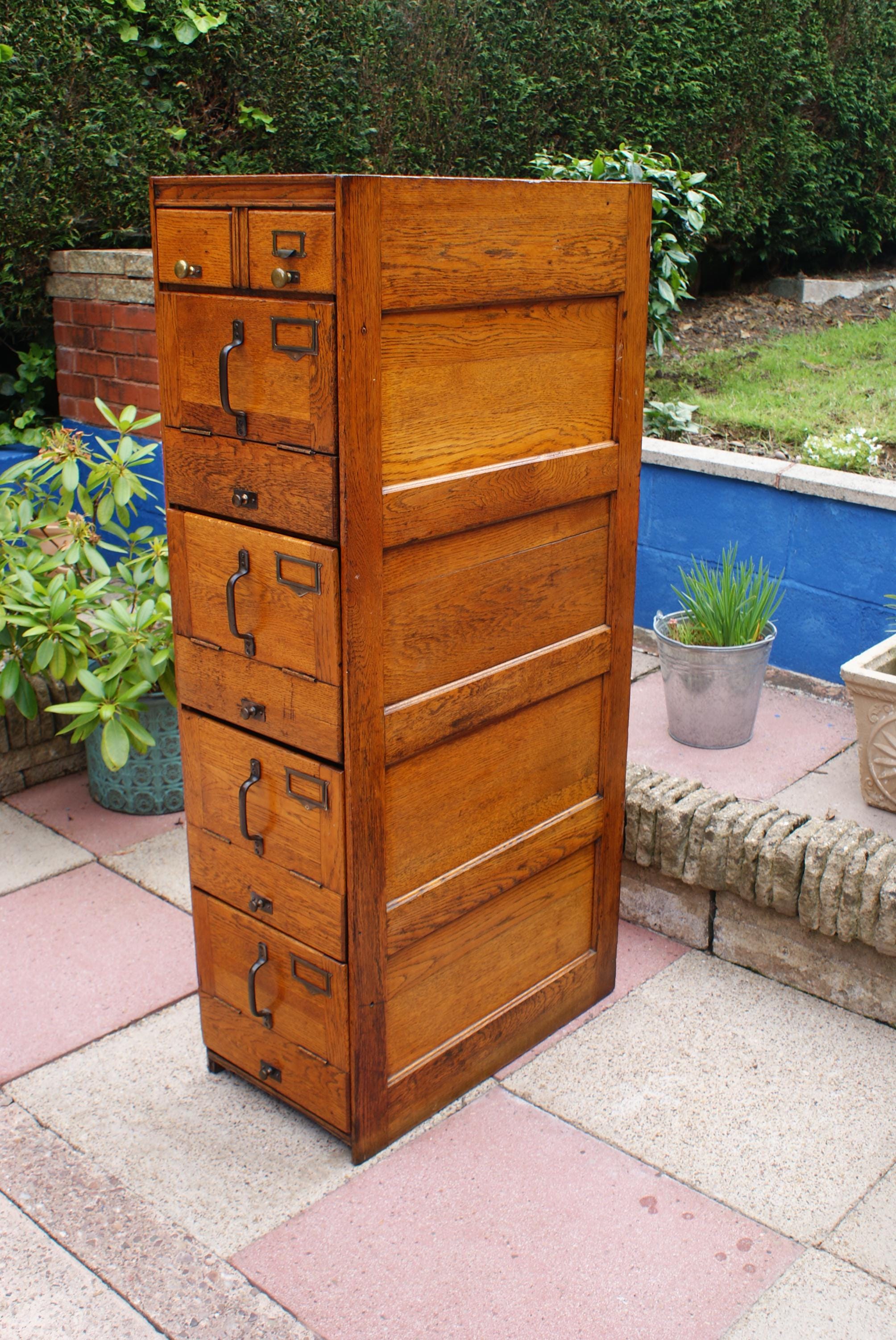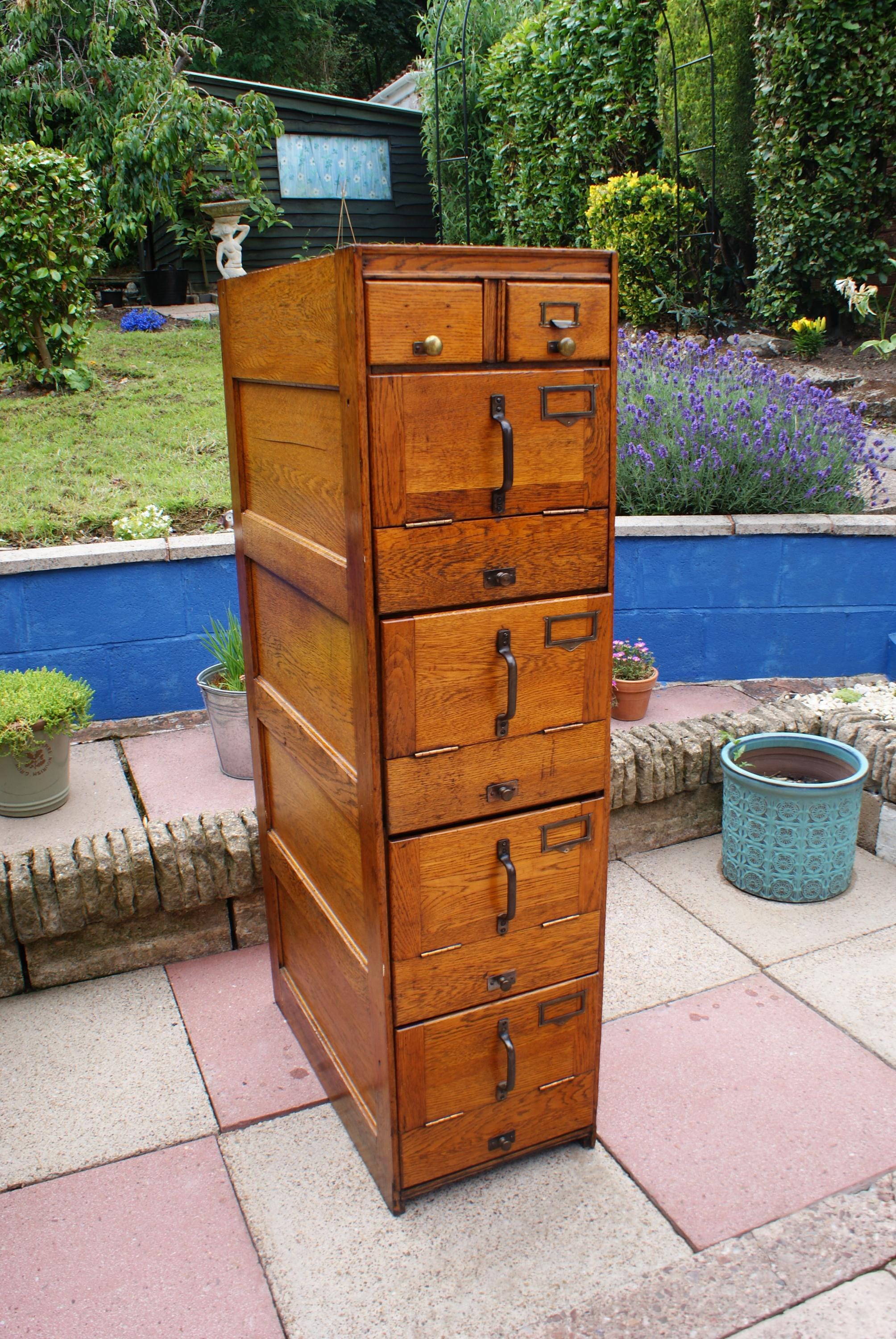 Stunning oak filing cabinet, in a fantastic condition with a lovely patina all over. A lovely piece of décor for most rooms around the home and is both functional and beautiful. there is one name plate missing from the top left drawer and signs of previous damp in the bottom drawer but this has been cleaned and treated, but overall excellent condition all over.