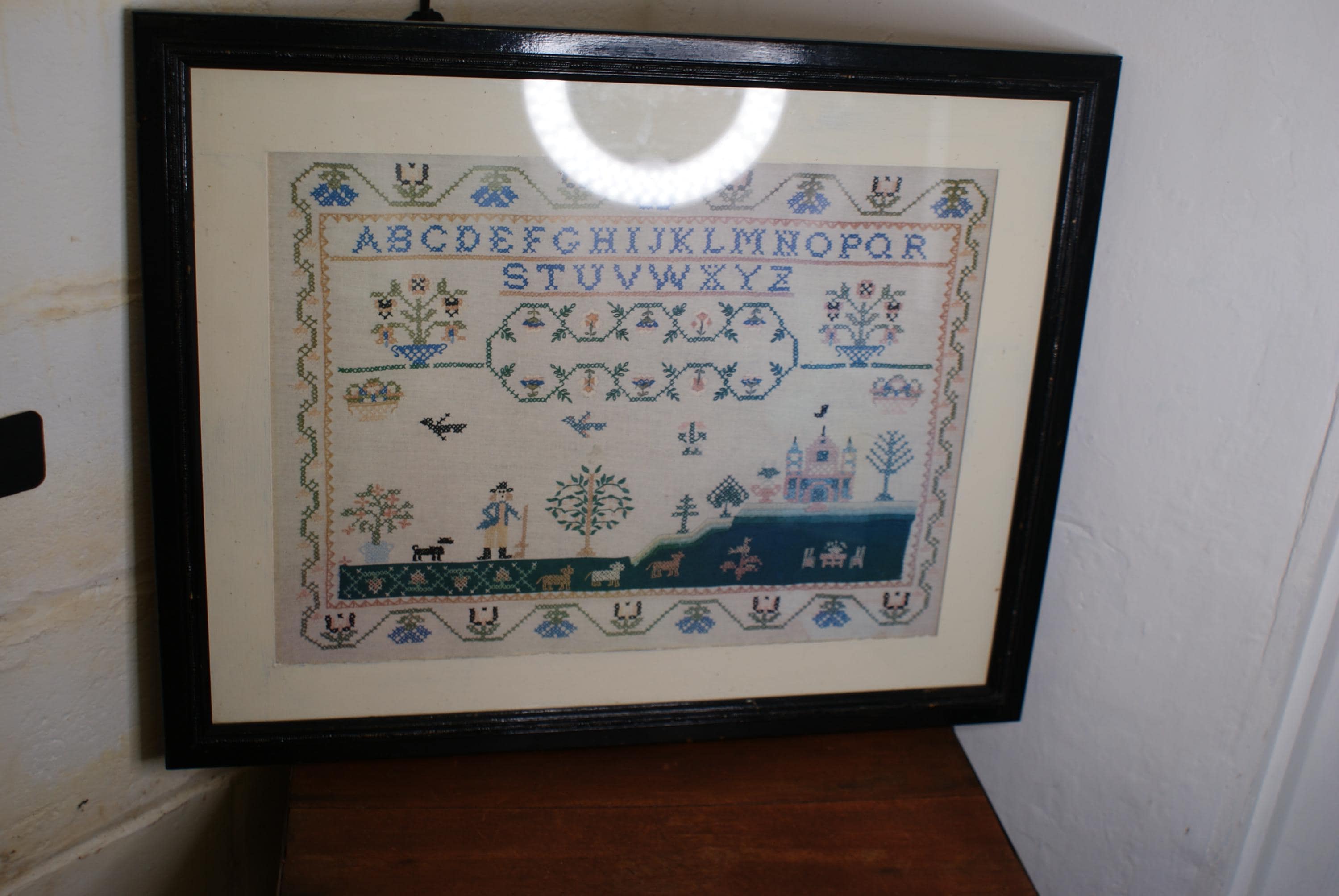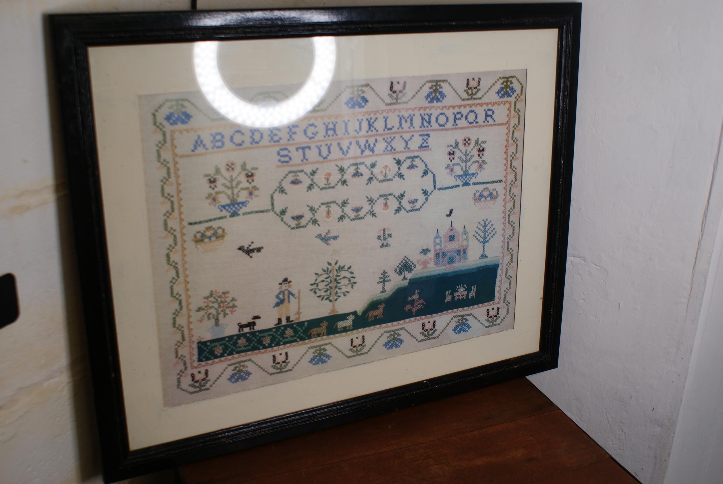 Lovely cross stitch sampler circa 1960's framed, a lovely piece with a folk art feel. Some slight damage near/on the castle but not highly noticeable.