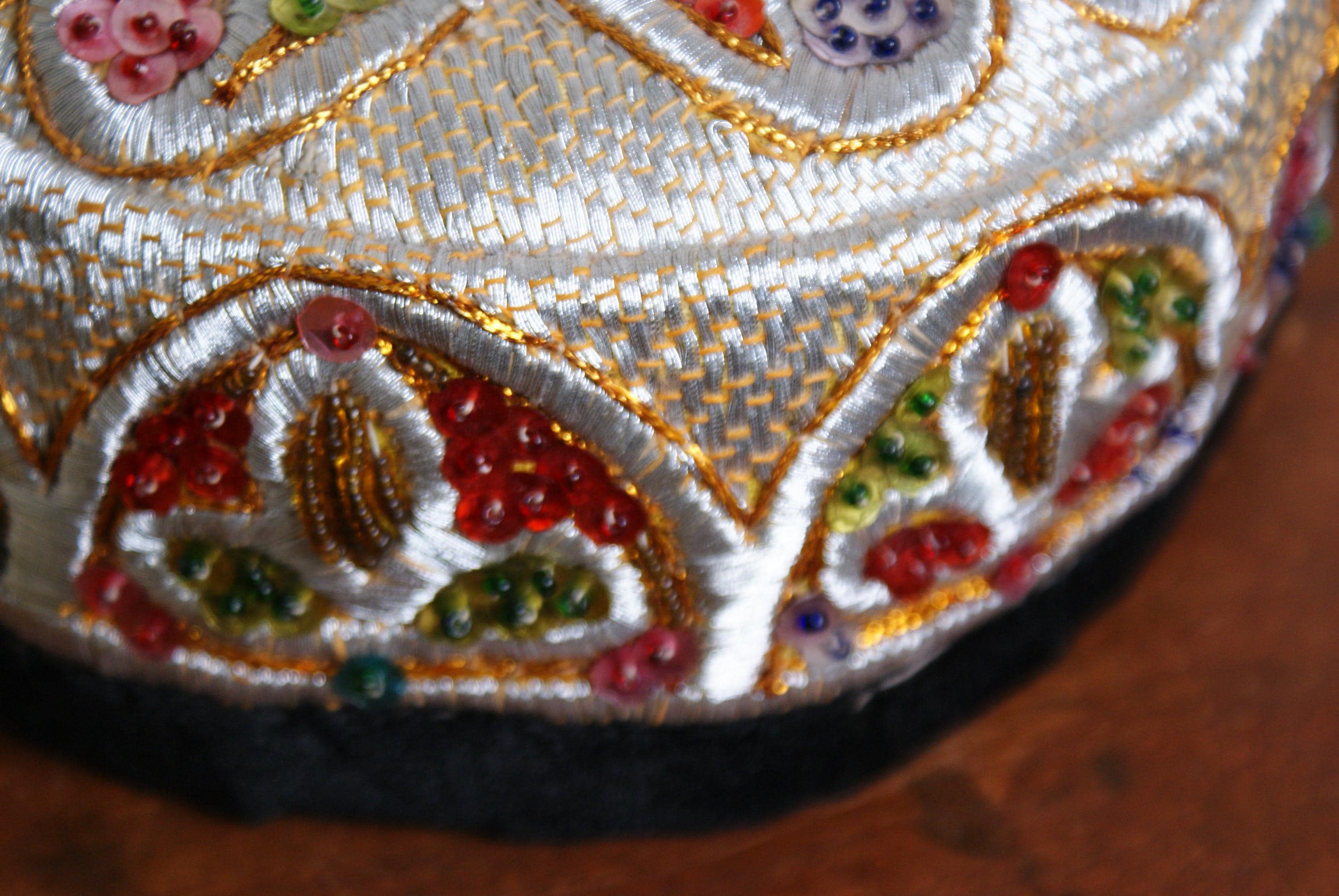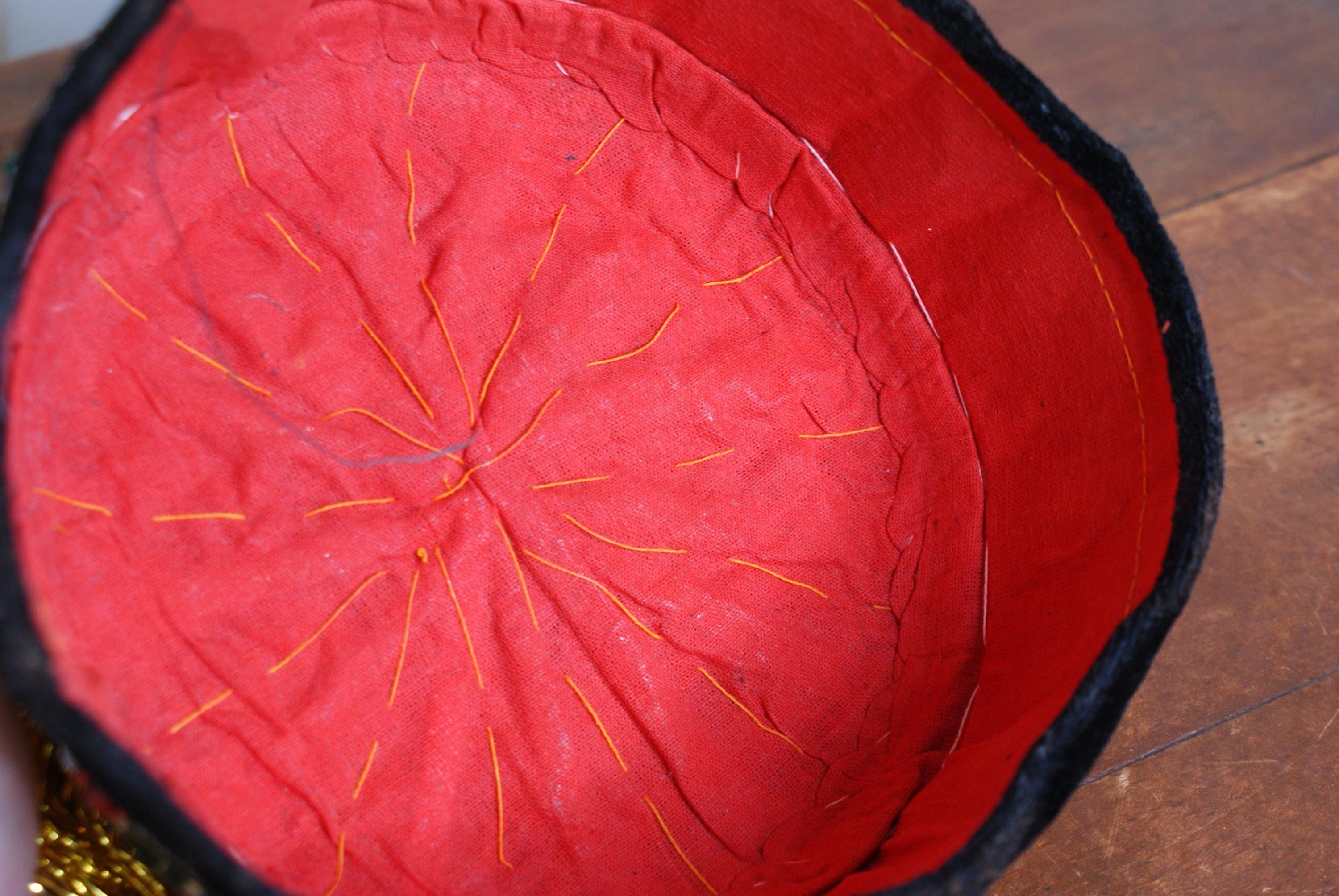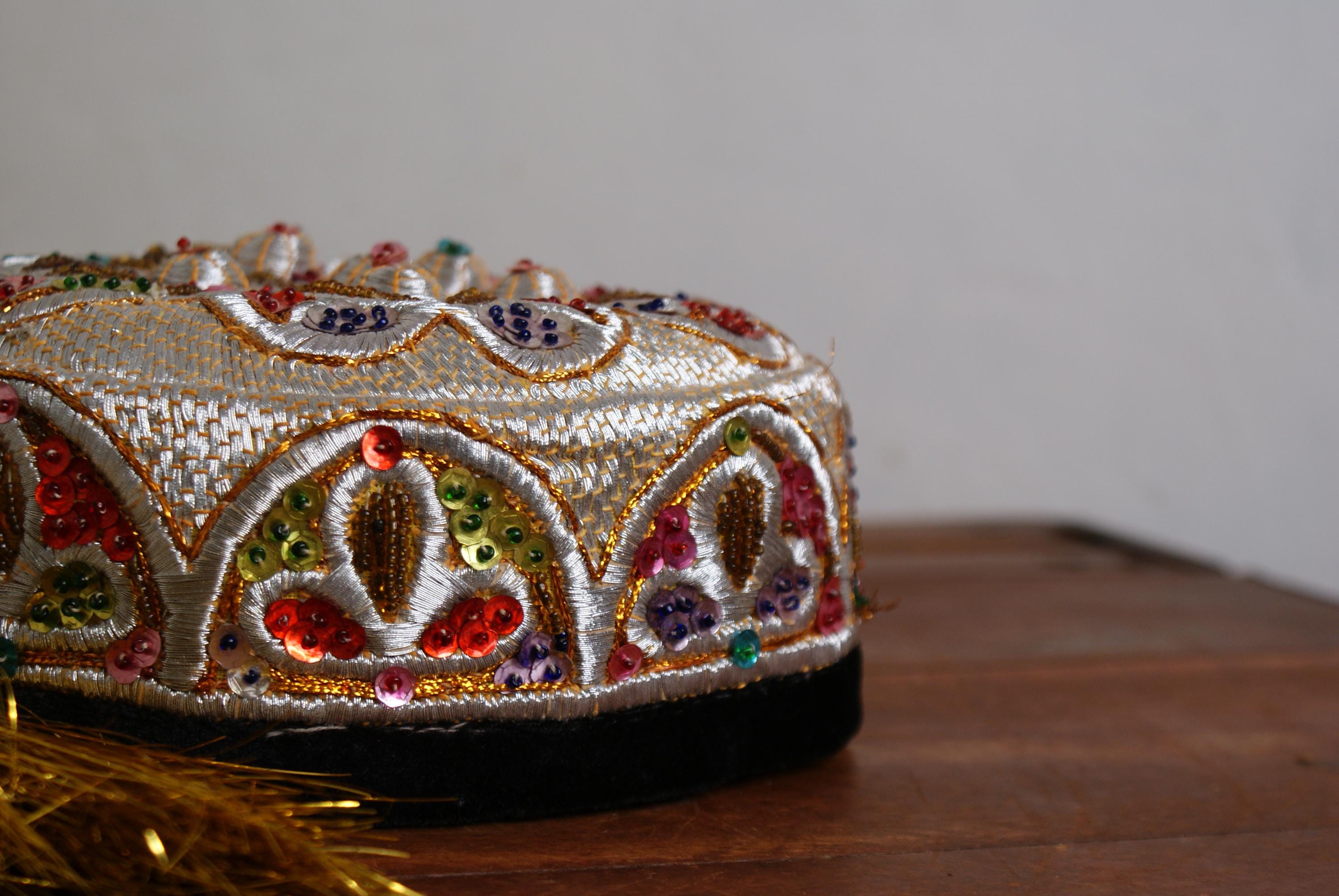Lovely traditional vintage skull cap, hand stitched and decorated with sequins and gold tassels this would make a fabulous eye catching display piece.