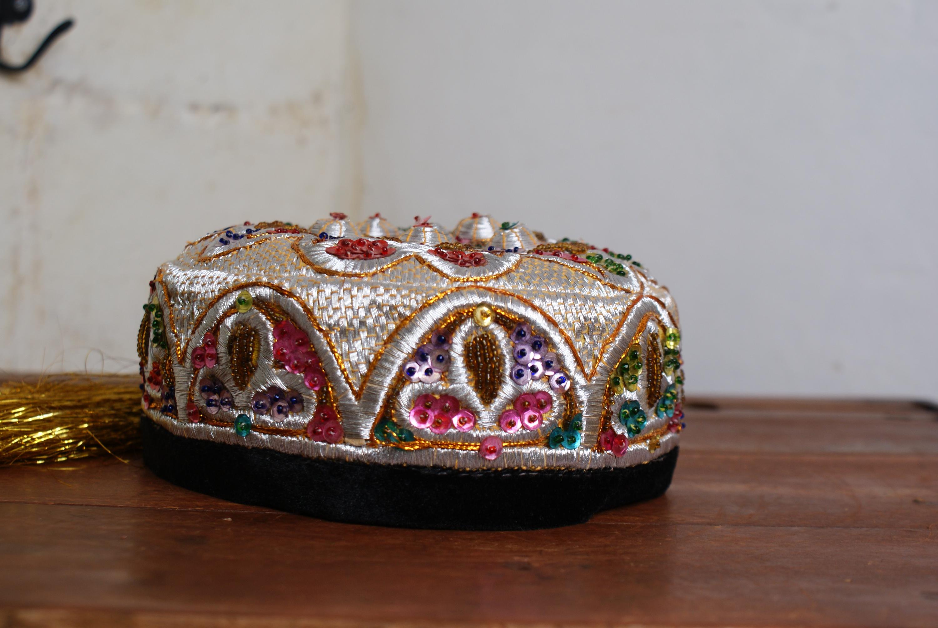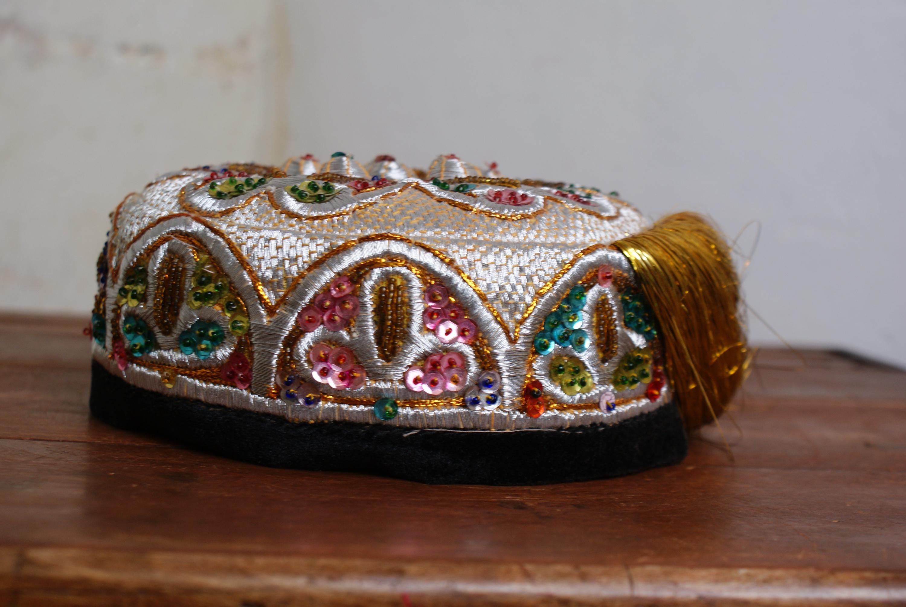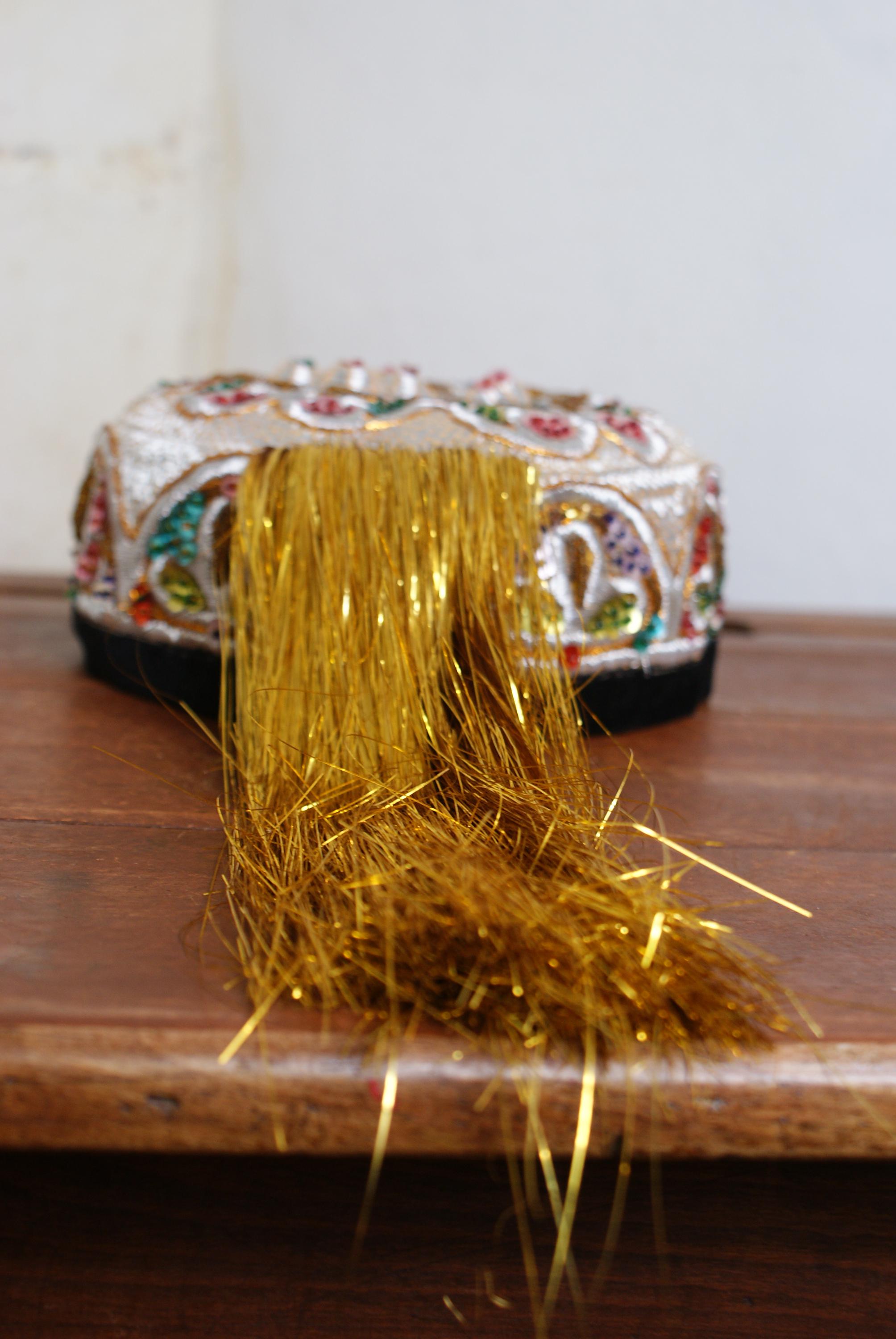 Lovely traditional vintage skull cap, hand stitched and decorated with sequins and gold tassels this would make a fabulous eye catching display piece.
