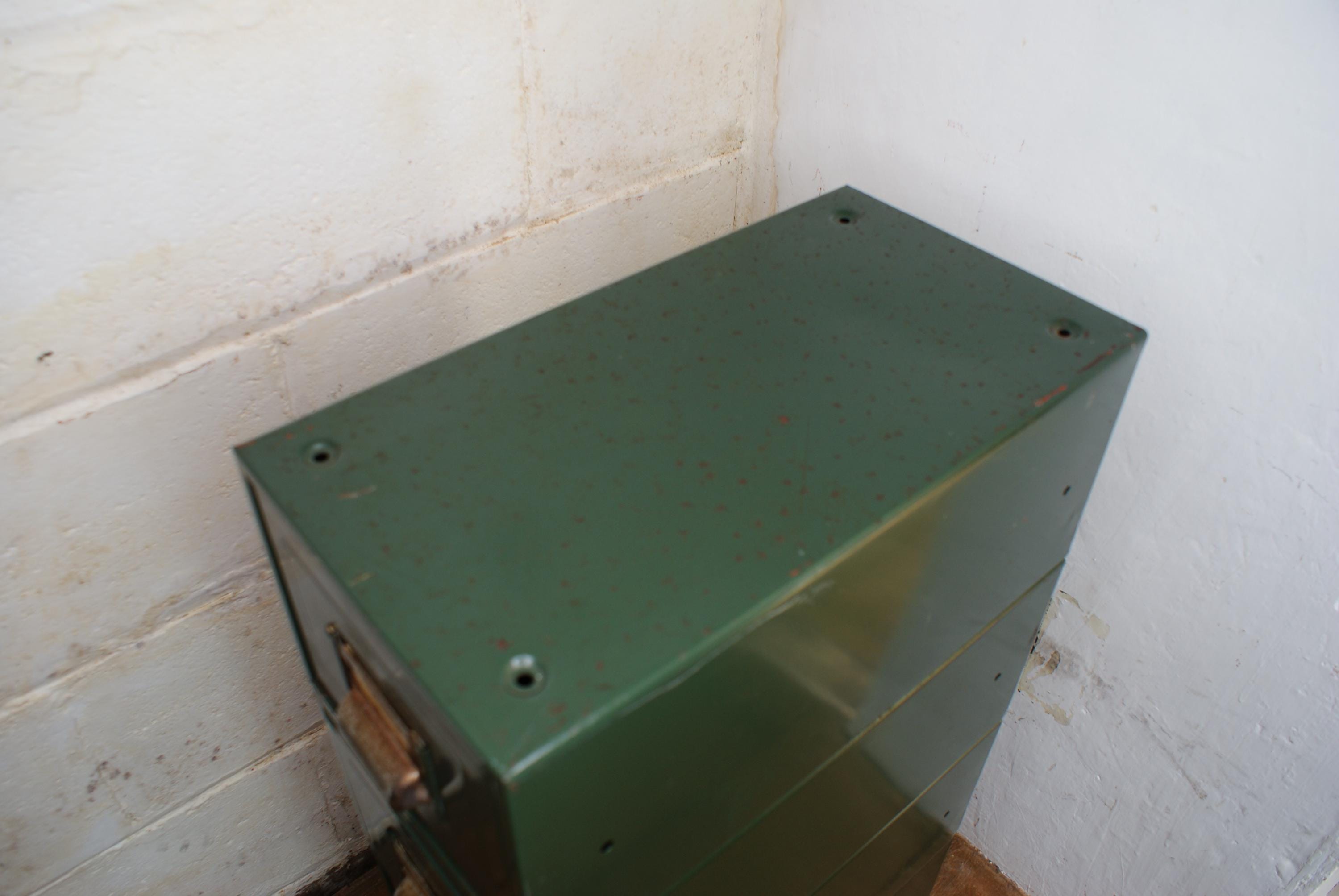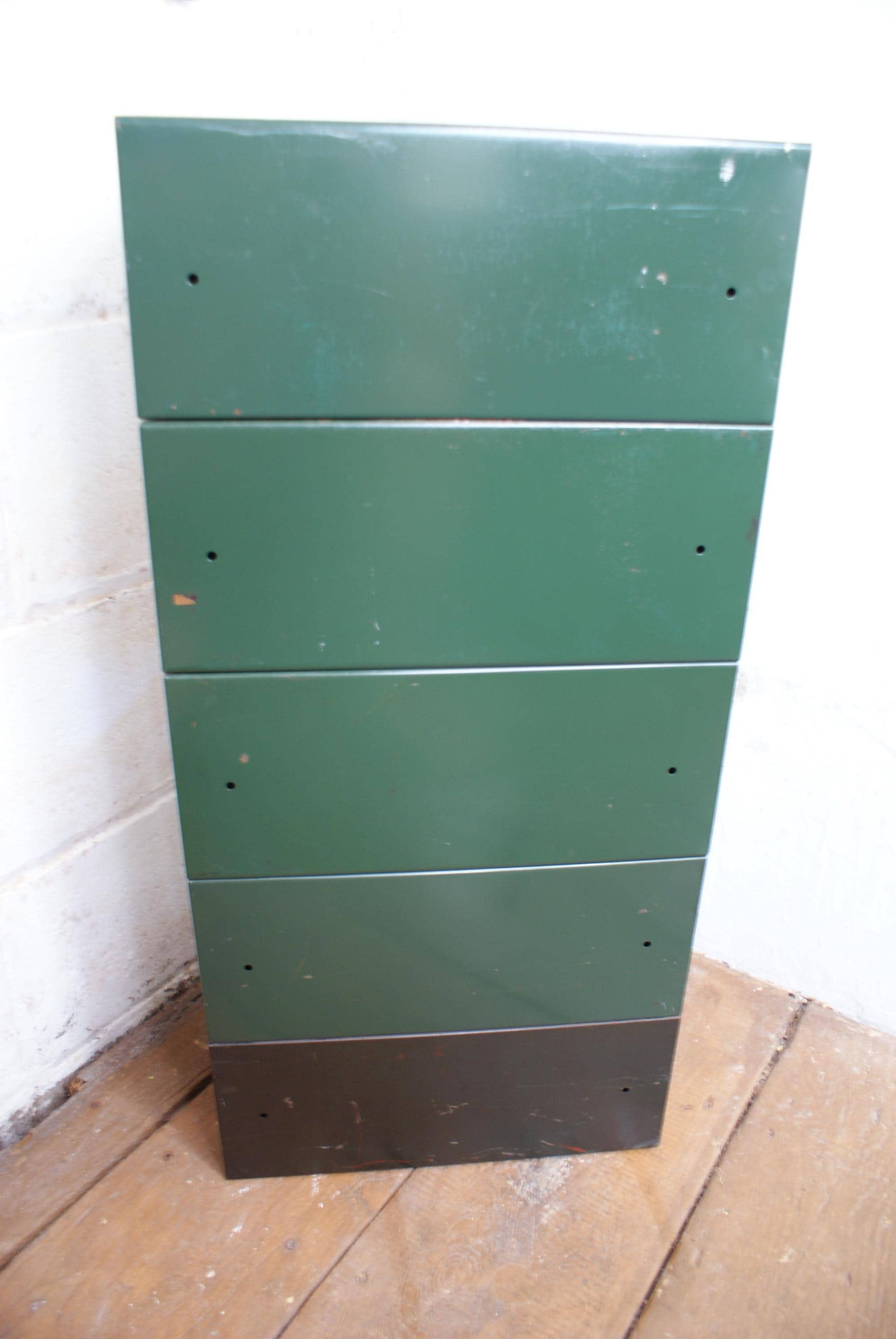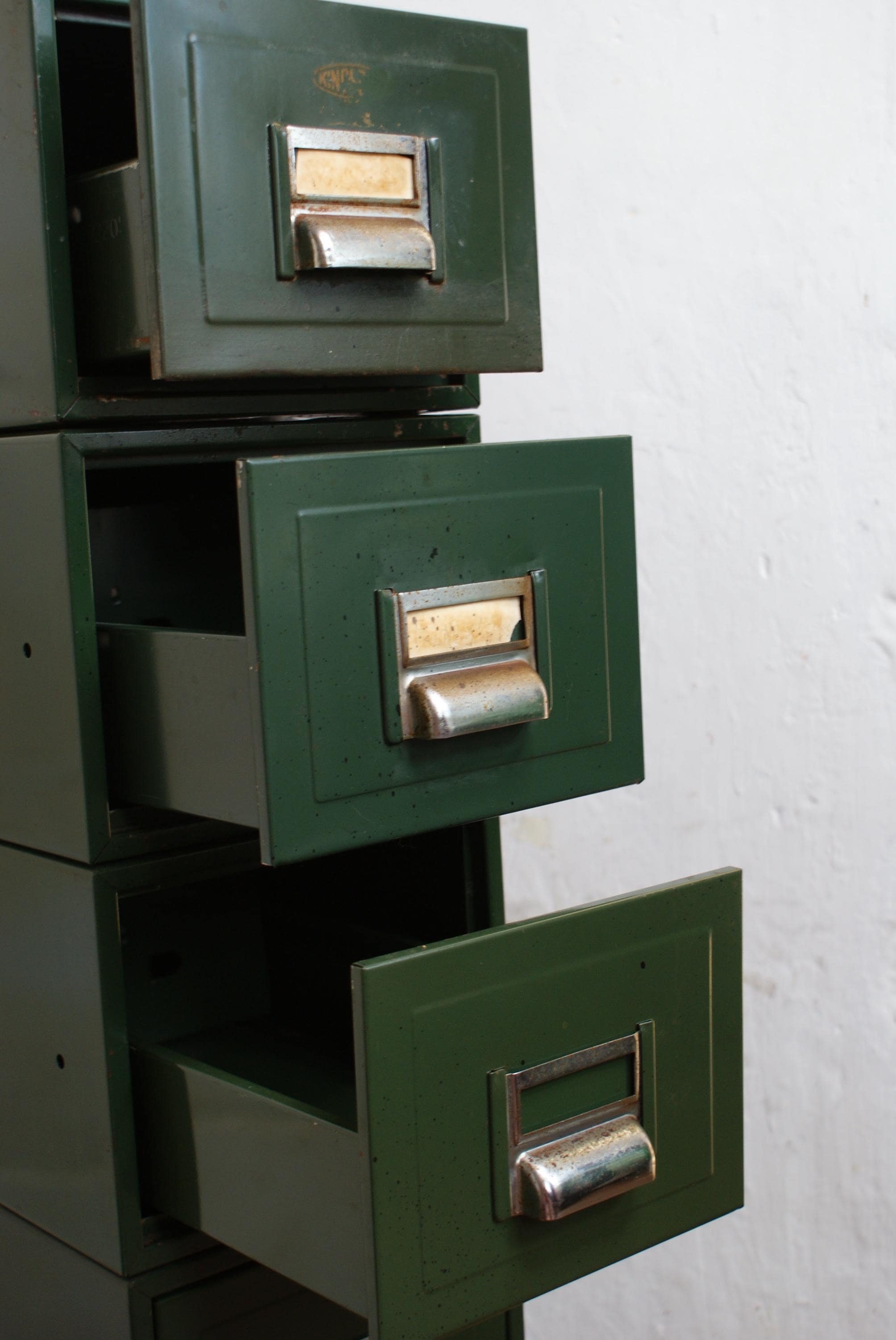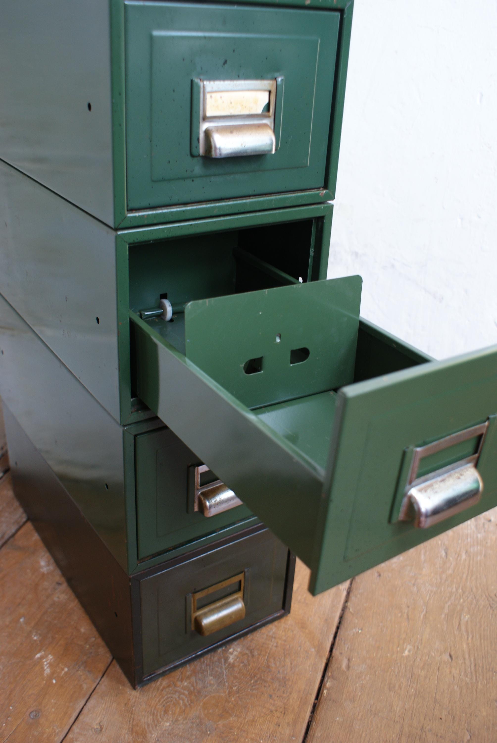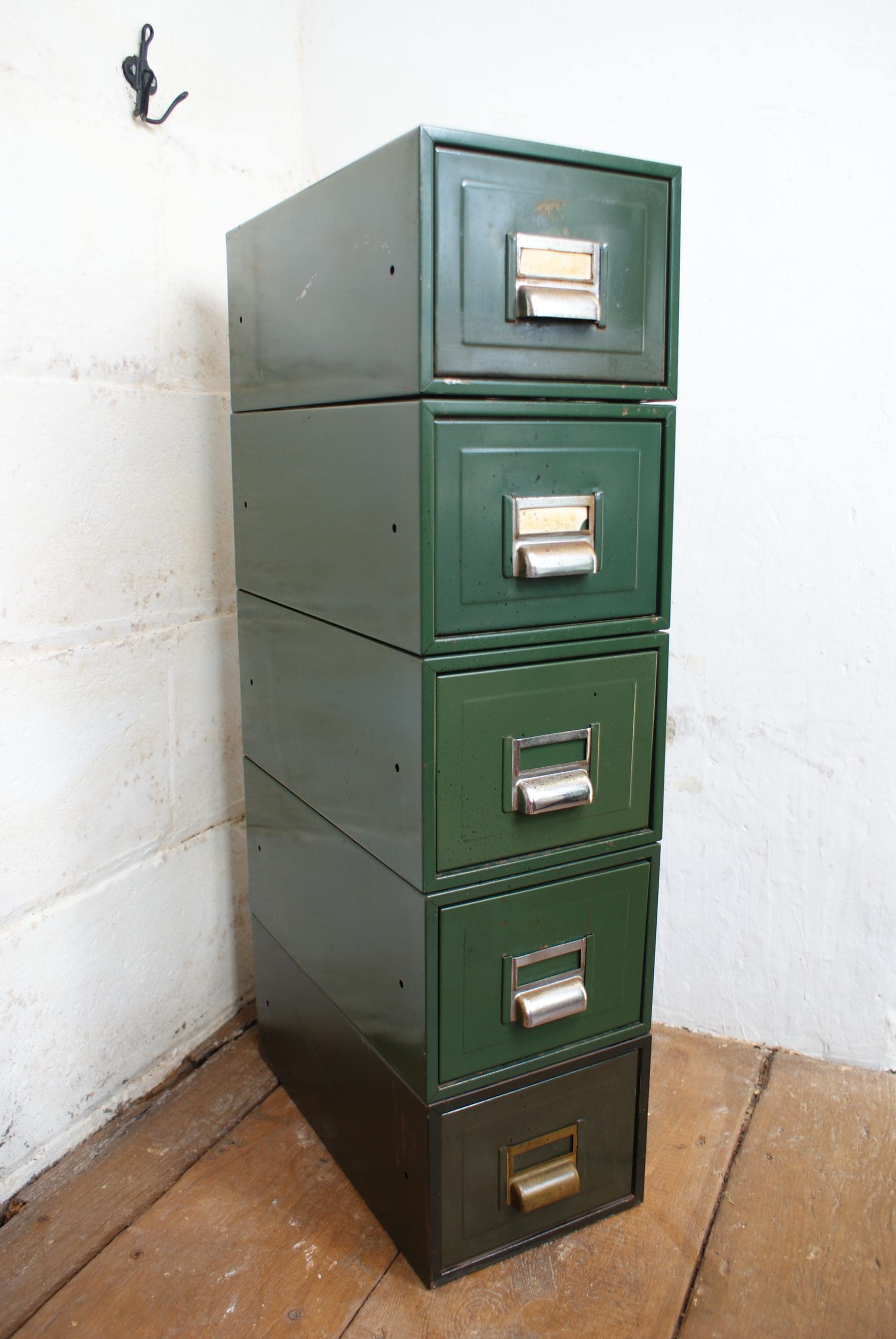 A fantastic set of steel drawers, in excellent condition with some light patina to the outside and all drawers clean and usable on the inside. 3 of the 5 drawers still have the sliding insert for filing paperwork. the drawers are stackable as pictured and fixed with bolts, the top two drawers are fixed at the front only as a bolt at the rear hinders the use of the drawers this doesn't effect the stability but requires care when moving them and is best to remove the drawers and lift from the third drawer. Price shown is for all five as pictured.