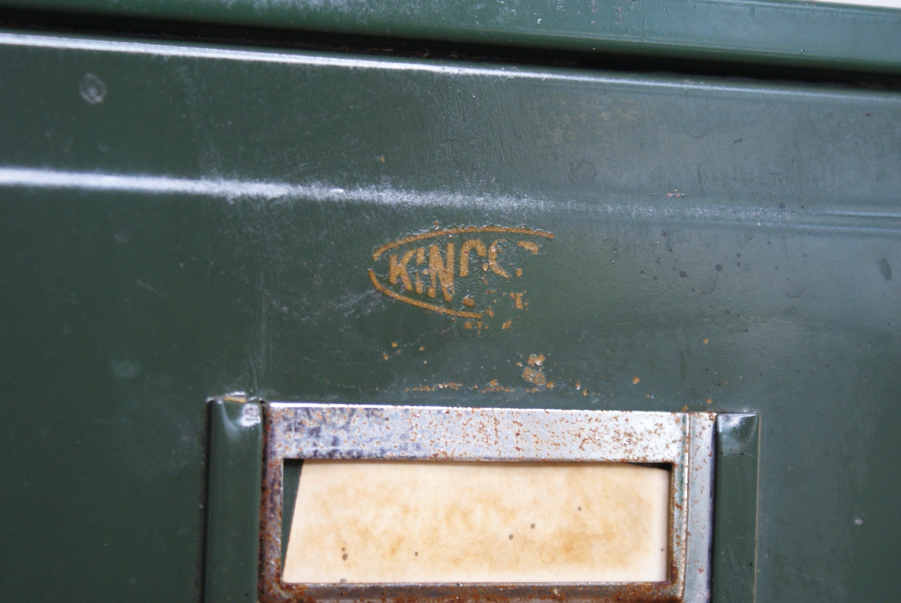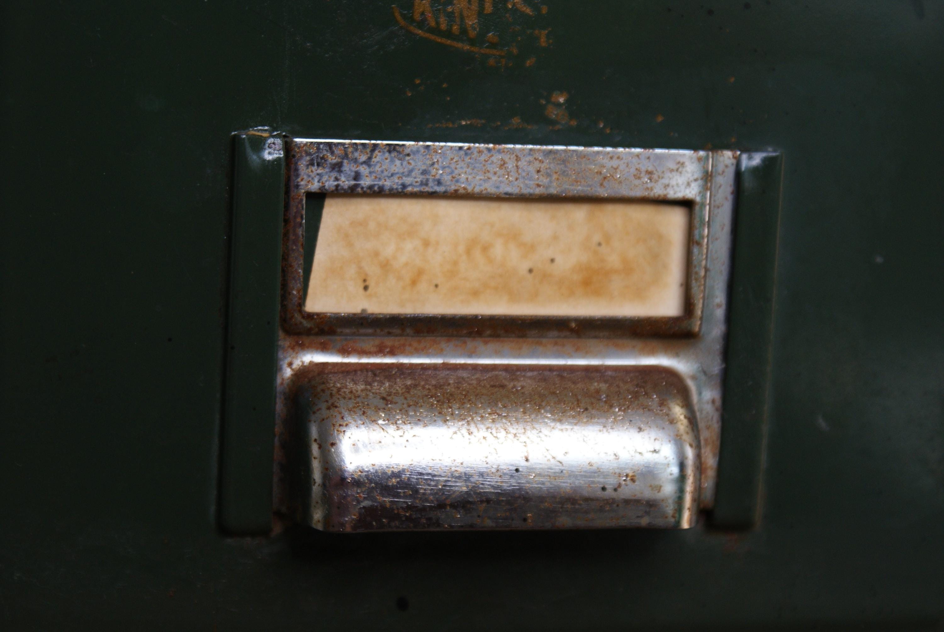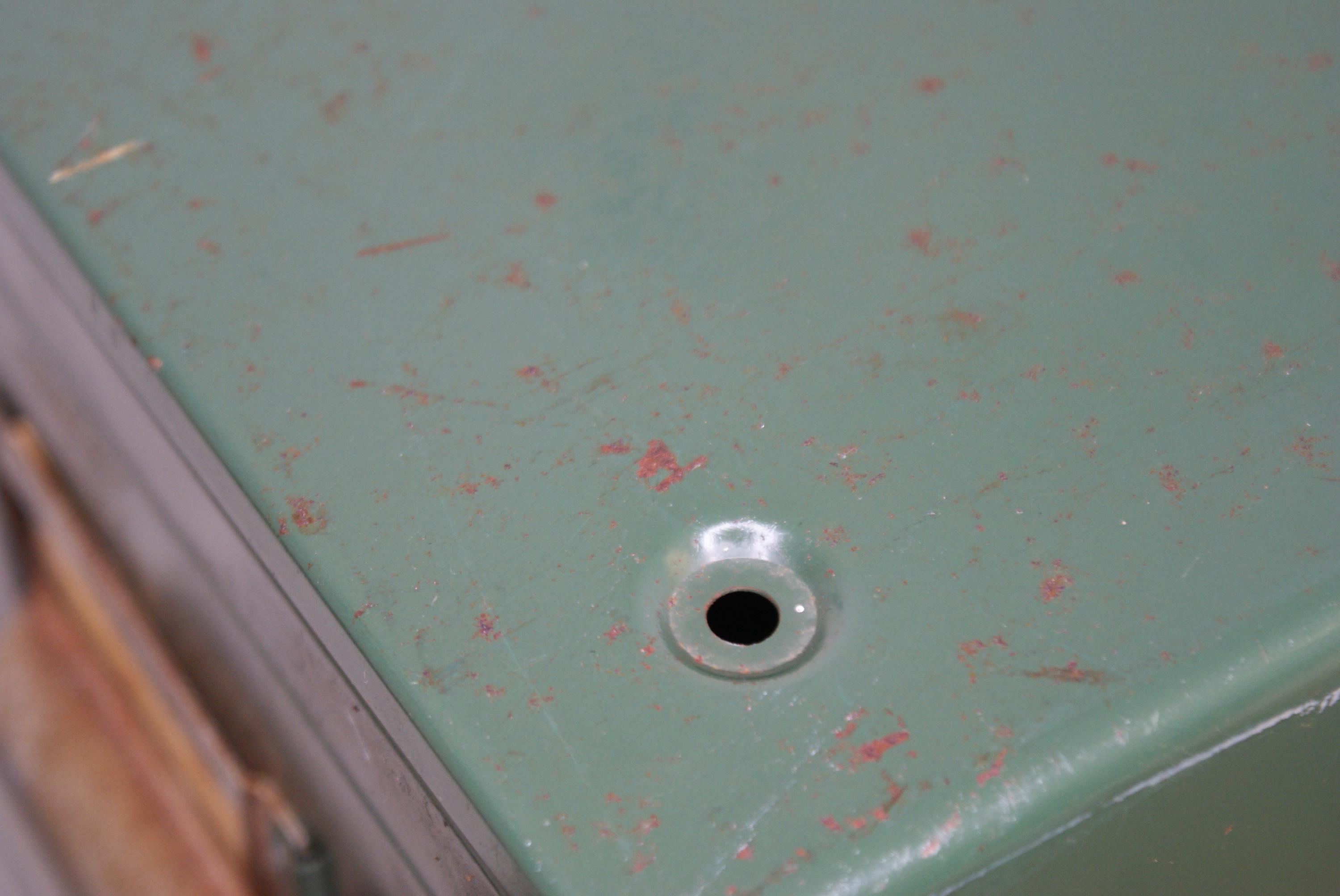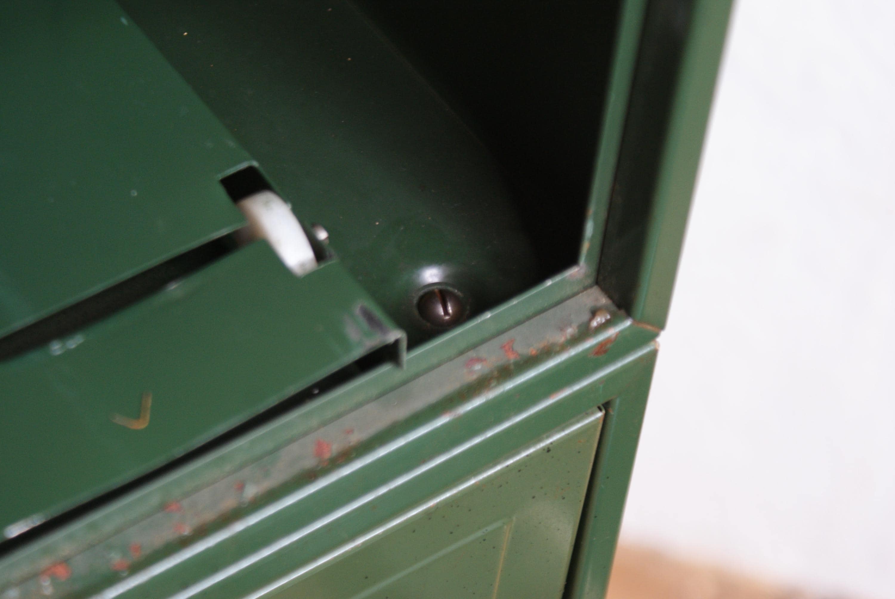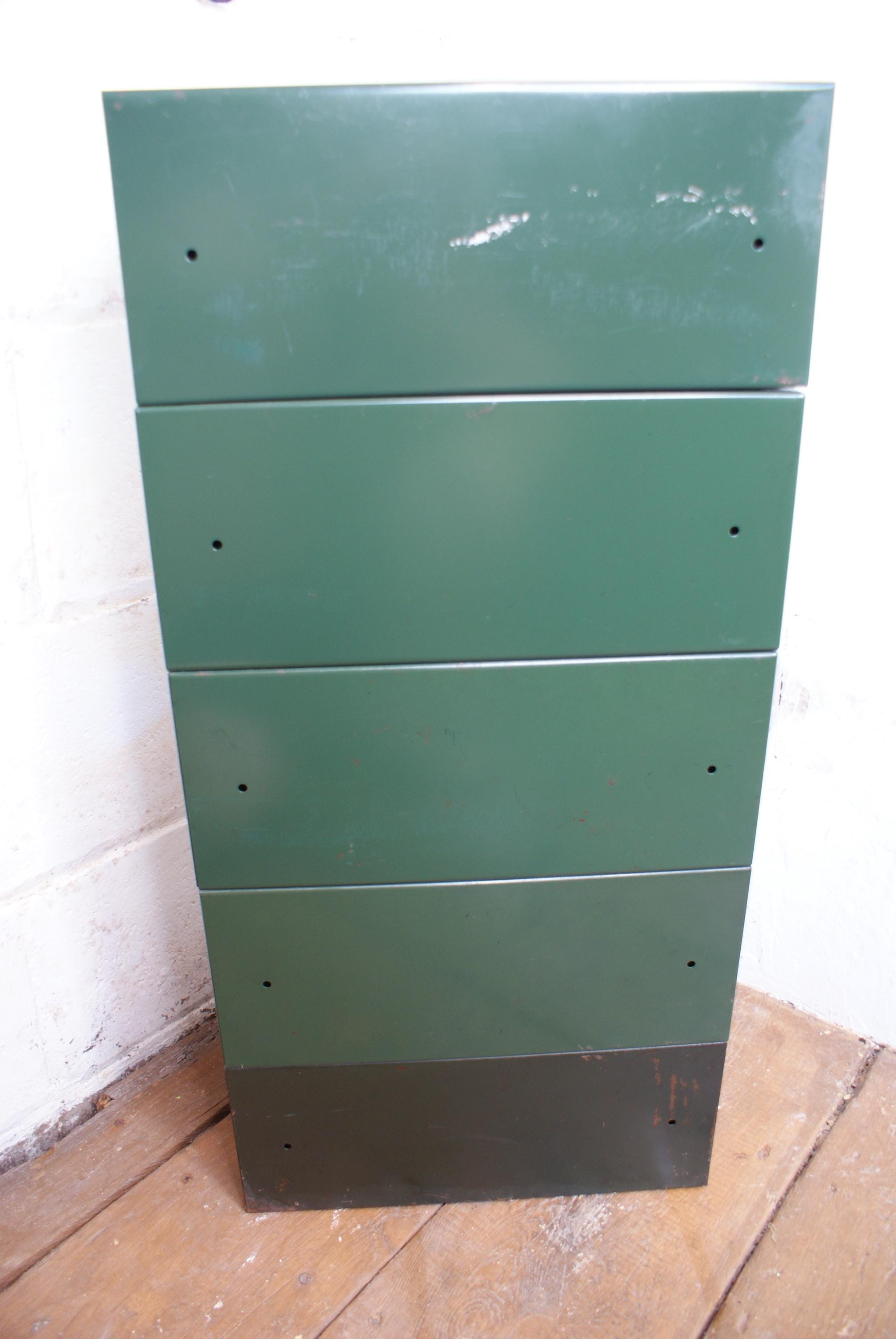 A fantastic set of steel drawers, in excellent condition with some light patina to the outside and all drawers clean and usable on the inside. 3 of the 5 drawers still have the sliding insert for filing paperwork. the drawers are stackable as pictured and fixed with bolts, the top two drawers are fixed at the front only as a bolt at the rear hinders the use of the drawers this doesn't effect the stability but requires care when moving them and is best to remove the drawers and lift from the third drawer. Price shown is for all five as pictured.