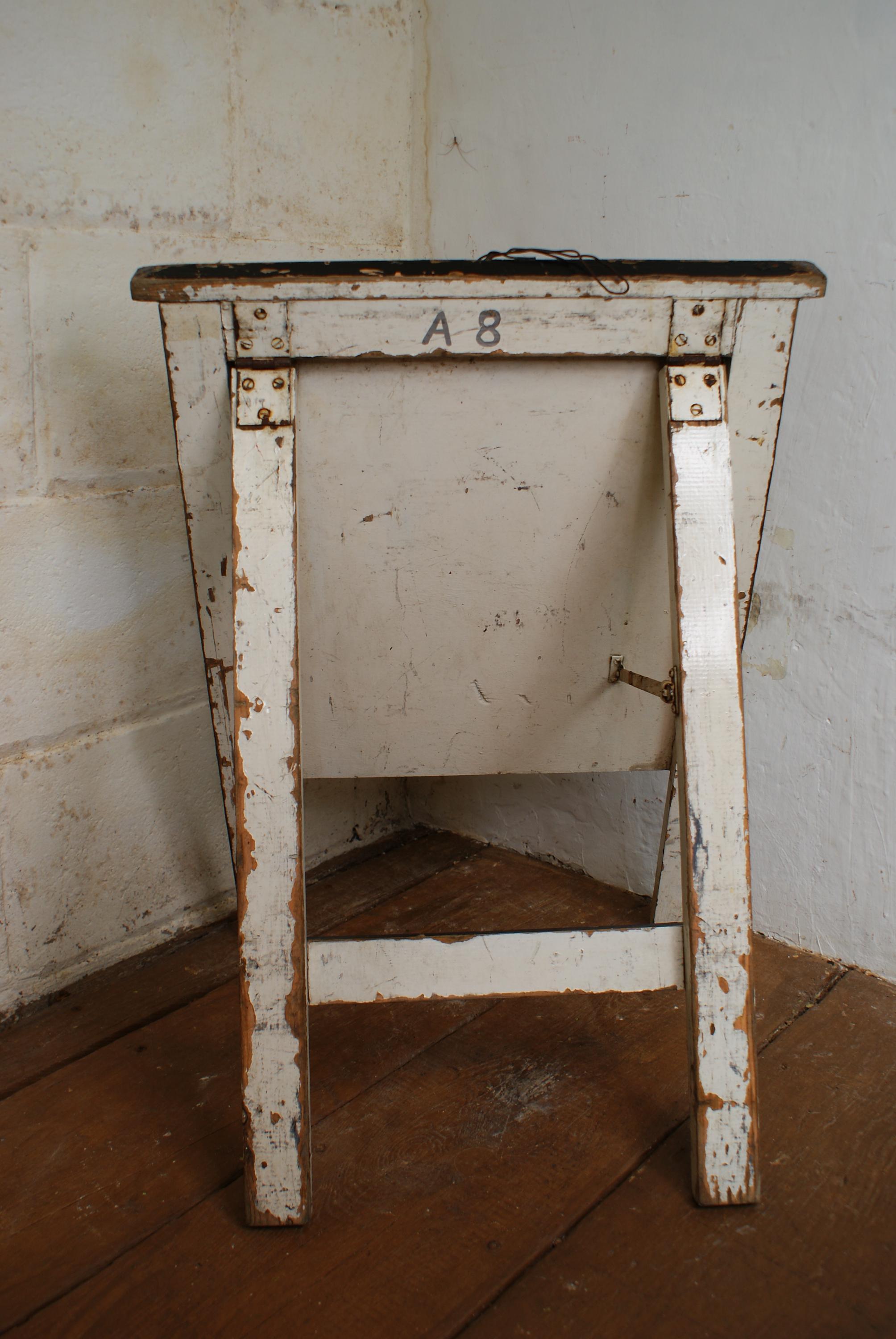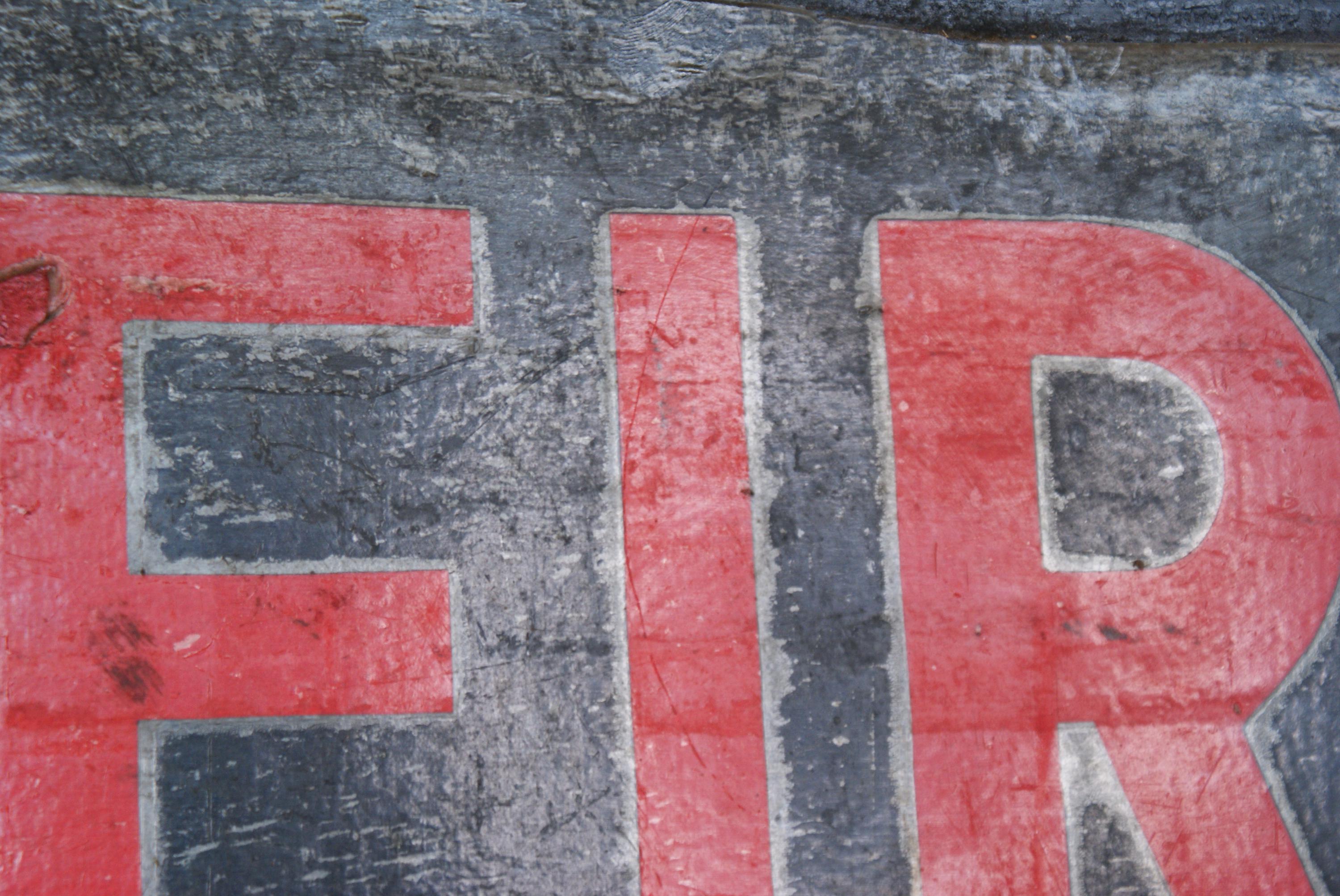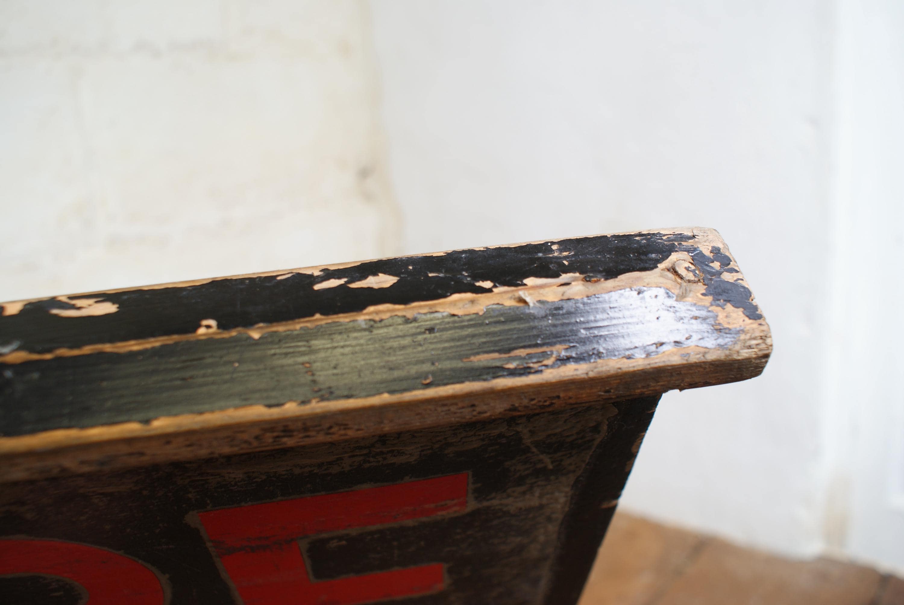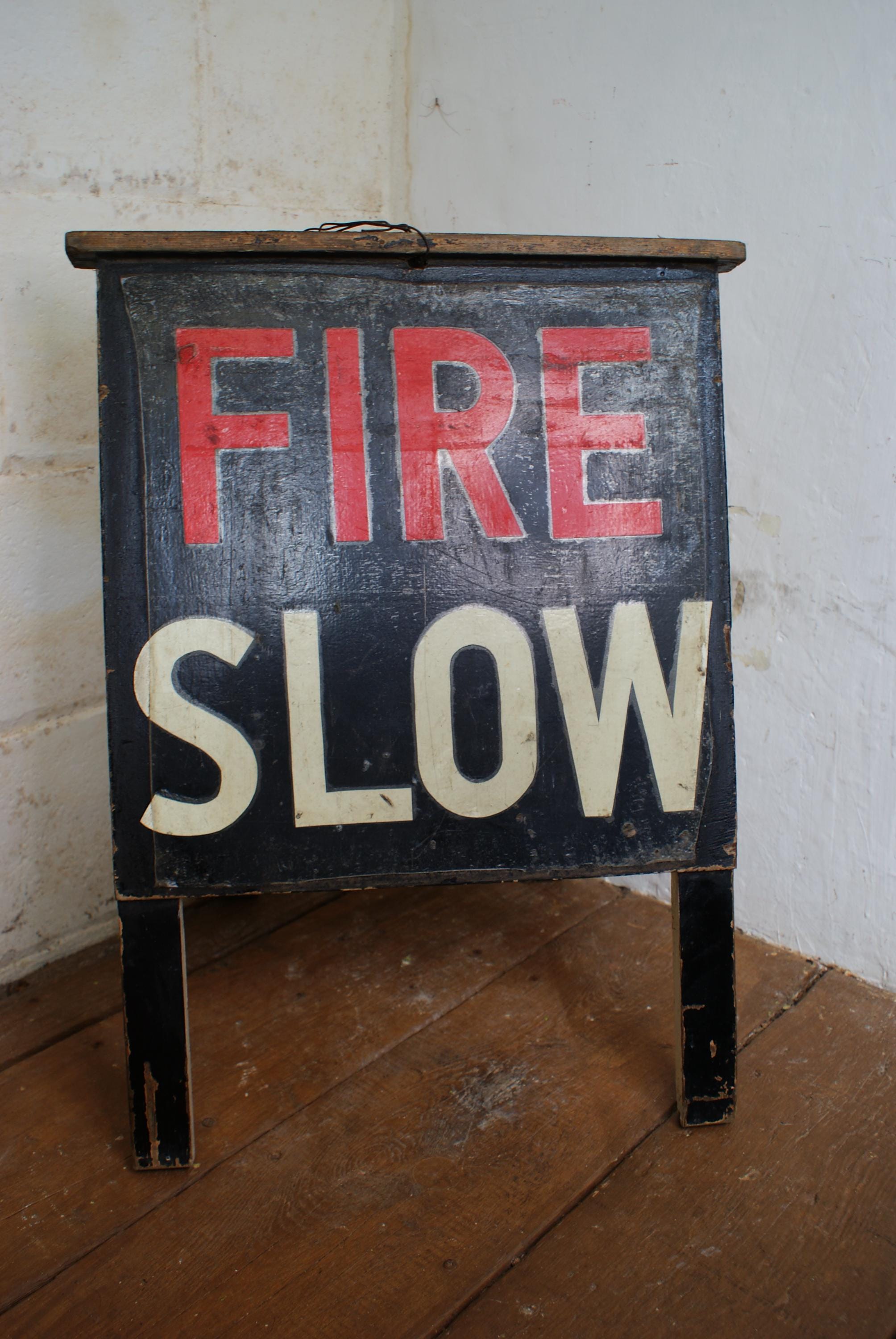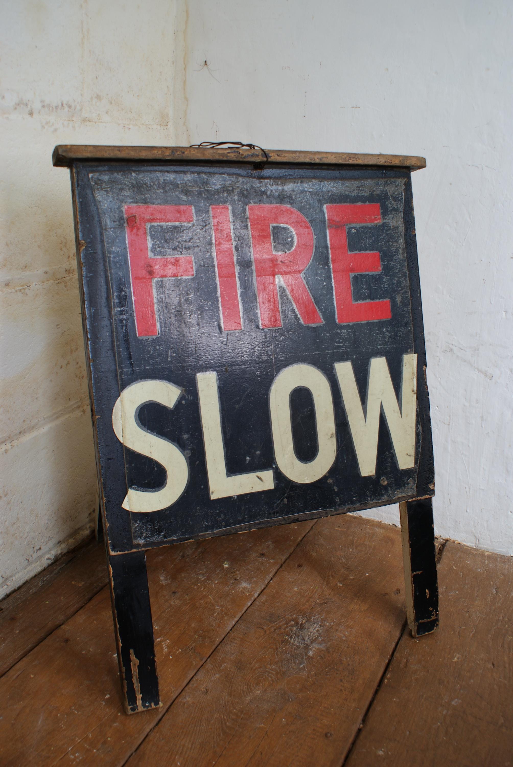 A fantastic warning 'A' board sign c.1950, originally used by firefighters and part of the 1950's Dennis fire engine equipment this would have been deployed at emergency scenes to warn and control traffic. This has a stunning patina in line with its use and is full of character, a real fun piece of décor.