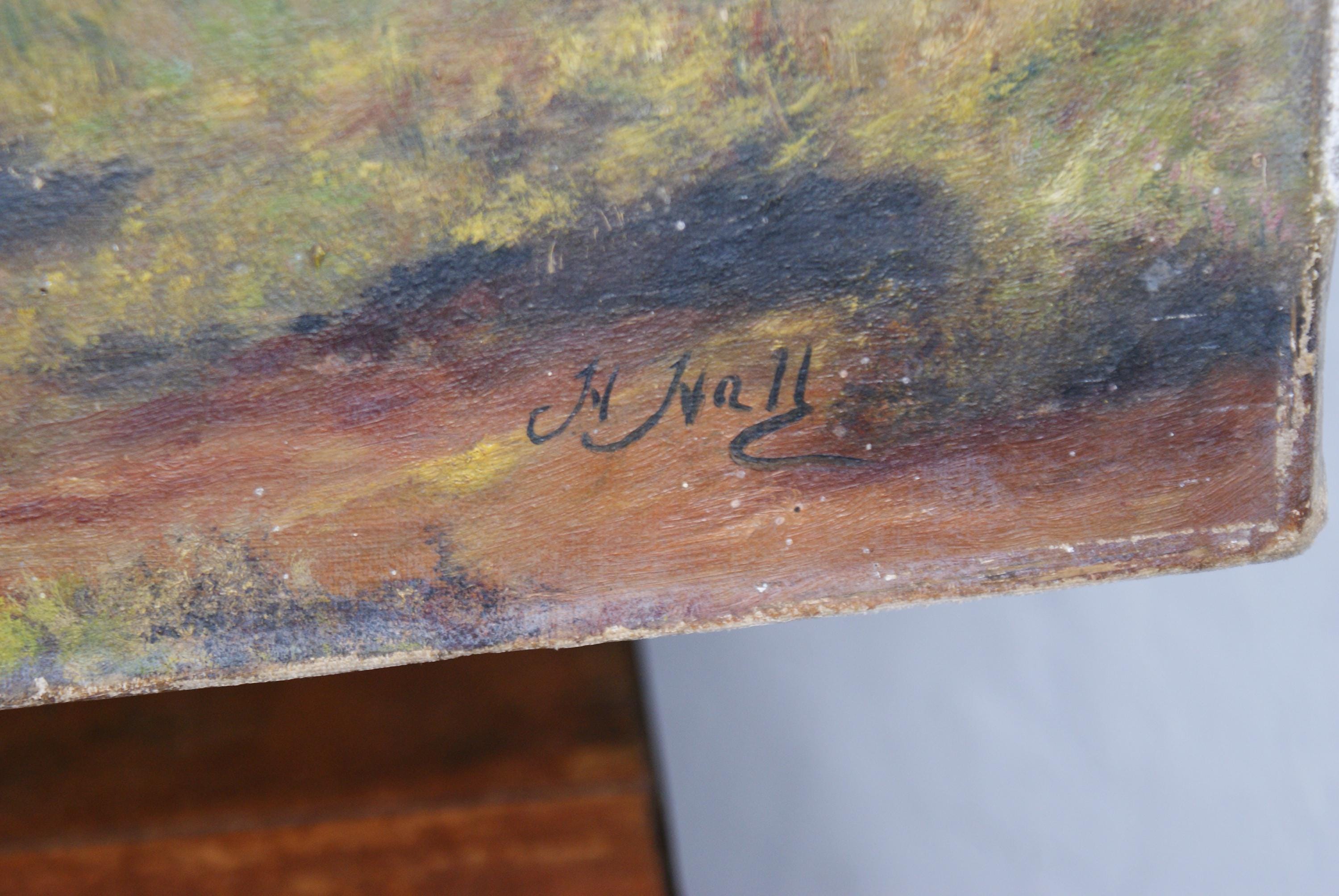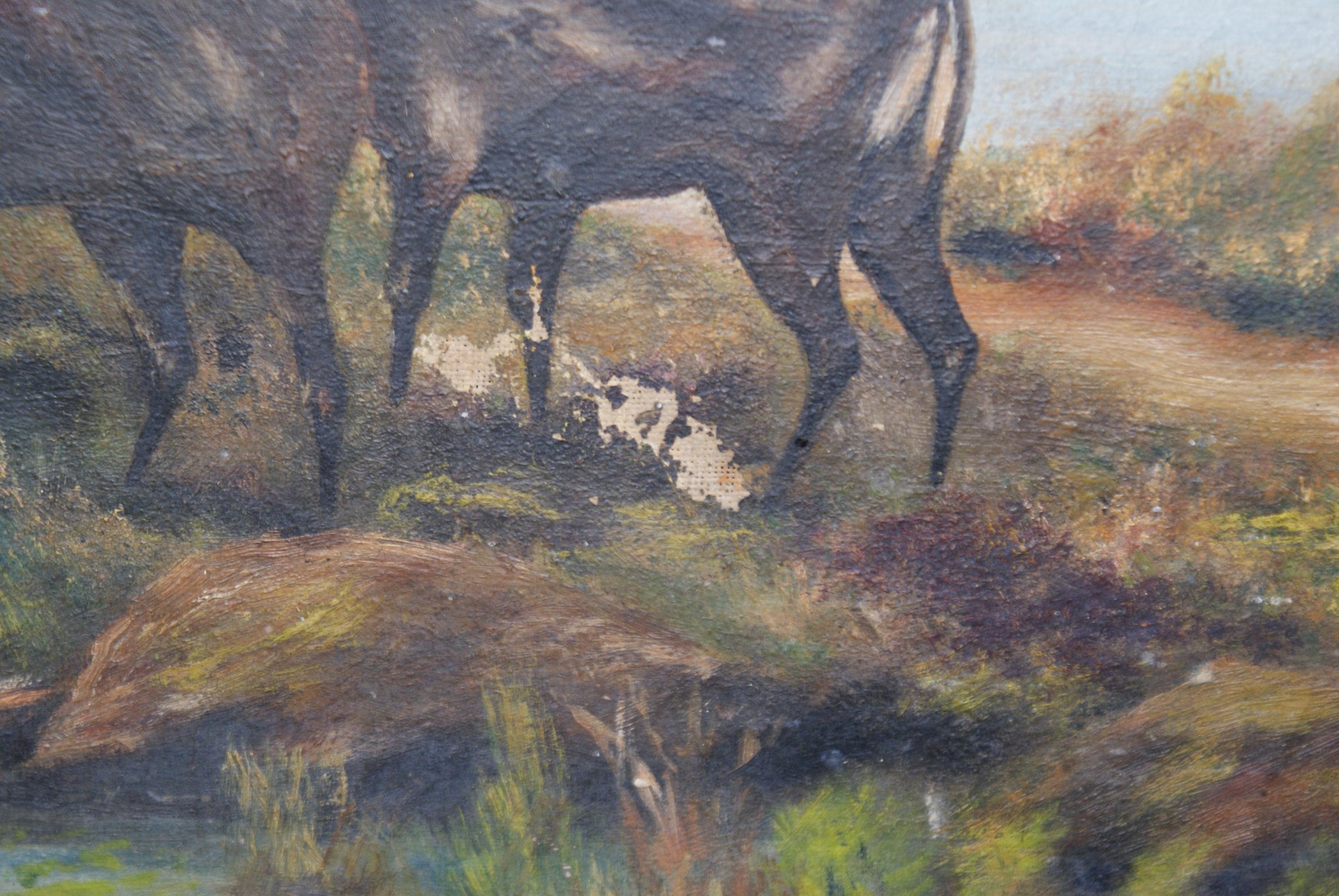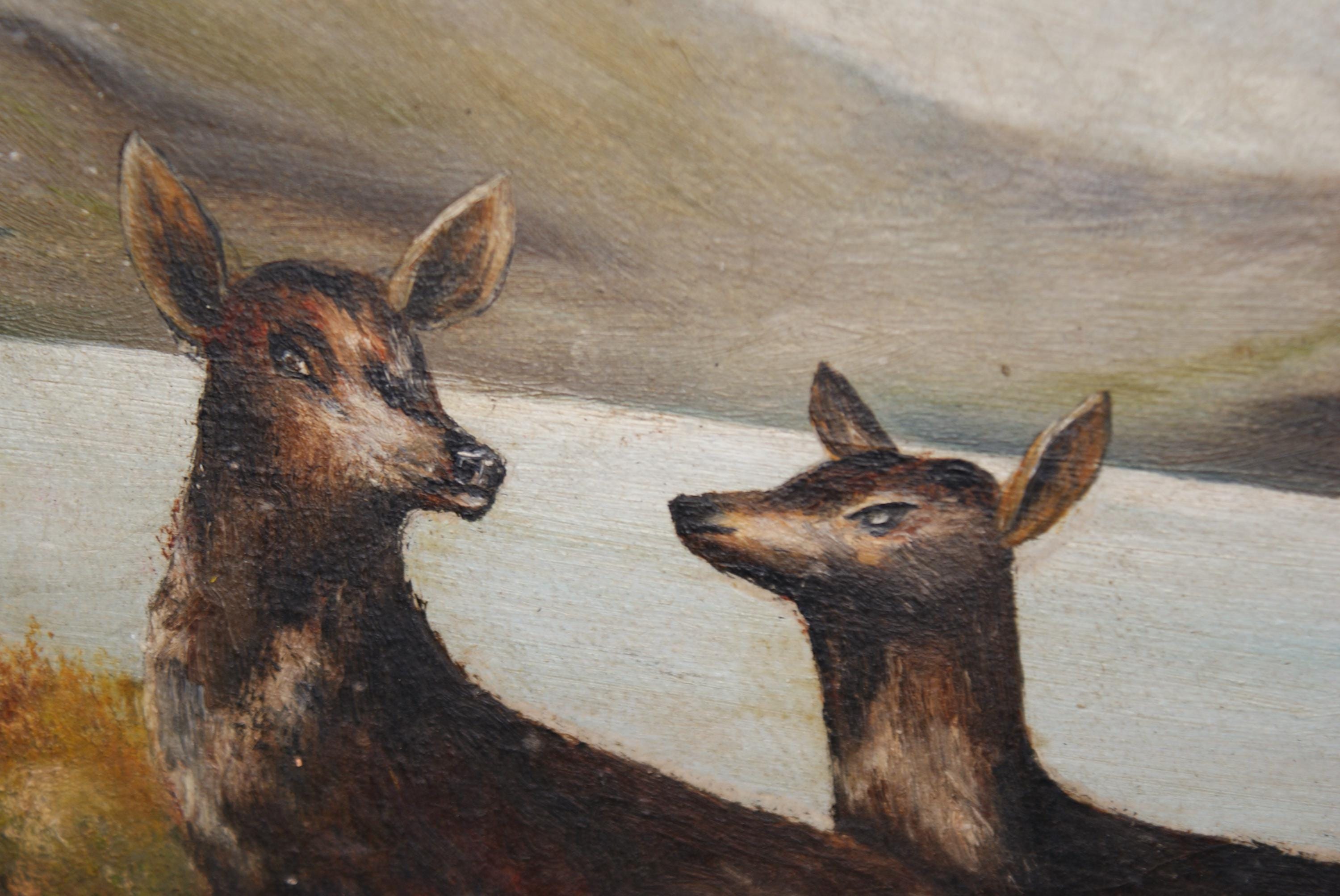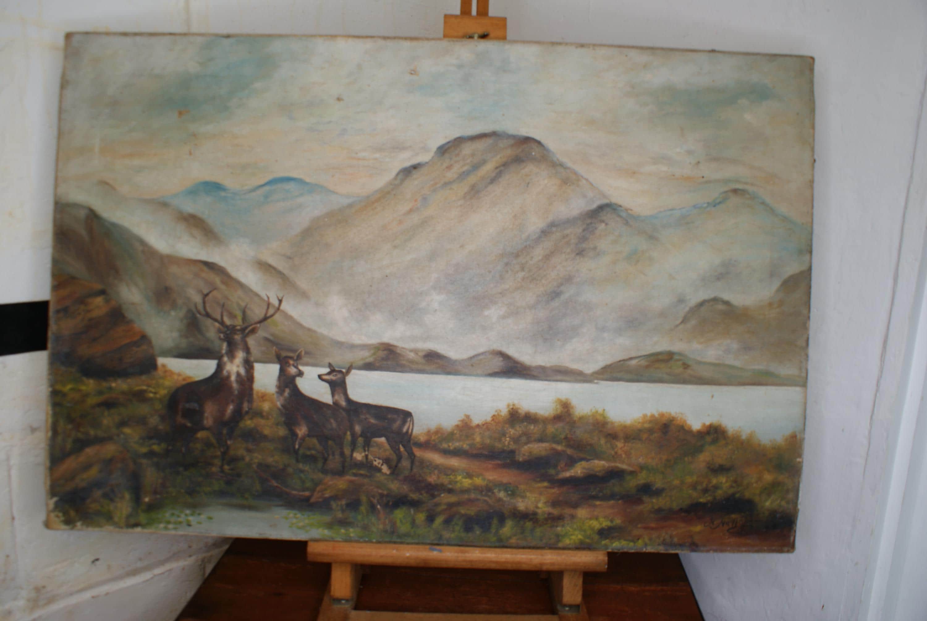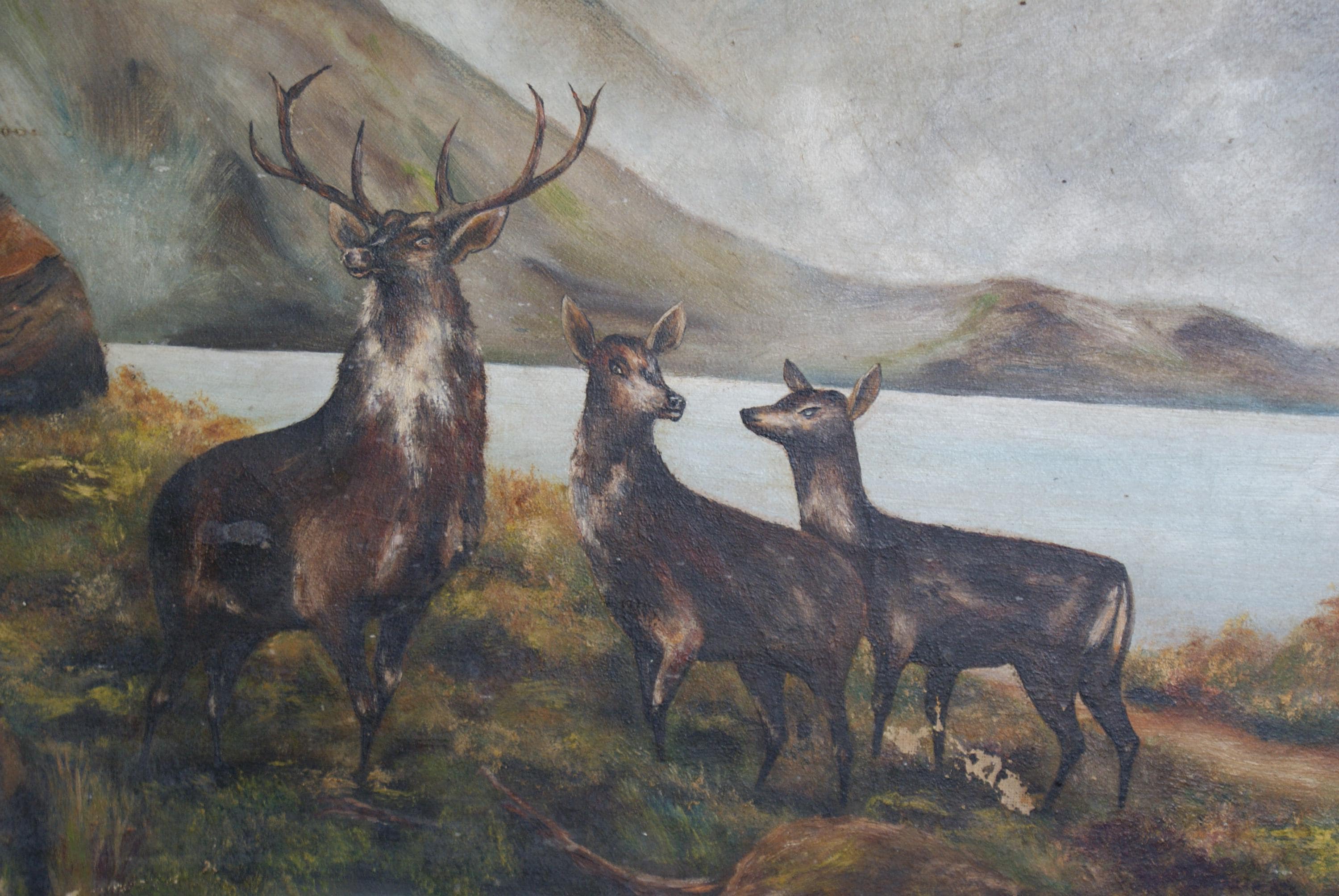 A stunning Scottish highlands scene of three deer including a stag at a loch in the Scottish highlands. A lovely piece with some excellent patina and a light crackling to the oil. Some paint loss and damage to the canvas but in good condition for the age.
