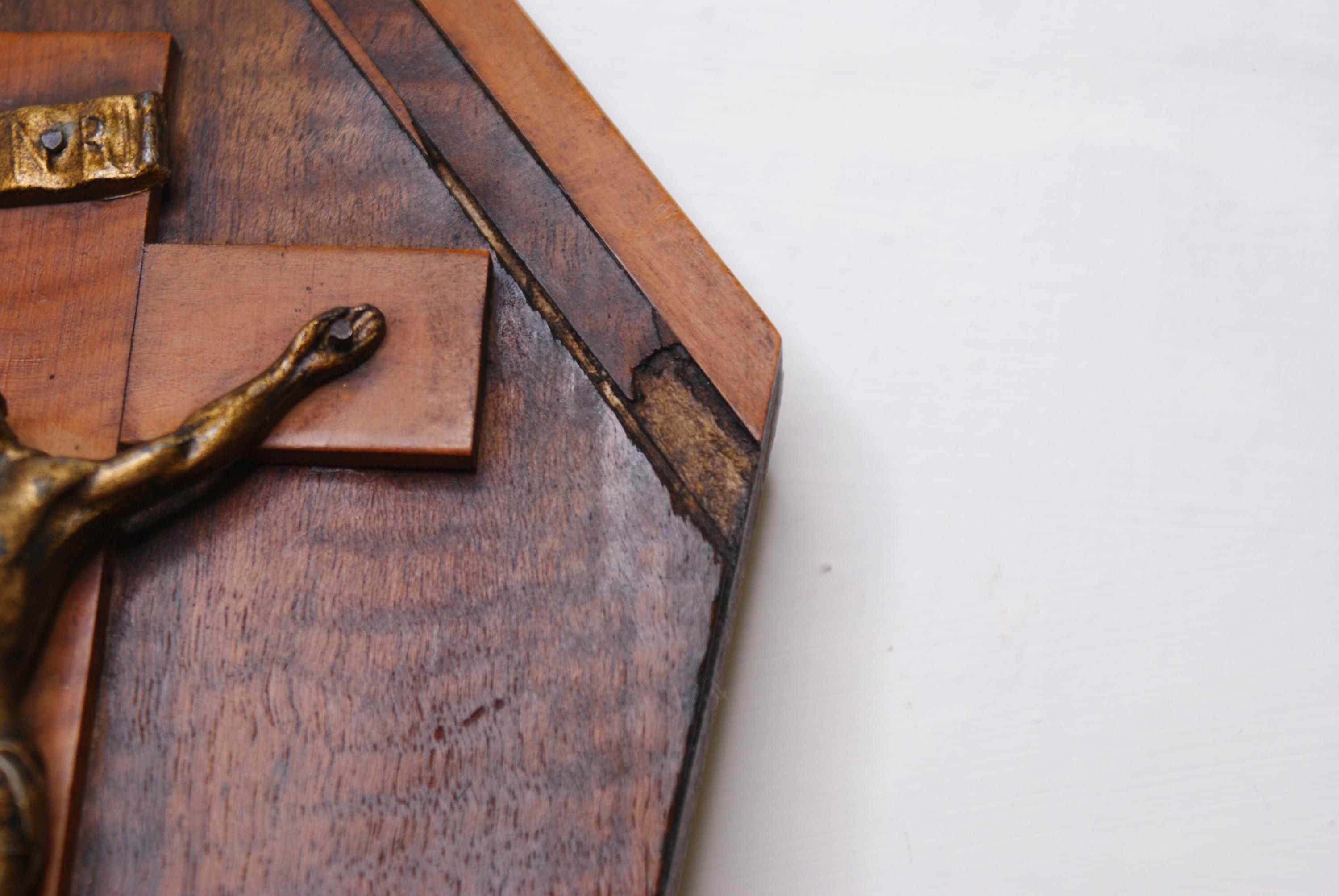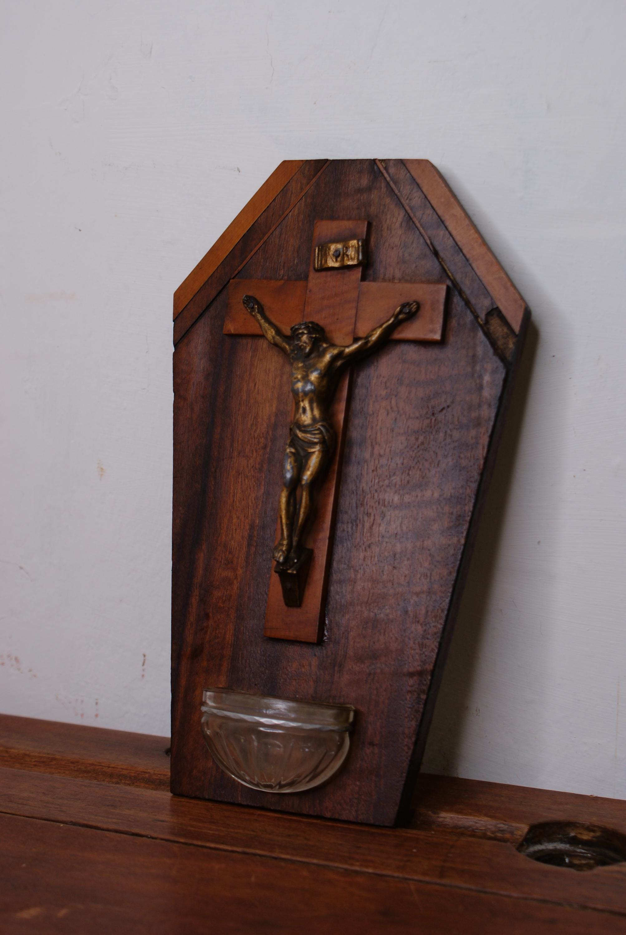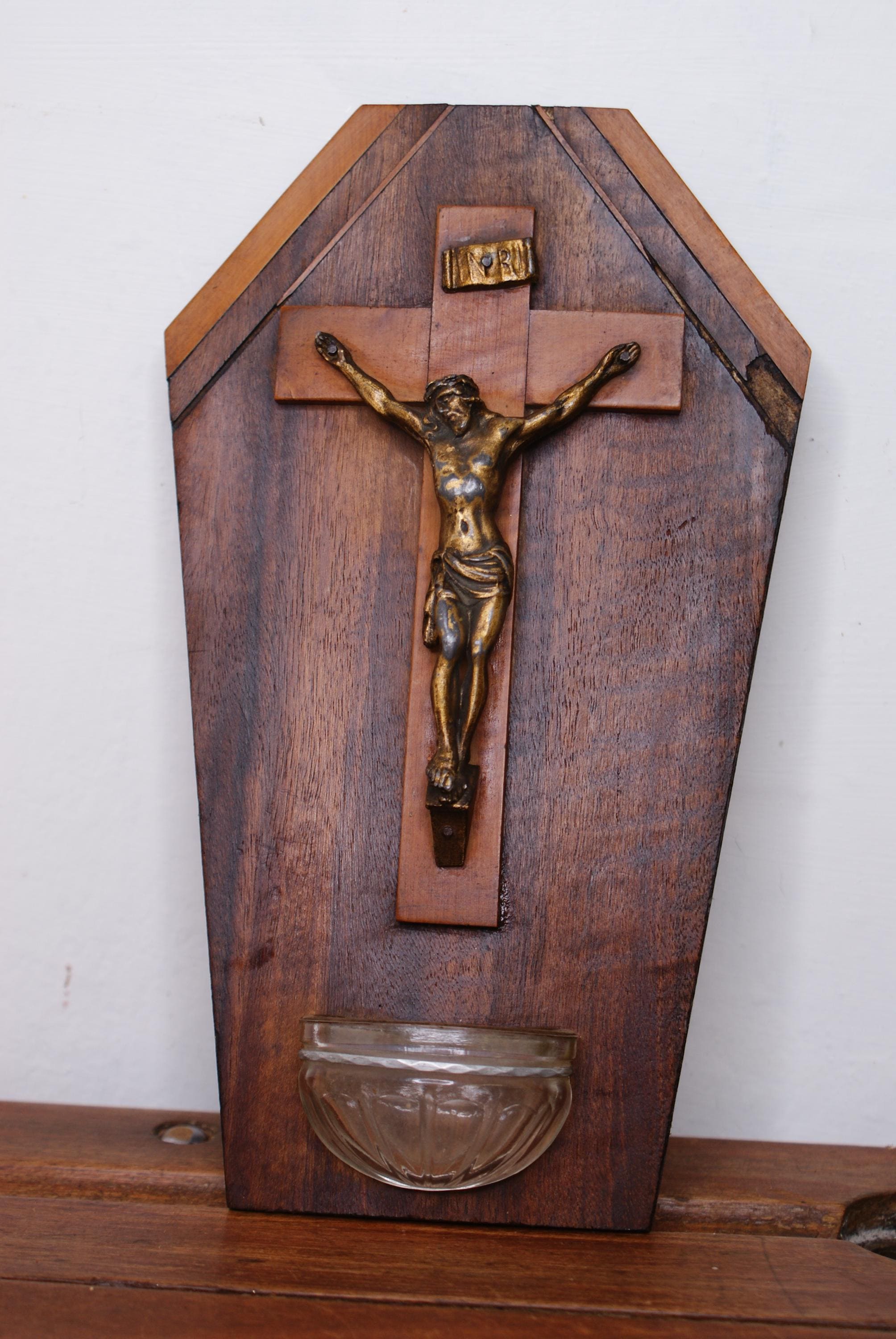 A lovely mid century wall crucifix complete with holy water font, A lovely piece of religious wall décor featuring a brass corpus Christi and a glass font. in good condition with one small chip to the front.
