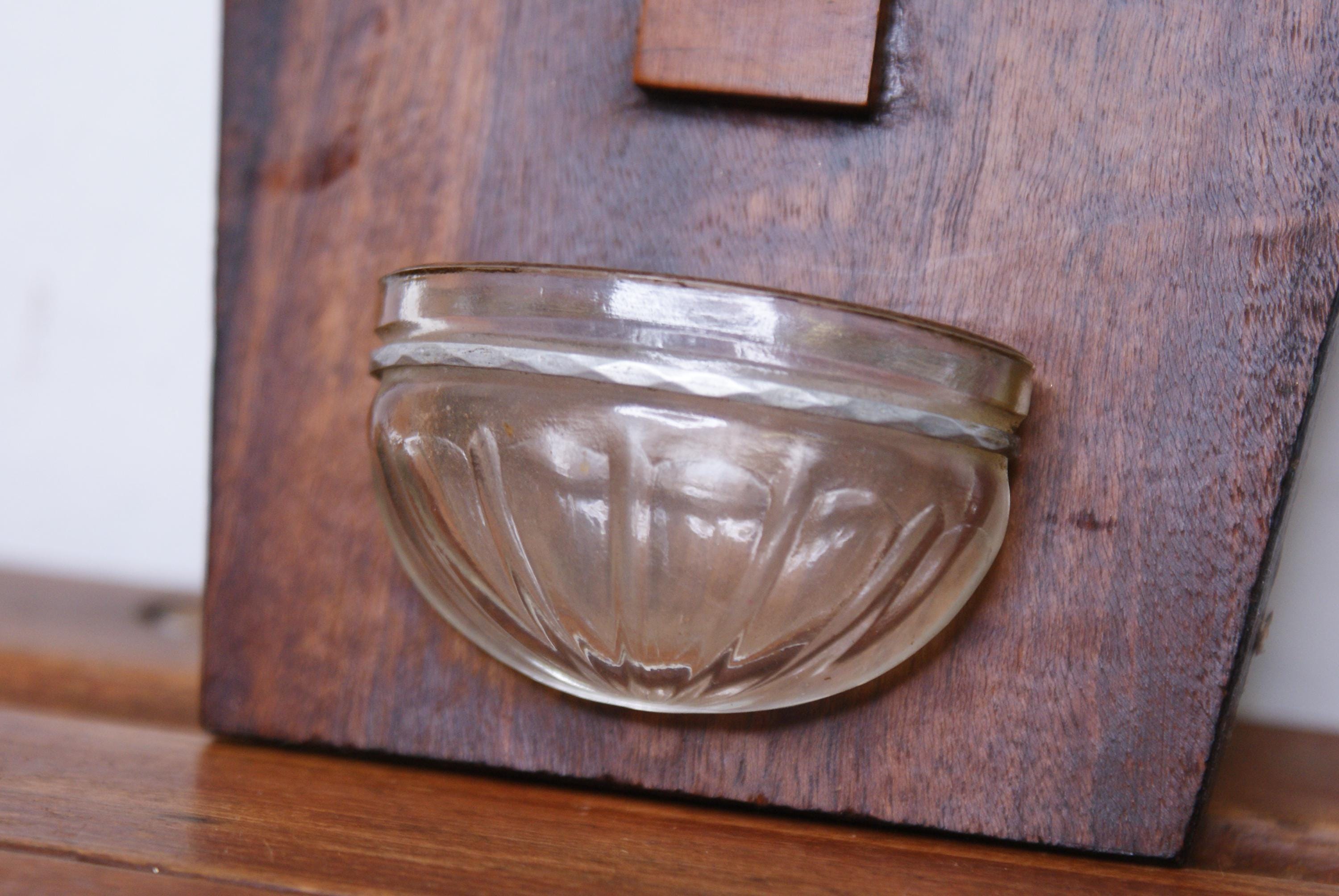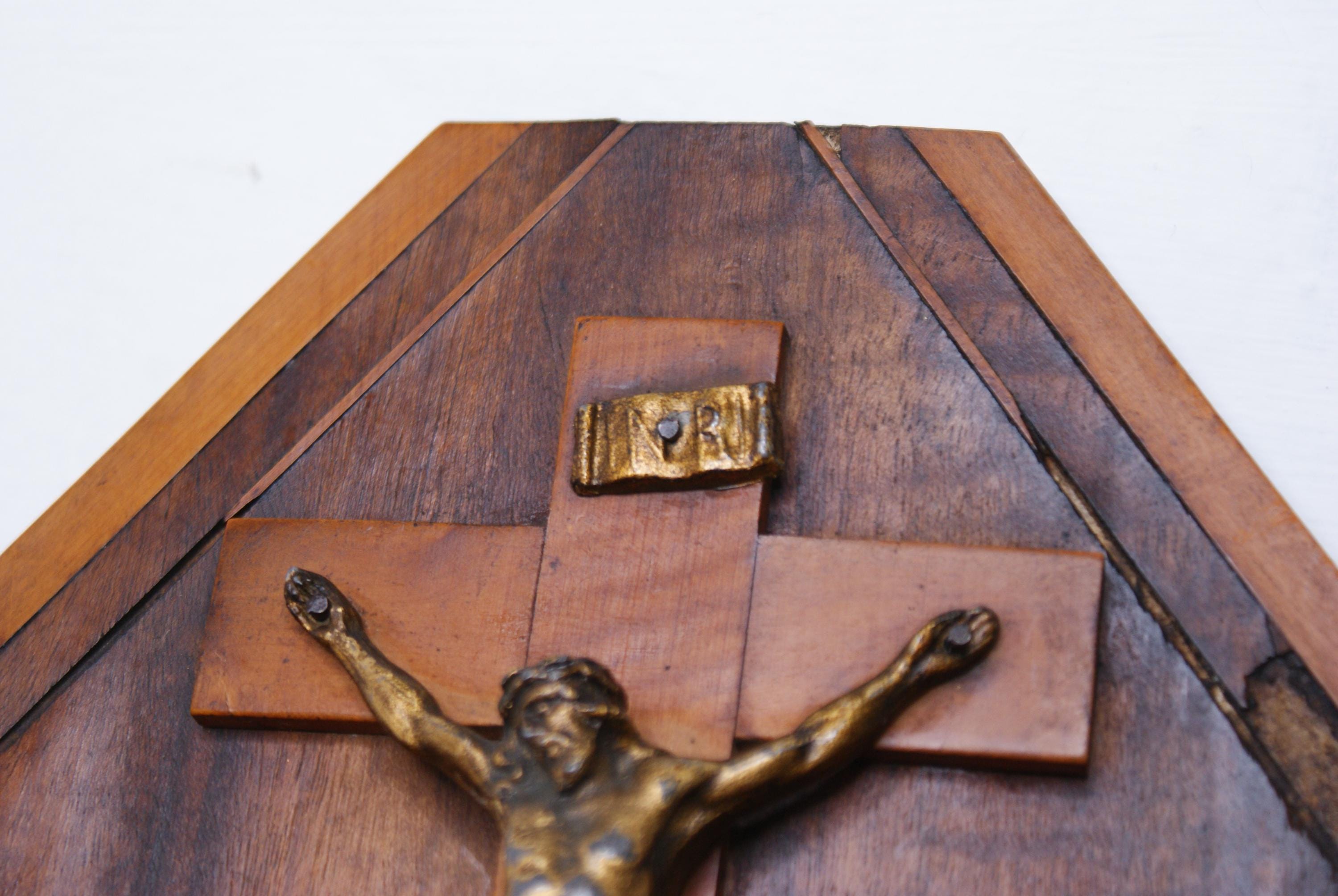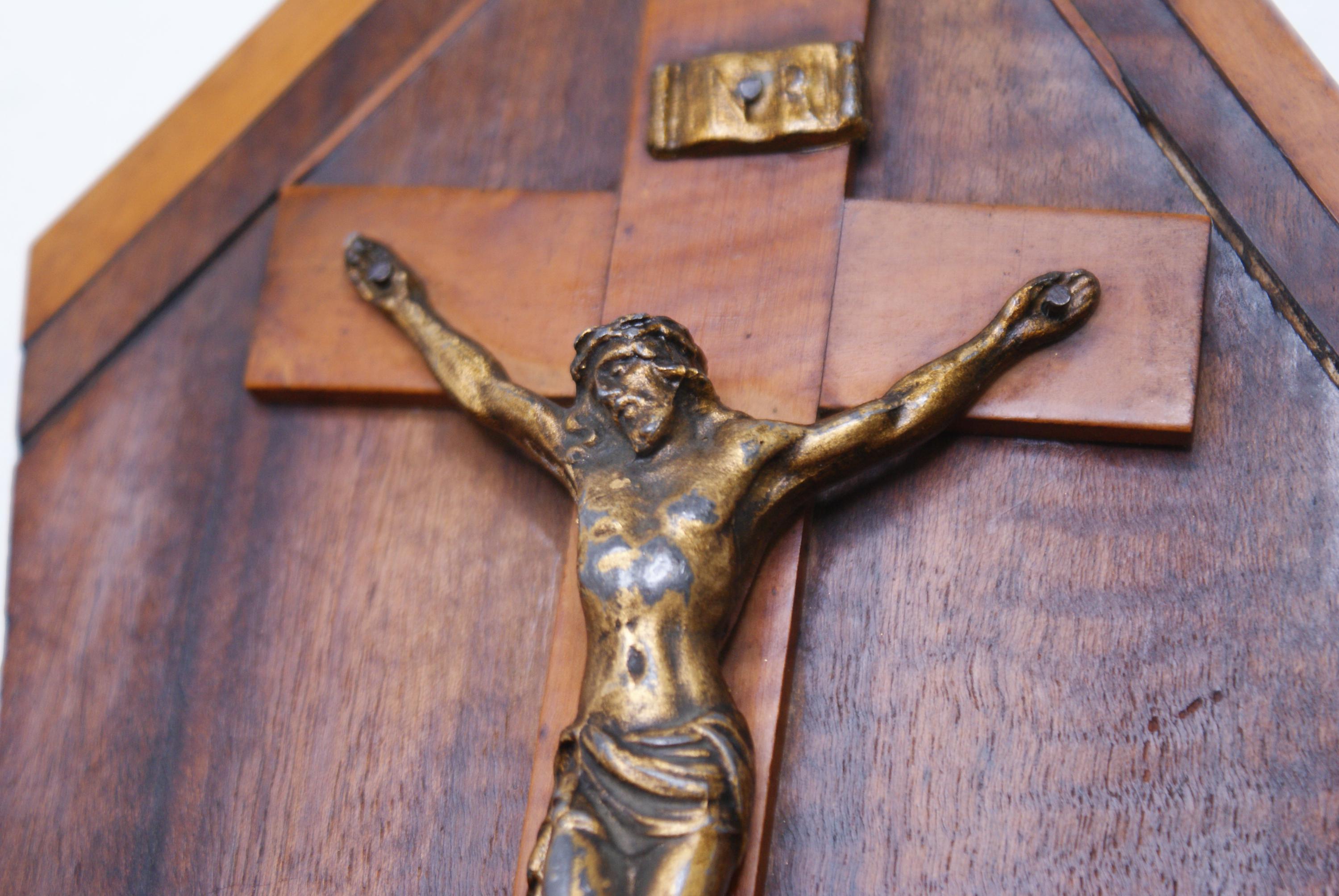 A lovely mid century wall crucifix complete with holy water font, A lovely piece of religious wall décor featuring a brass corpus Christi and a glass font. in good condition with one small chip to the front.