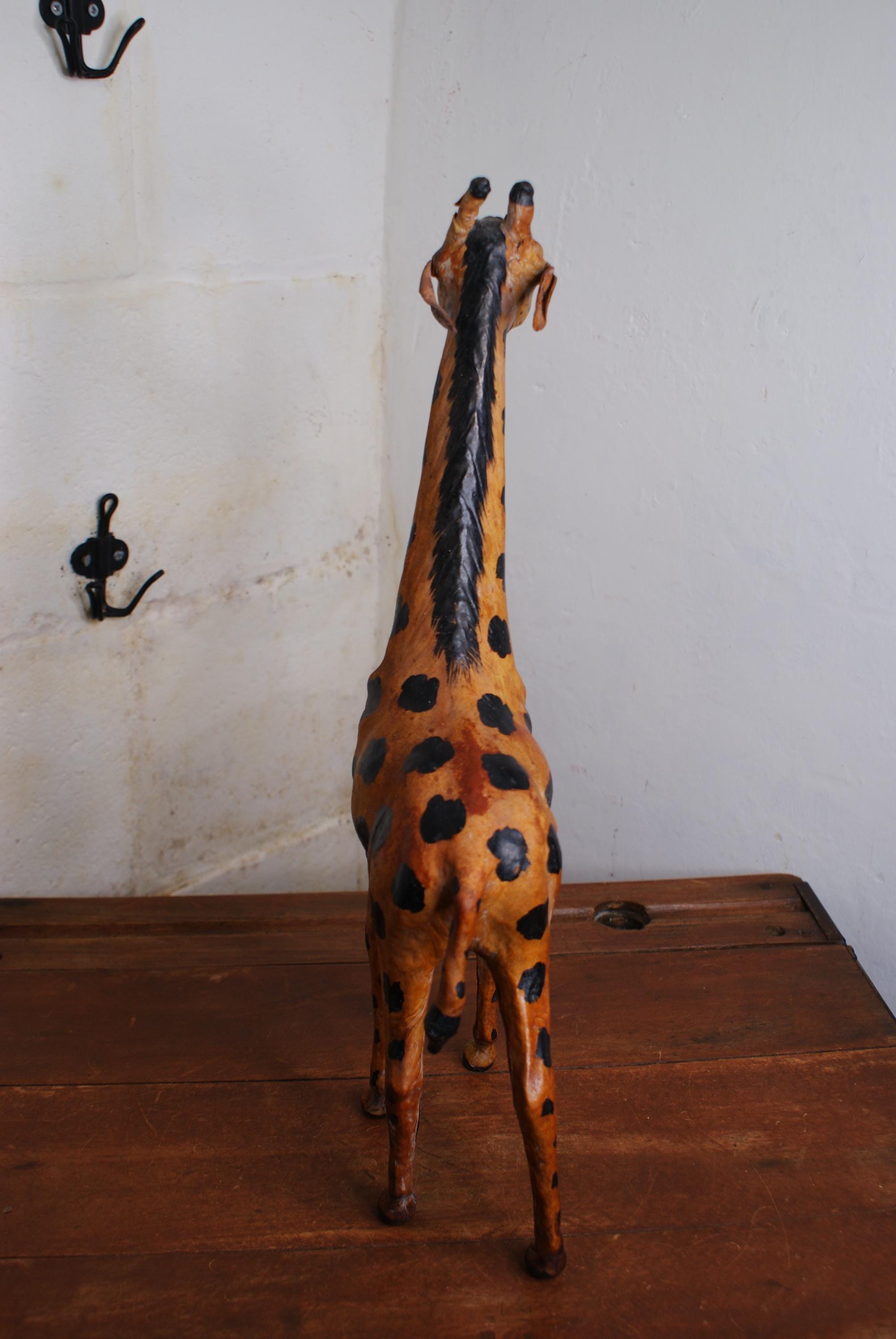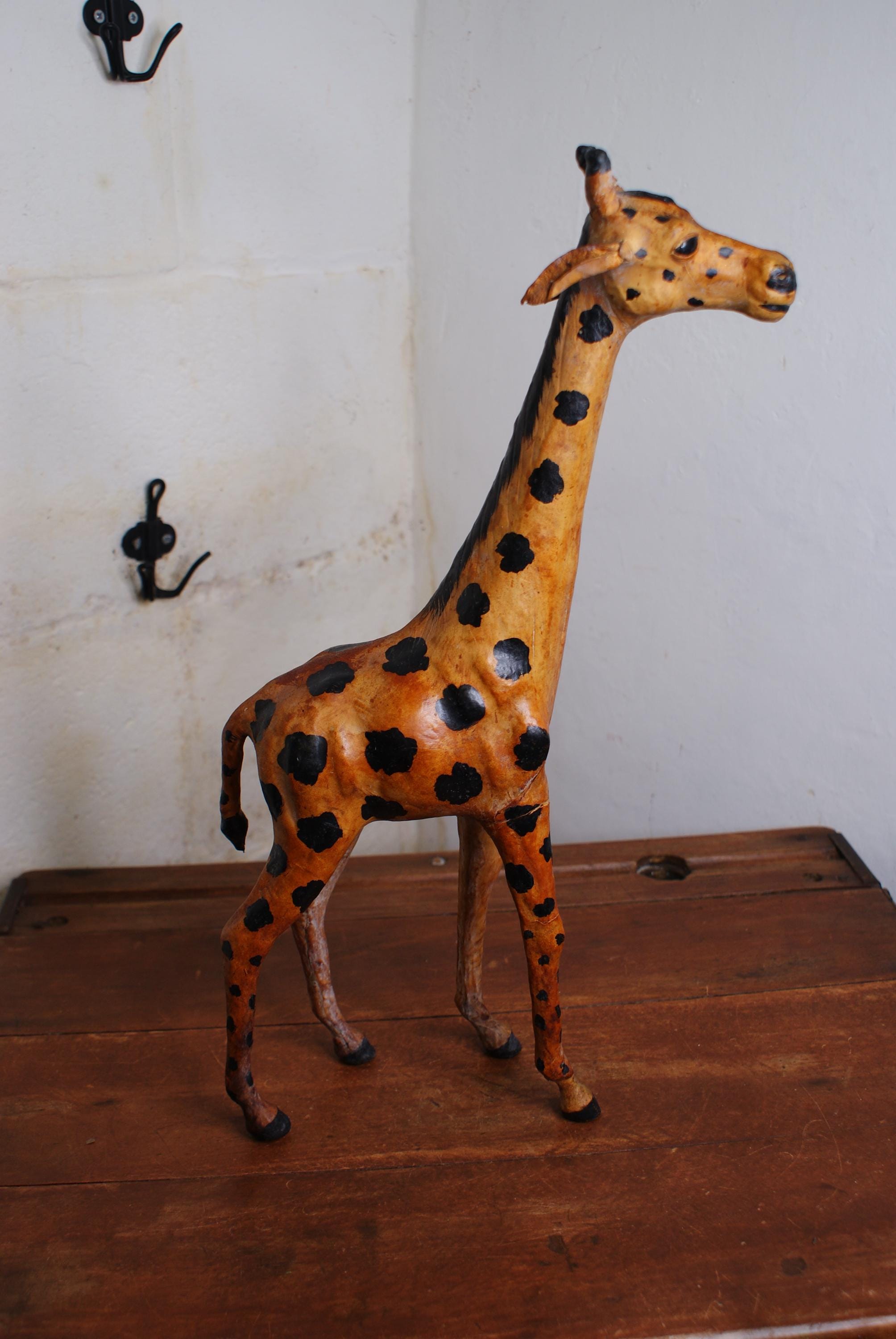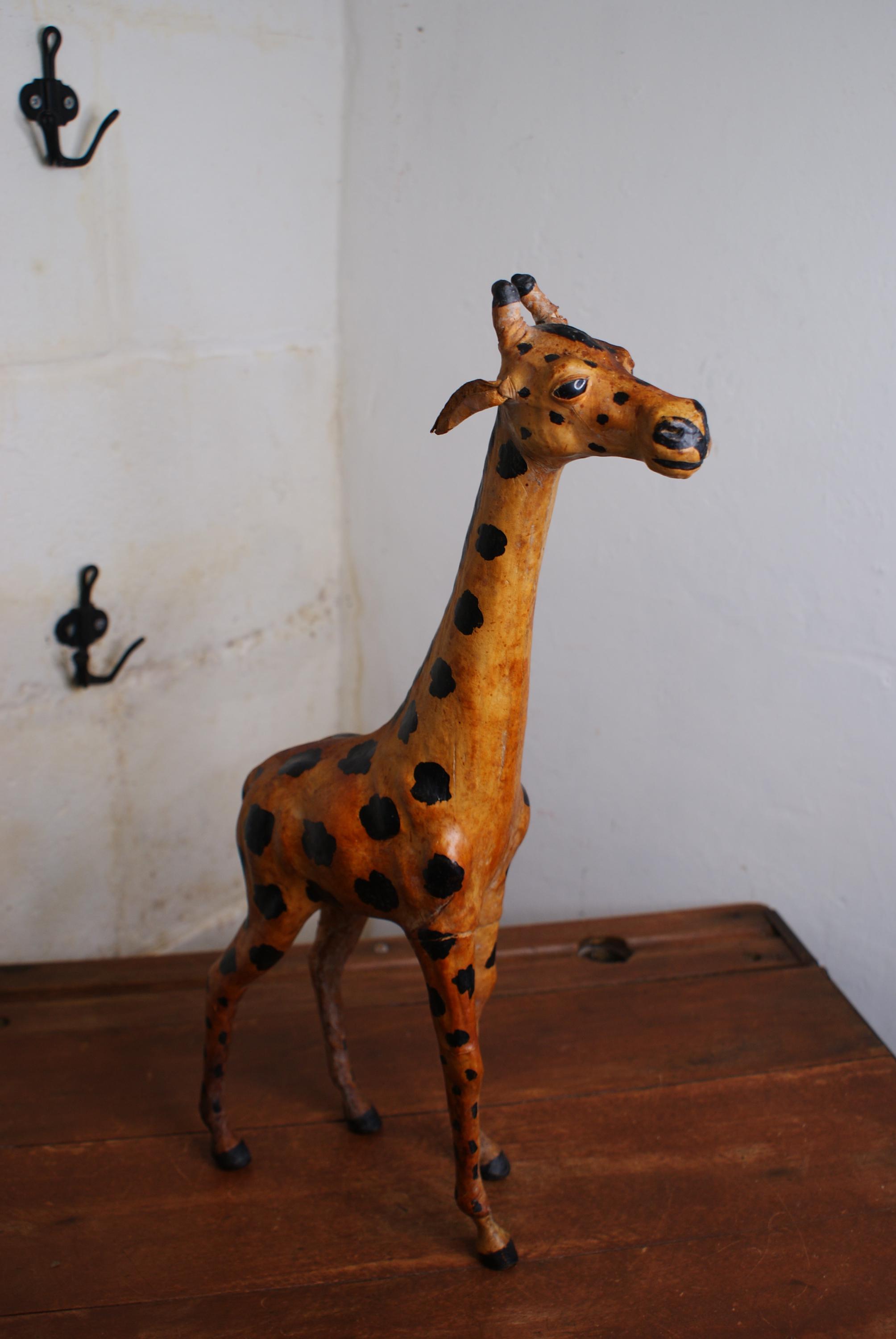 A fantastic Liberty of London style leather giraffe, this is a charming piece made from papier mache and covered in leather and finished with a hand painted design and glass eyes. In good condition with both ears in tact. some slight damage to one the ossicones.
