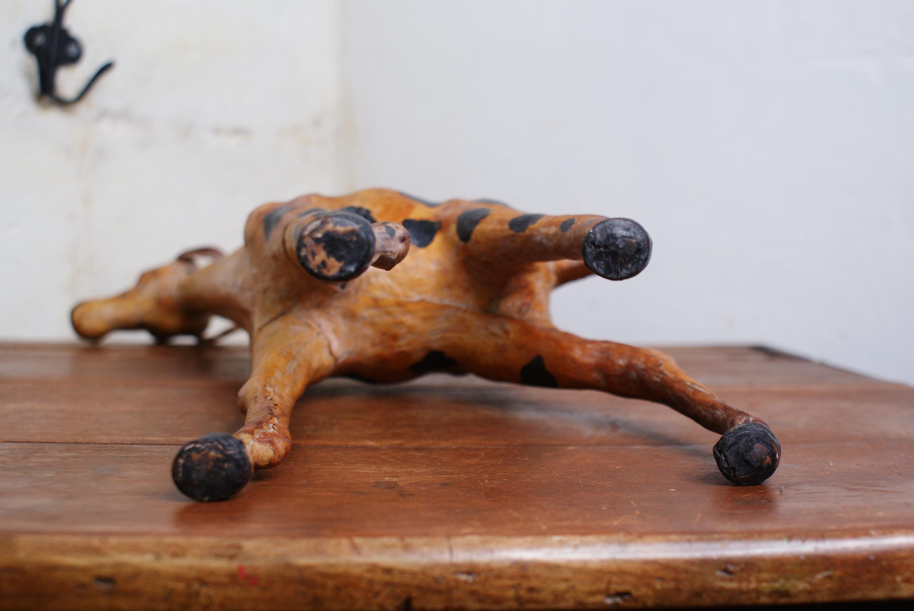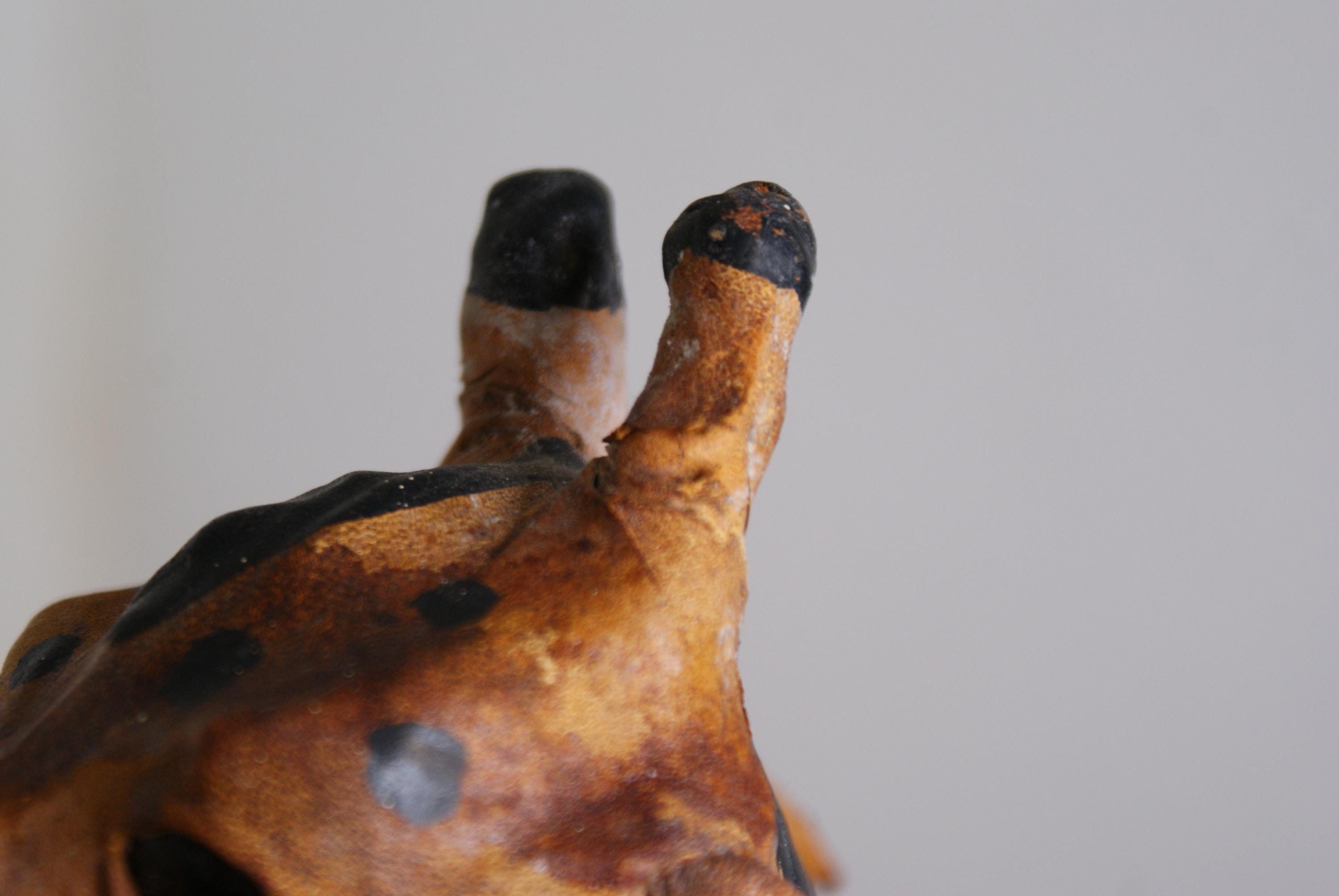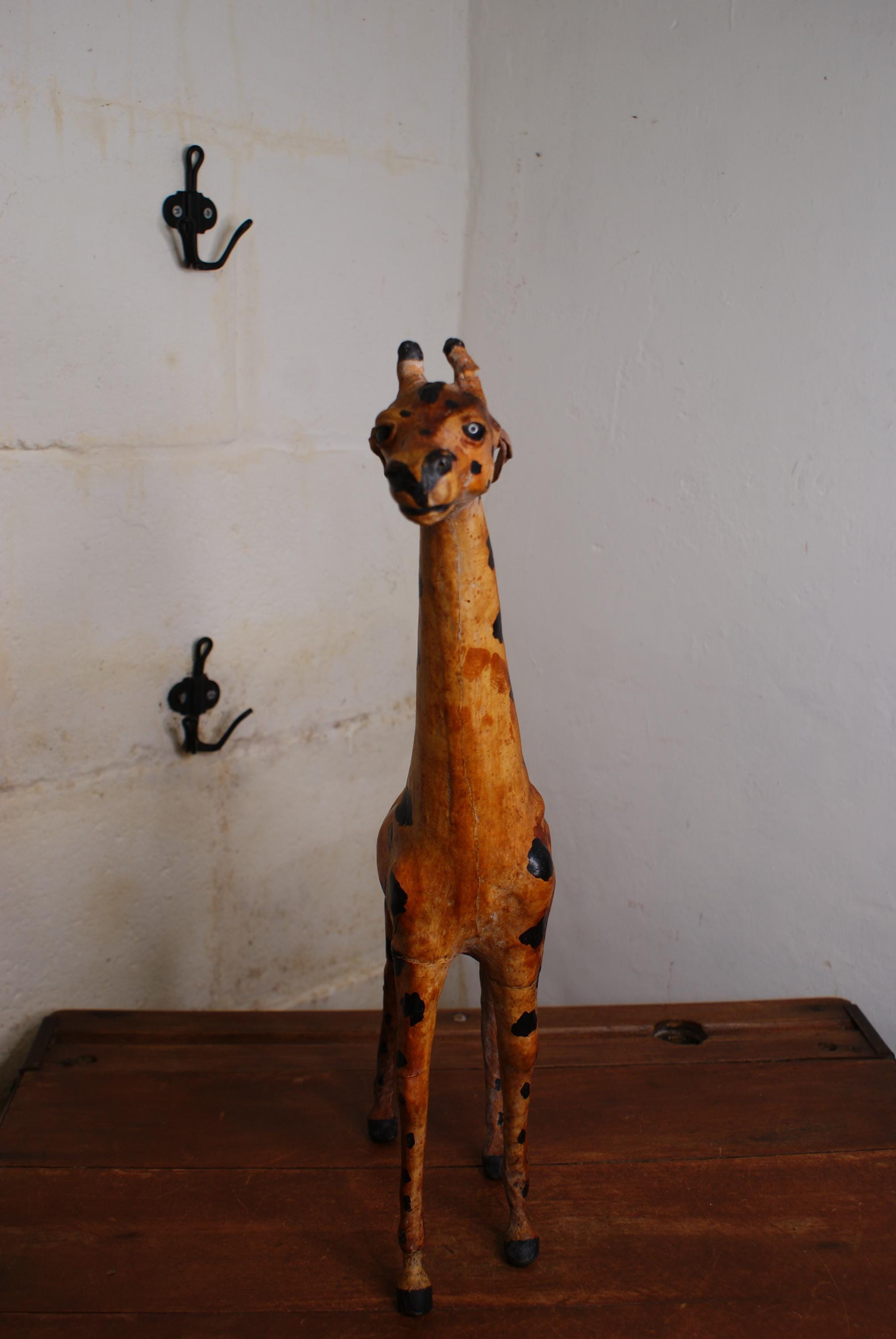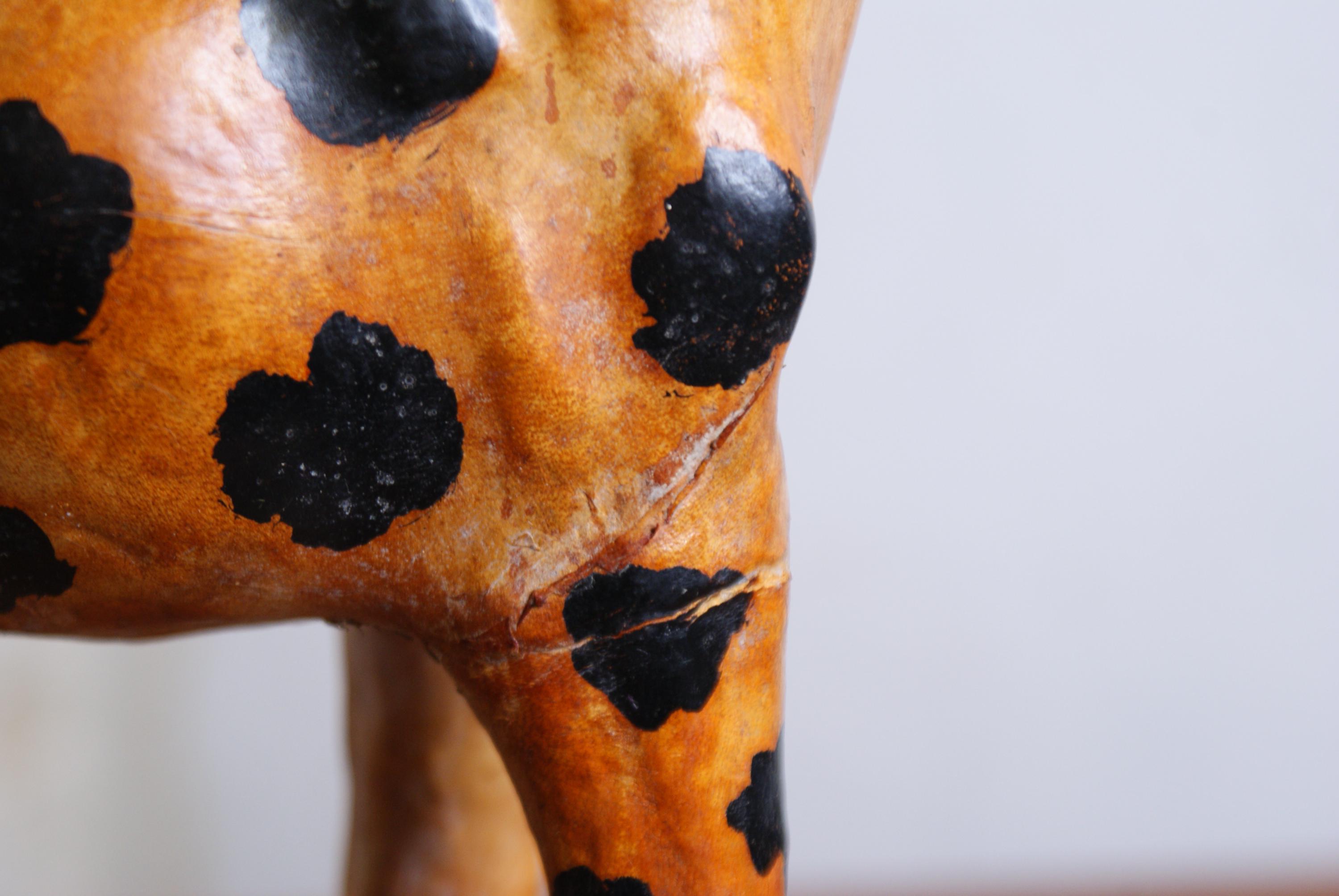 A fantastic Liberty of London style leather giraffe, this is a charming piece made from papier mache and covered in leather and finished with a hand painted design and glass eyes. In good condition with both ears in tact. some slight damage to one the ossicones.