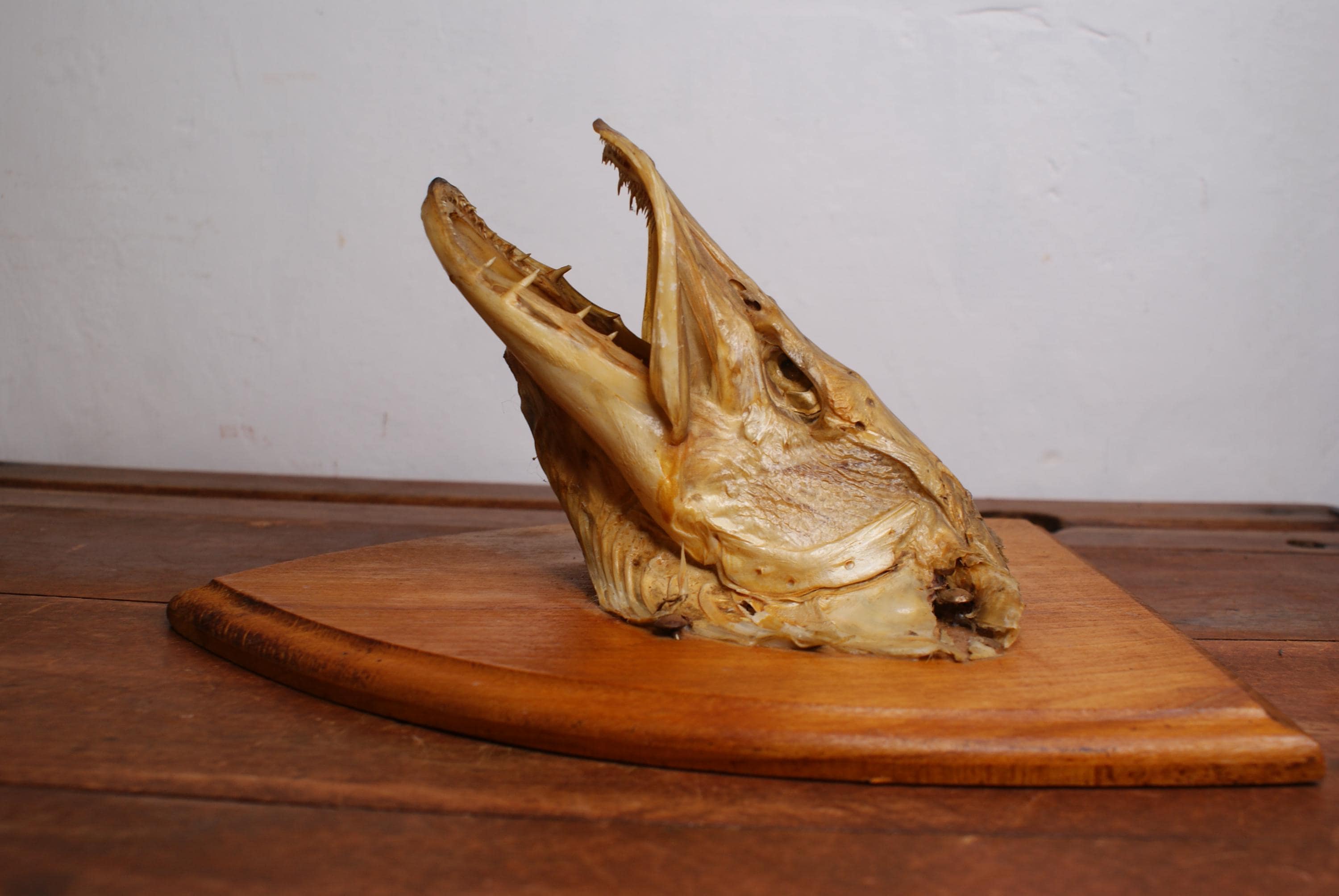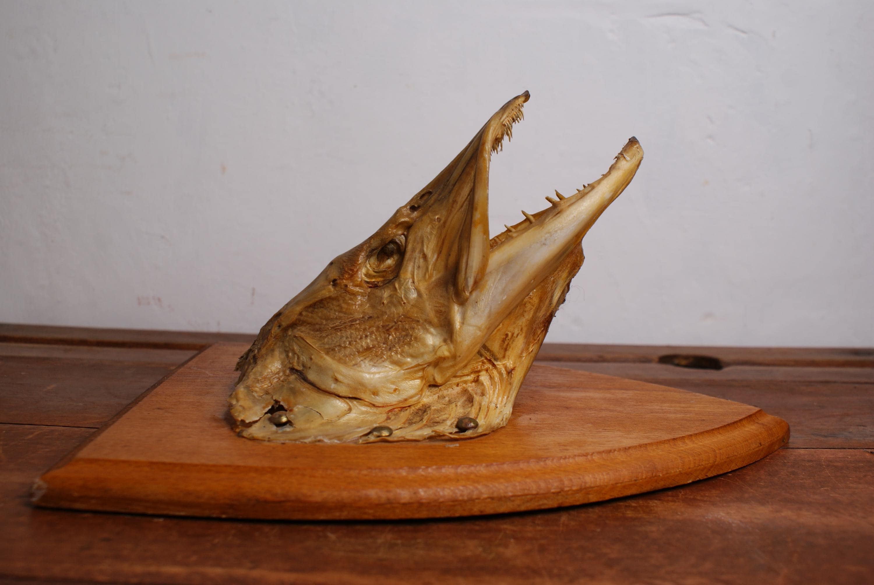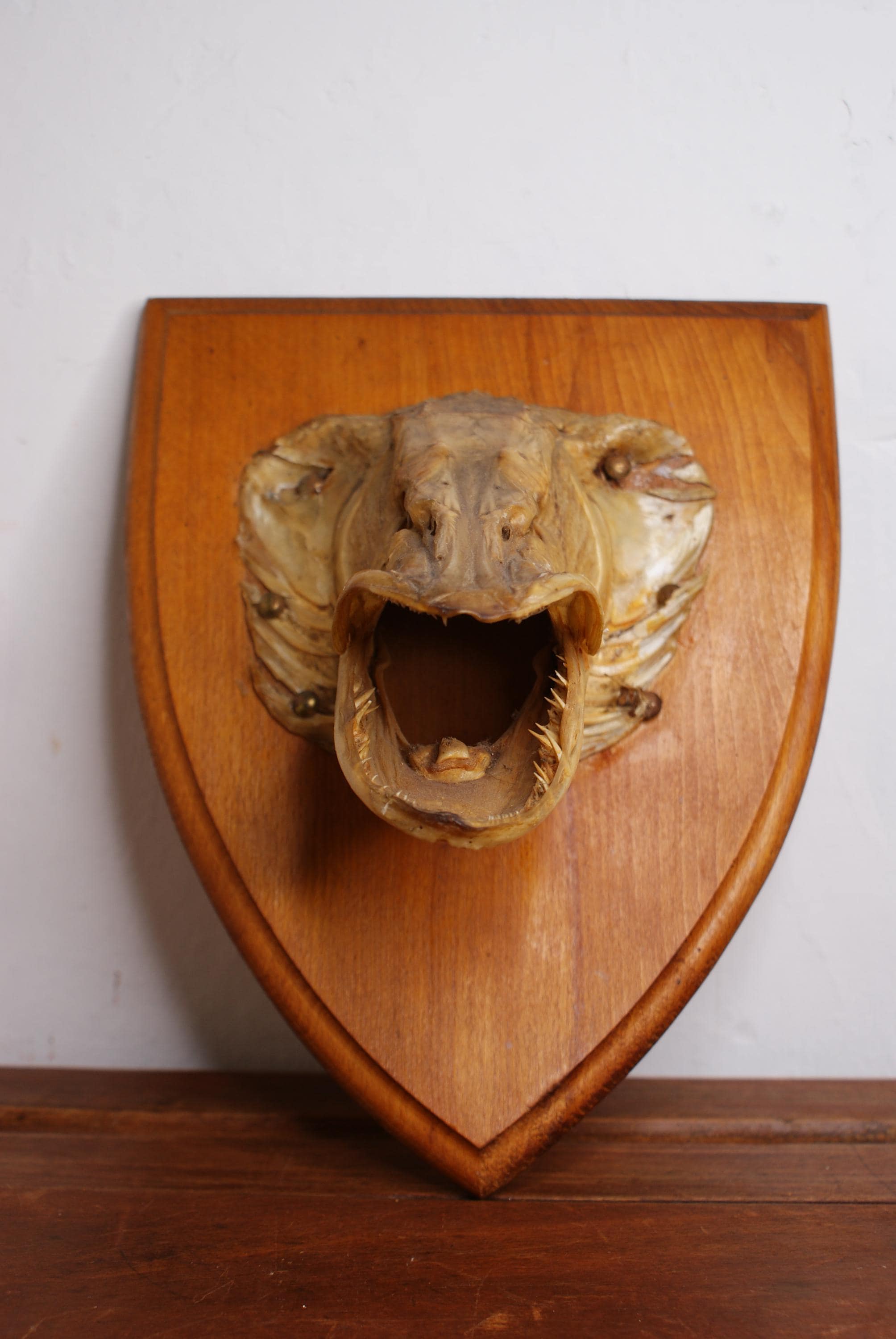 A fantastic taxidermy head mount of a pike, in good condition with only some slight damage to one side as pictured but still well mounted and stable. This would be an excellent piece of décor for a collector of curios or a fishing enthusiast. I cant quite make out the writing on the back but I would imagine it is a location from where this was caught but it is dated 1964