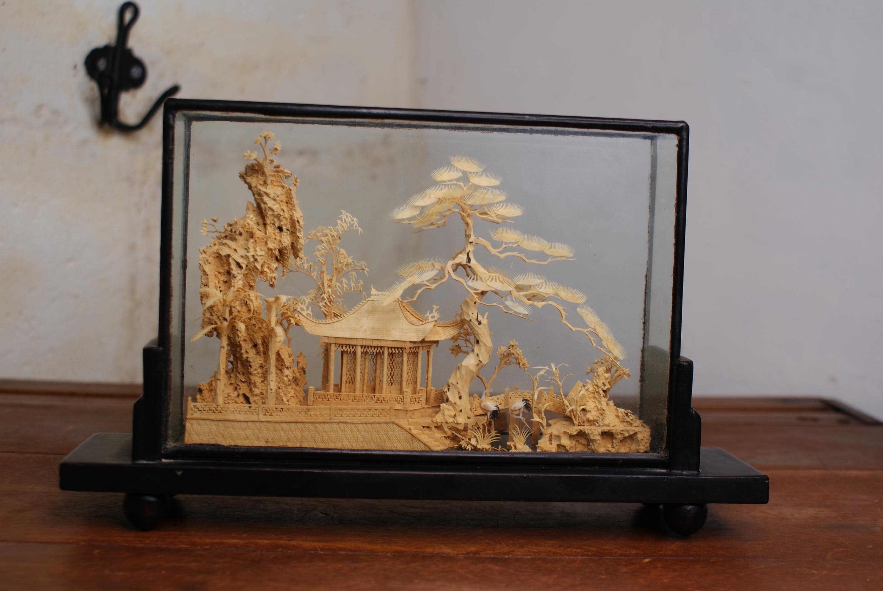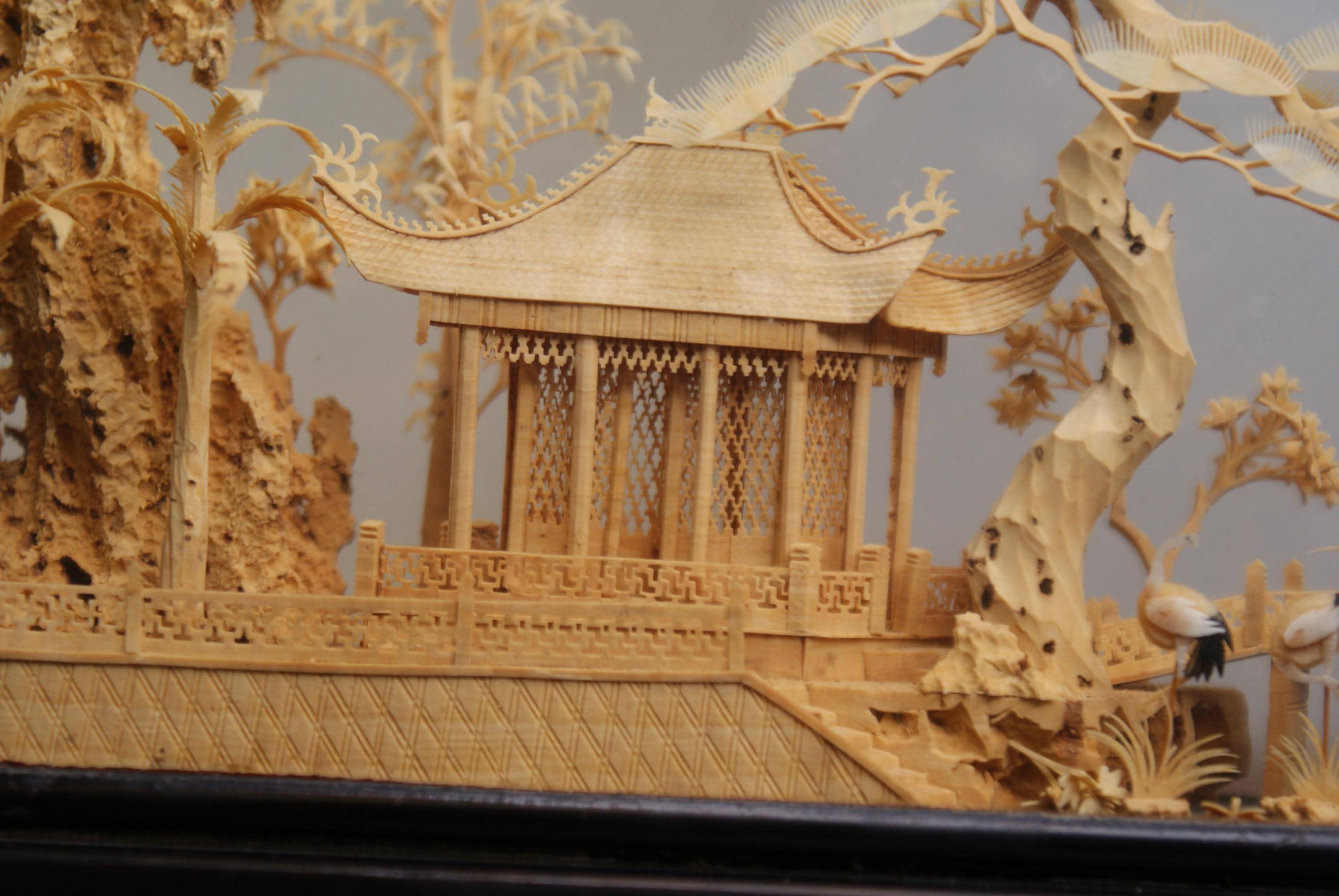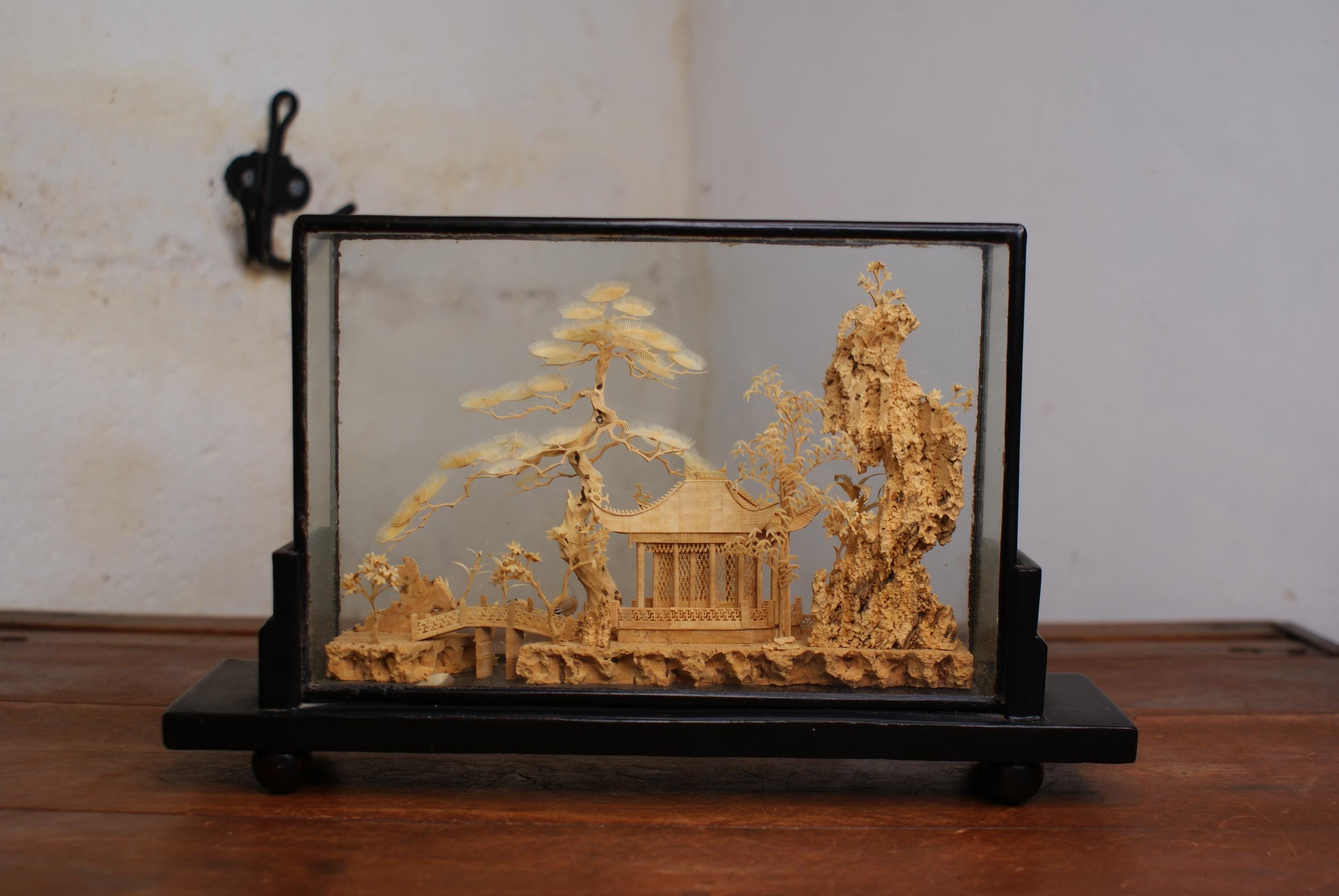 A superb cork diorama, hand carved with intricate details this is a fantastic looking piece of expert craftsmanship. The base is lacquered wood.
