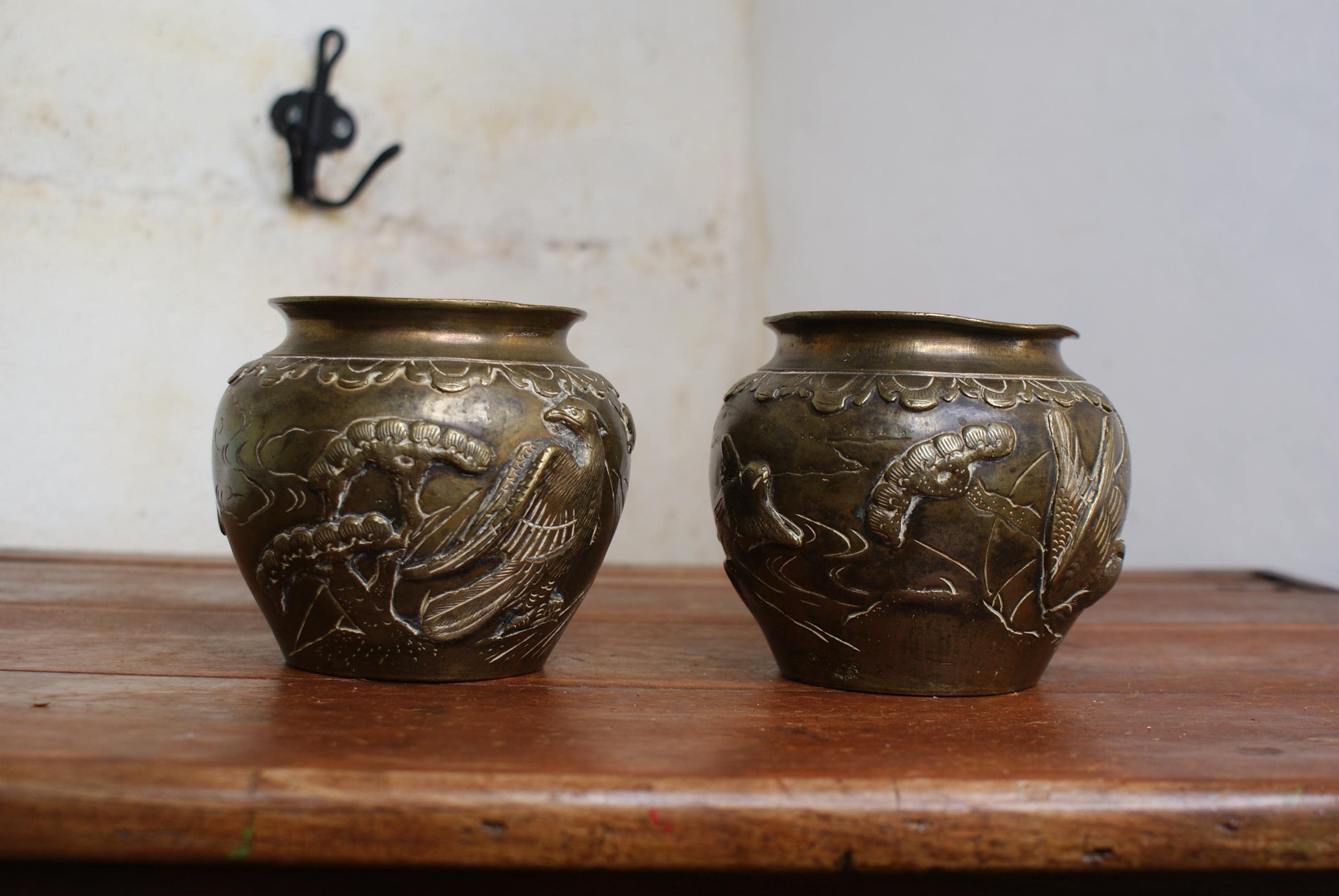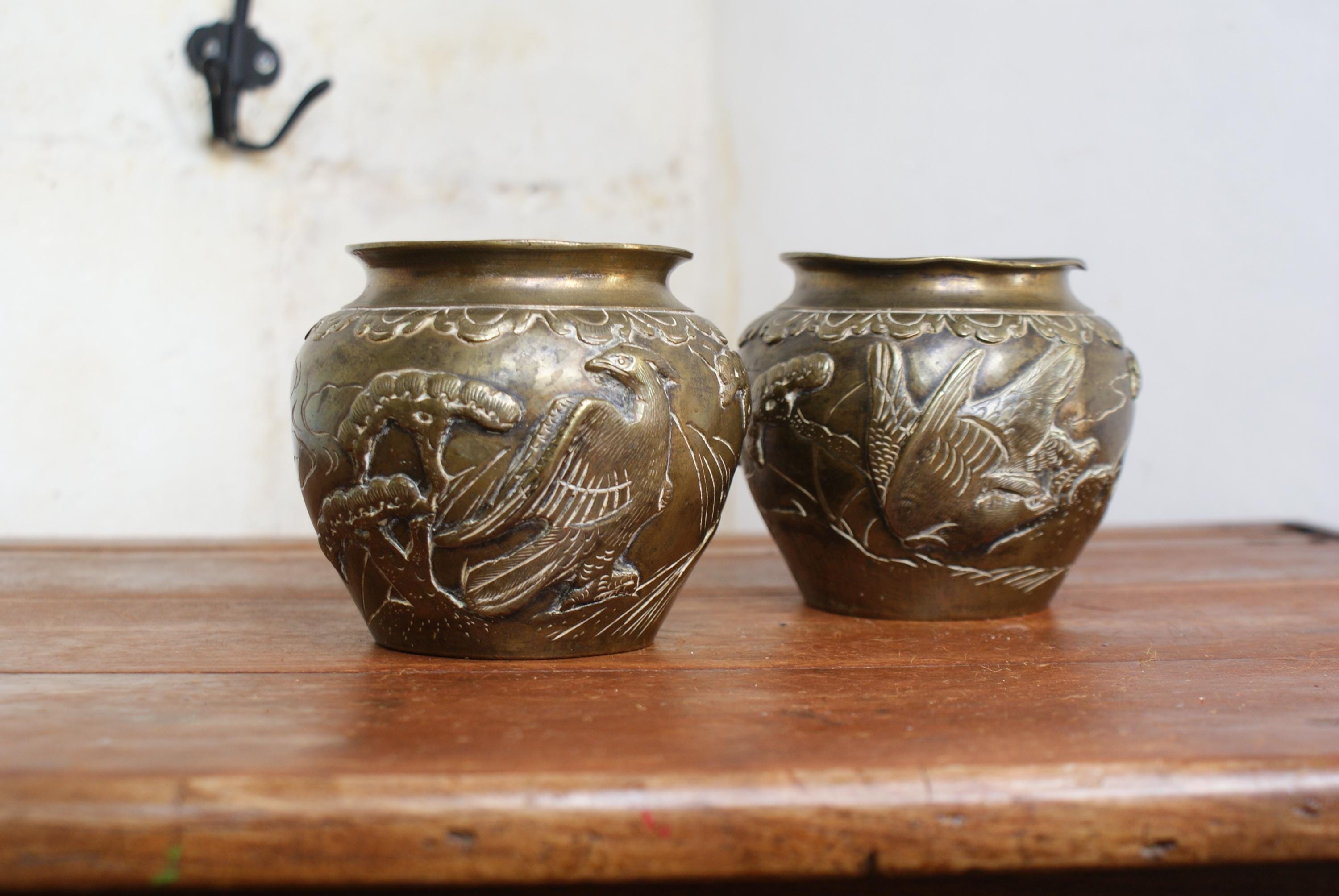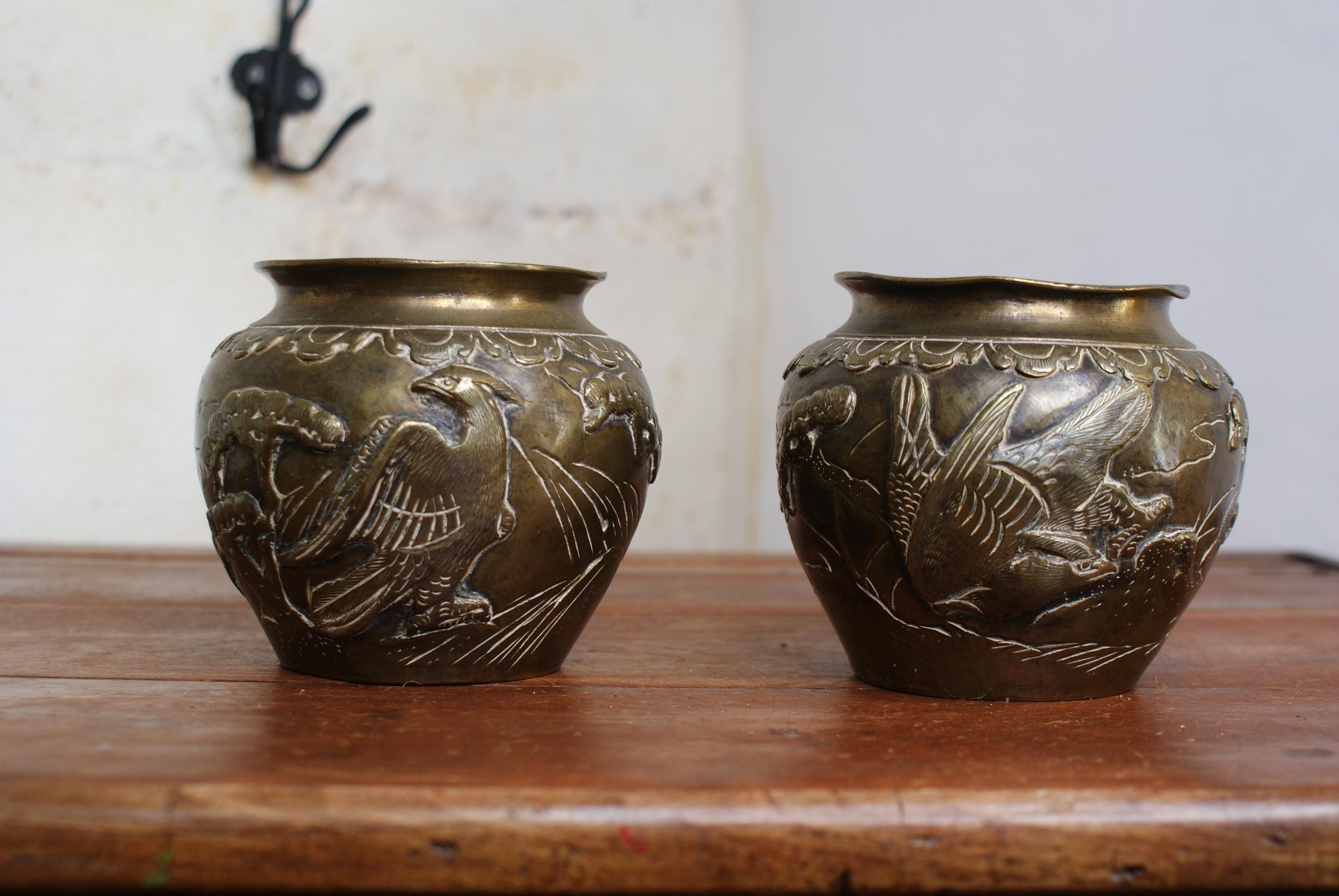 A stunning pair of 19th century Japanese bronze vases. Both have fantastic decorative elements including a Phoenix, birds trees and a mountain possibly mount Fuji. these were originally used as hibachi (fire bowl) for making tea. in a good condition with obvious signs of ware from decades of use including some dents. Price is for the pair.