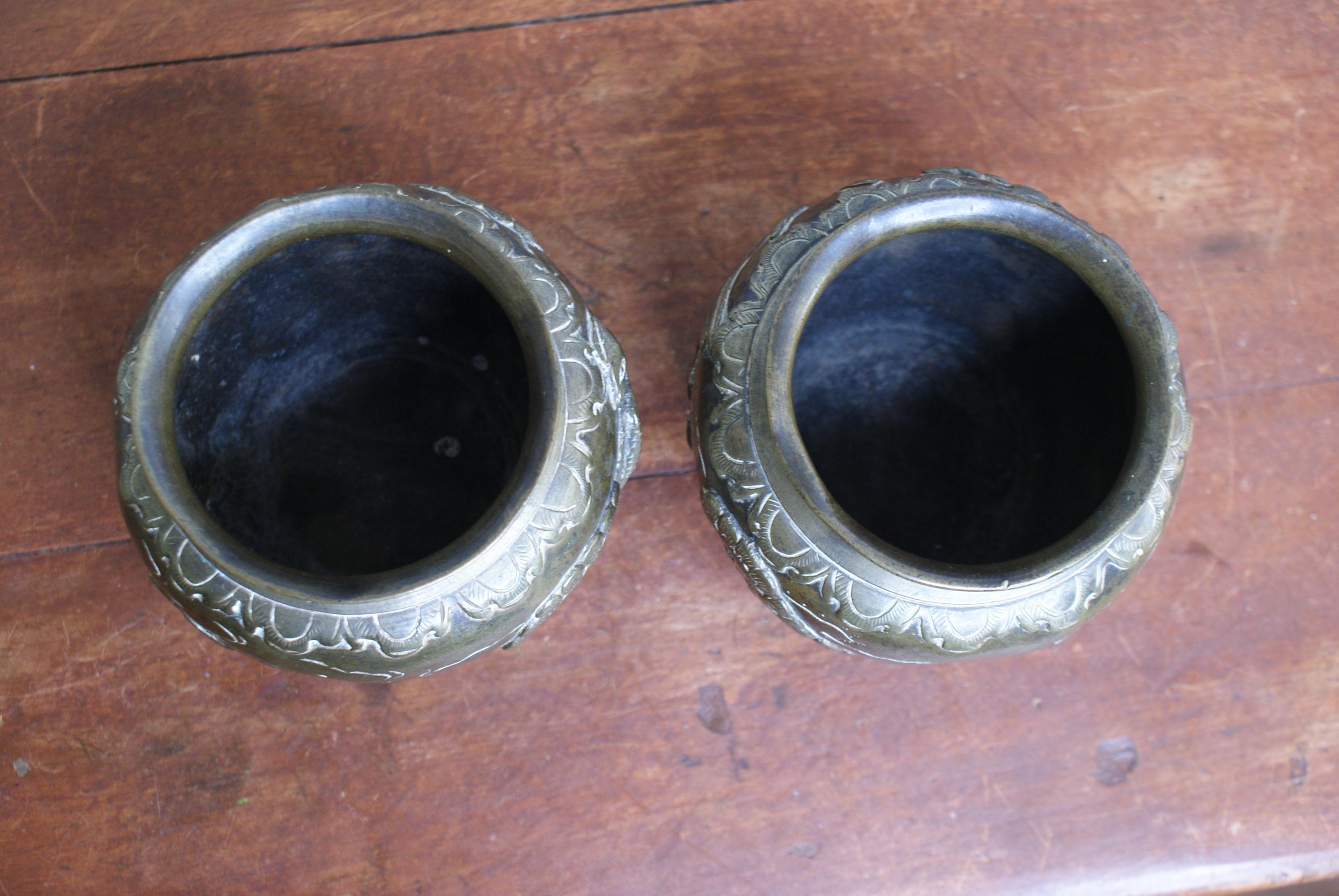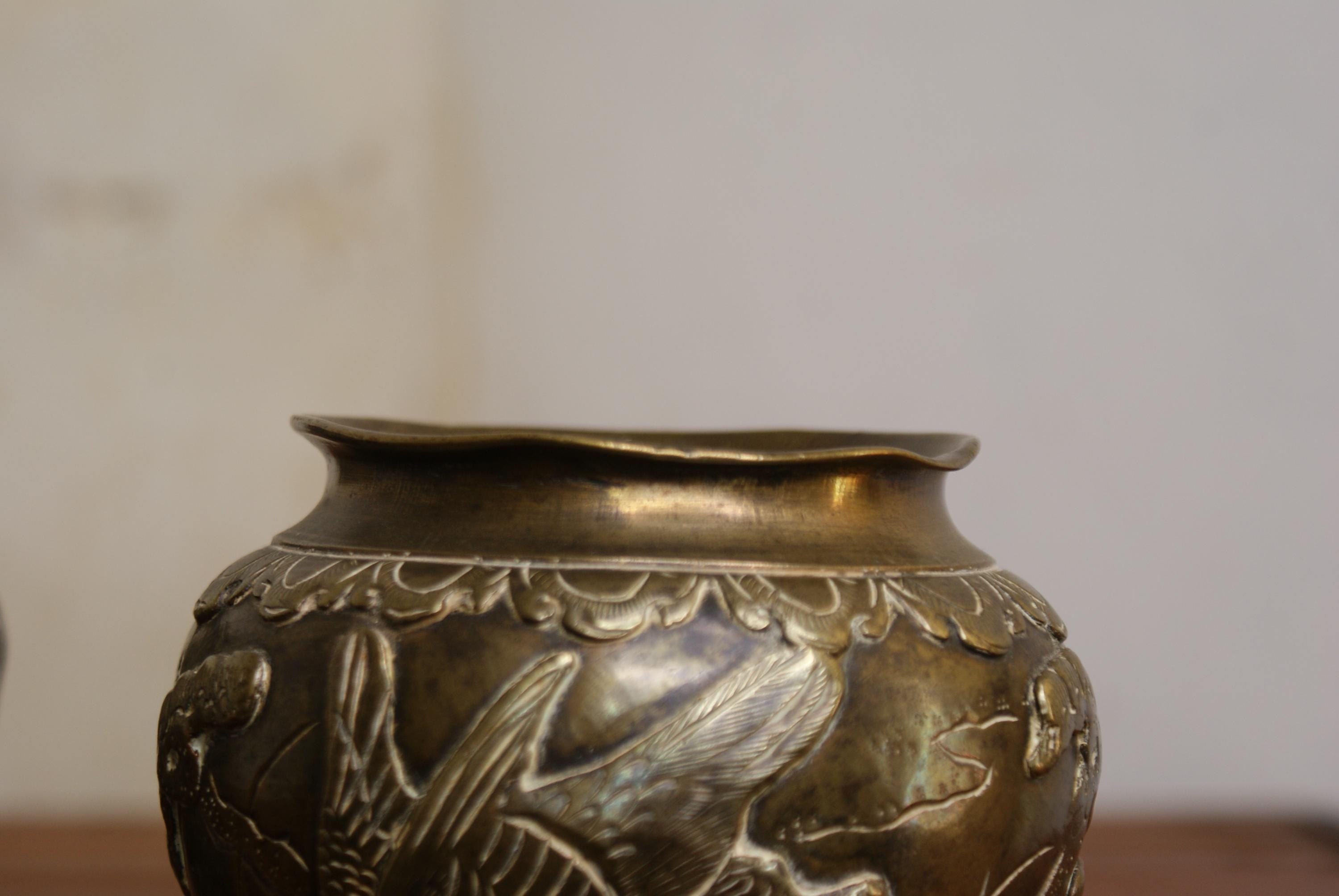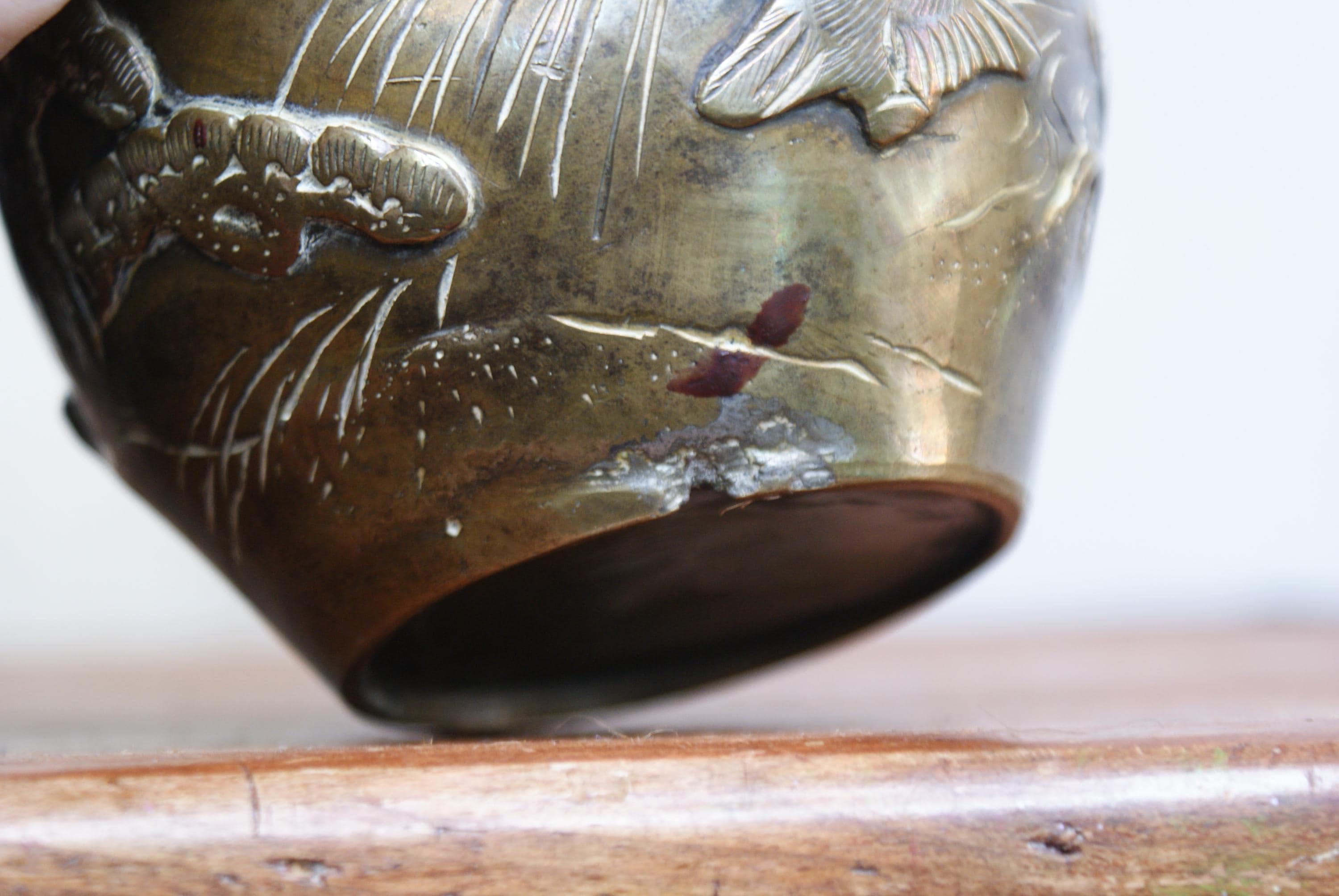 A stunning pair of 19th century Japanese bronze vases. Both have fantastic decorative elements including a Phoenix, birds trees and a mountain possibly mount Fuji. these were originally used as hibachi (fire bowl) for making tea. in a good condition with obvious signs of ware from decades of use including some dents. Price is for the pair.