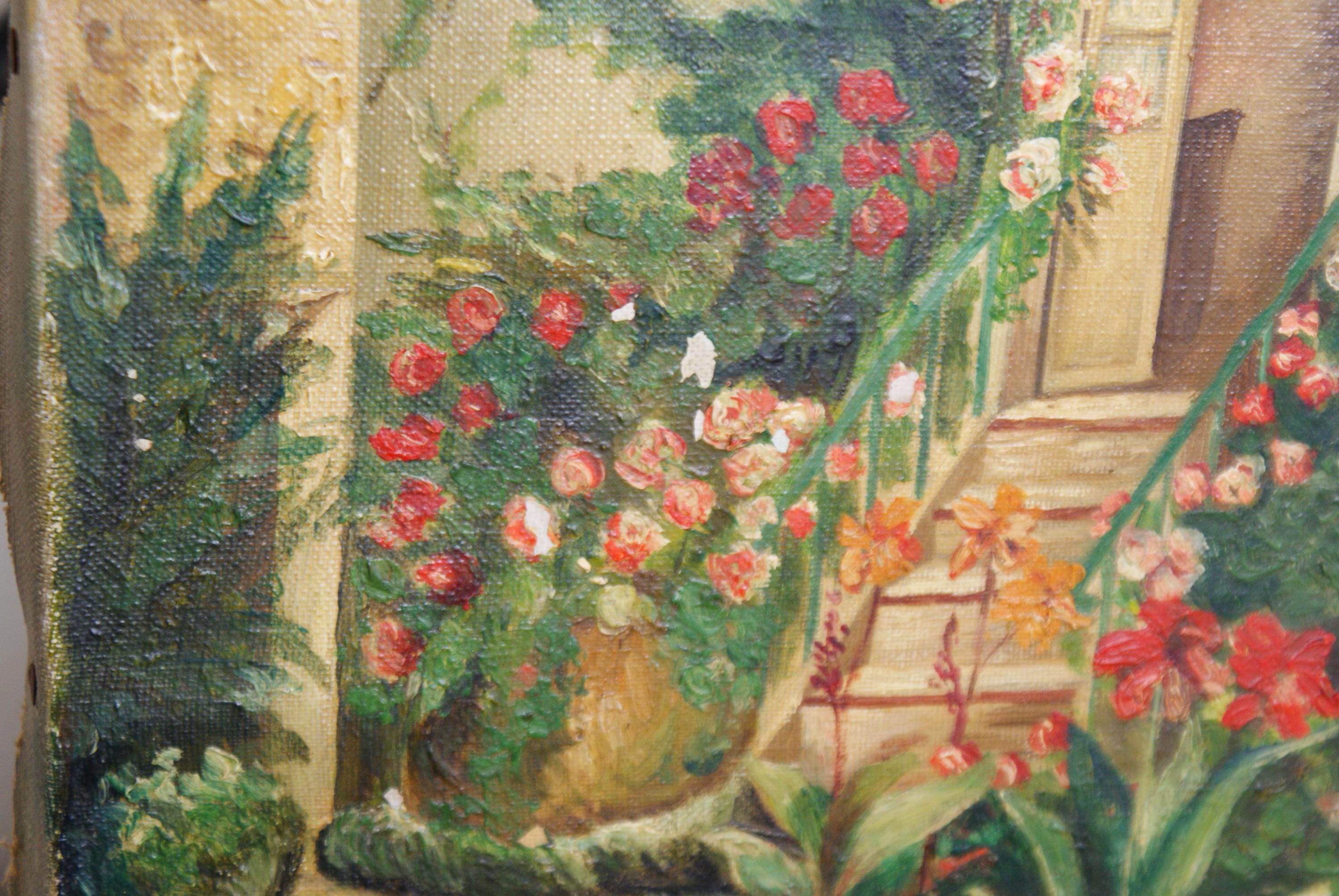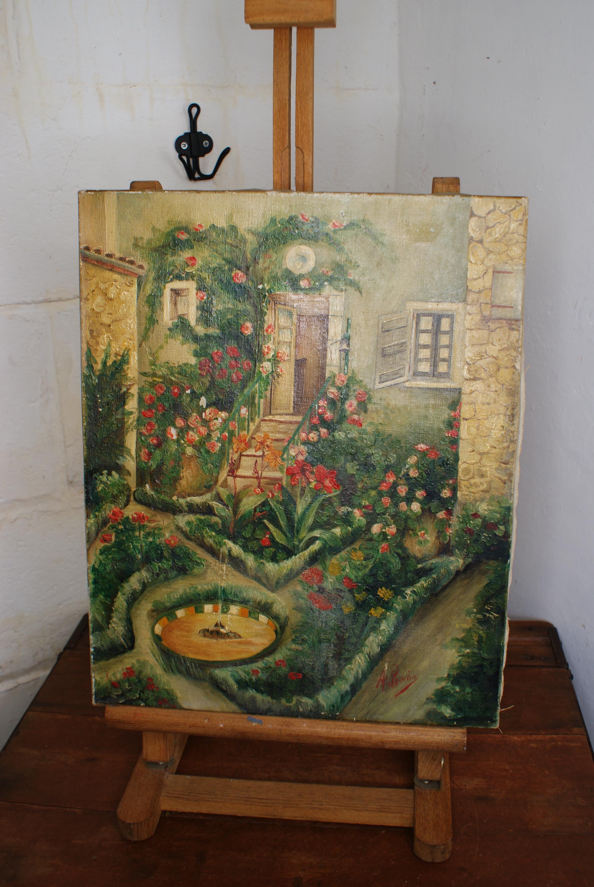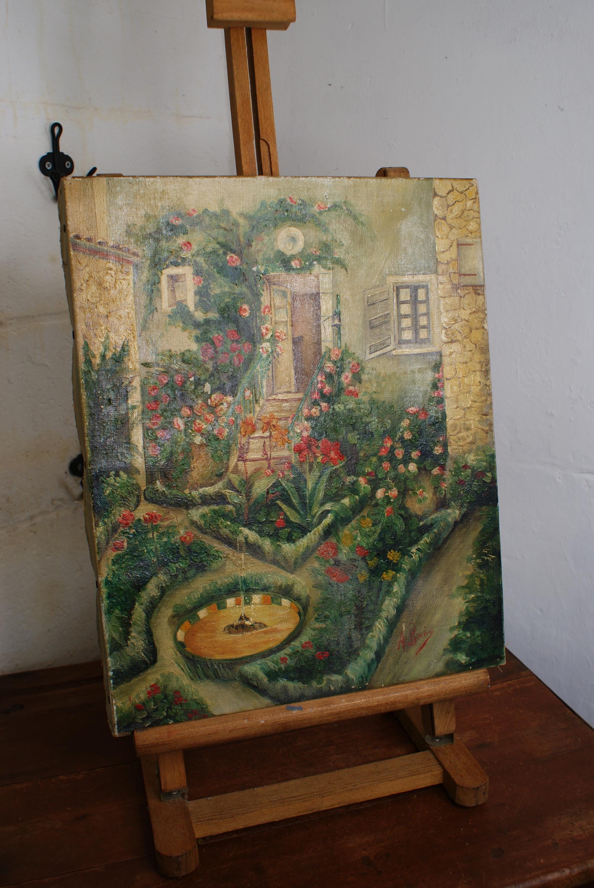 A fabulous vintage French oil painting of a rustic cottage garden, a lovely painting with vibrant colours and a rustic charm.
