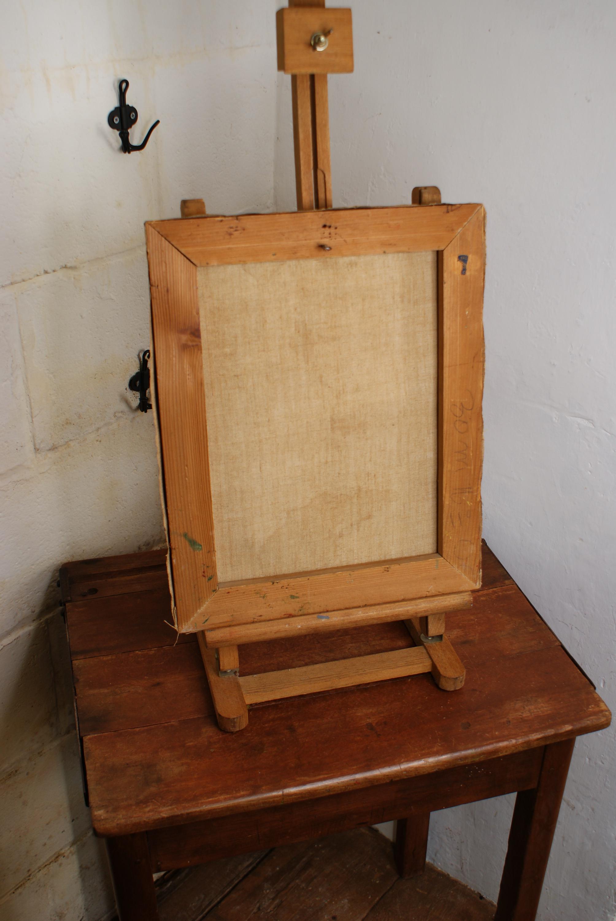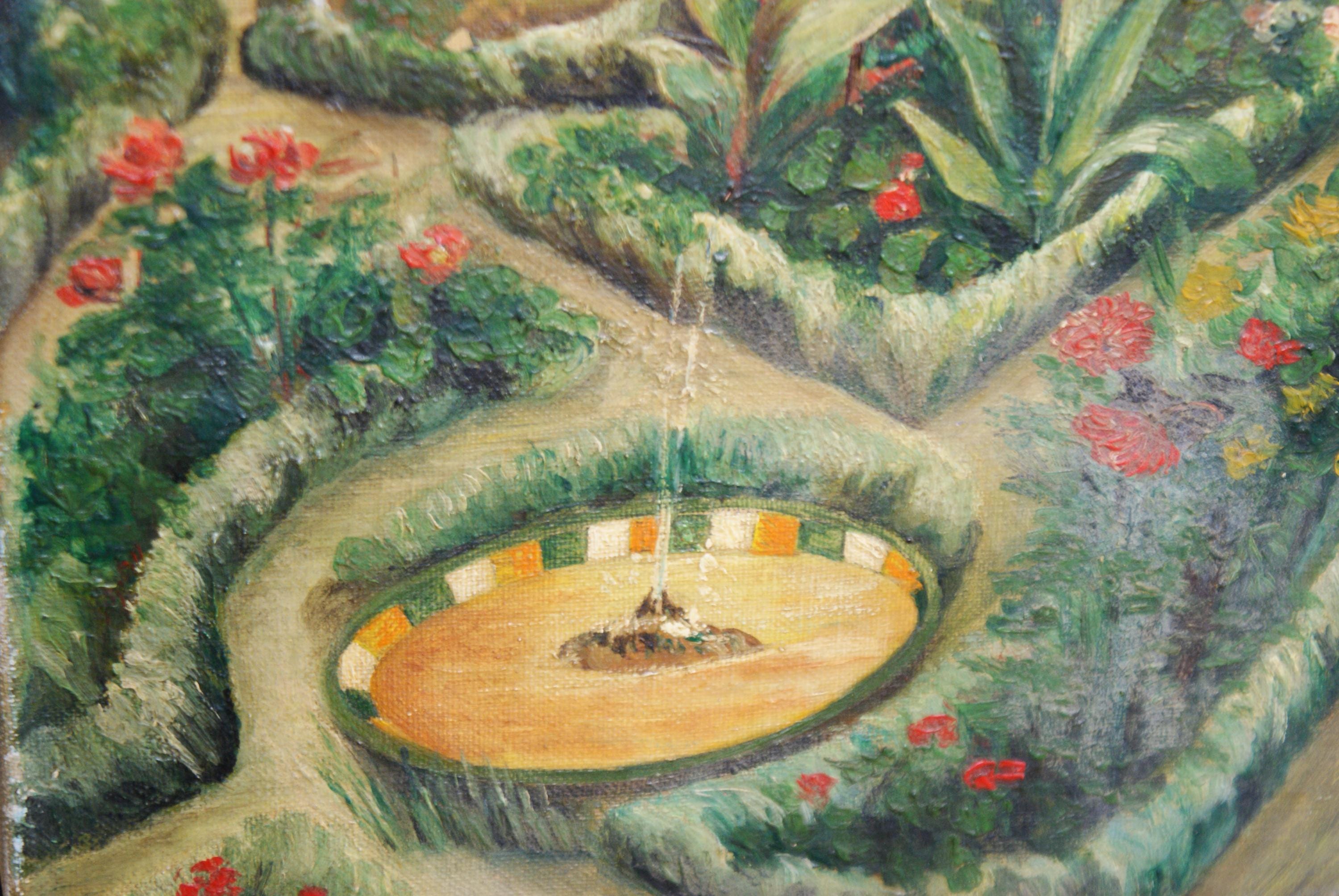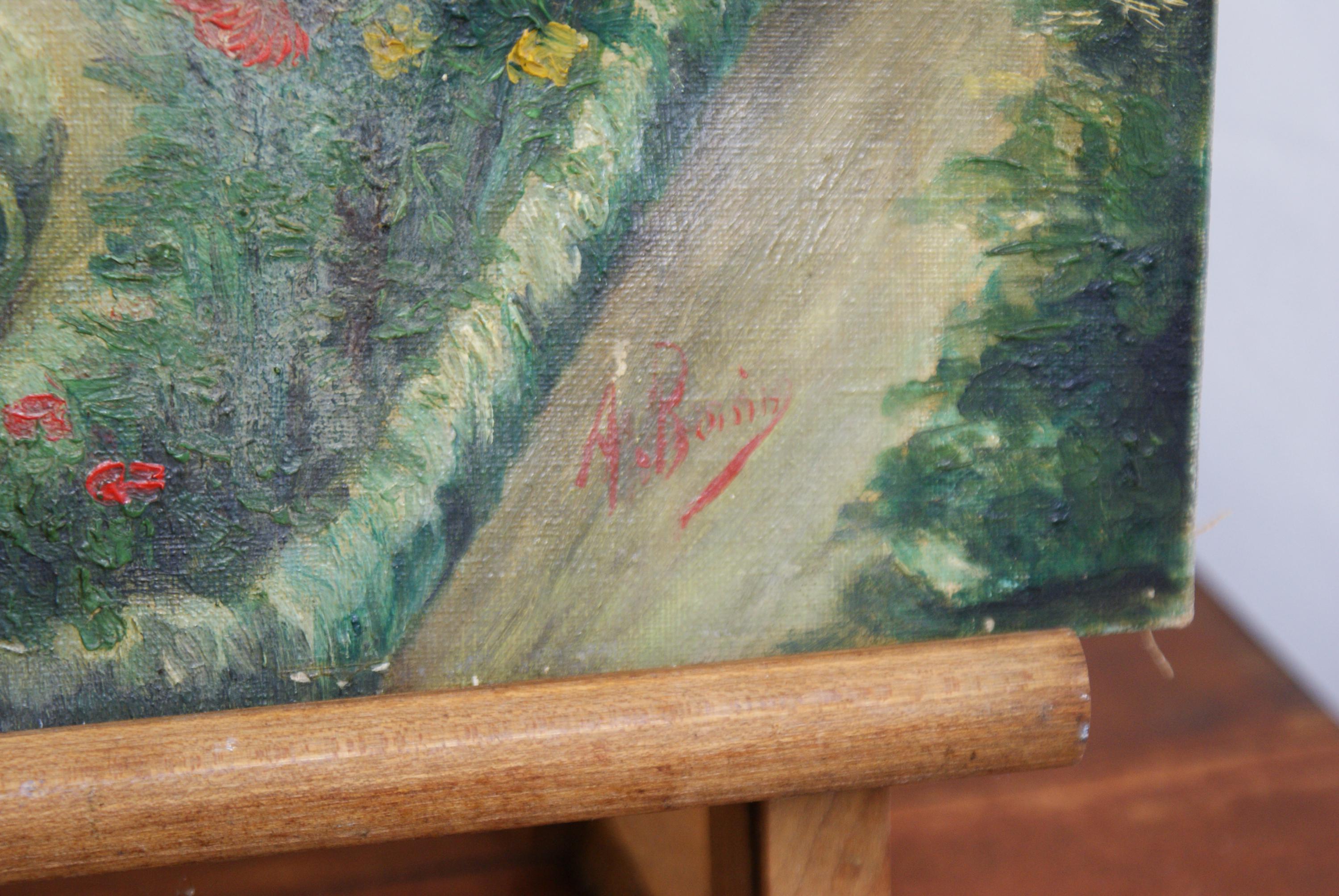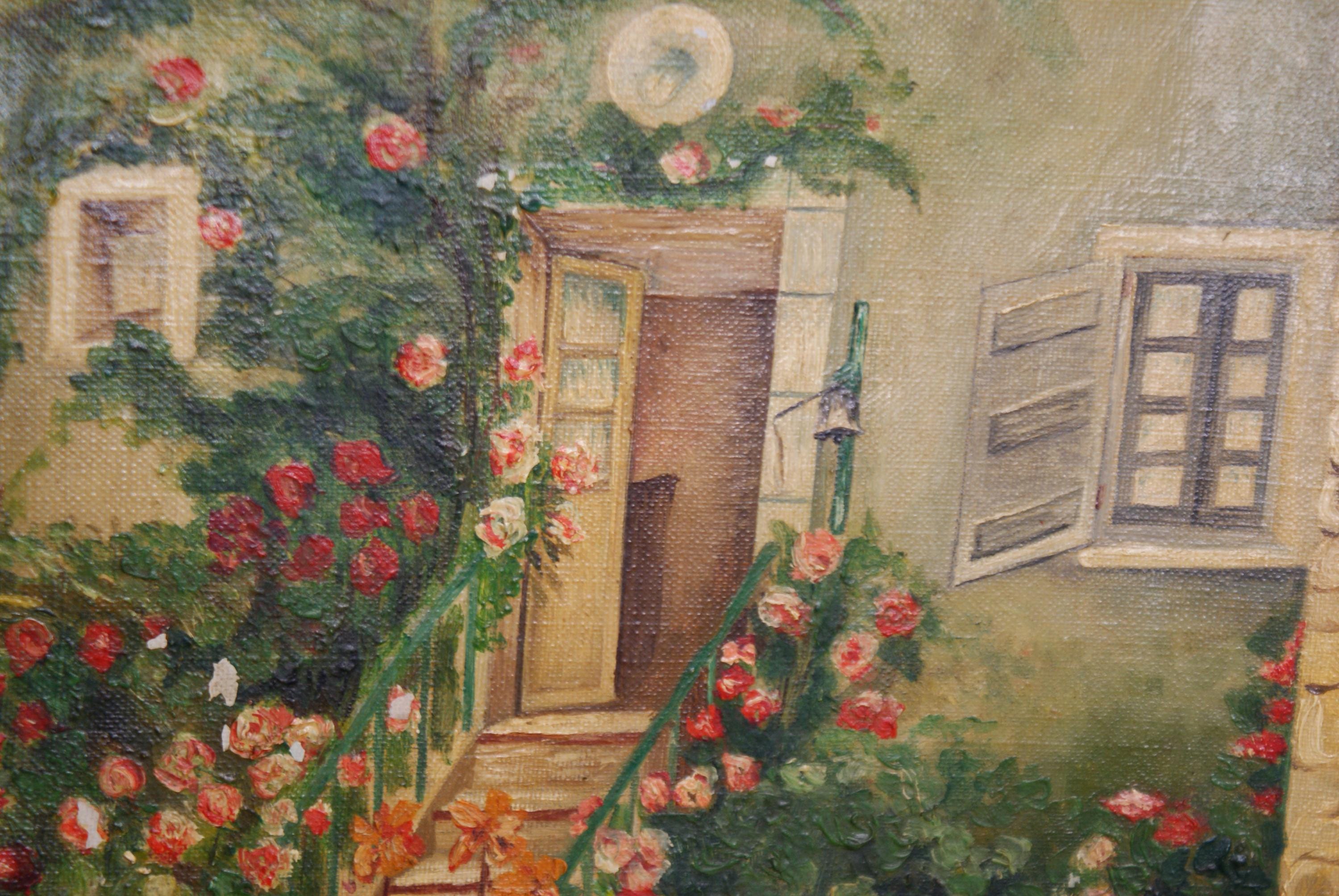 A fabulous vintage French oil painting of a rustic cottage garden, a lovely painting with vibrant colours and a rustic charm.