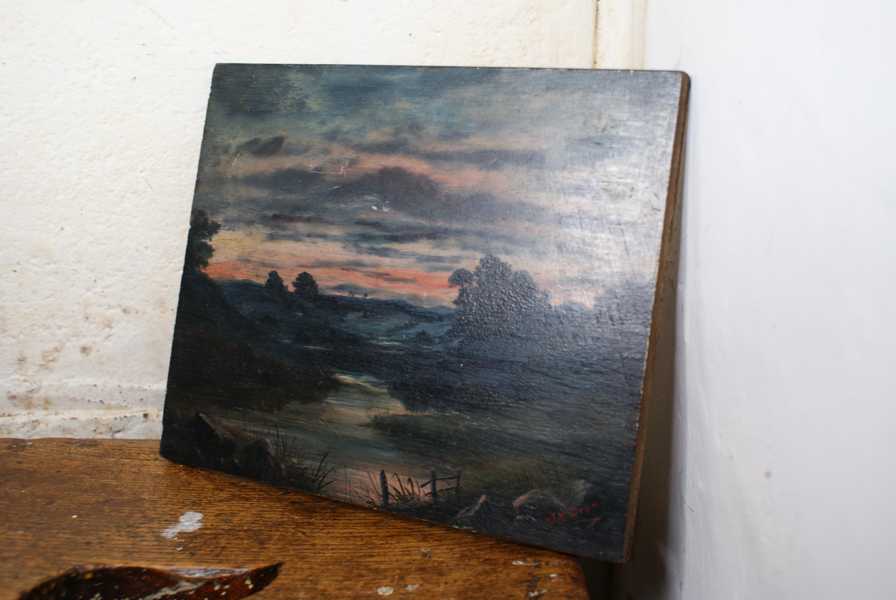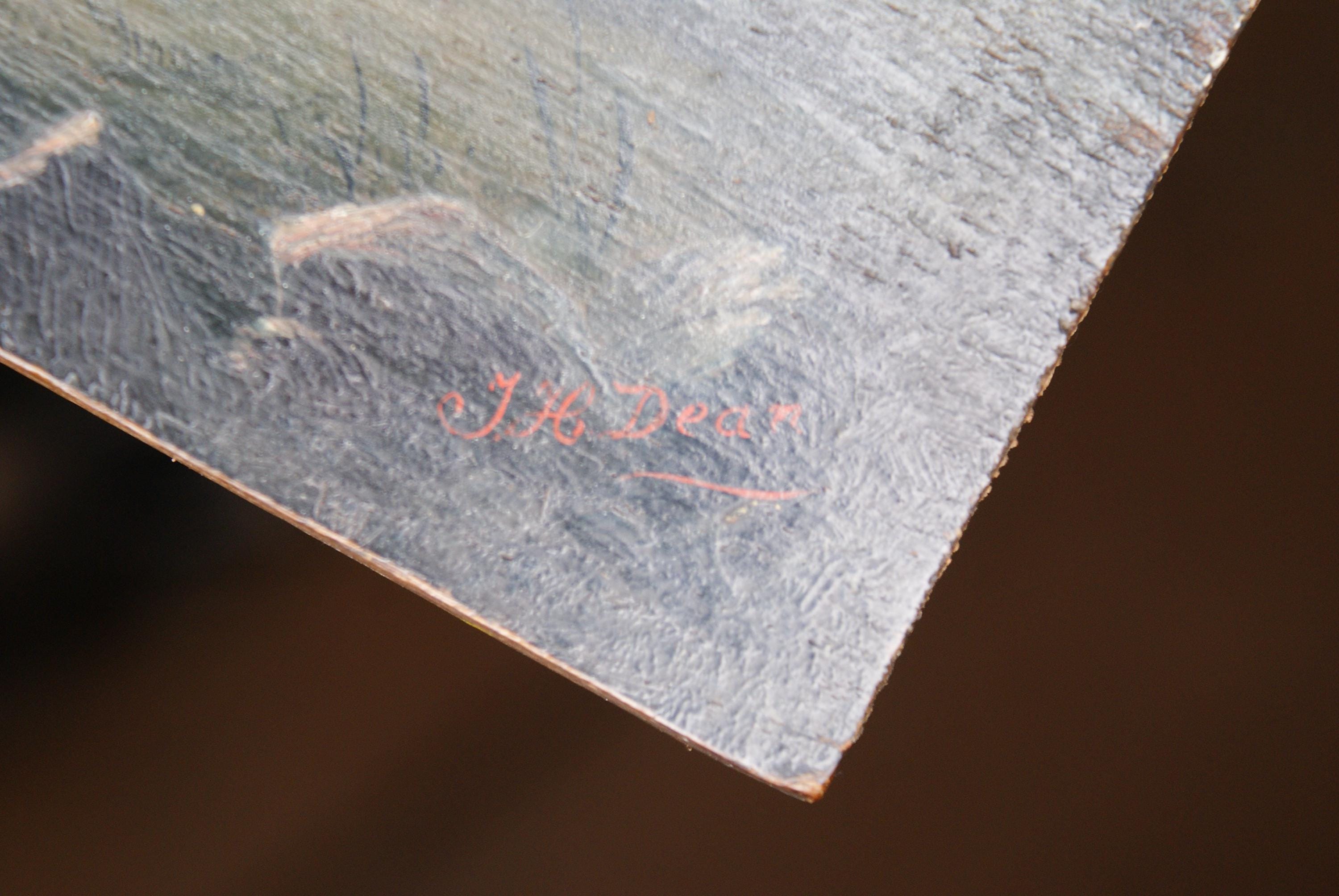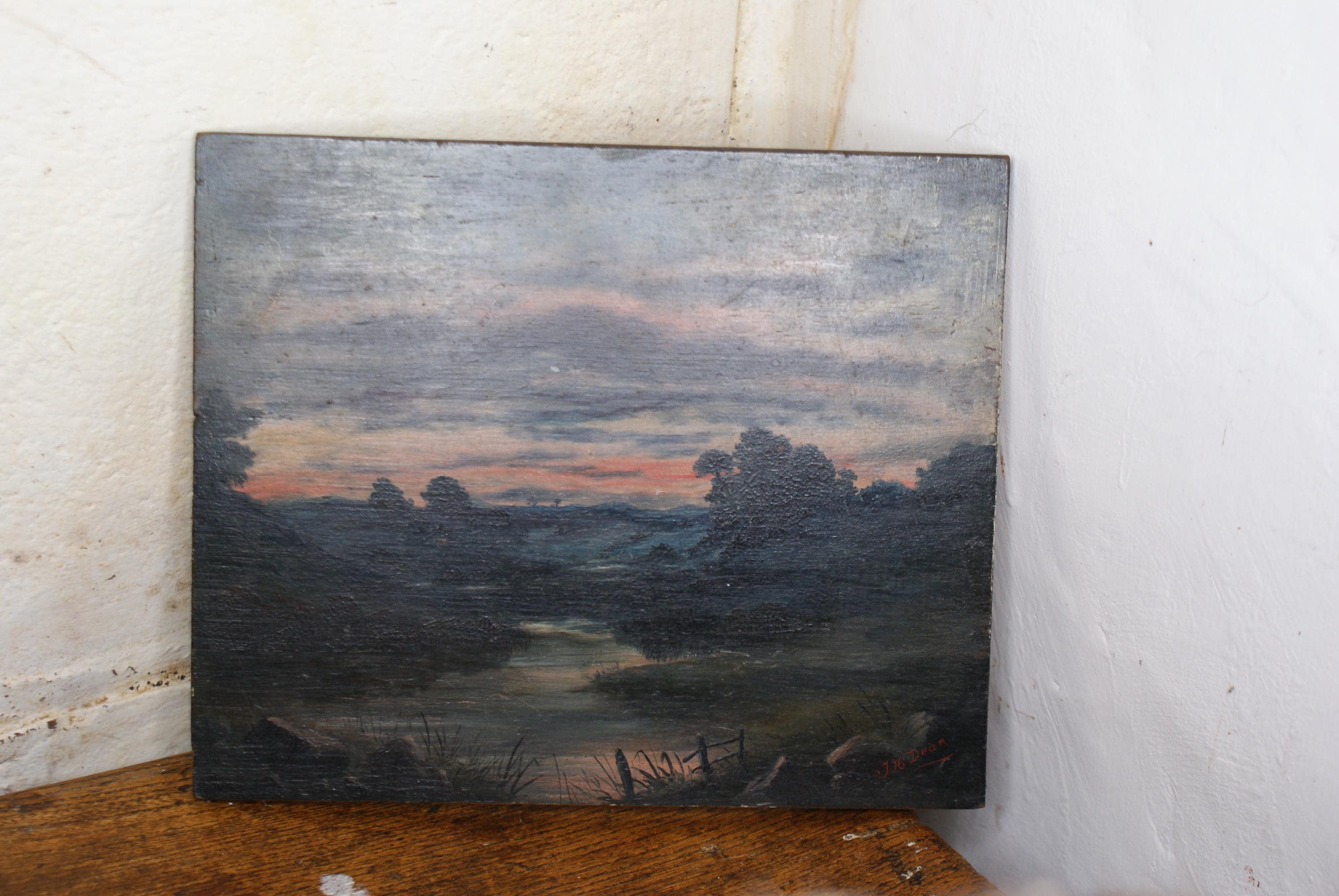 A fantastic moody landscape painting at dusk, a perfect piece for a dresser or curio cabinet. sign JH Dean. There is one small scratch in the middle but isn't highly noticeable.