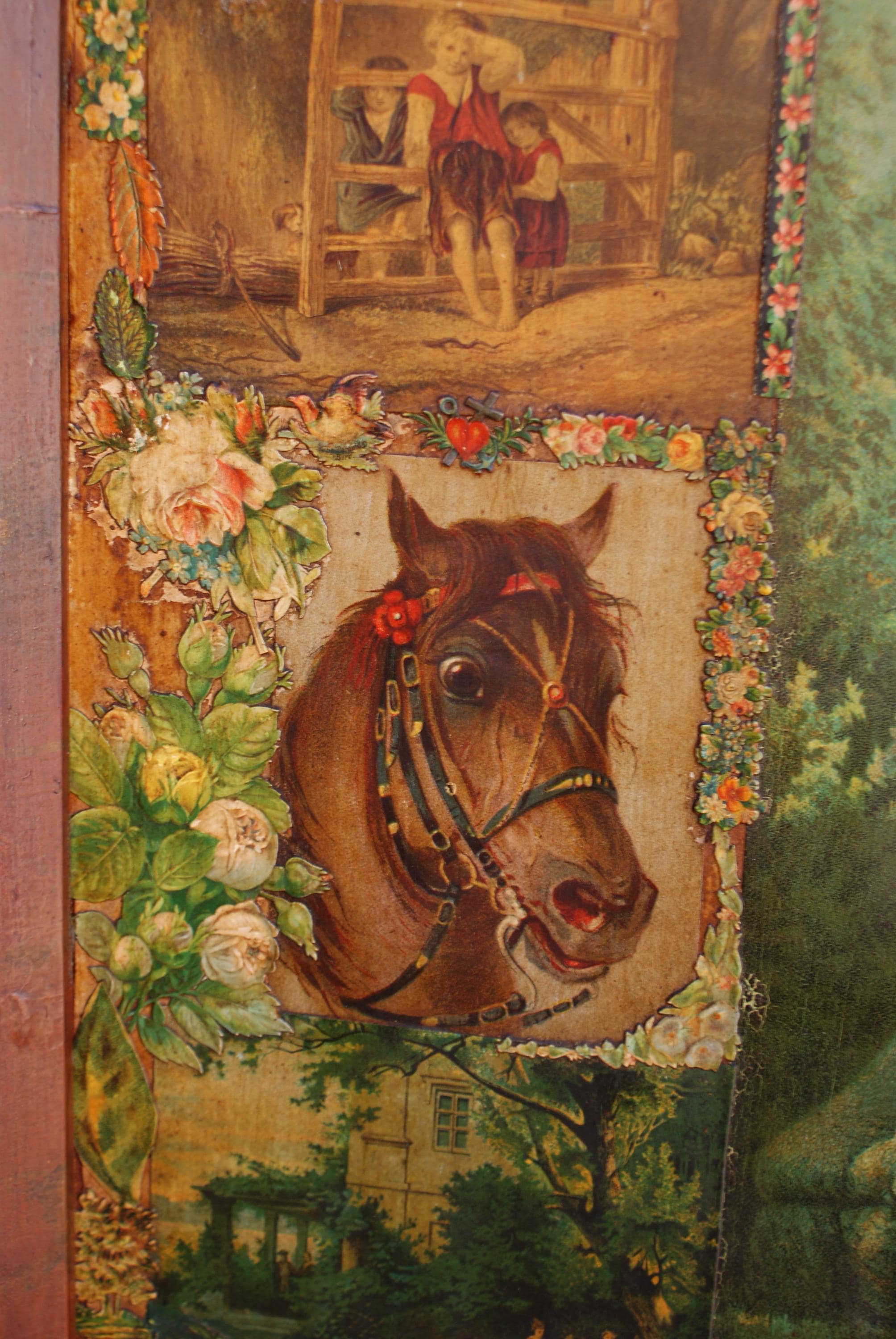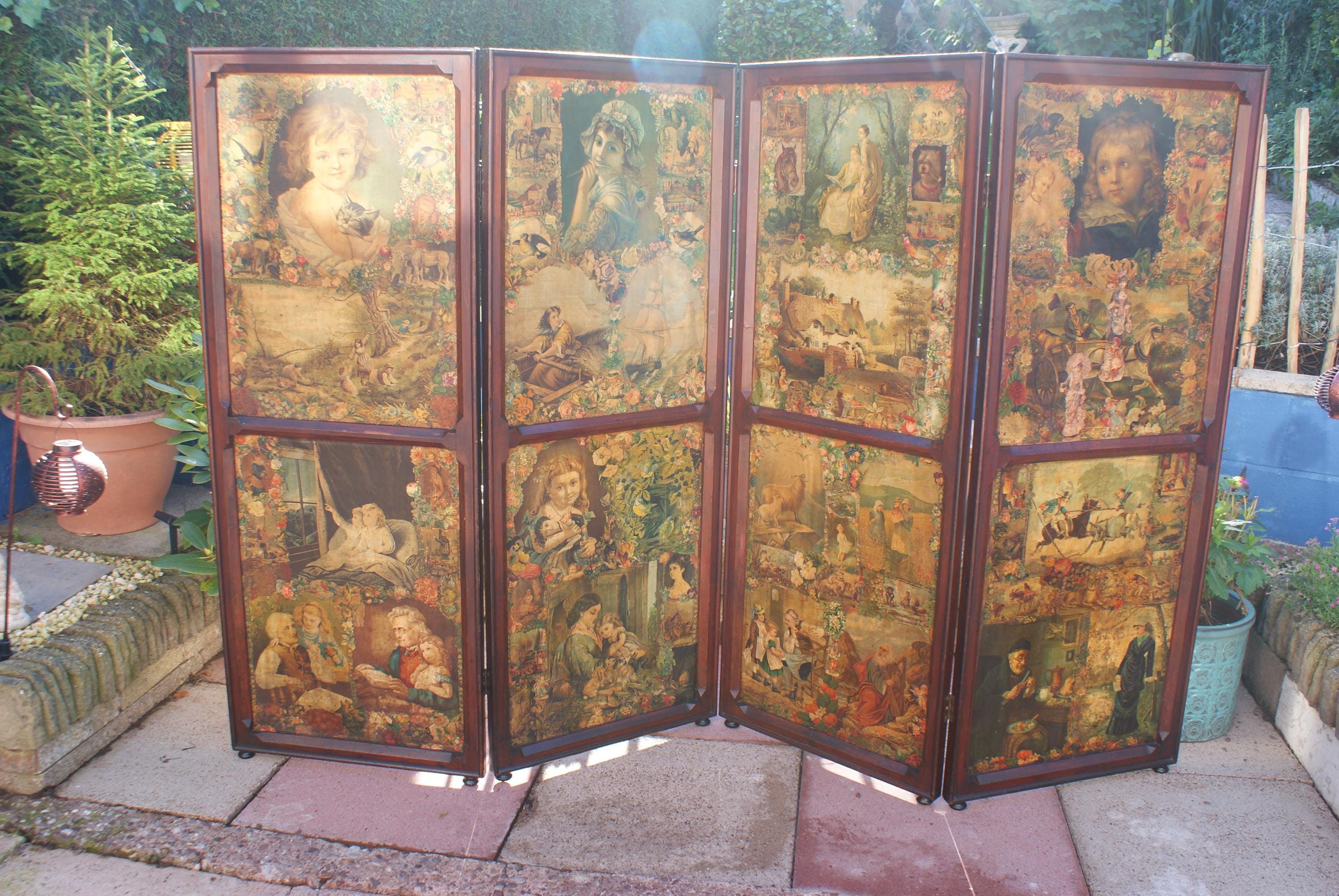 A stunning late 19th century decoupage room screen in a mahogany frame. The four panels are composed of on both sides hundreds of Victorian lithograph die cuts. This in excellent condition with no rips or tears to the canvas with just a lovely patina and fading. Viewing is welcome or alternatively I can provided more detailed pictures of each panel as Etsy only allow 10 and there is far to much to fit into 10 photos.