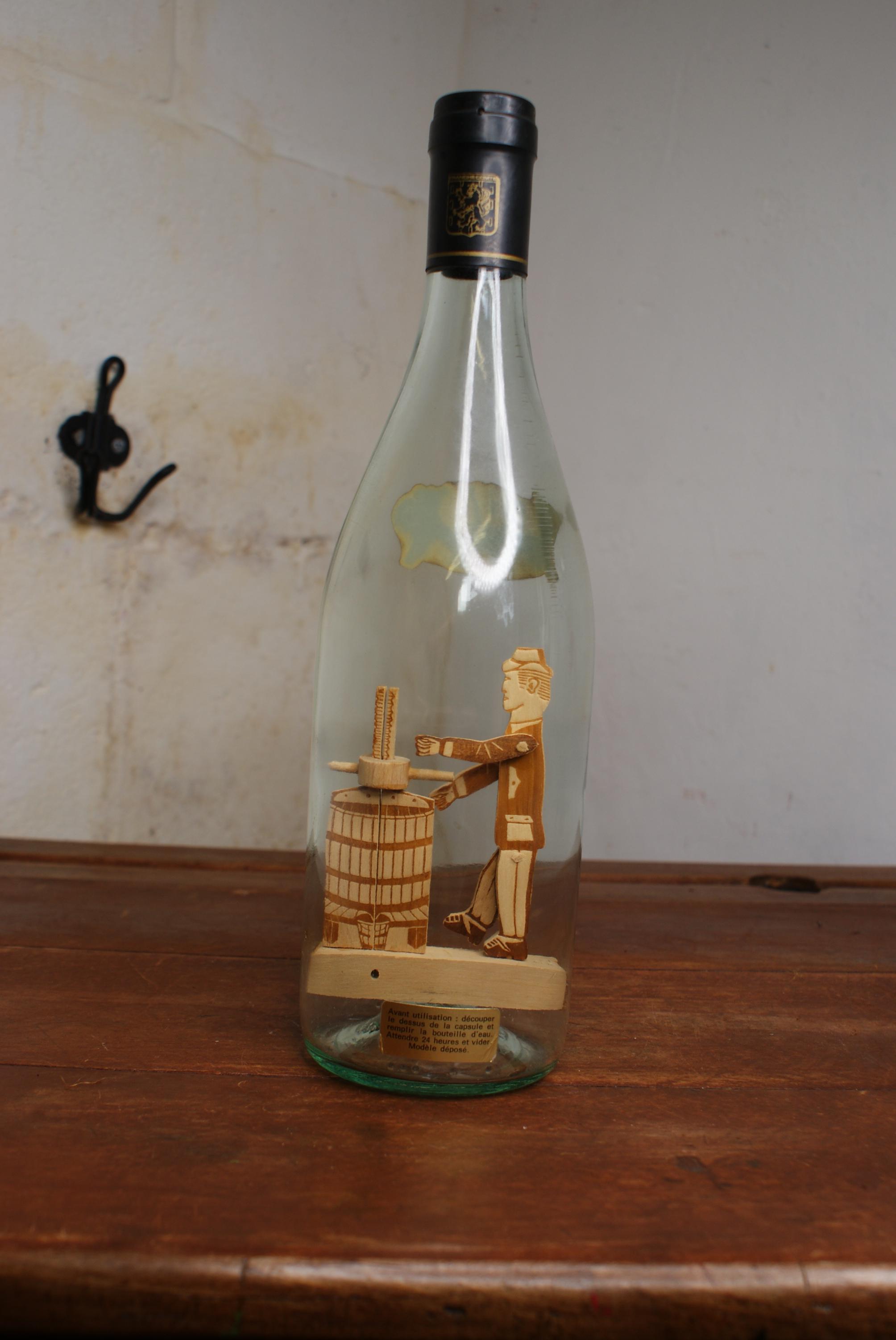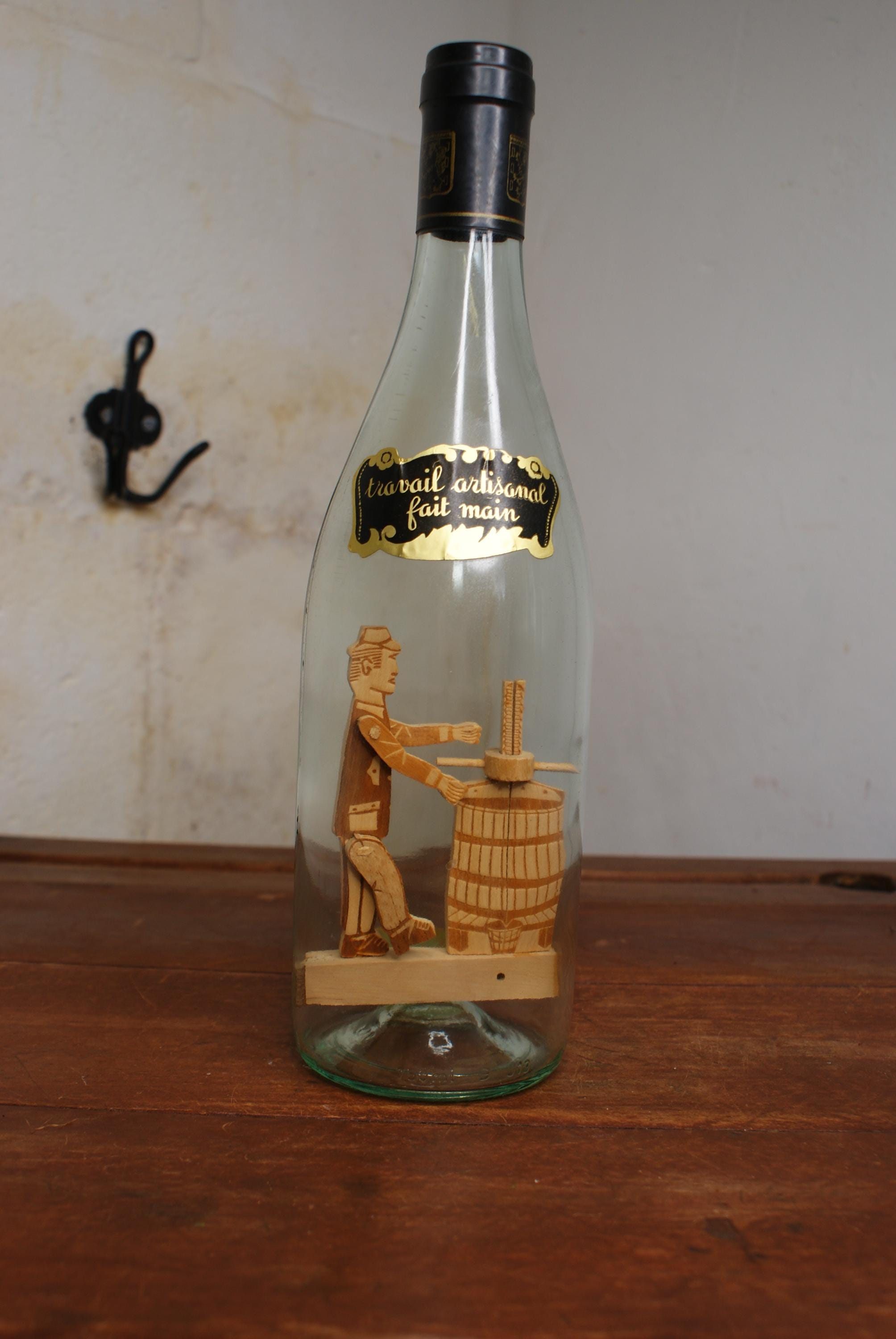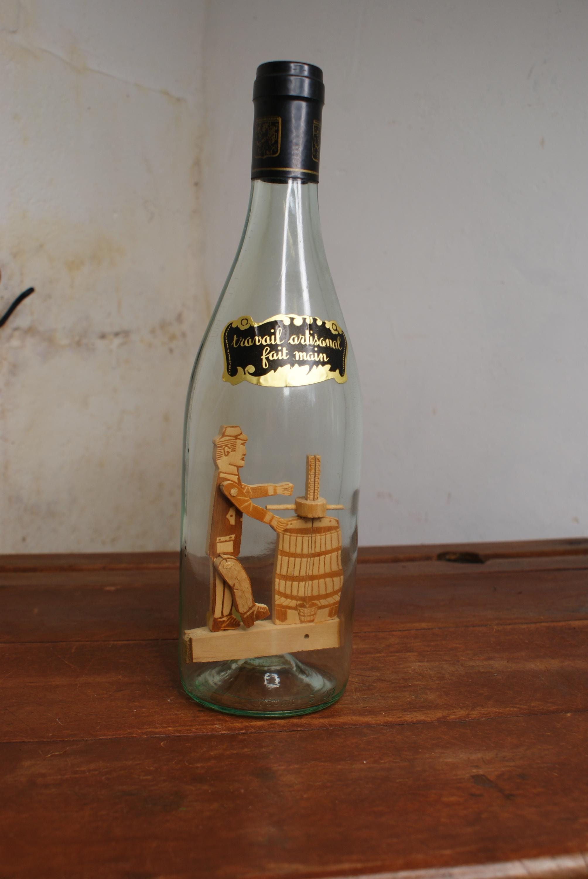 A lovely Piece of French folk art known as a whimsy bottle, this one features a man working and a grape press inside a sealed wine bottle. the label on the front translates to 'Artisanal work handmade' Whimsy bottles are subgenre of tramp art and known for the intricate and challenging process of placing the figures inside.